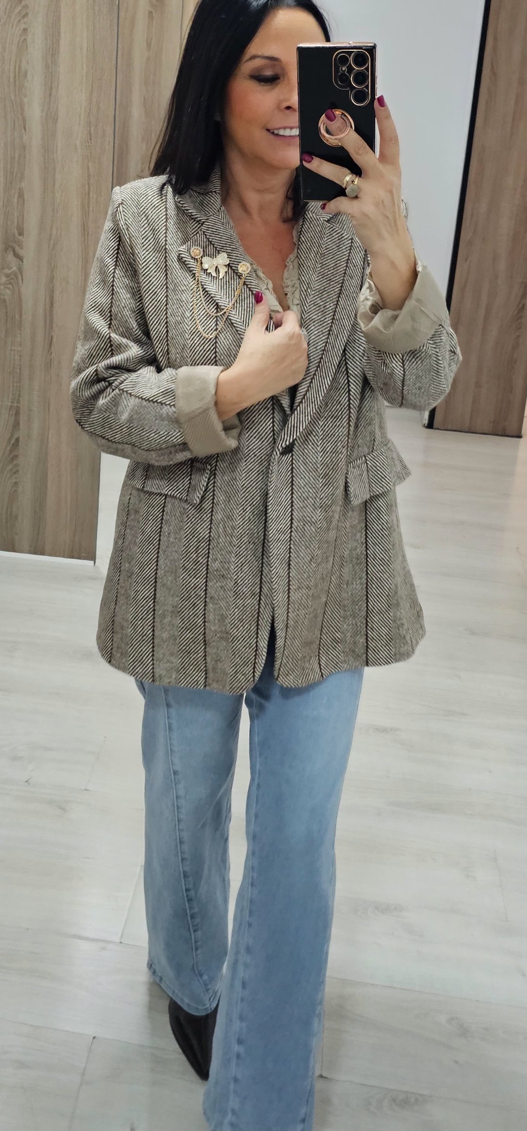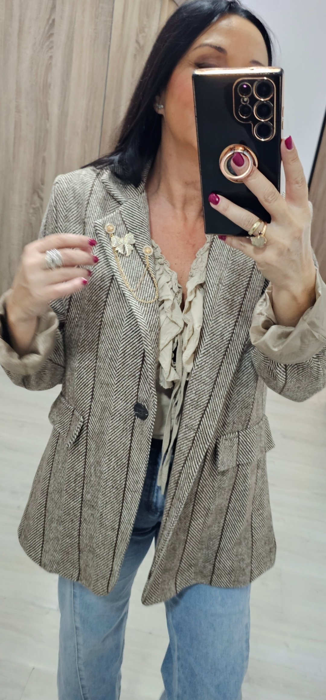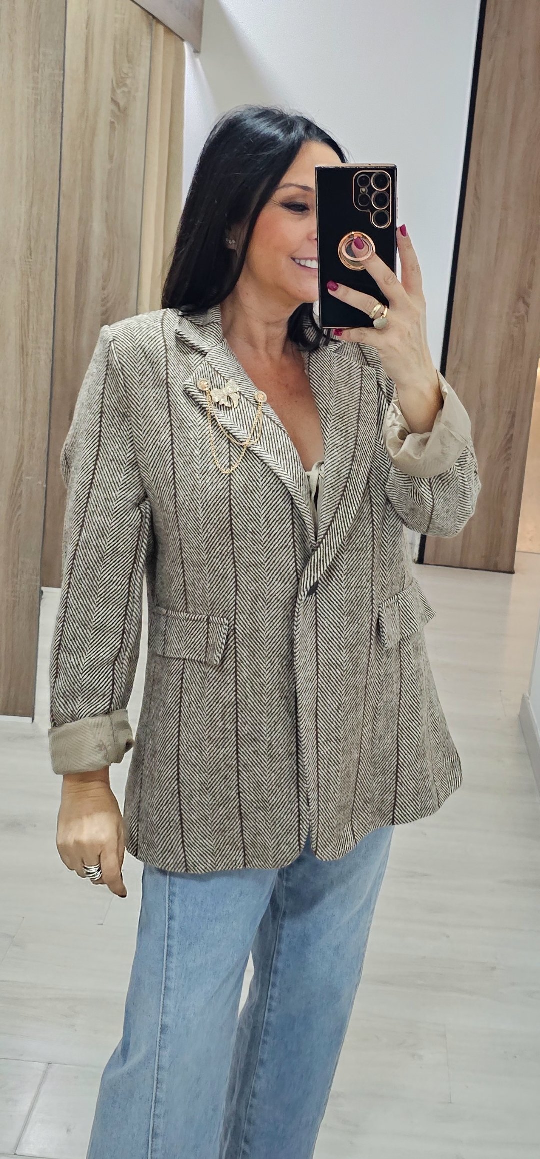 Monisima chaqueta americana en tejido de paño súper suave y forrada entera con cierre de botón y broches de adorno en la solapa
