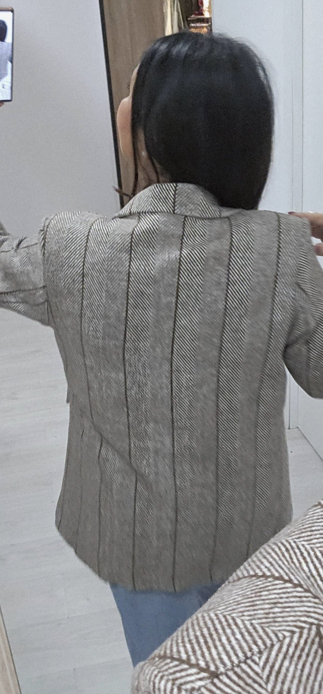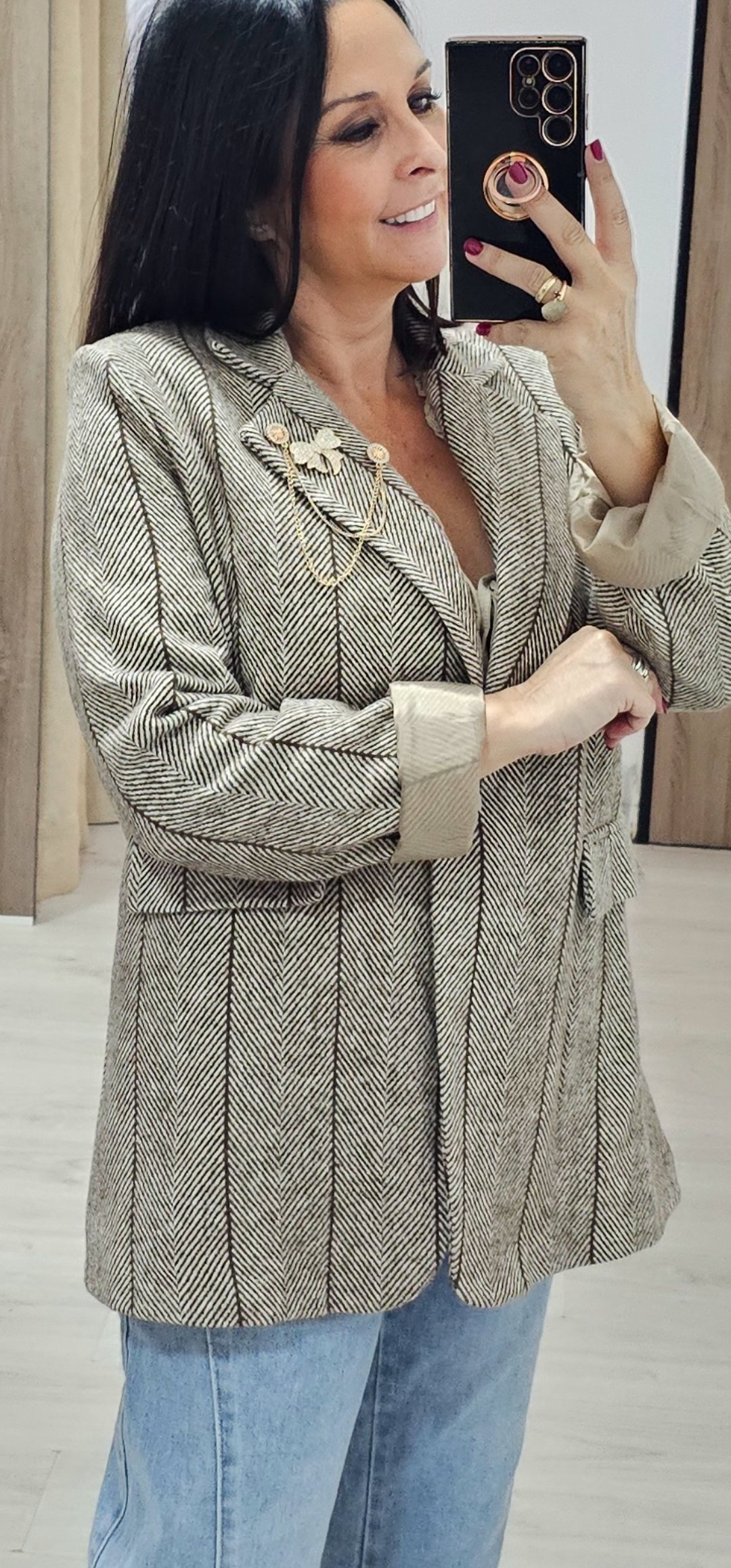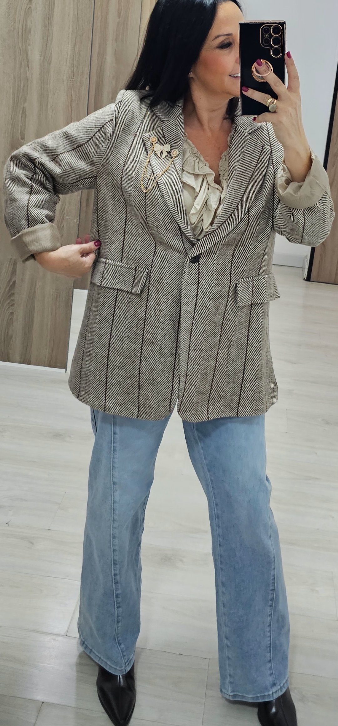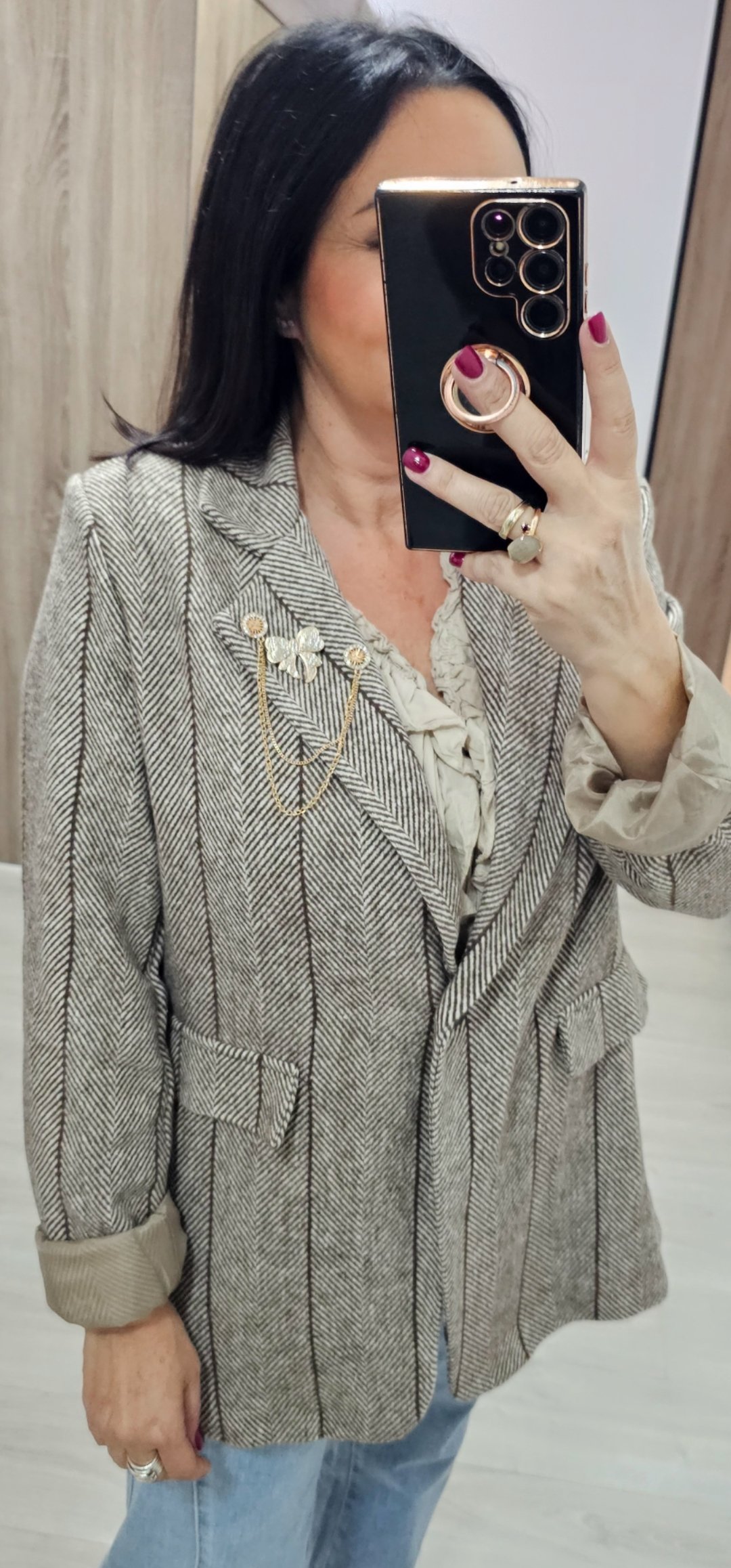 Monisima chaqueta americana en tejido de paño súper suave y forrada entera con cierre de botón y broches de adorno en la solapa