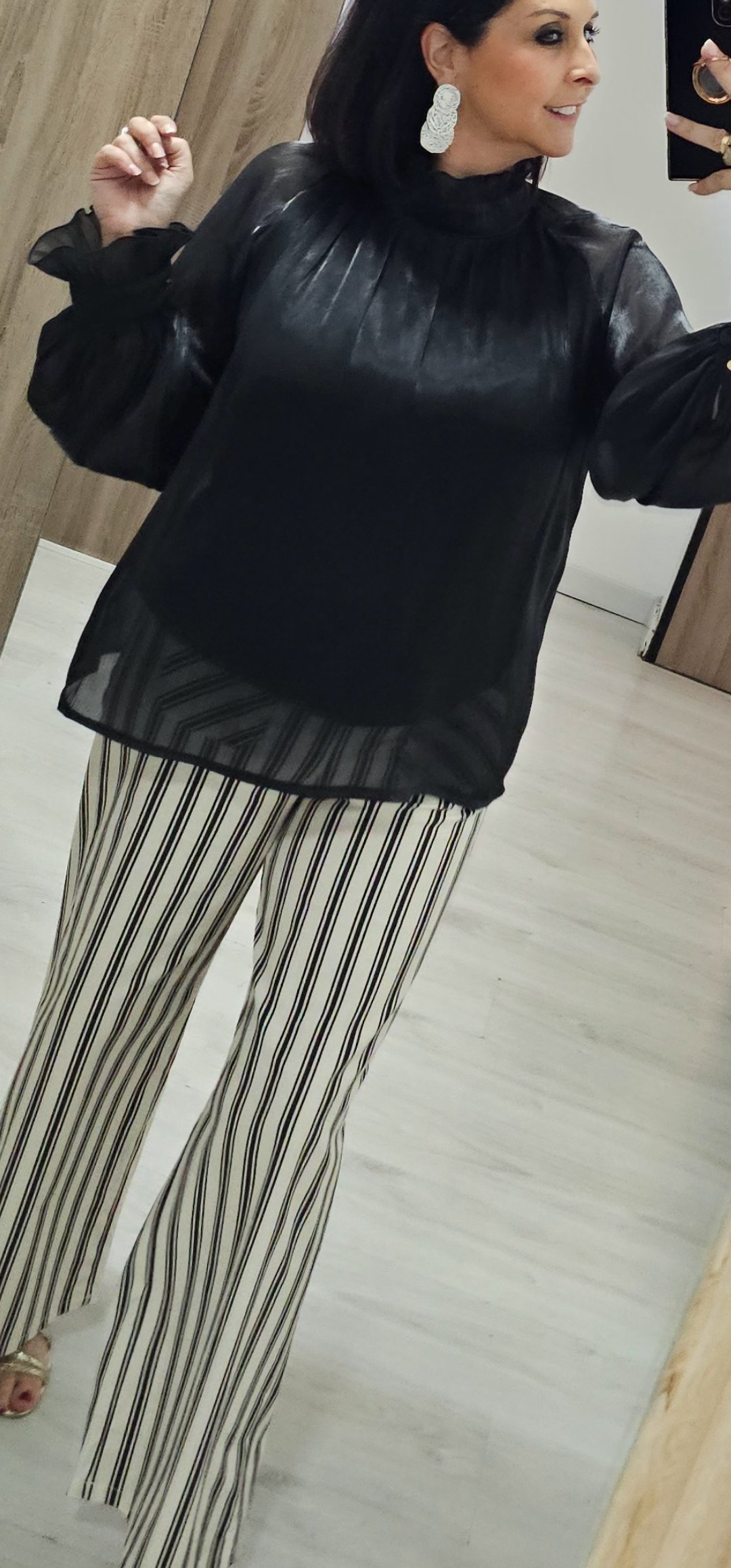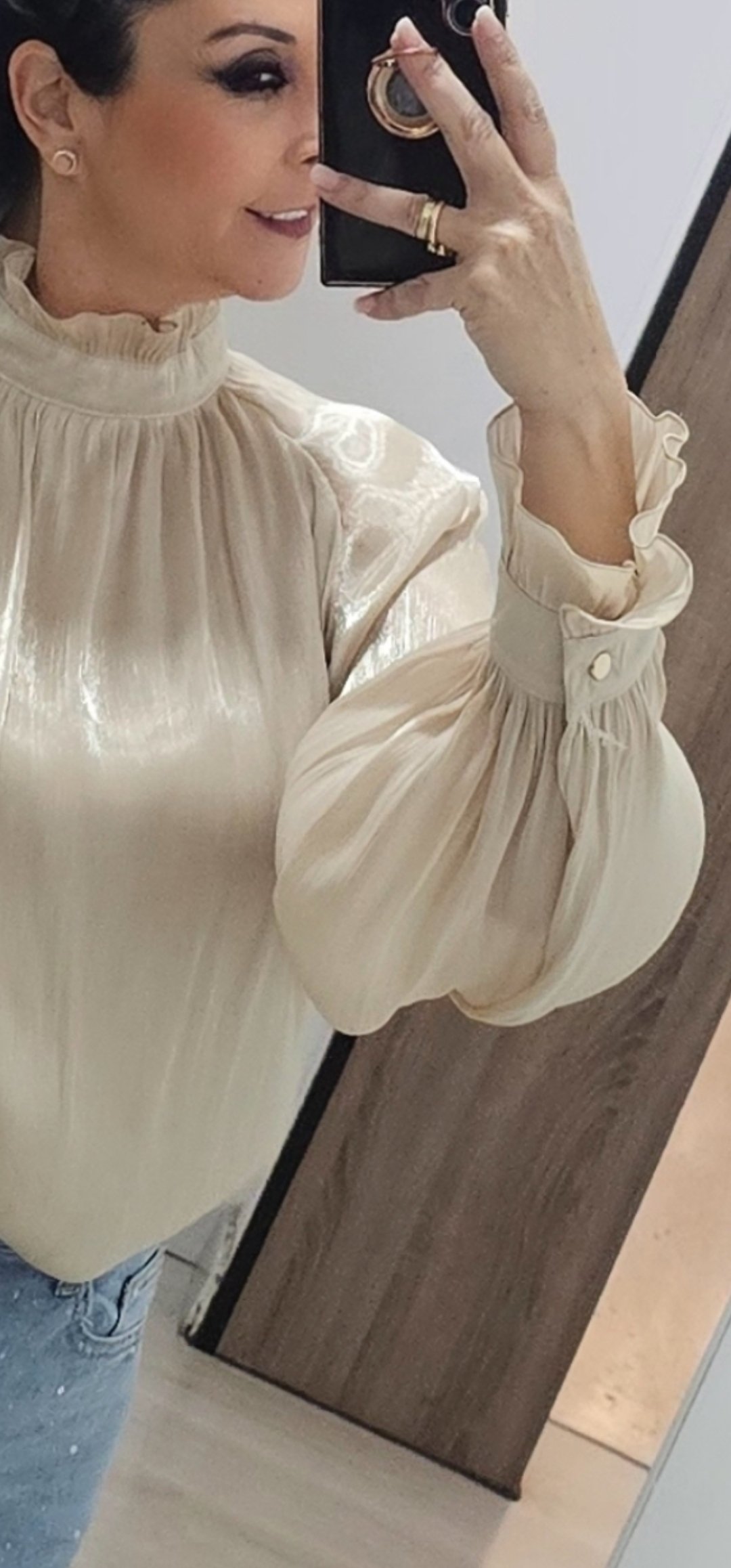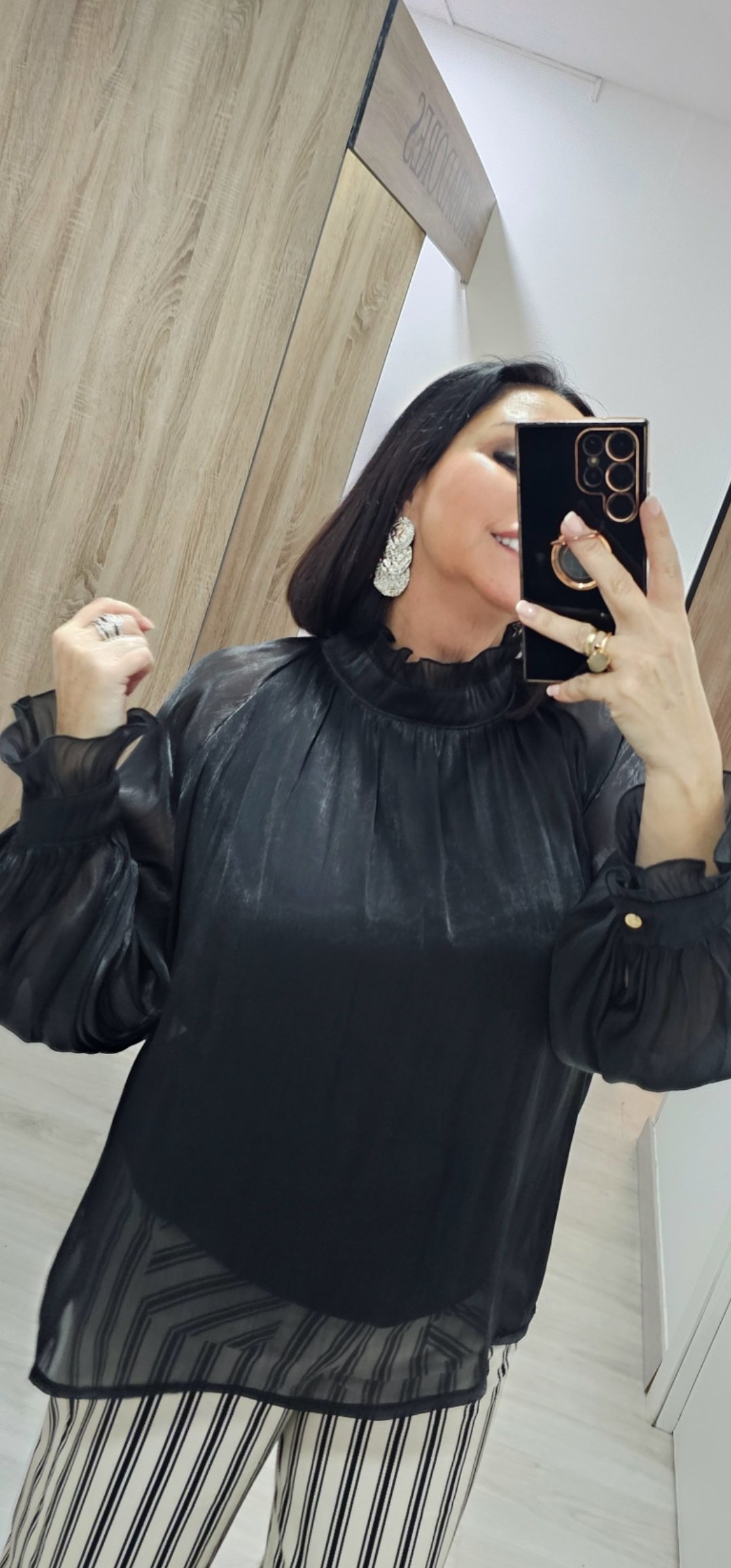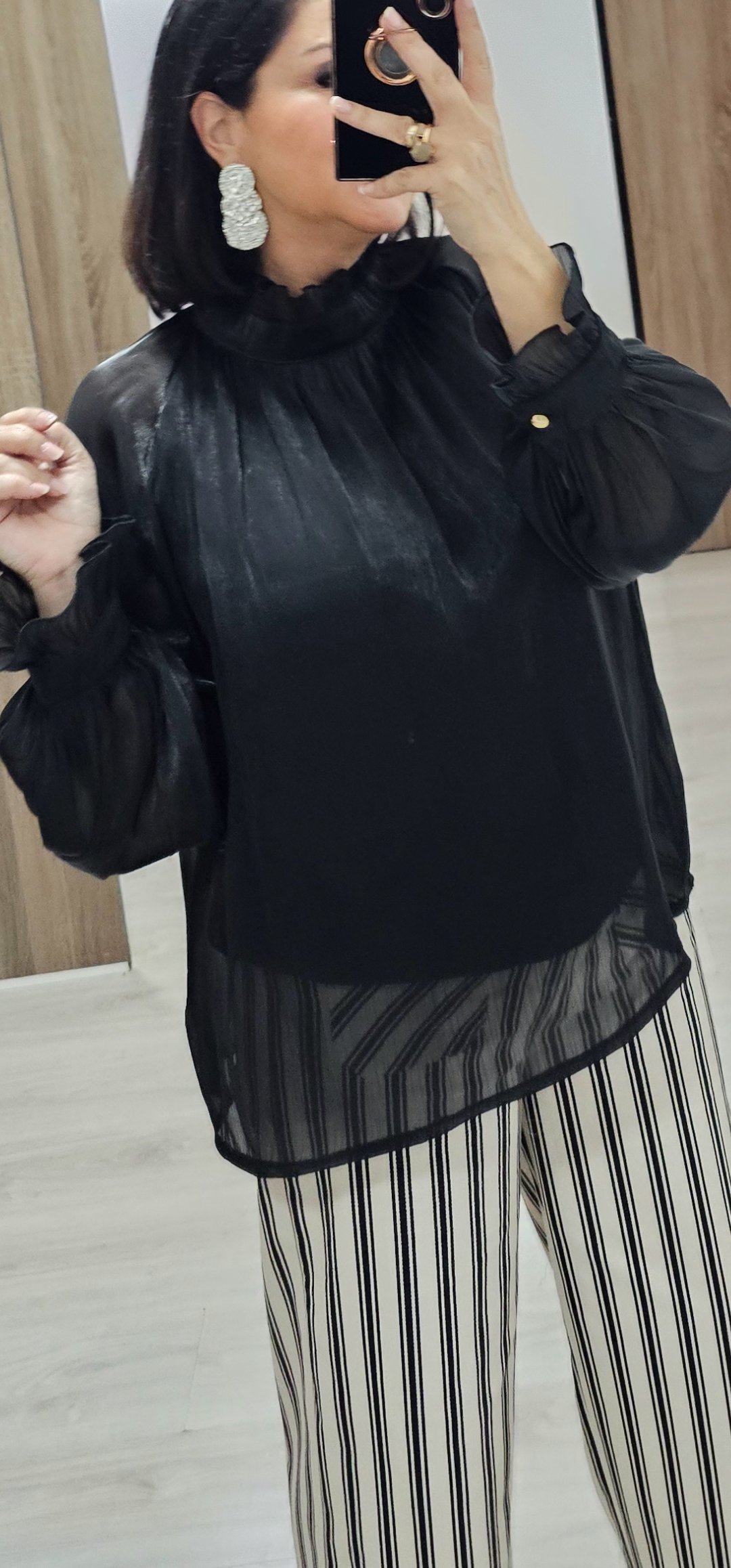 Espectacular blusa en un tejido súper bonito y sedoso con pecho y espalda forrada y mangas semi trasparente con un corte súper elegante, cuello alto con cierre de botón