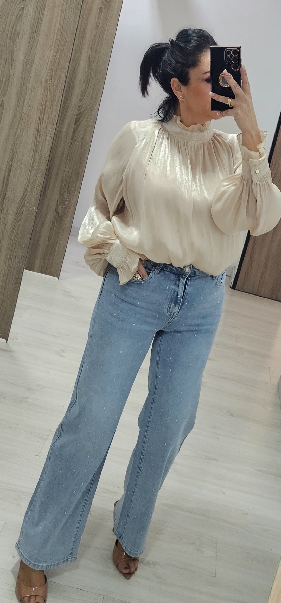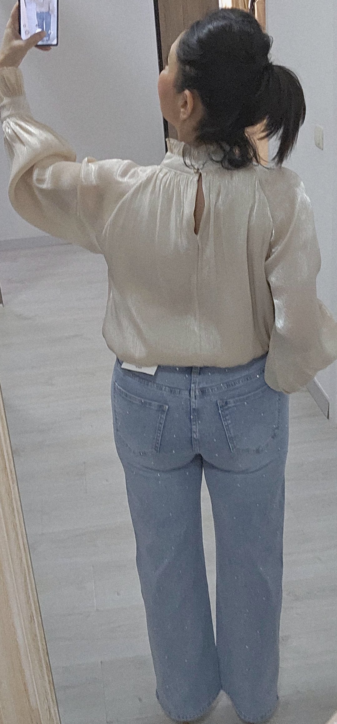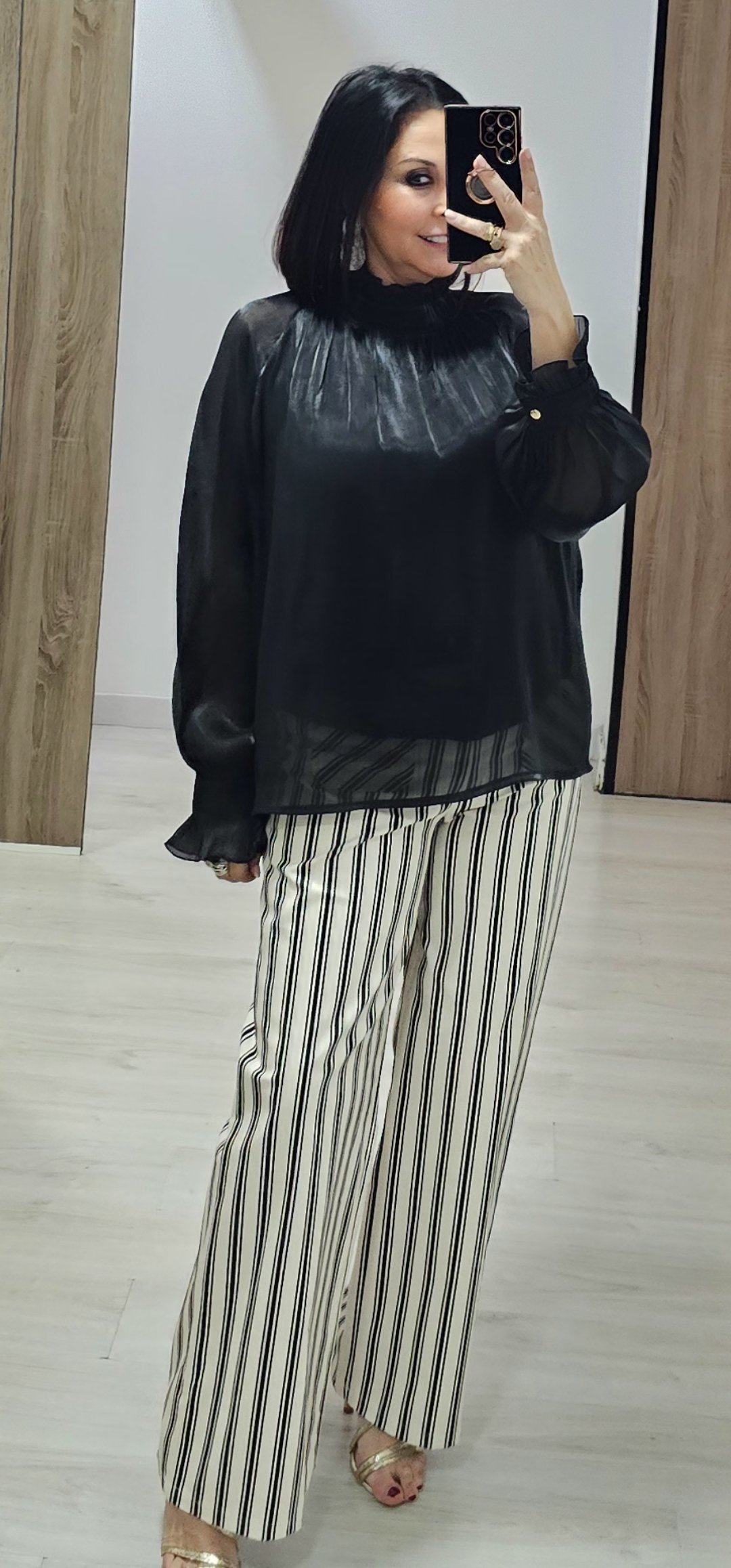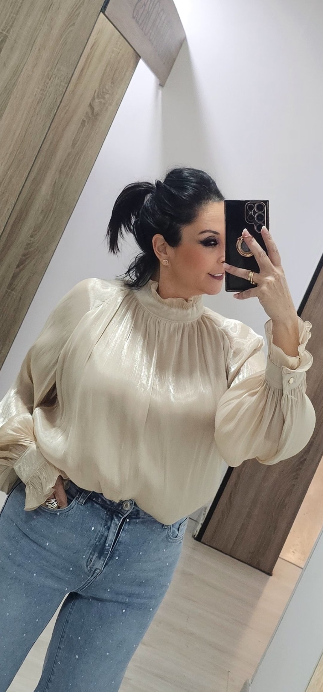 Espectacular blusa en un tejido súper bonito y sedoso con pecho y espalda forrada y mangas semi trasparente con un corte súper elegante, cuello alto con cierre de botón