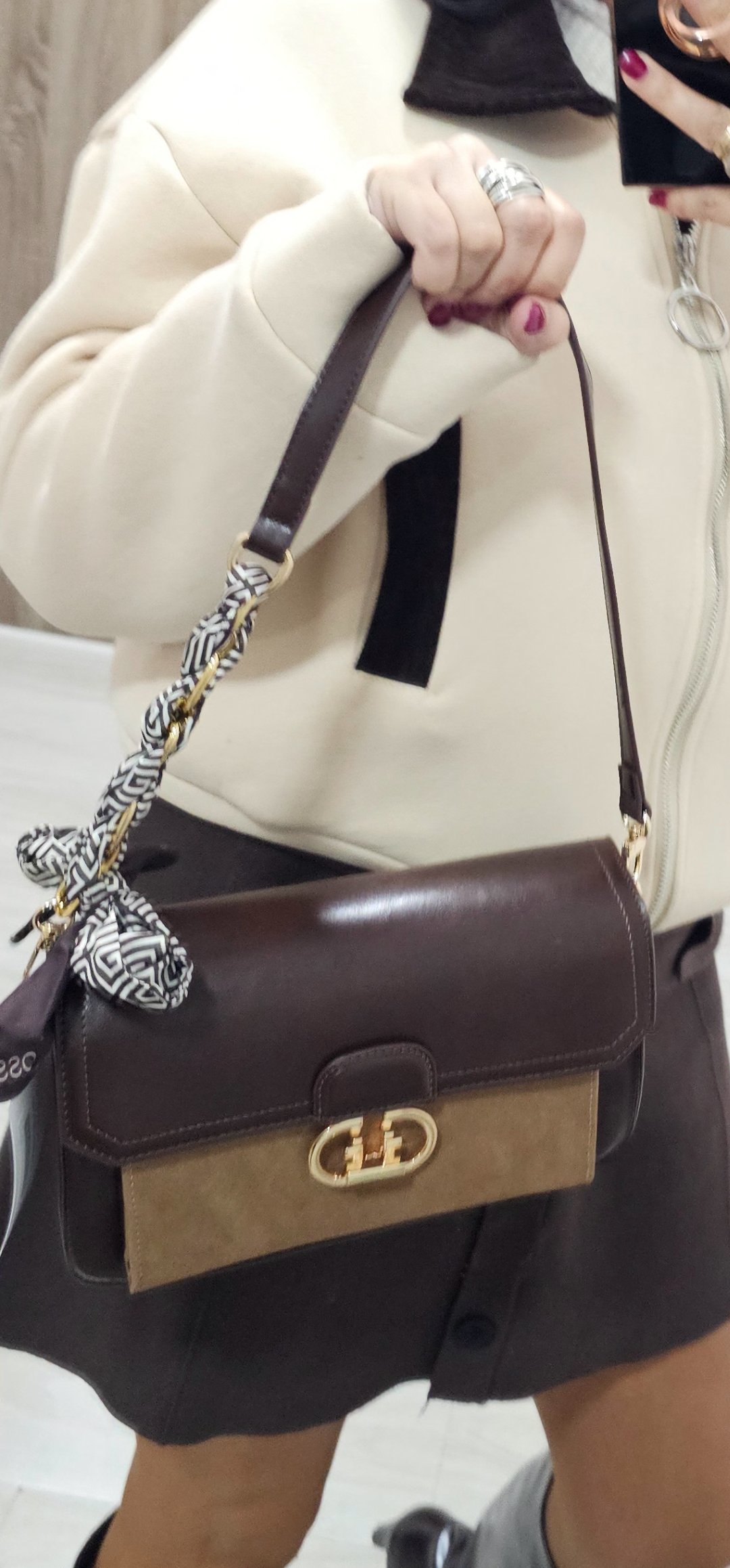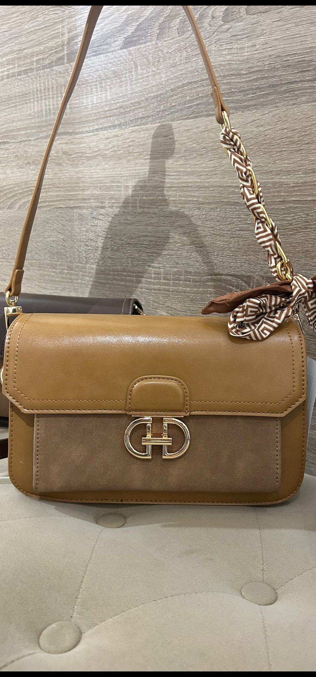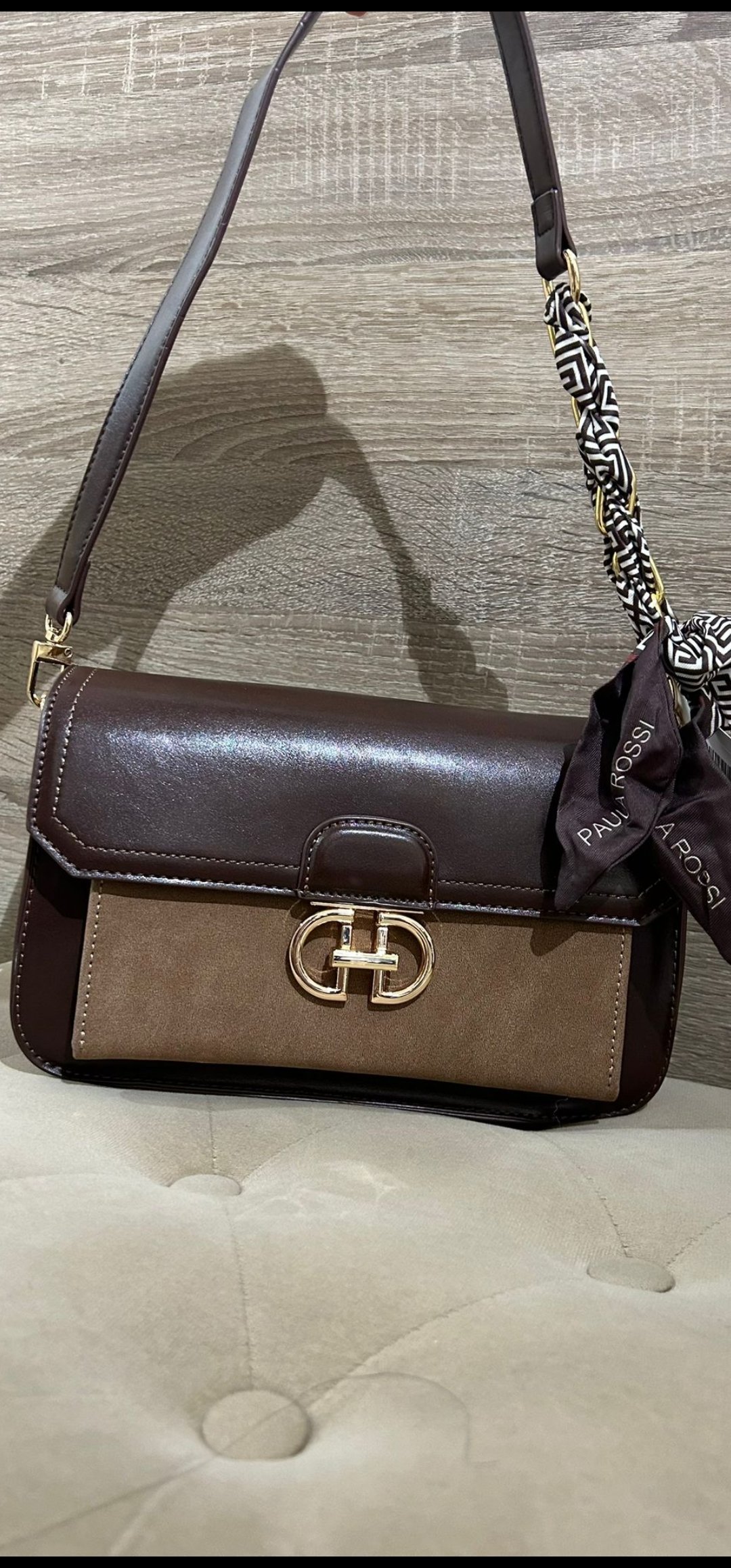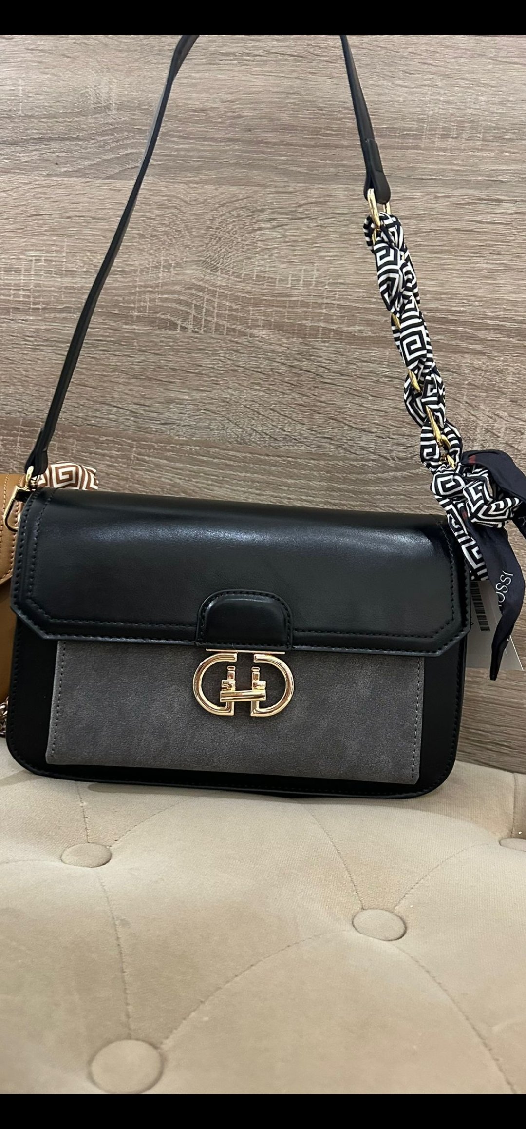 Monisimo bolso de polipiel con adorno en antelina lleva 2 tipos de asas con cadenas y lazo y en polipiel liso ideal para llevar colgando en el hombro o tipo bandolera, el material es precioso