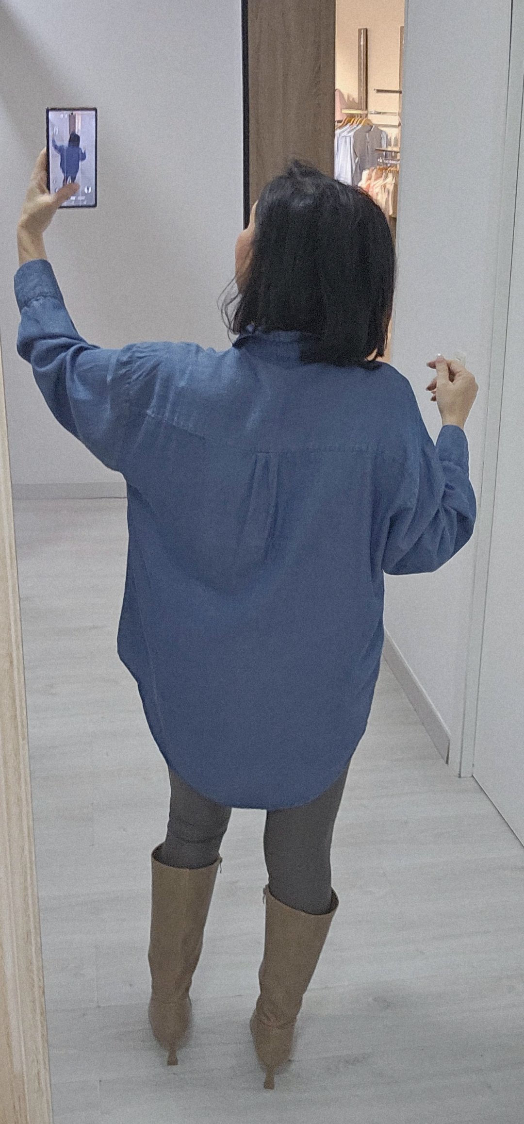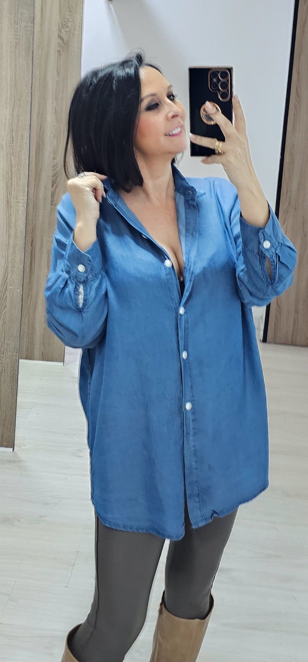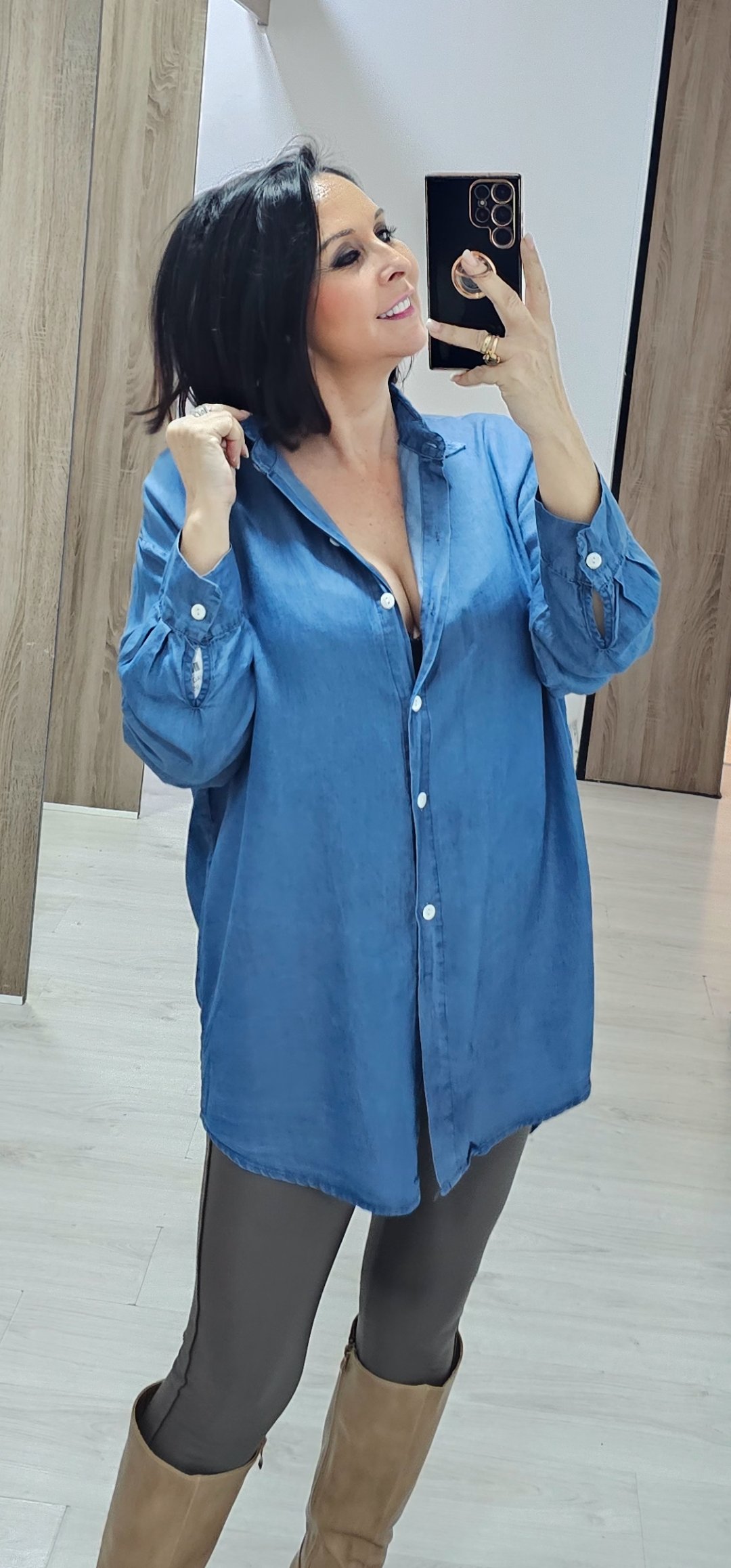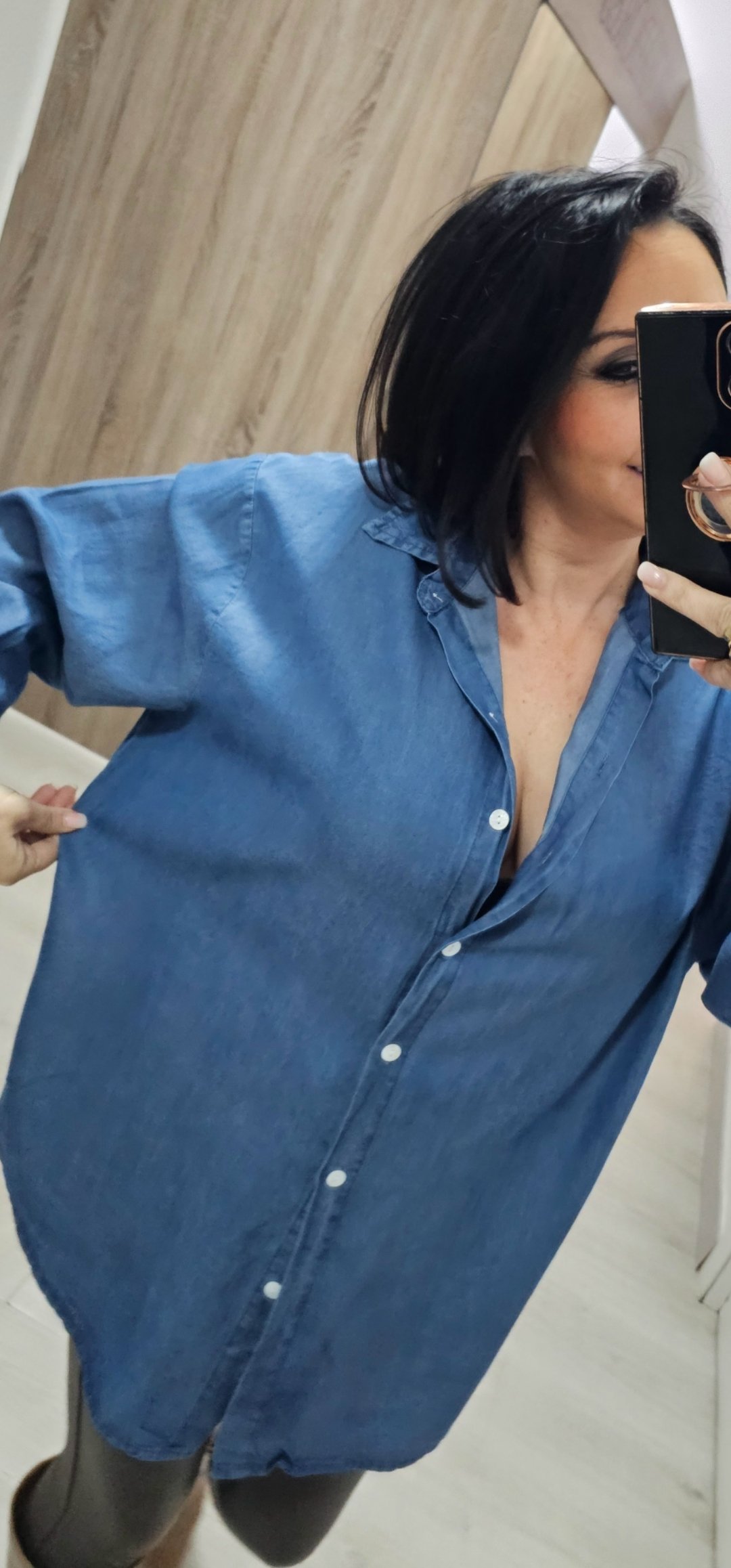 Monisima camisa camisera oversance en tejido vaquero en color vaquero oscuro con un tejido ligero y suave ,sin elástico