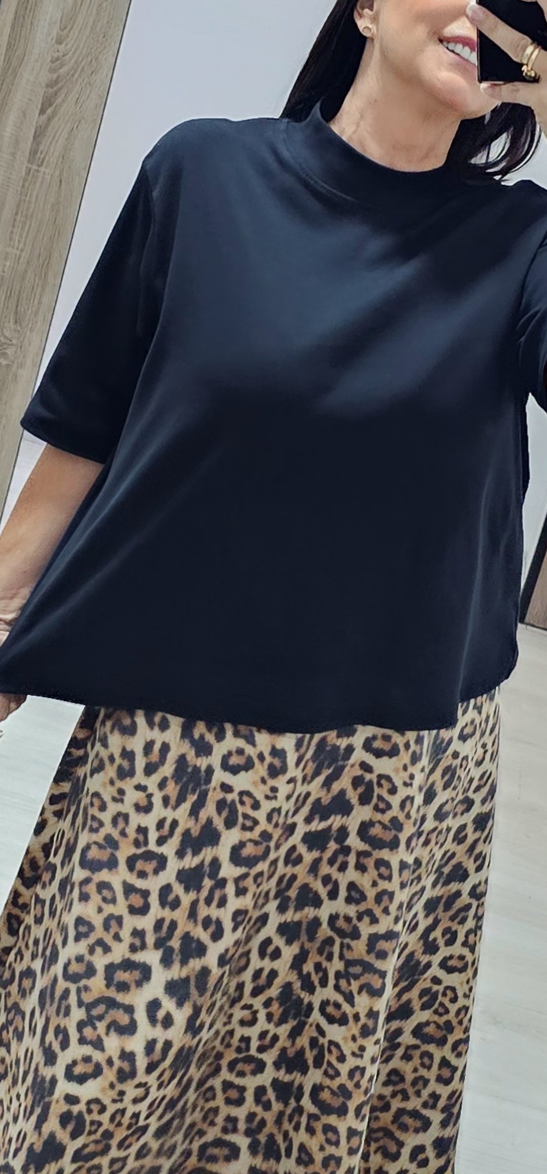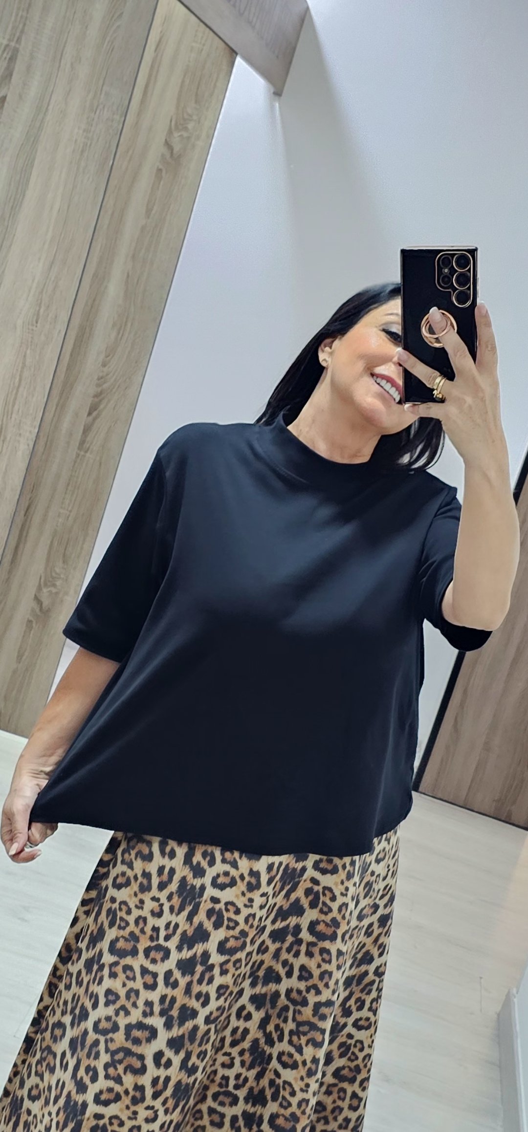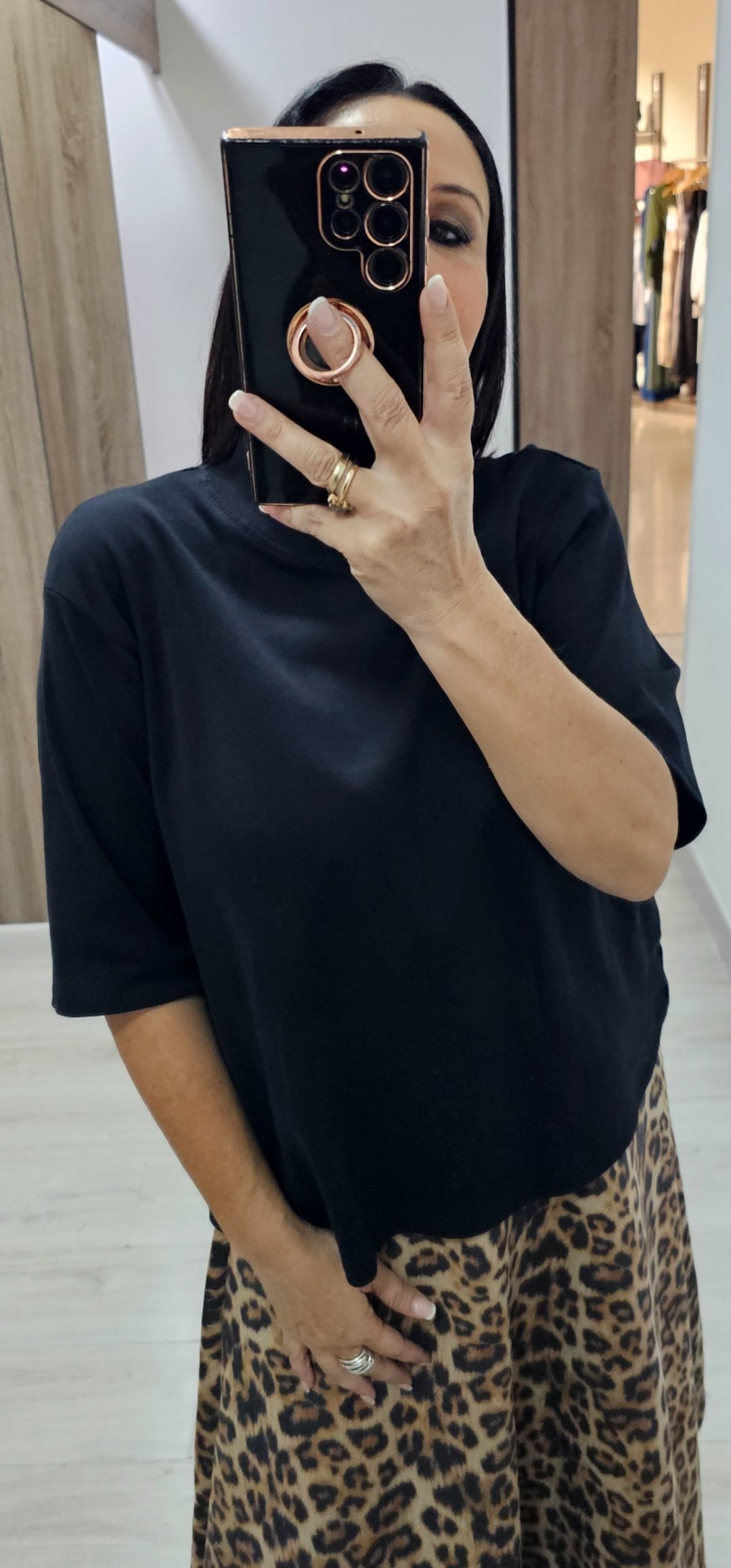 Monisima y cómoda camiseta básica con un corte un poco oversance mangas al codo y cuello a la caja alto