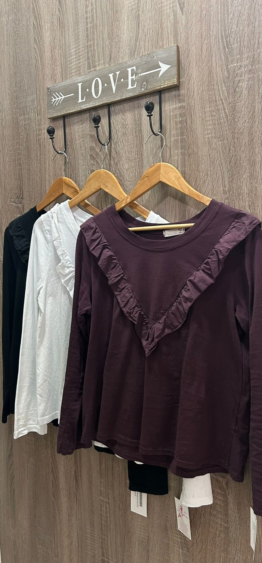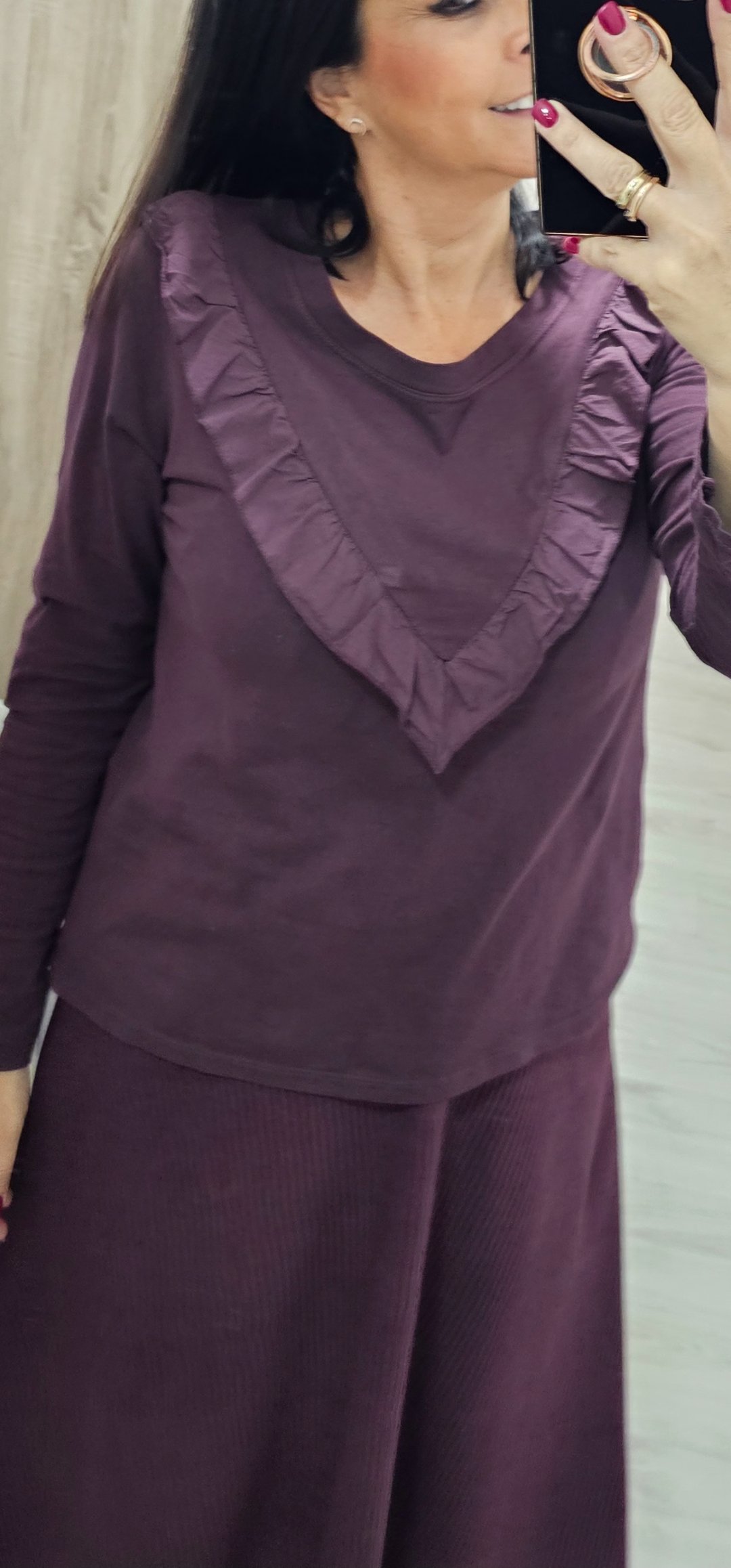 Monisima camiseta en tejido de algodón con adorno de volantes en uve por delante y por detrás
