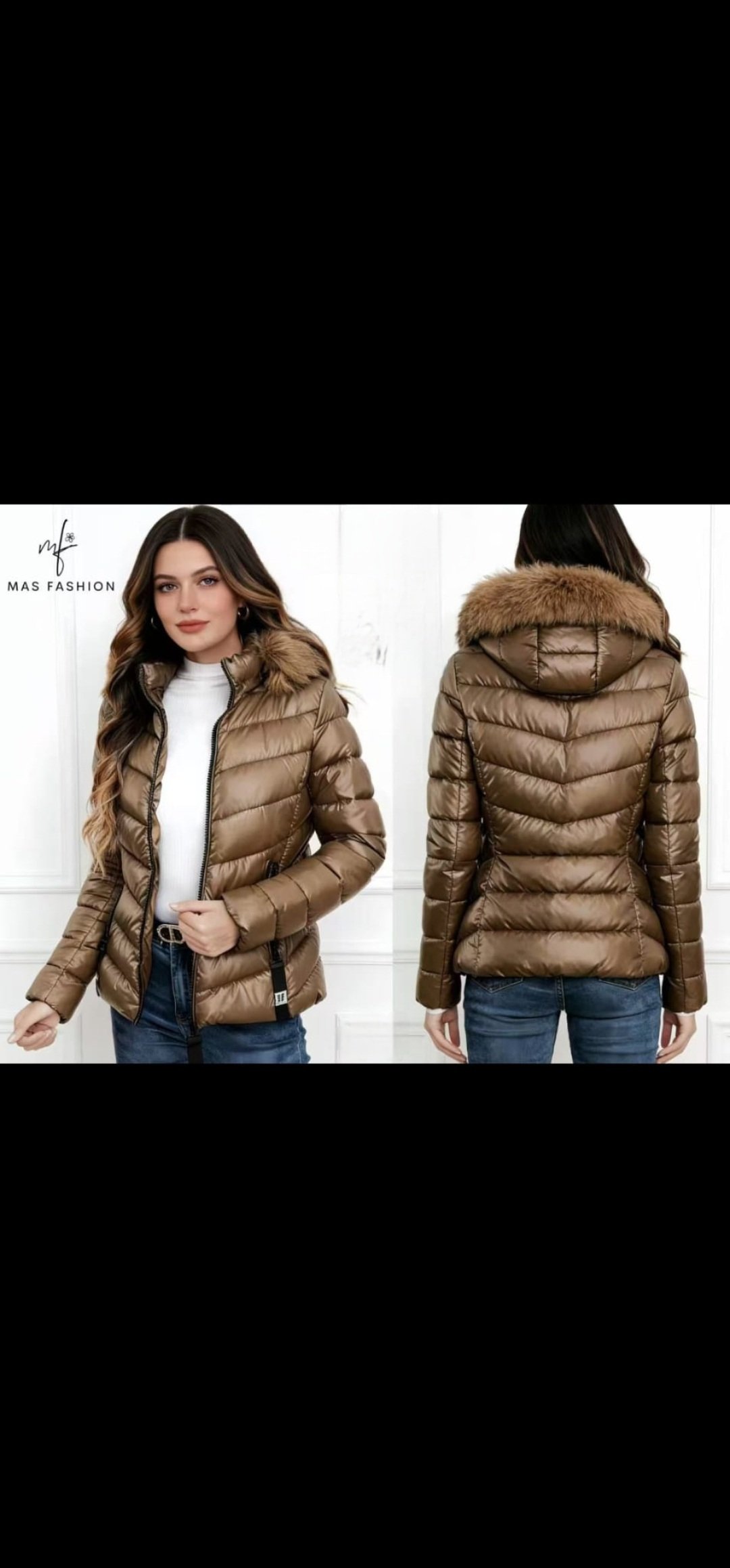 Monisimo chaqueta acolchada tipo pluma en color bronce con cierre de cremallera y capucha con pelo desmontable súper ligero y calentito