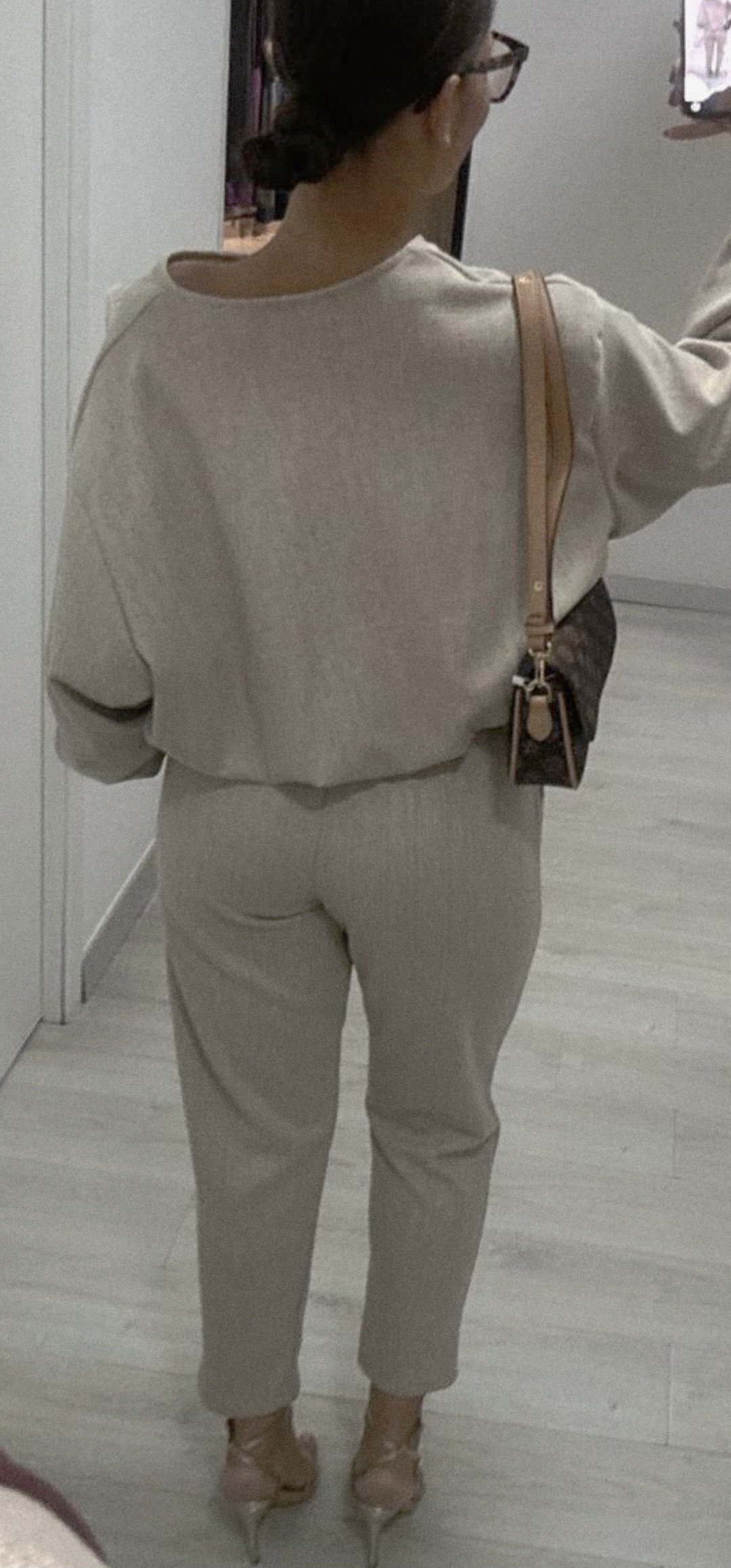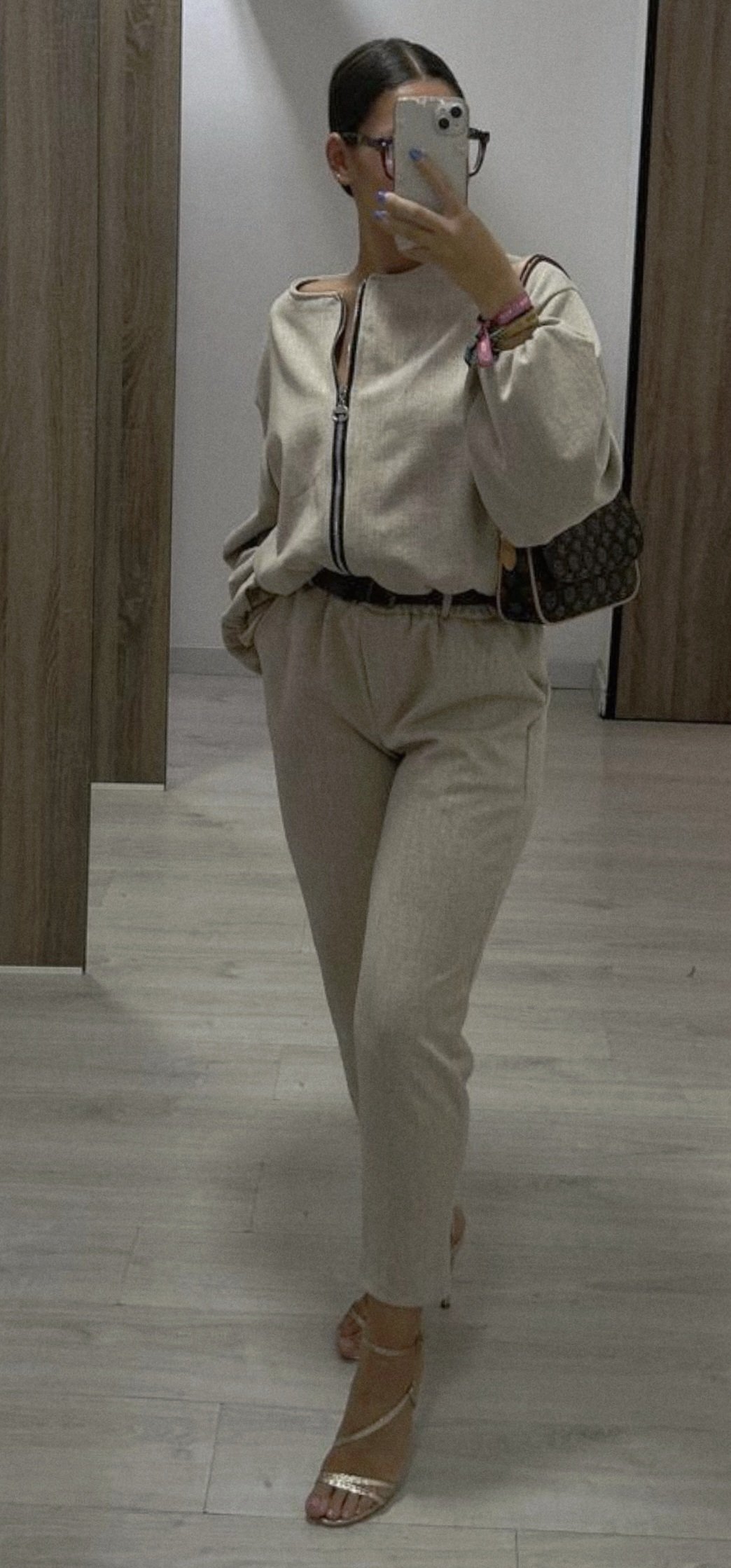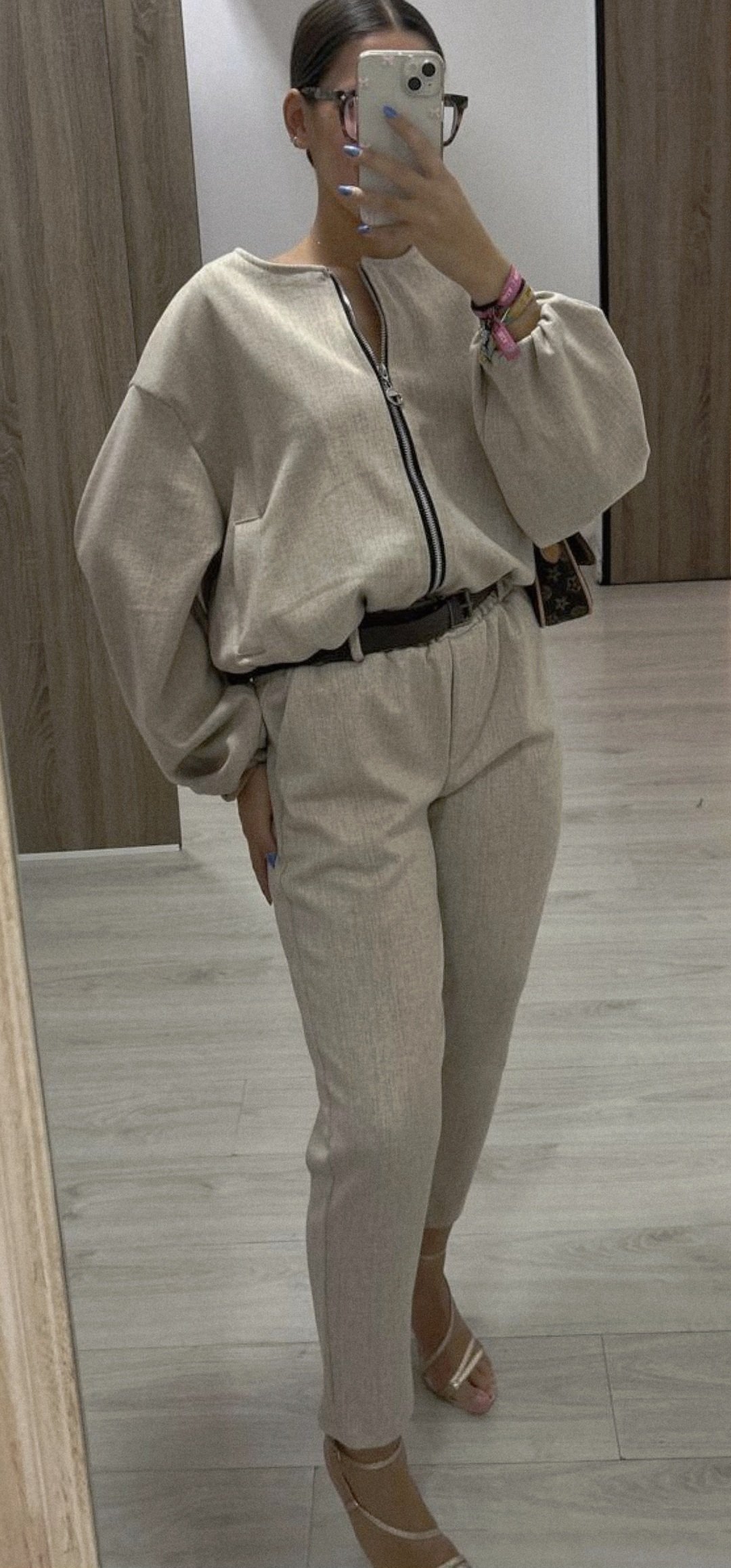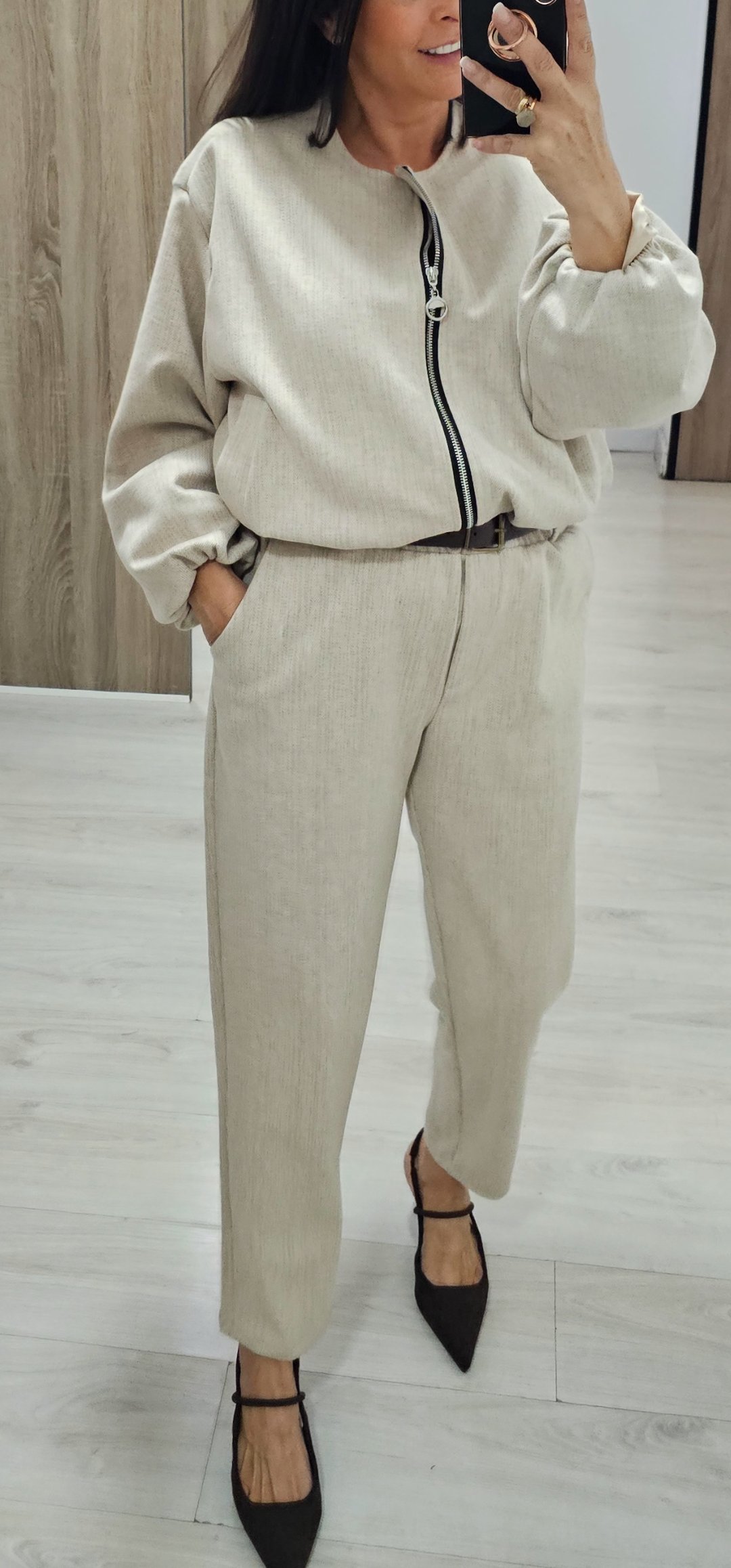 Monisimo conjunto de 2 piezas en tejido de paño suave con un corte elegante y sport a la vez el pantalón lleva cintura elástica y trae cinturón, la chaqueta es tipo bomber va forrada y cierre de cremallera color beige