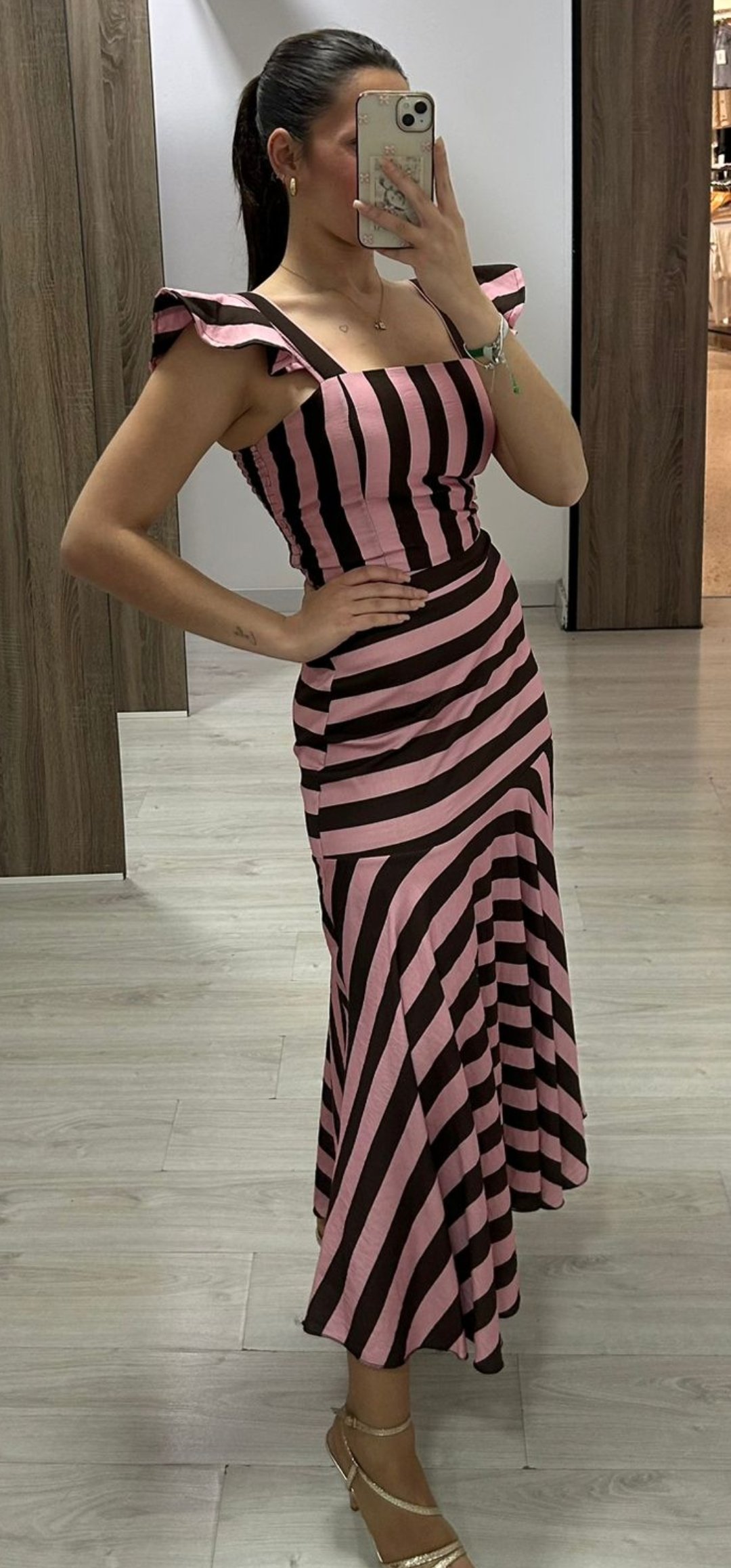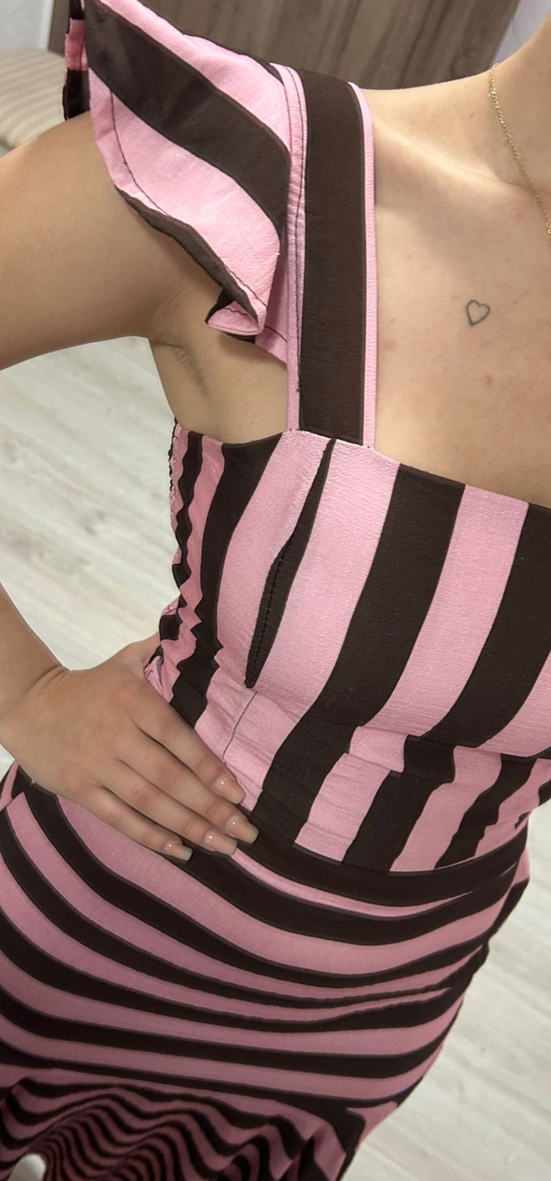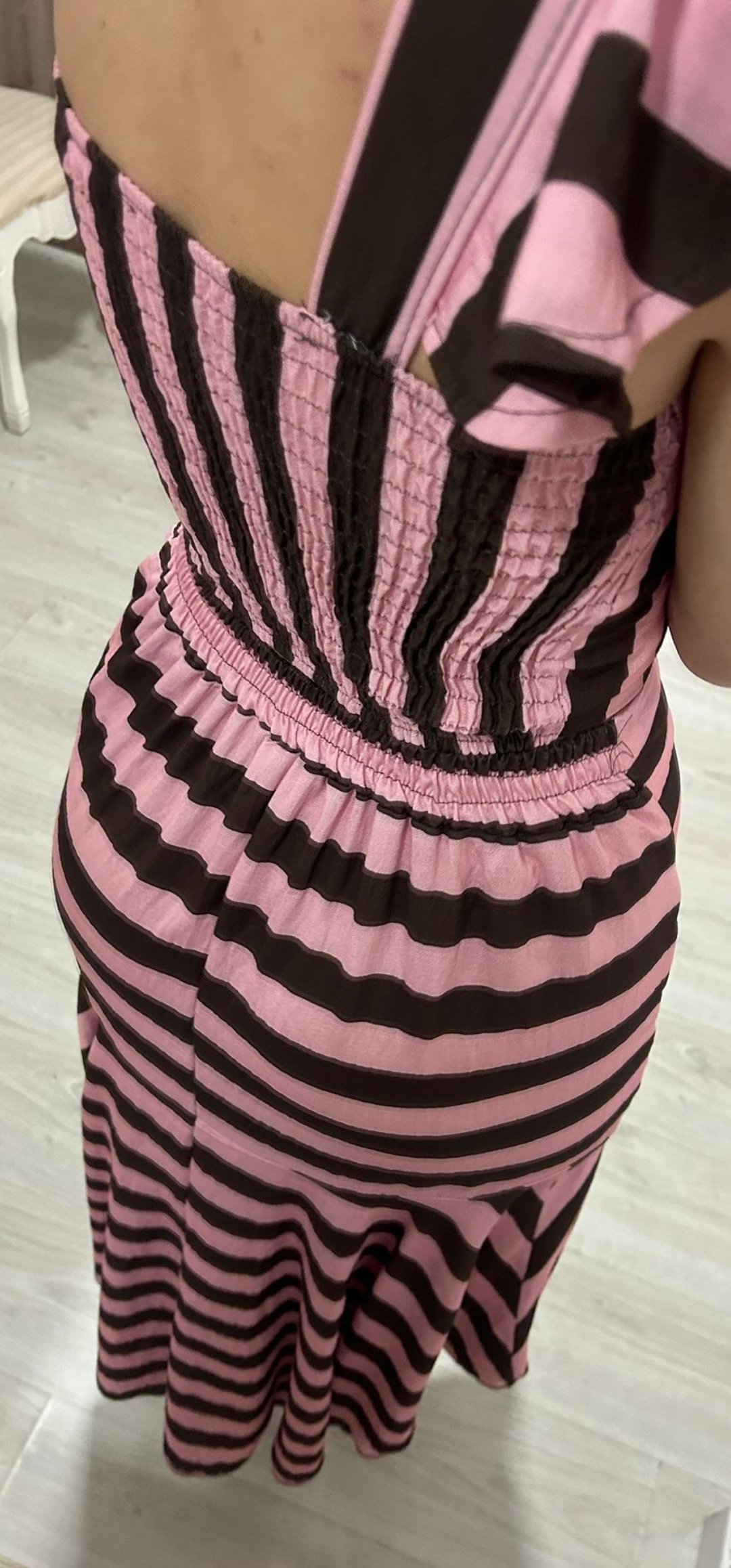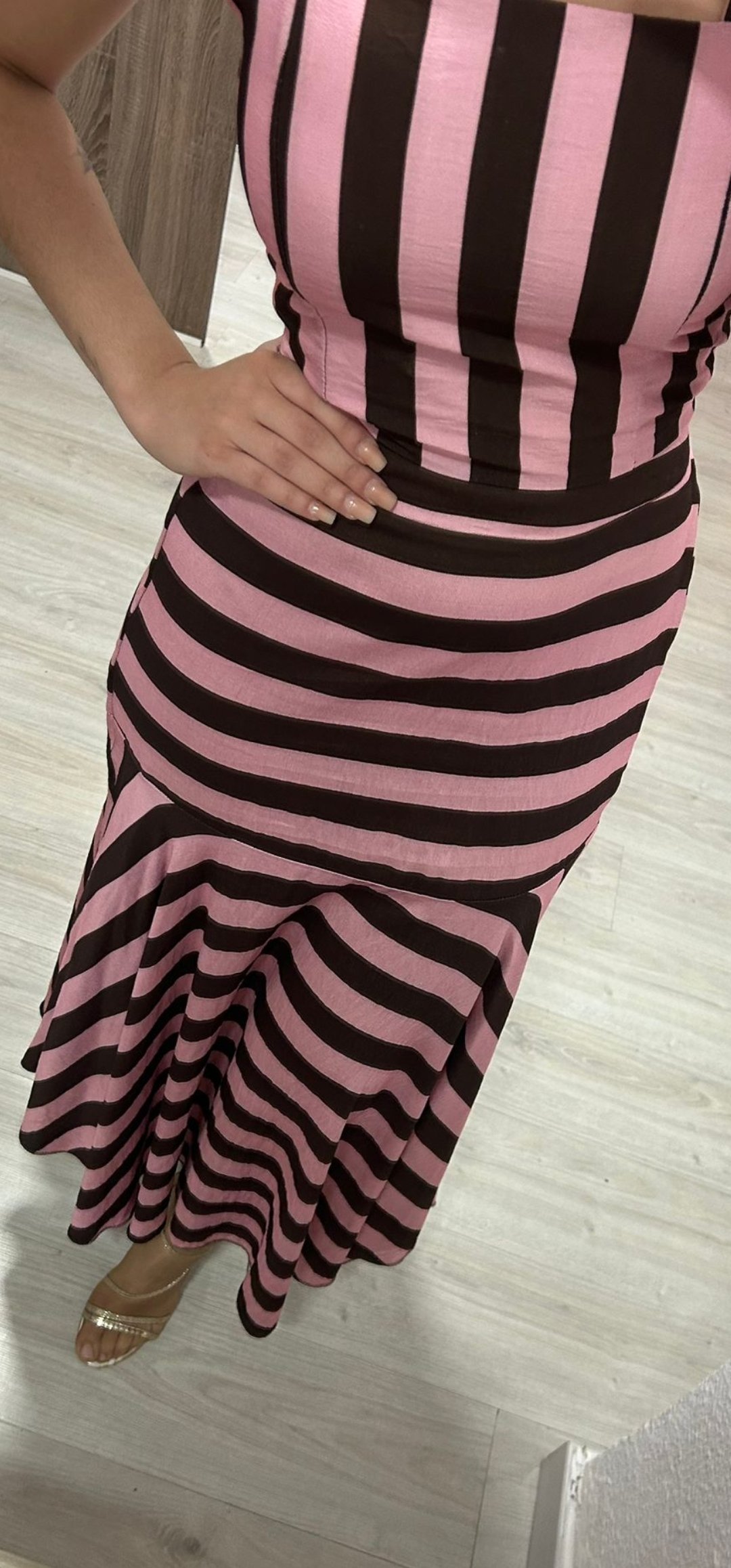 Monisimo conjunto de 2 piezas top y falda con un corte muy juvenil en tejido de viscosa y un estampado de rayas chocolate y rosa ,lleva la cintura elástica