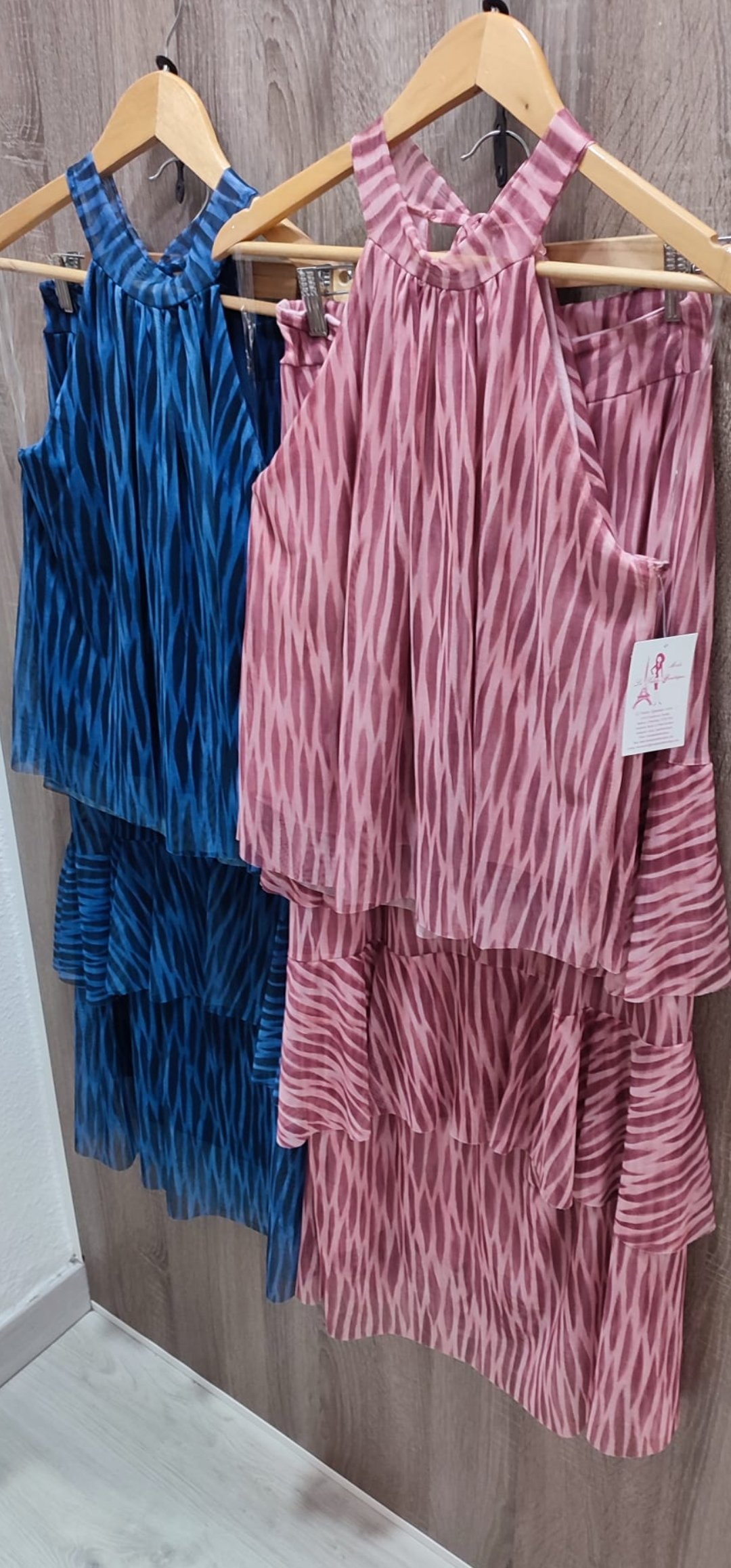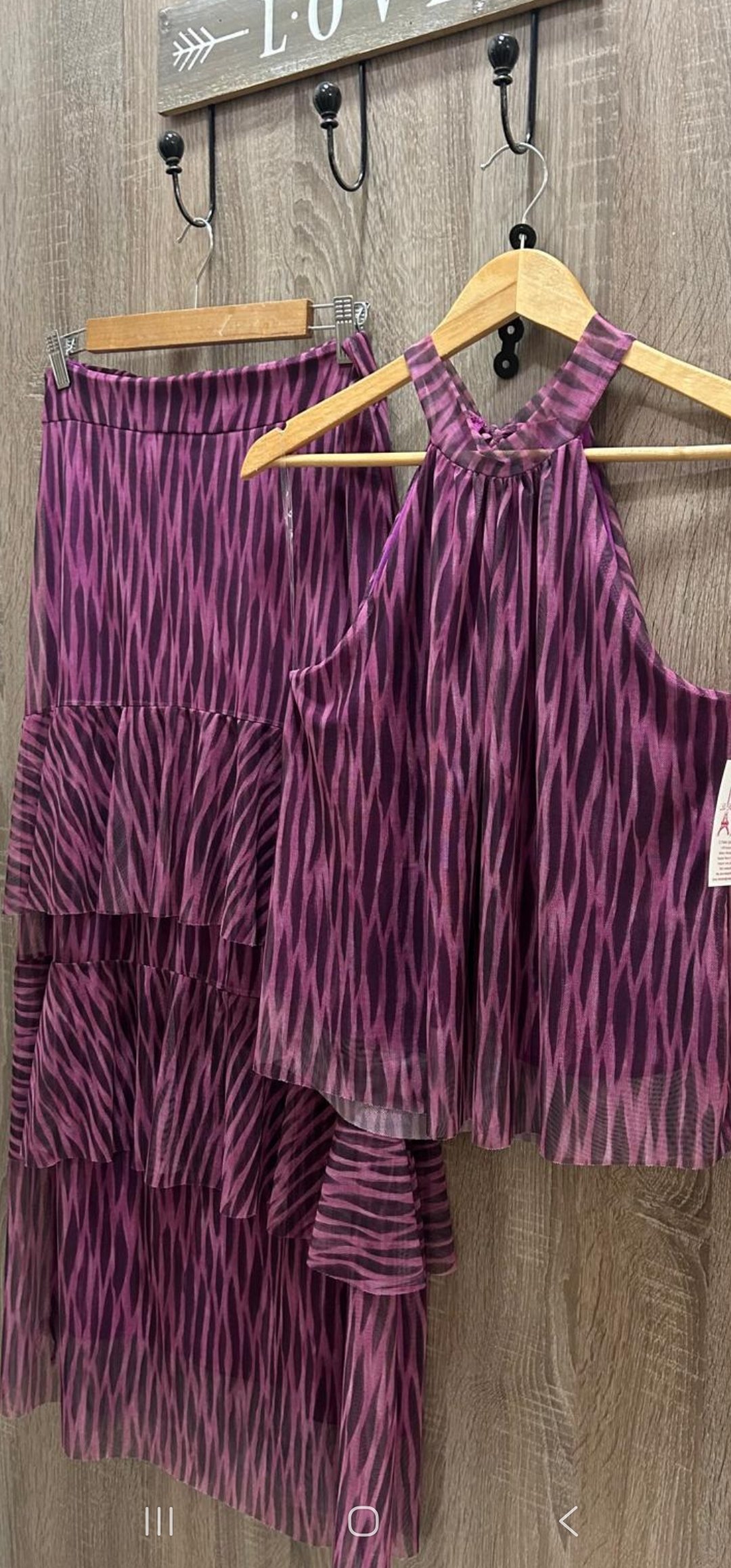 Monisimo conjunto de 2 piezas en tejido de tull elástico en un estampado super original .La falda de lleva cintura elástica y volante ‘la blusa lleva cuello hilter con lazada detras