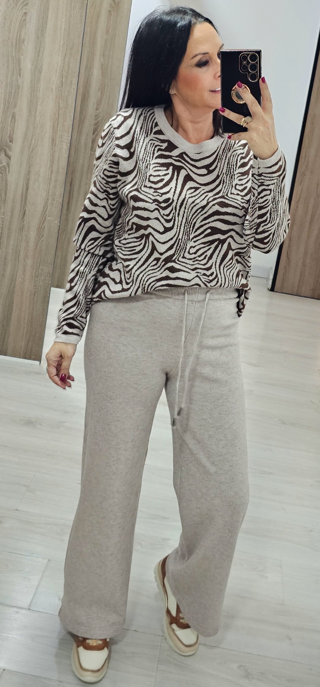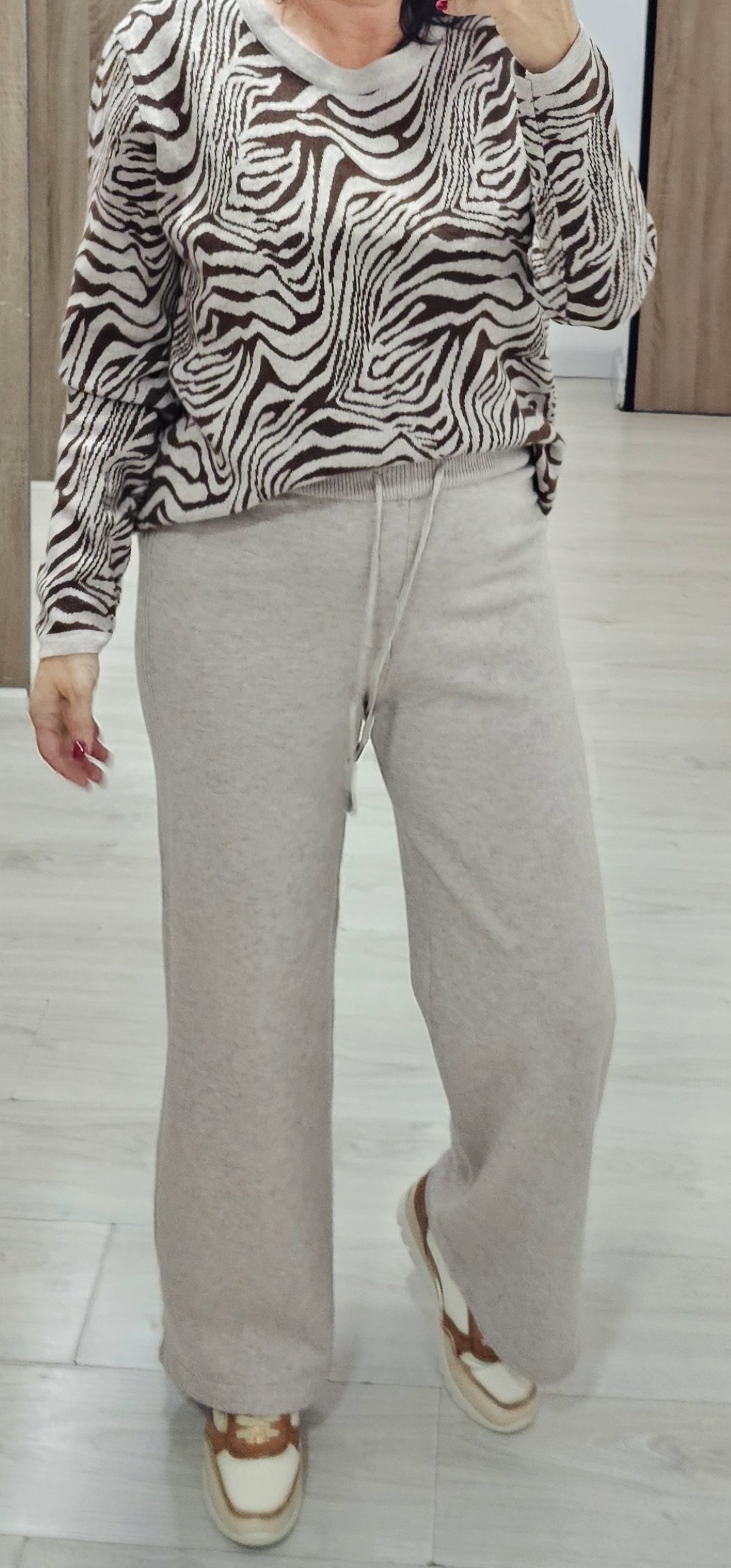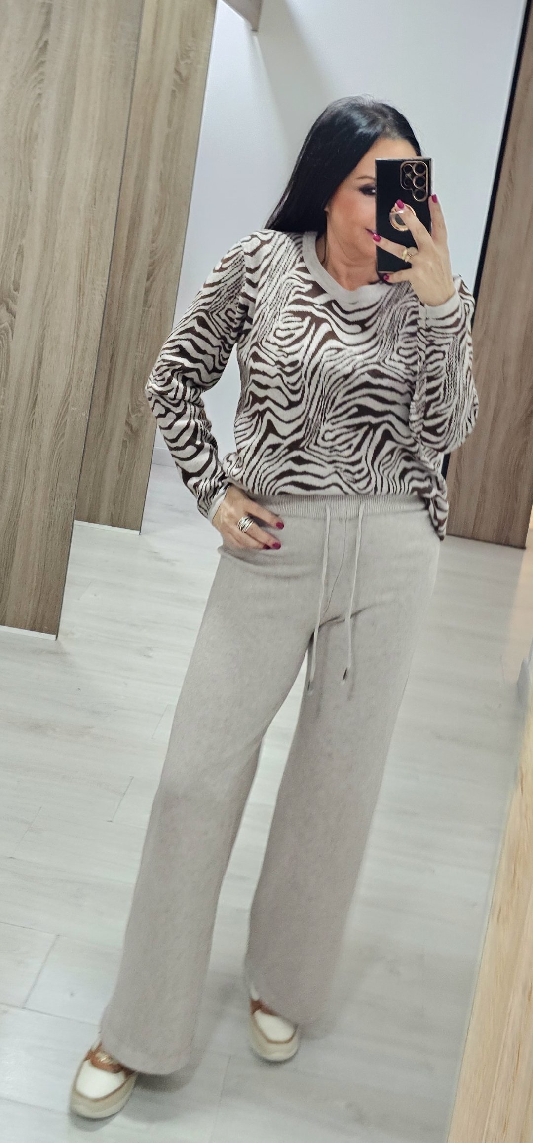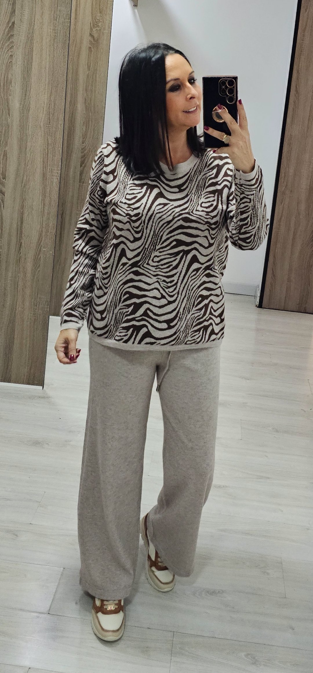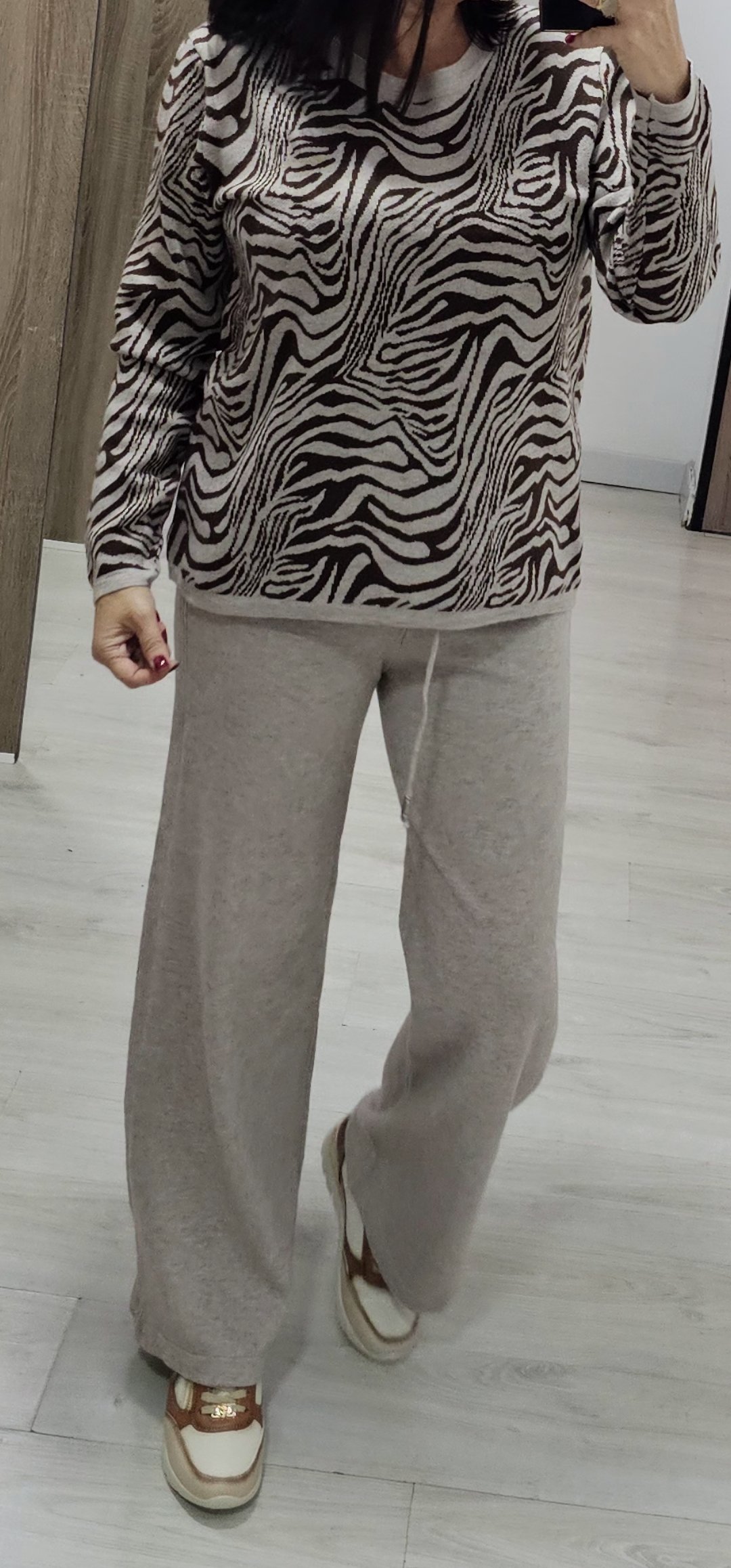 Monisimo conjunto en tejido de punto con pantalón de pata recta con cintura elástica y cordón, la parte de arriba es un jersey estampado con cuello a la caja un conjunto ideal para esta temporada como y calentito