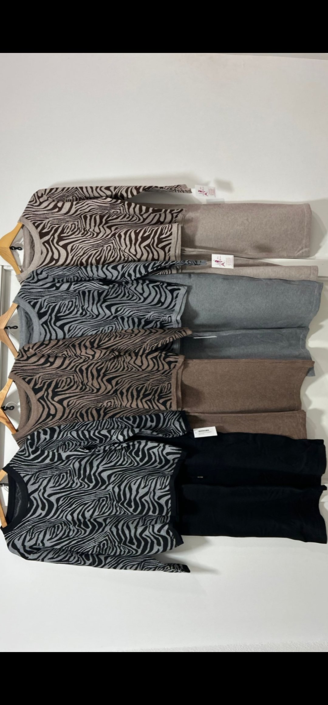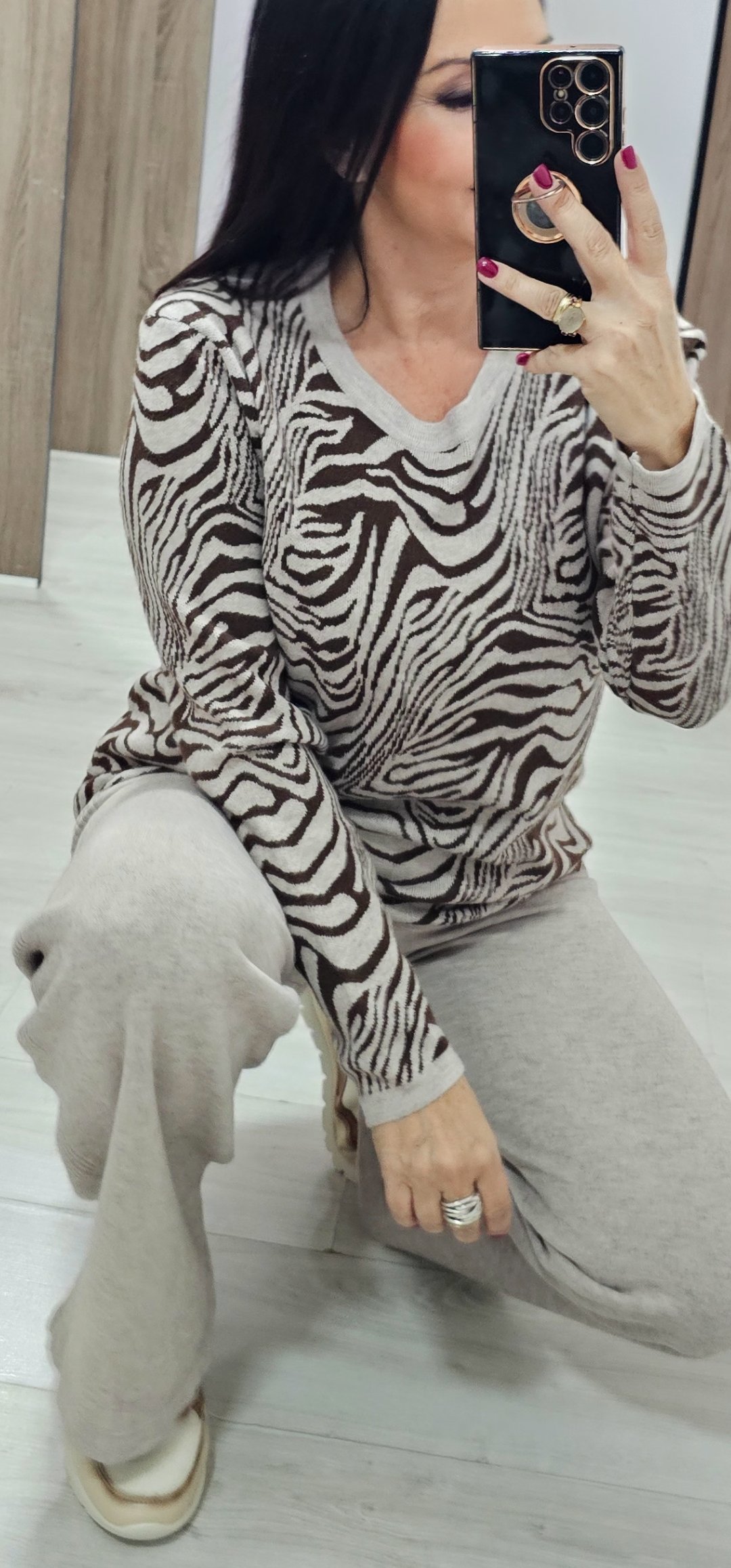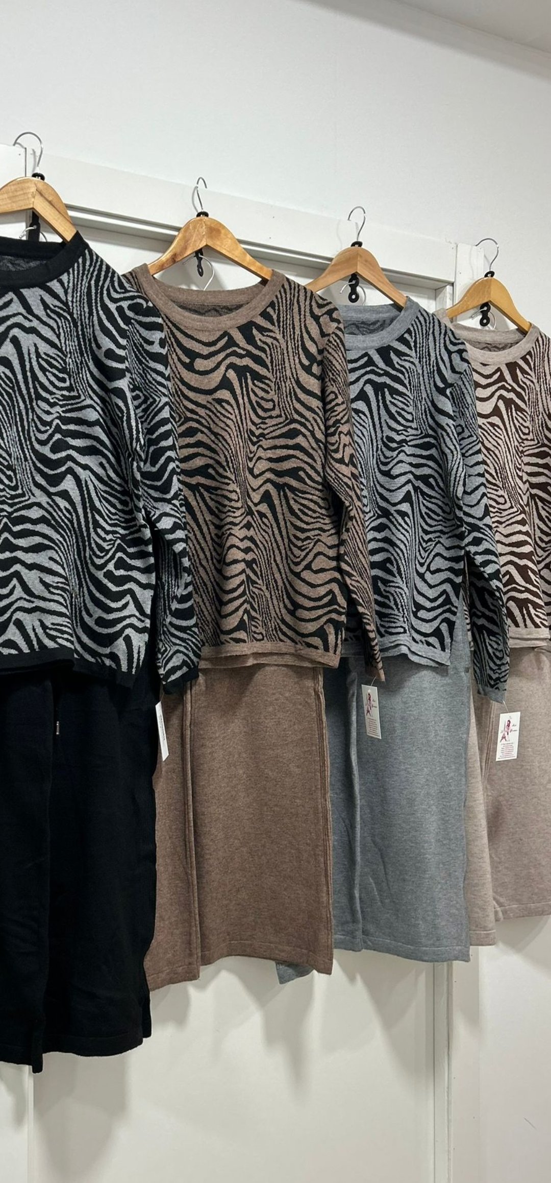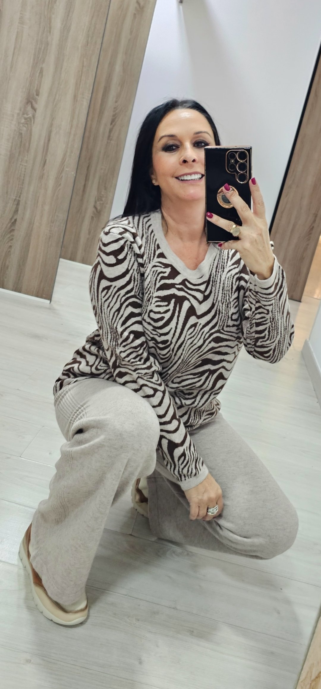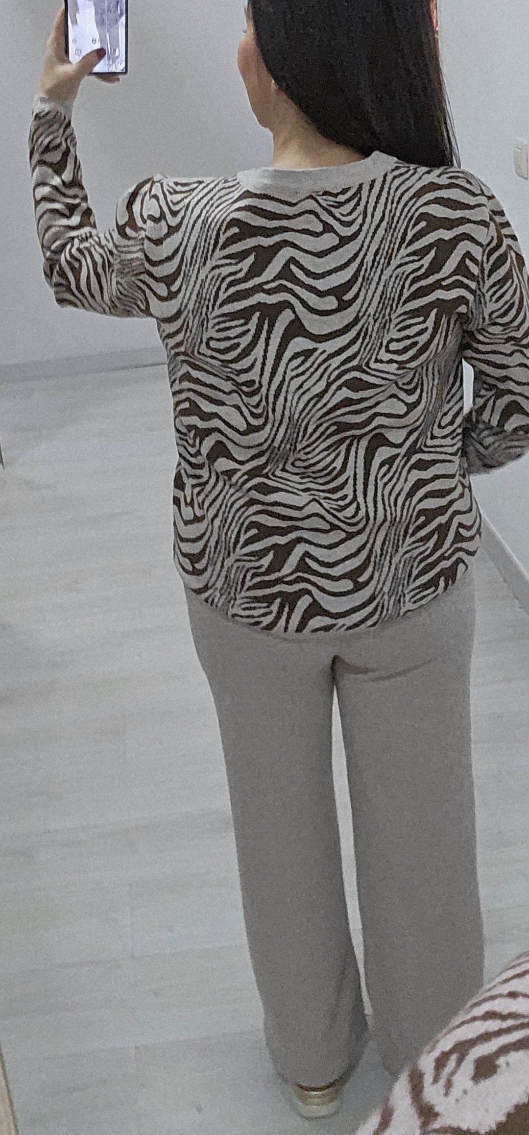 Monisimo conjunto en tejido de punto con pantalón de pata recta con cintura elástica y cordón, la parte de arriba es un jersey estampado con cuello a la caja un conjunto ideal para esta temporada como y calentito