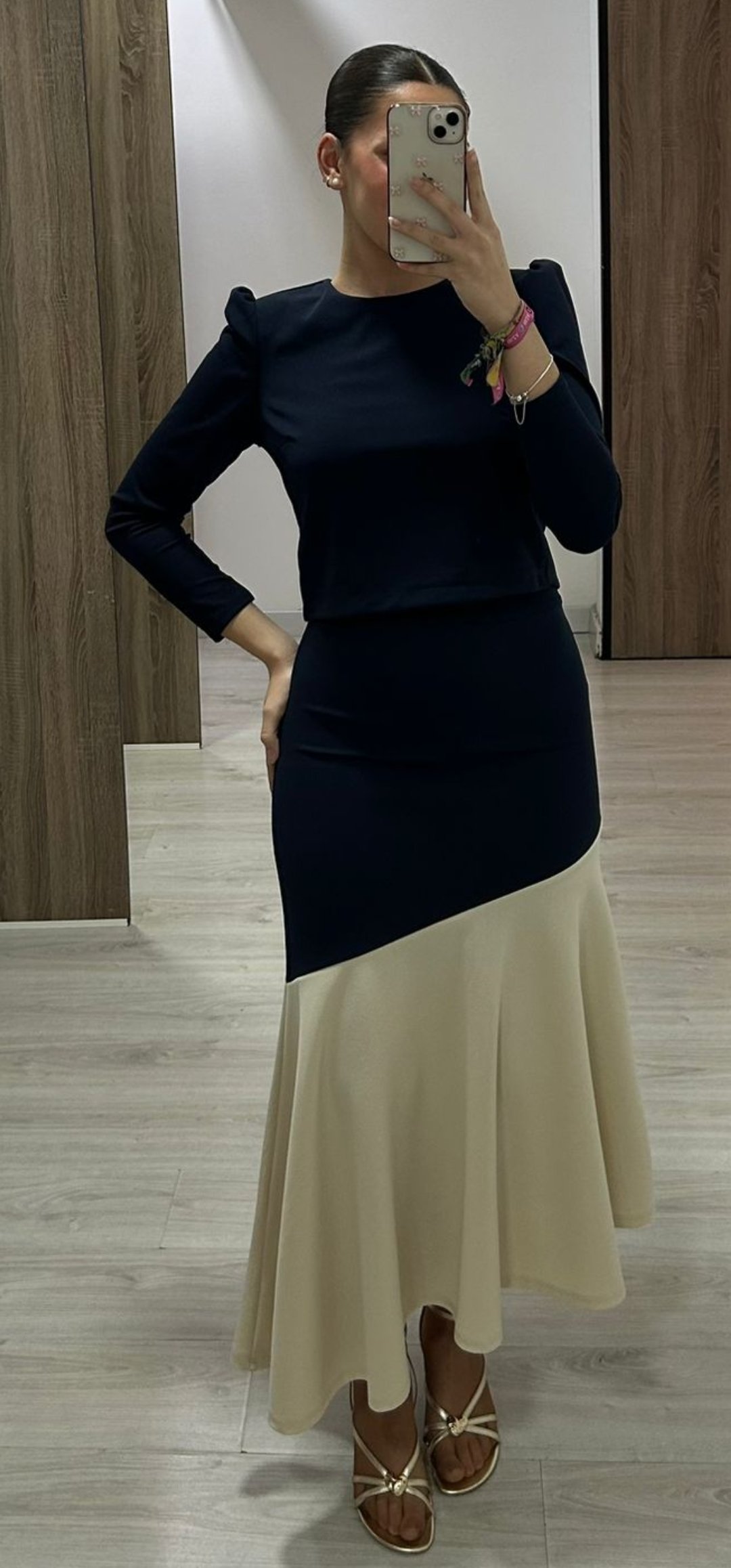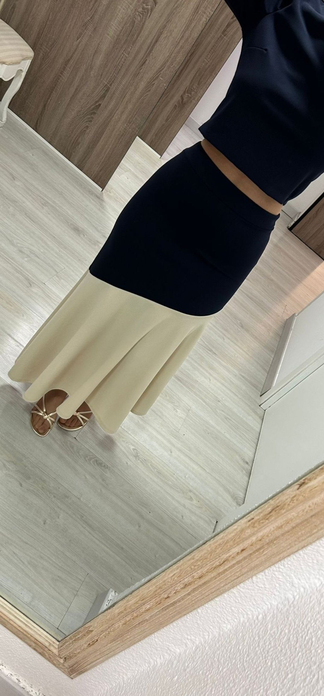 Espectacular conjunto de 2 piezas en tejido crep elástico con blusa abotonada con botones forrados y trebilla del mismo tejido con falda con corte midi bicolor y cintura elástica