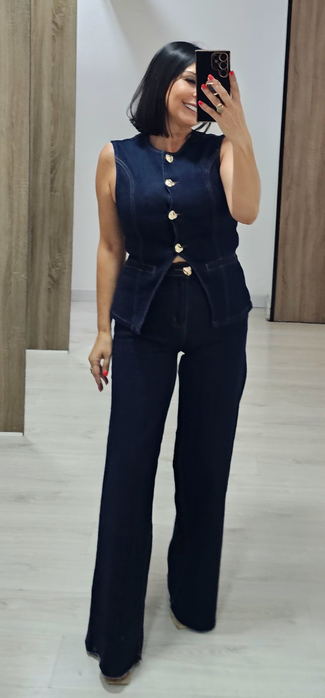 Monisimo conjunto de 2 piezas chaleco y pantalón en tejido vaquero con un poco de elastan con un corte súper bonito y elegante, el chaleco va abotonado con botones dorados y el pantalón es de tiro alto y pata recta ancha con terminación desflecado cierre de botón y cremallera.Color vaquero oscuro