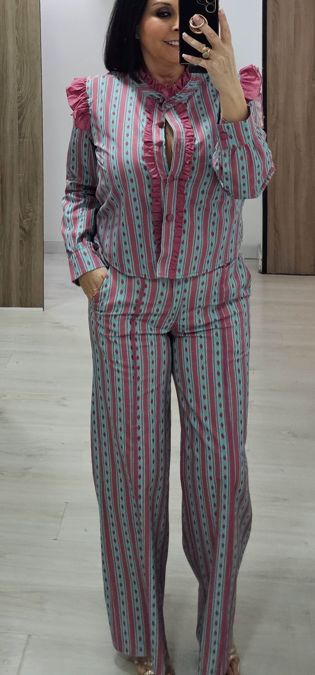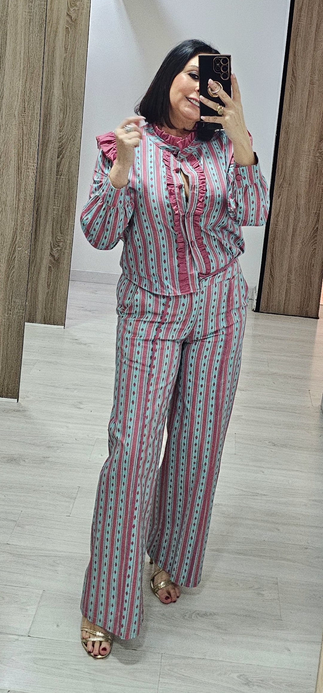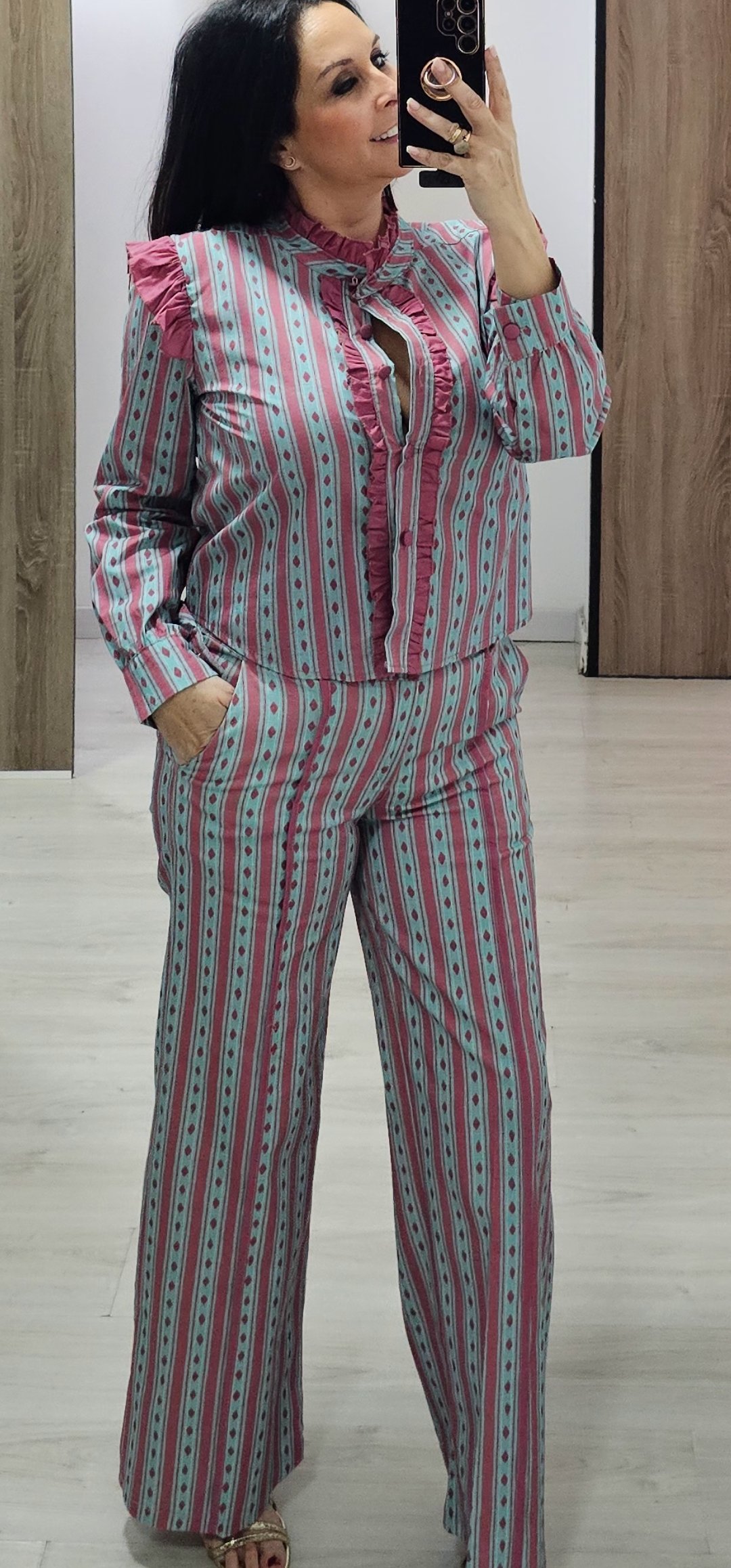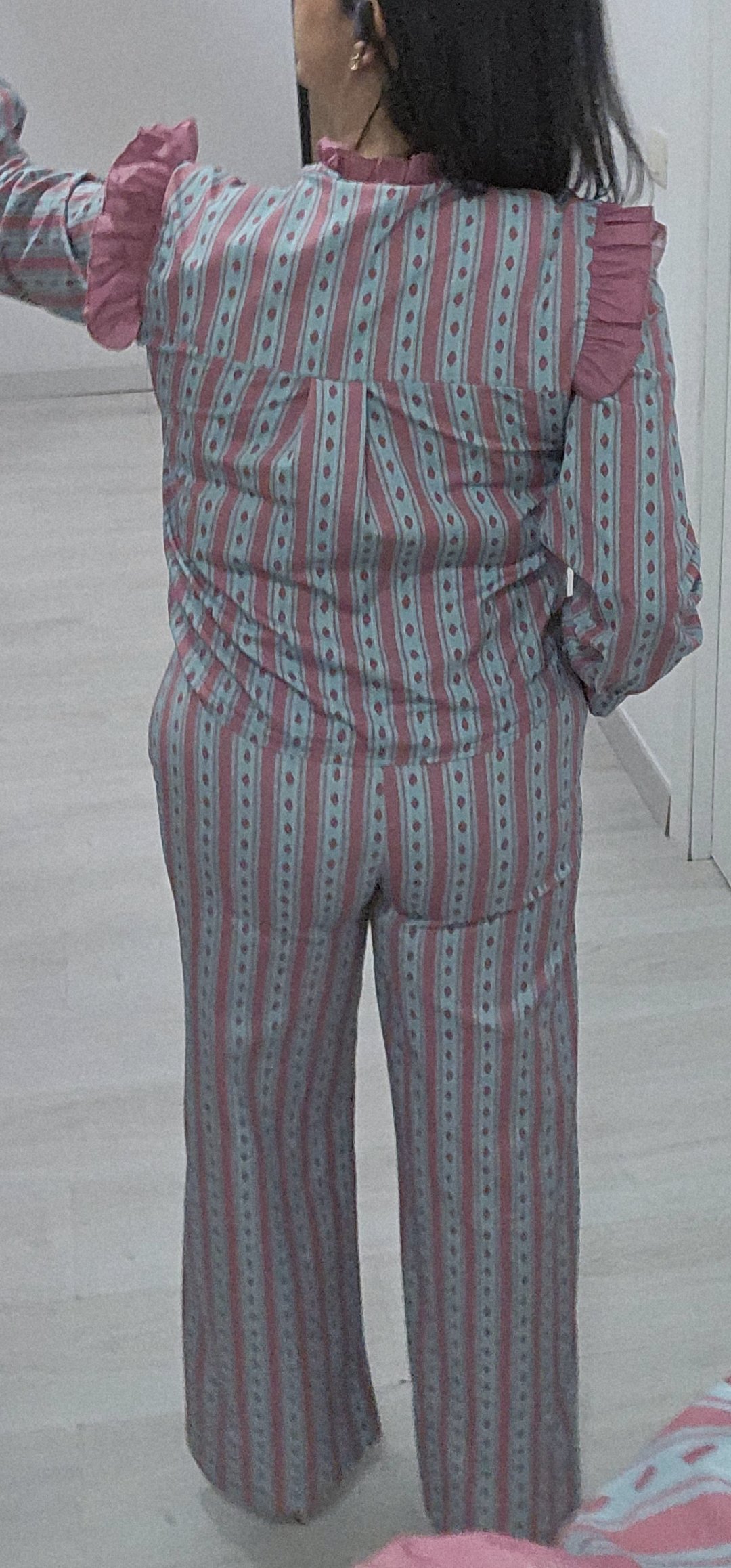 Monisimo conjunto de 2 piezas de pantalón de pata recta con cintura elástica y bolsillos, la camisa es preciosa con un corte muy juvenil.El tejido es elástico y un estampado súper original