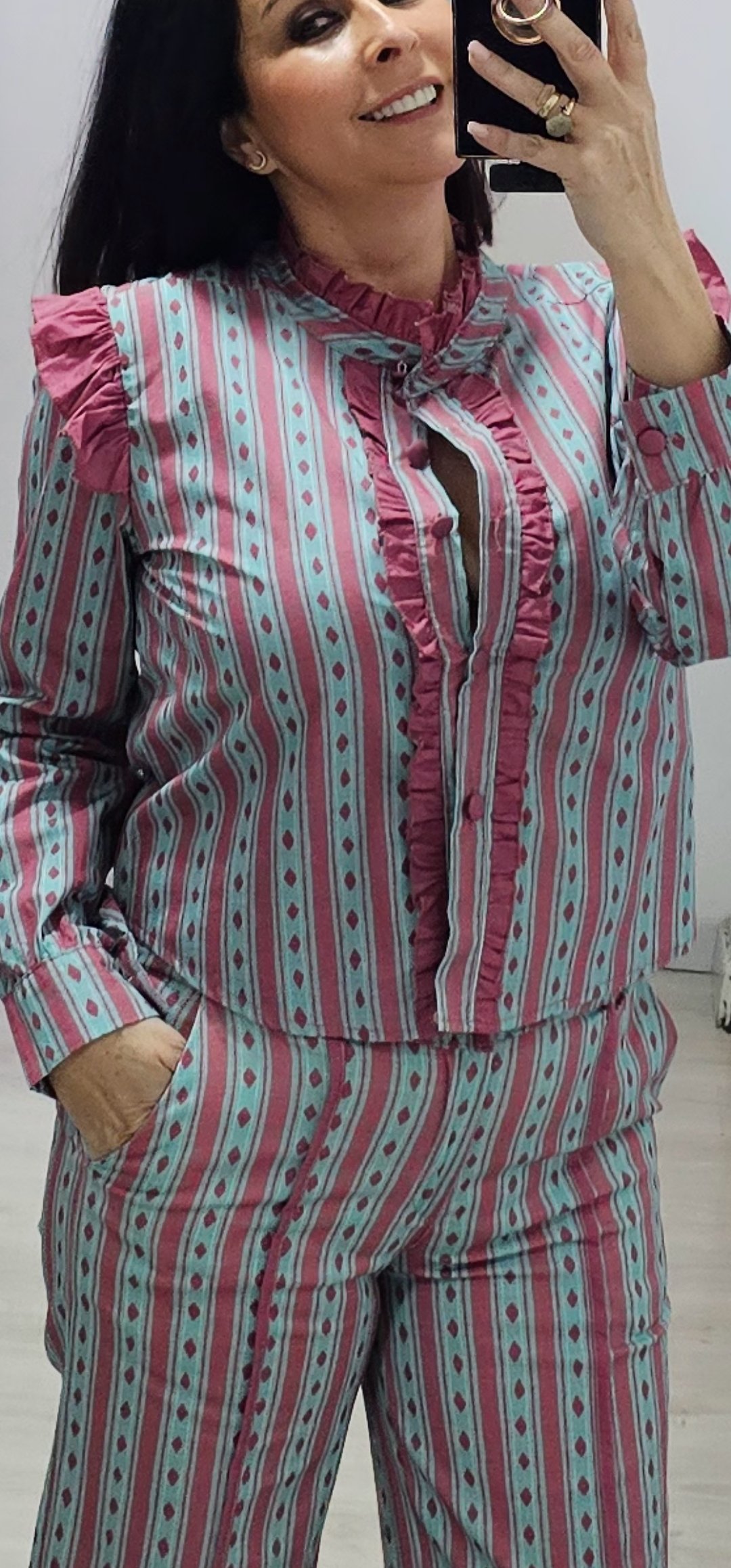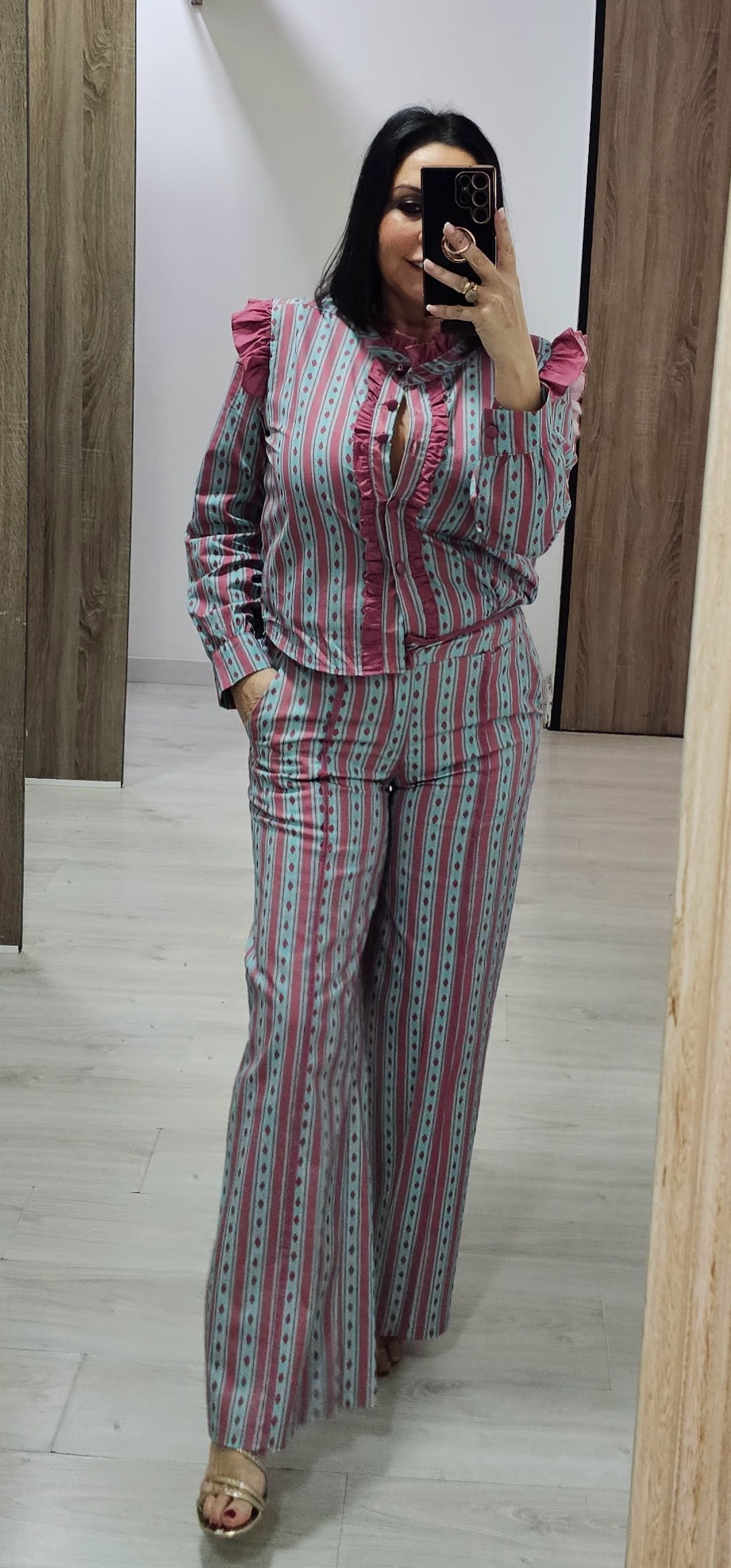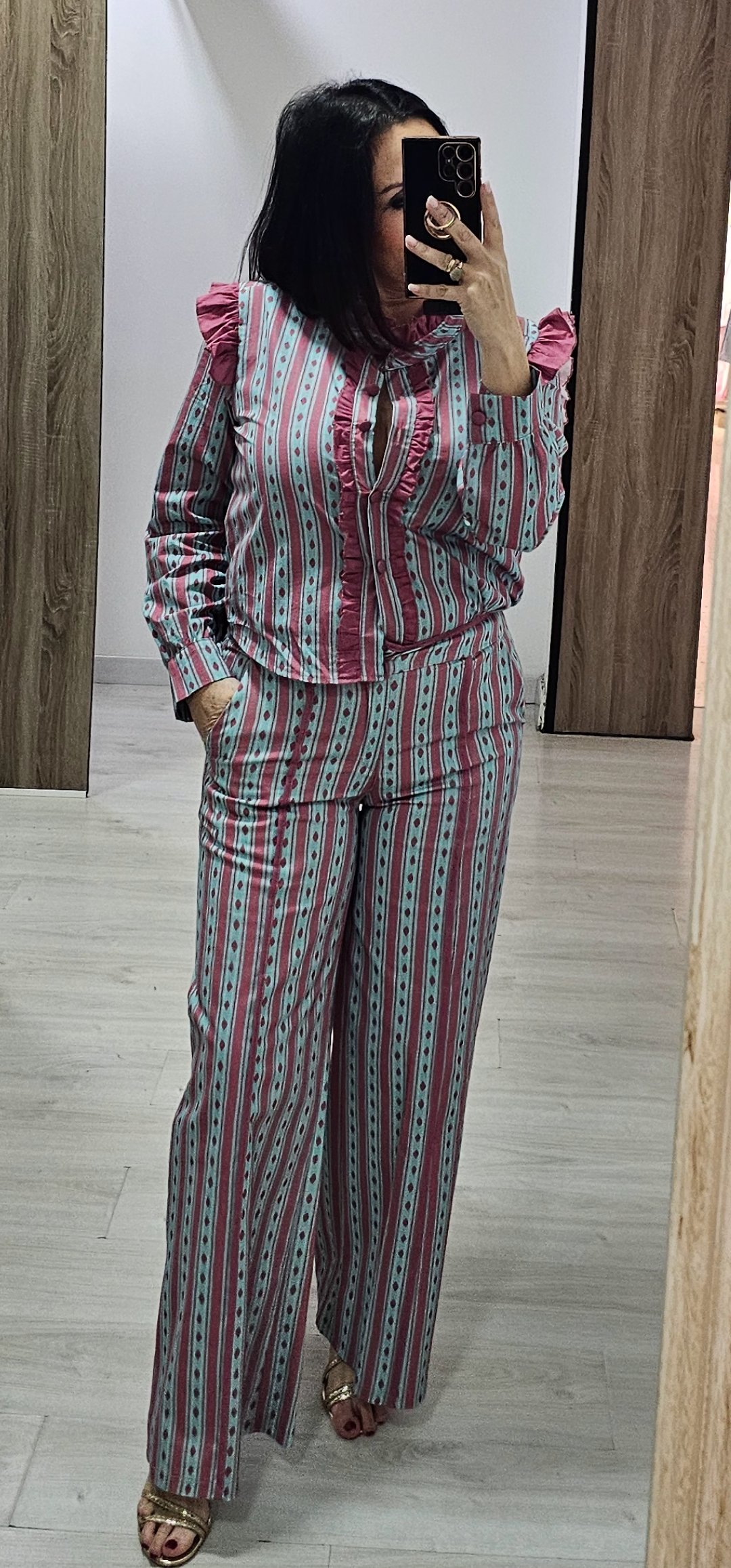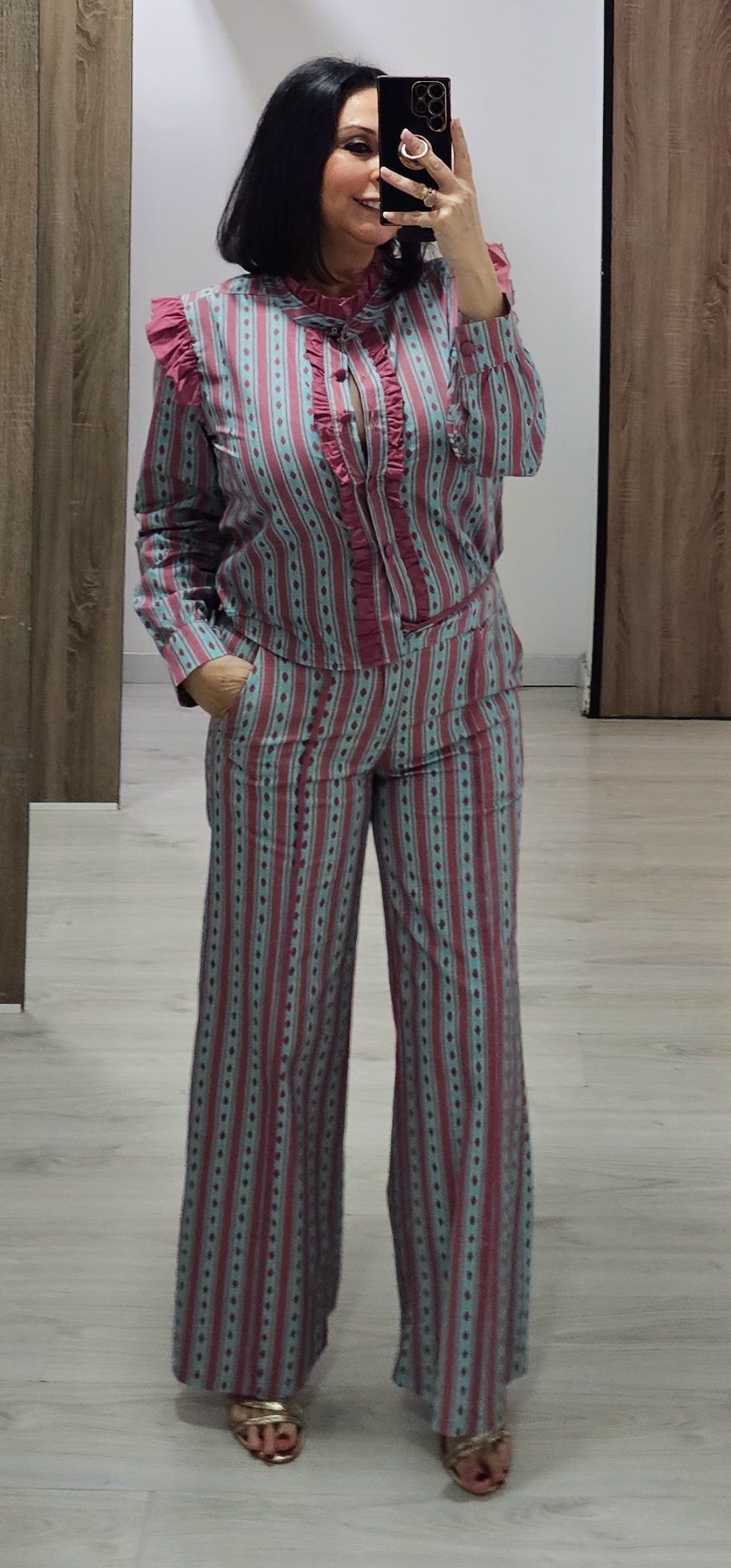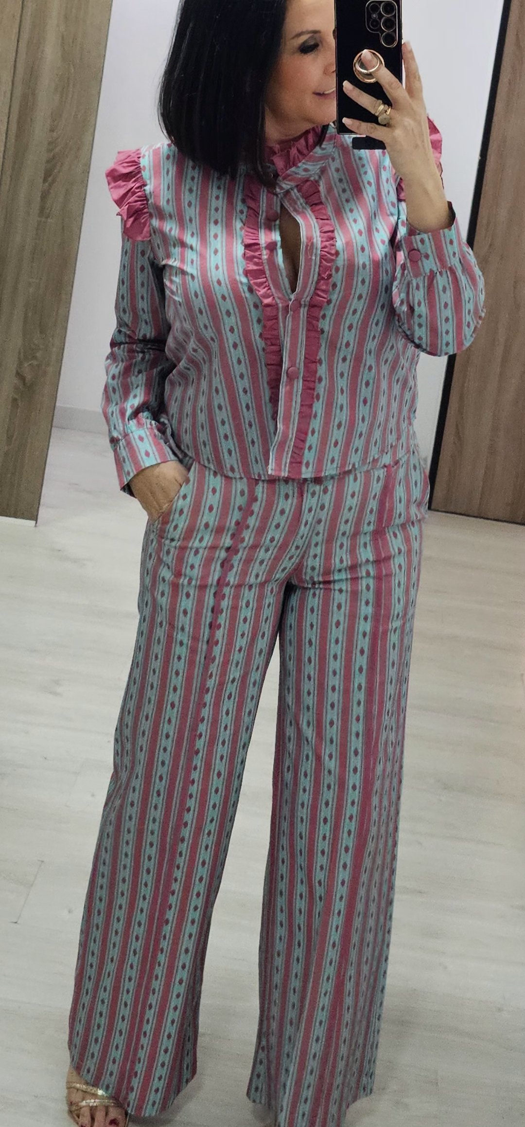 Monisimo conjunto de 2 piezas de pantalón de pata recta con cintura elástica y bolsillos, la camisa es preciosa con un corte muy juvenil.El tejido es elástico y un estampado súper original