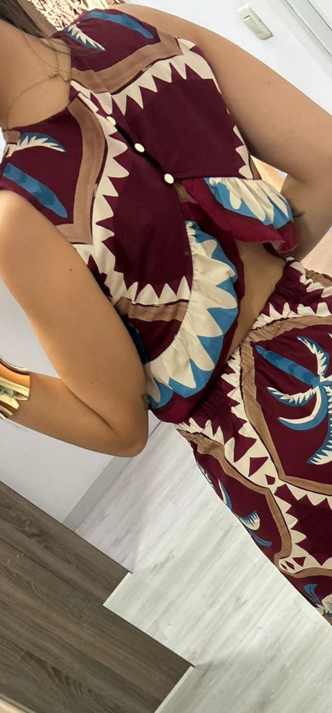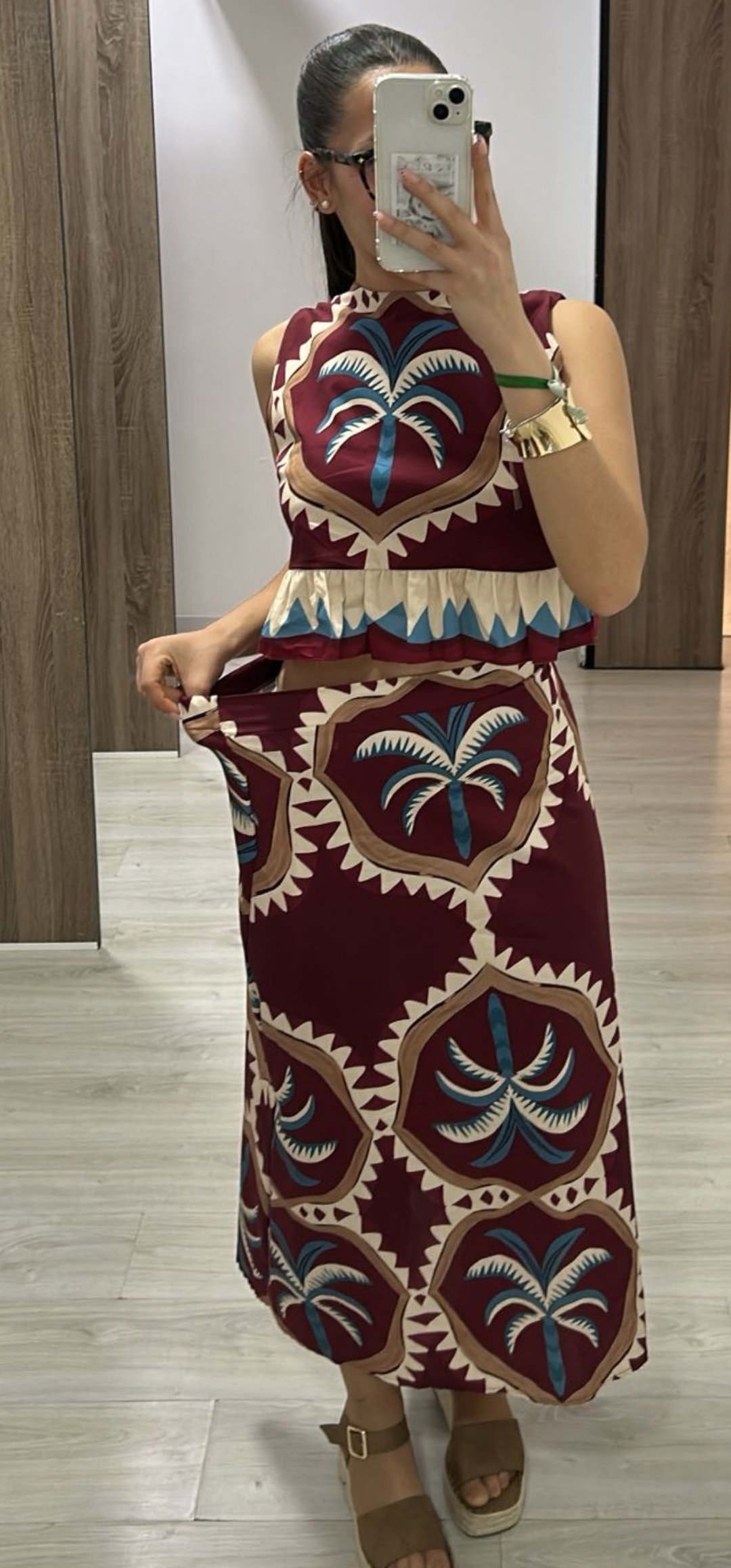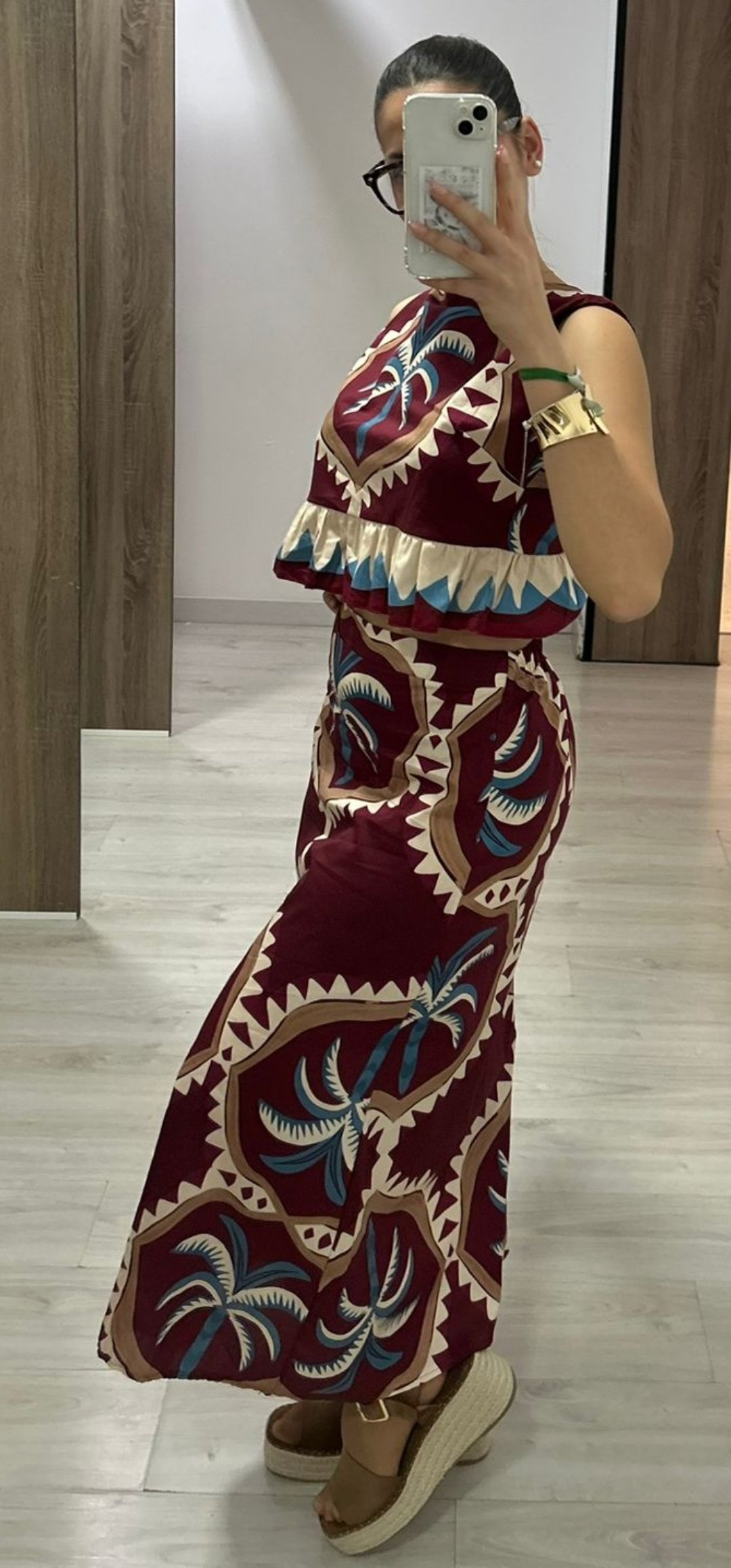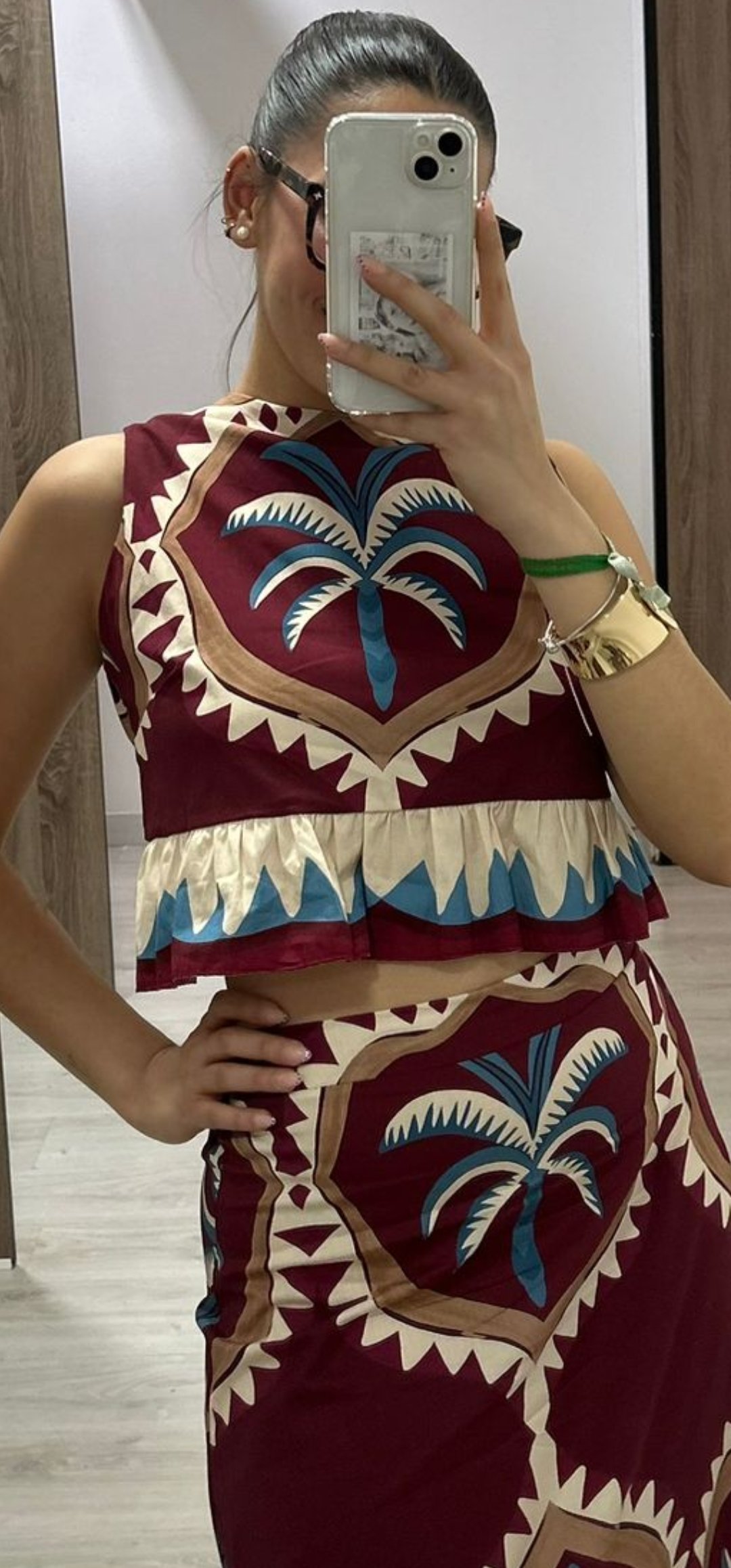 Monisimo conjunto de dos piezas falda larga con cintura elástica , el top tiene un corte muy juvenil y cerrado con botones , el tejido es algodón