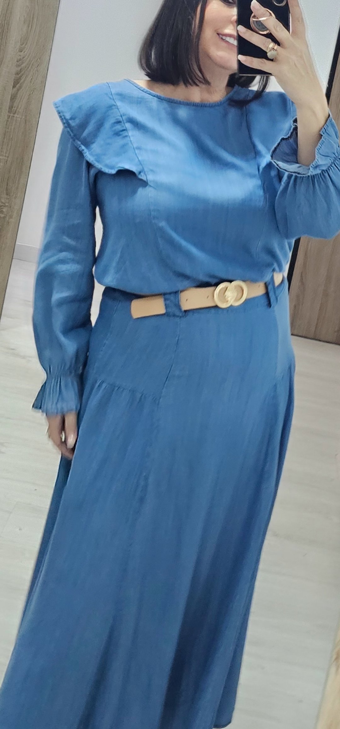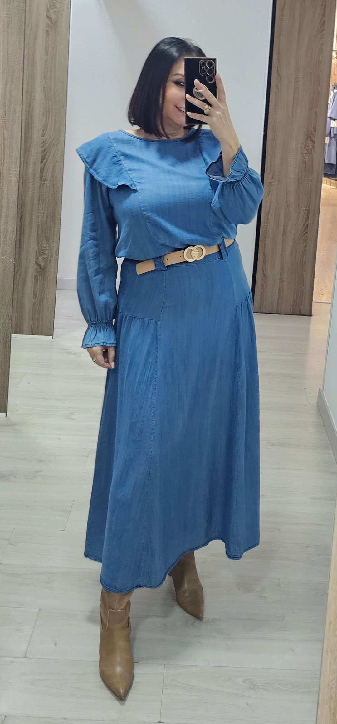 Monisimo conjunto de 2 piezas en tejido vaquero Fluido con un corte súper bonito, la blusa lleva volantes y la falda lleva cinturón incluido. Talla única da talla hasta 42aprox