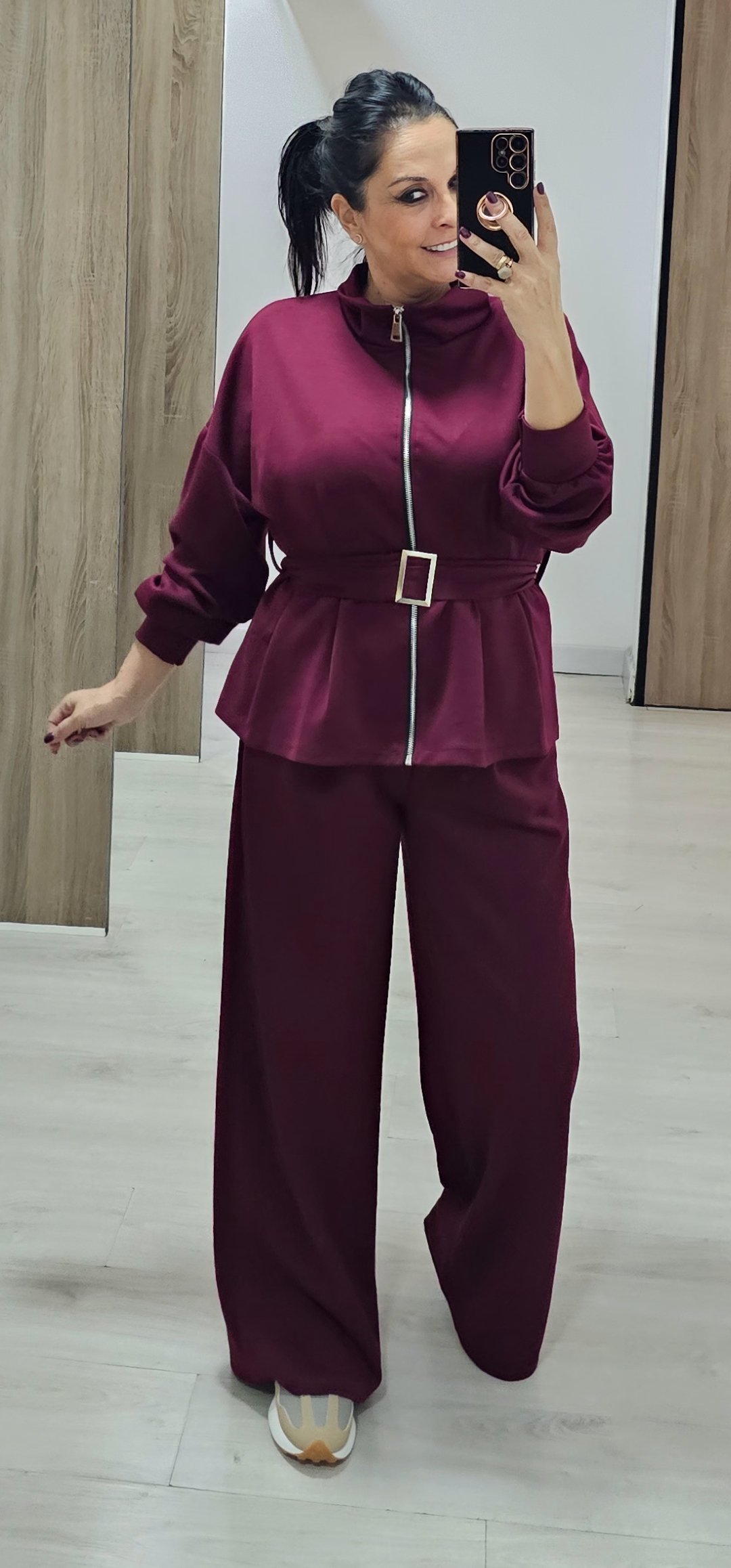 Monisimo conjunto de 2 piezas pantalón con pinzas bolsillos y cintura elástica, la sudadera es tipo chaqueta con cierre de cremallera y cinturón .Tejido de punto y capa de aire