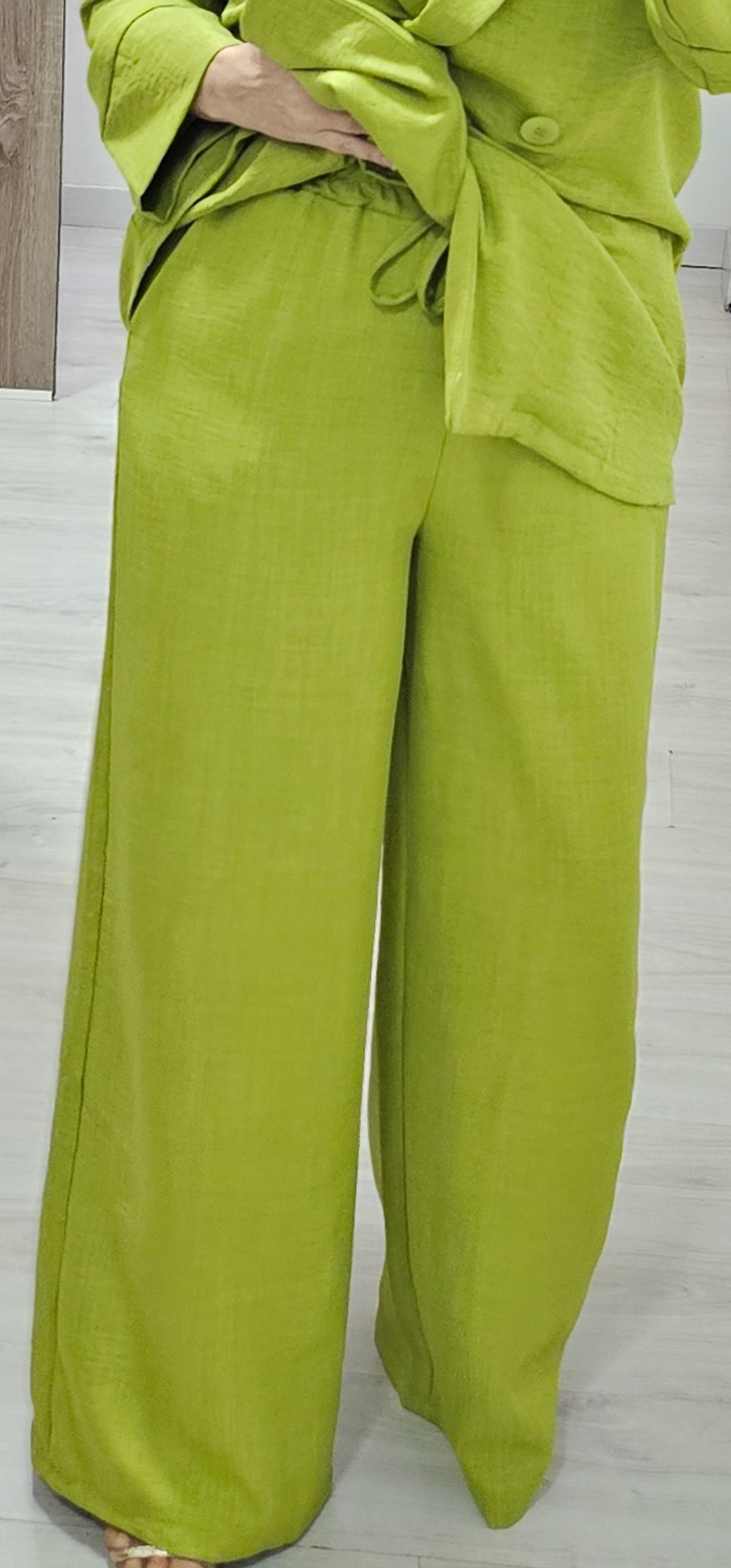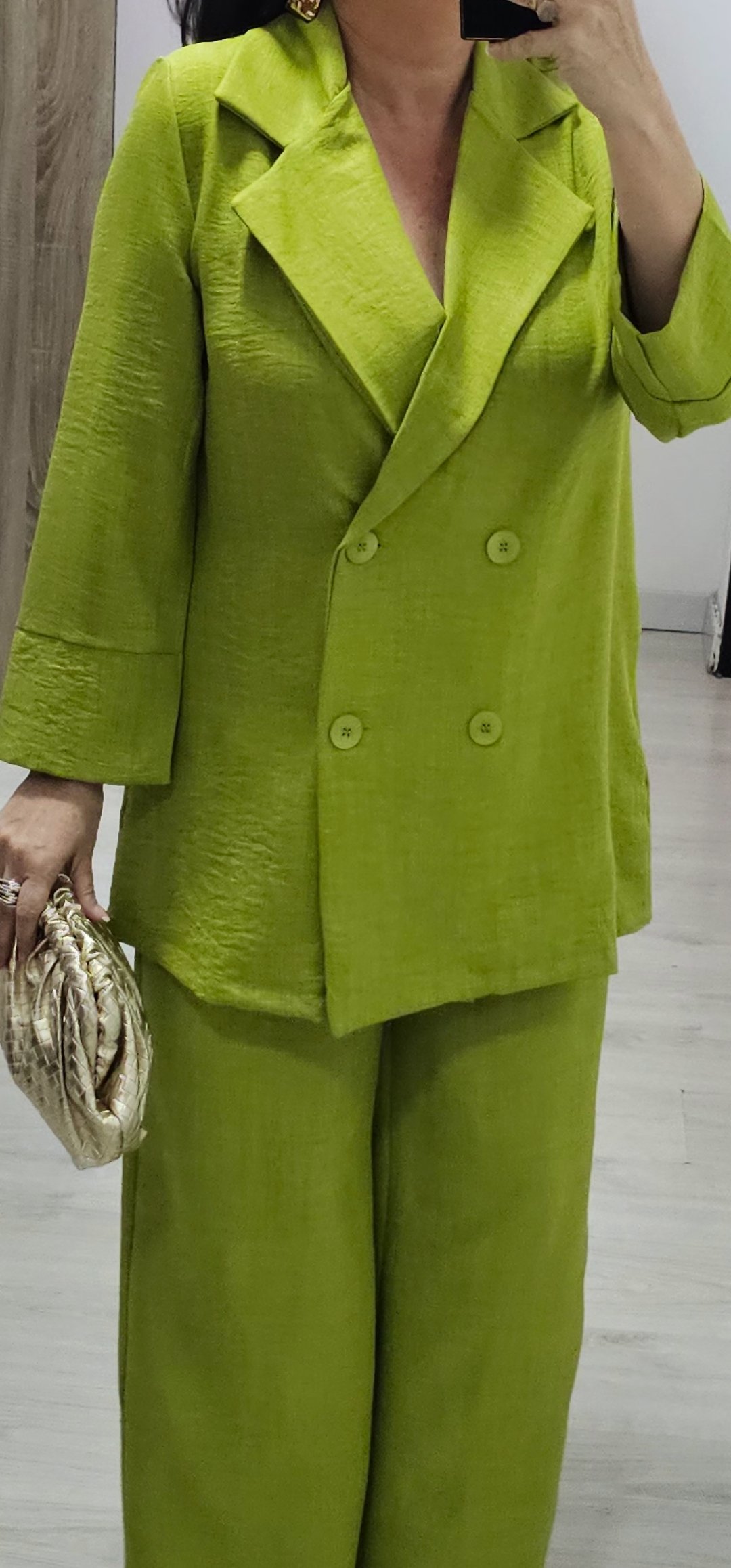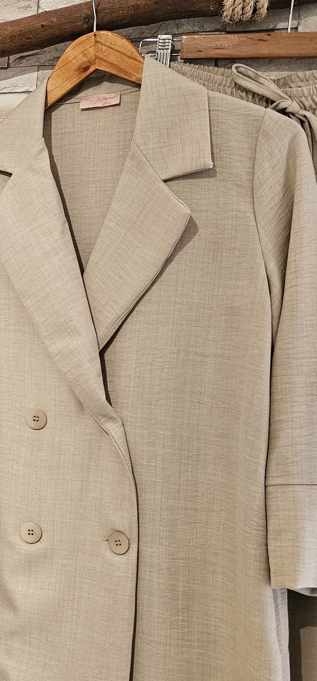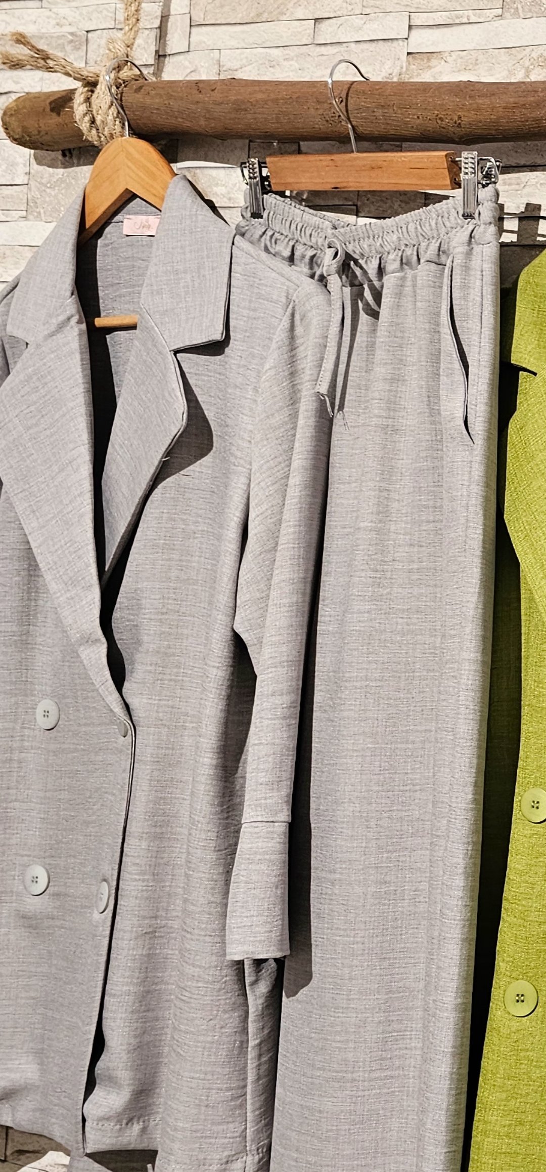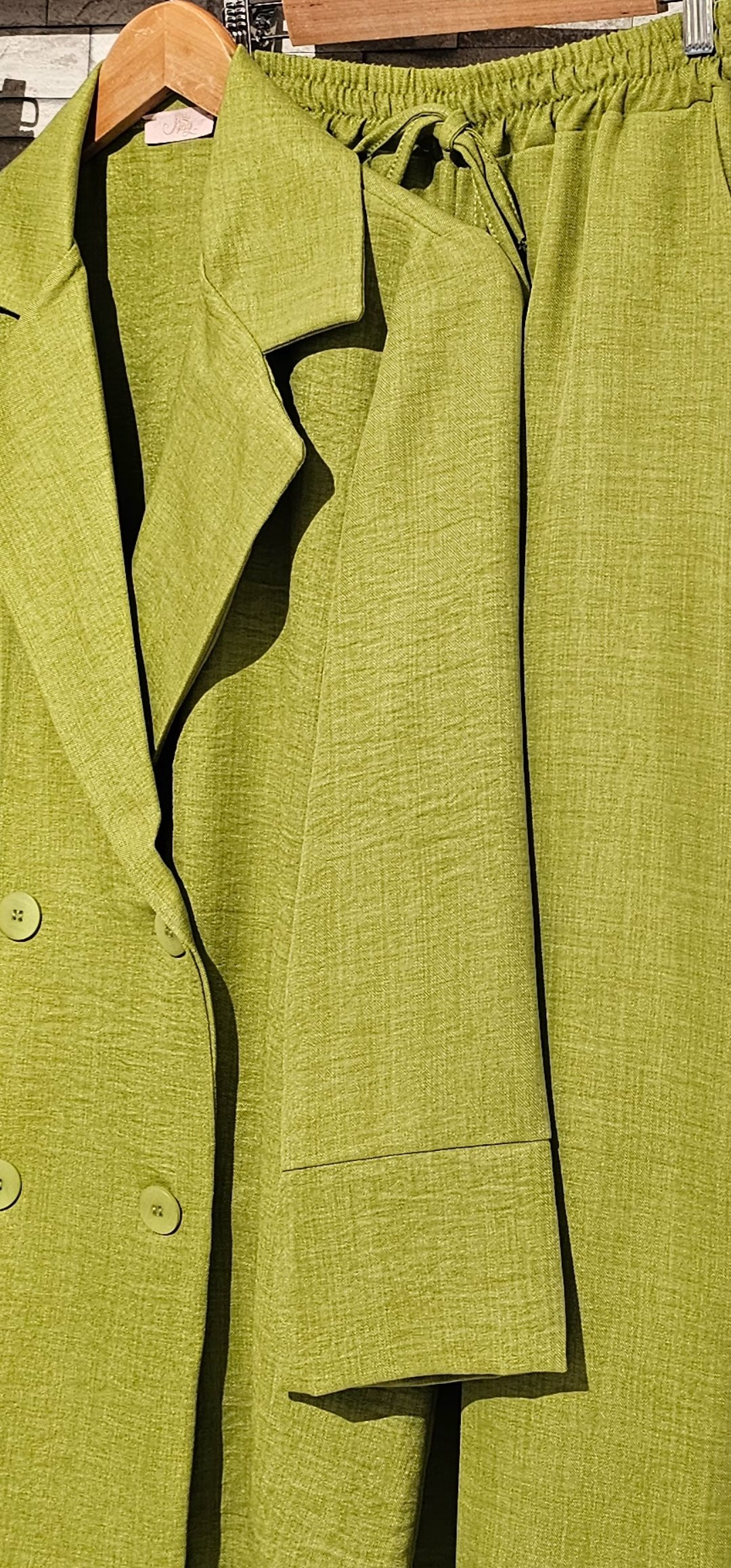 Monisimo conjunto de 2 piezas de chaqueta cruzada abotonada sin forro ,el pantalón lleva cintura elástica y bolsillos. Tejido de viscosa rugosa