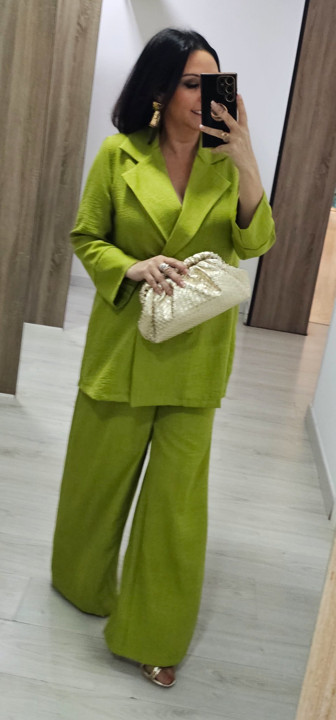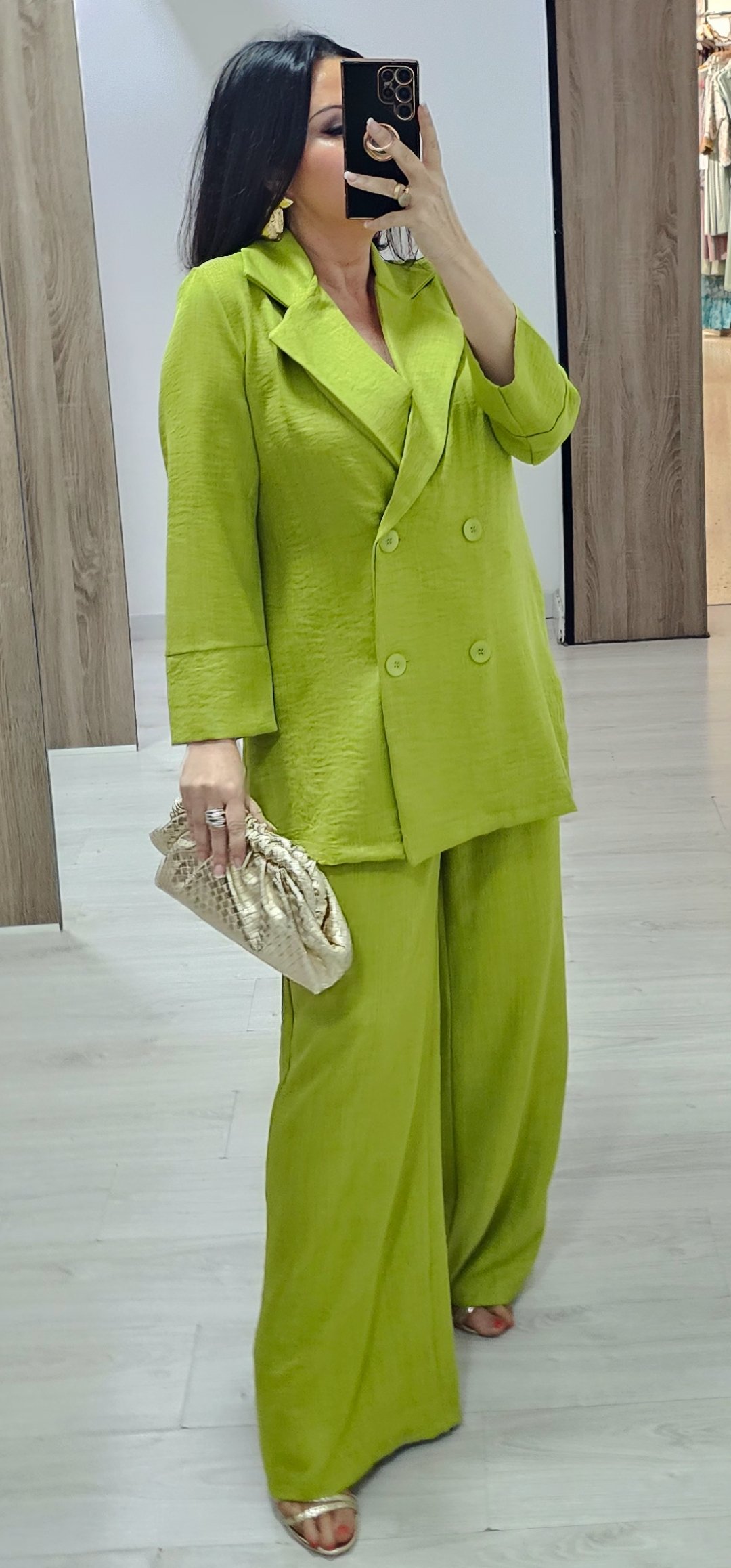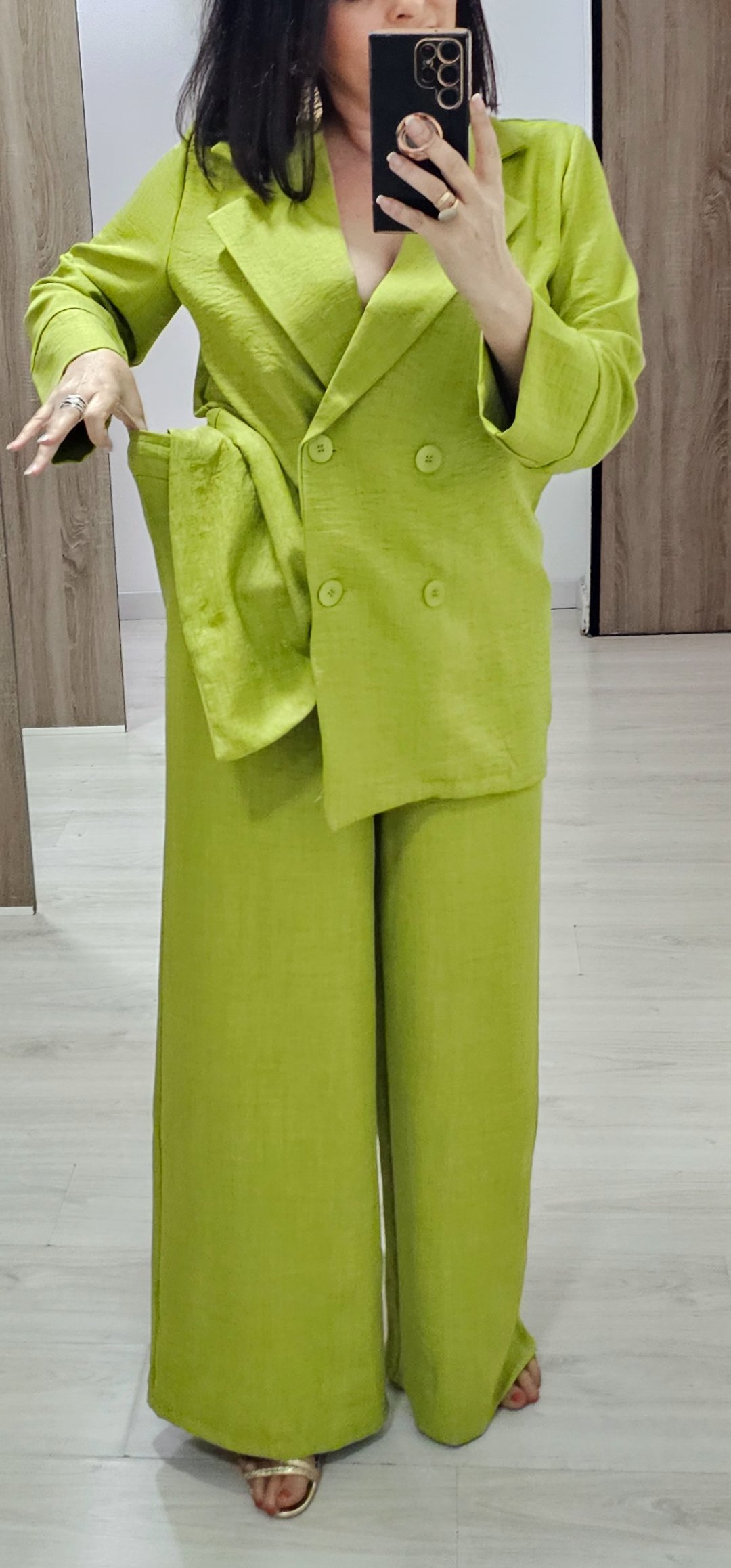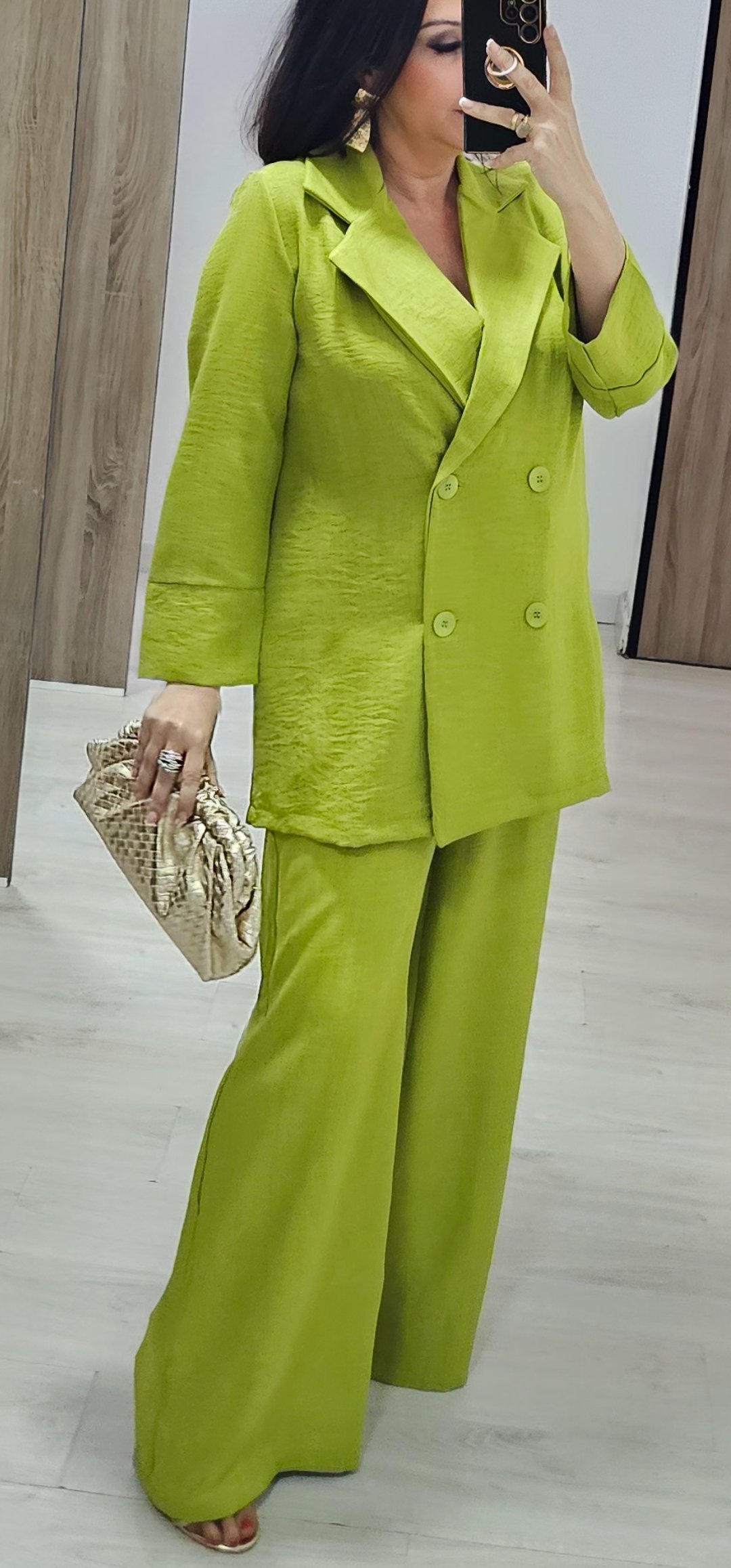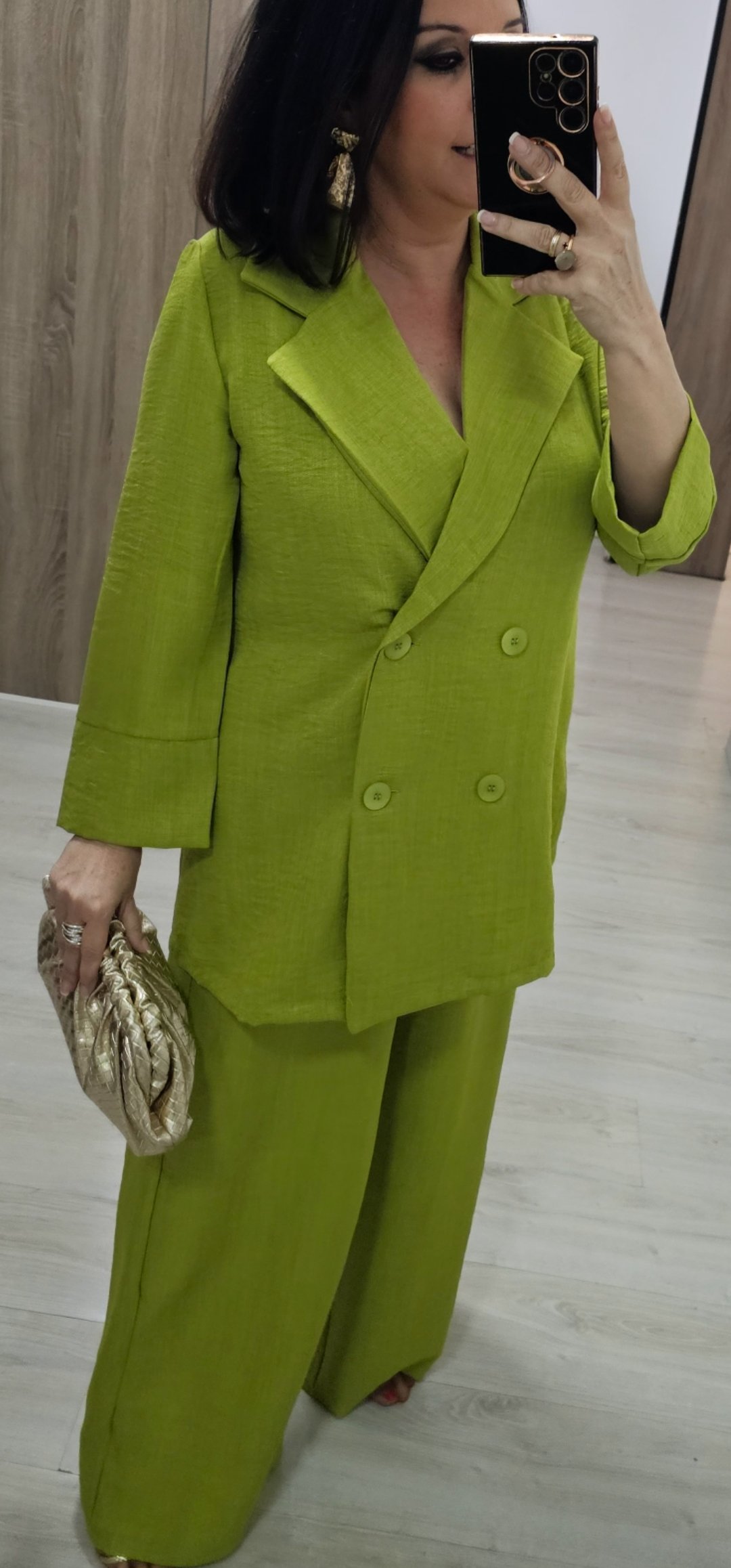 Monisimo conjunto de 2 piezas de chaqueta cruzada abotonada sin forro ,el pantalón lleva cintura elástica y bolsillos. Tejido de viscosa rugosa