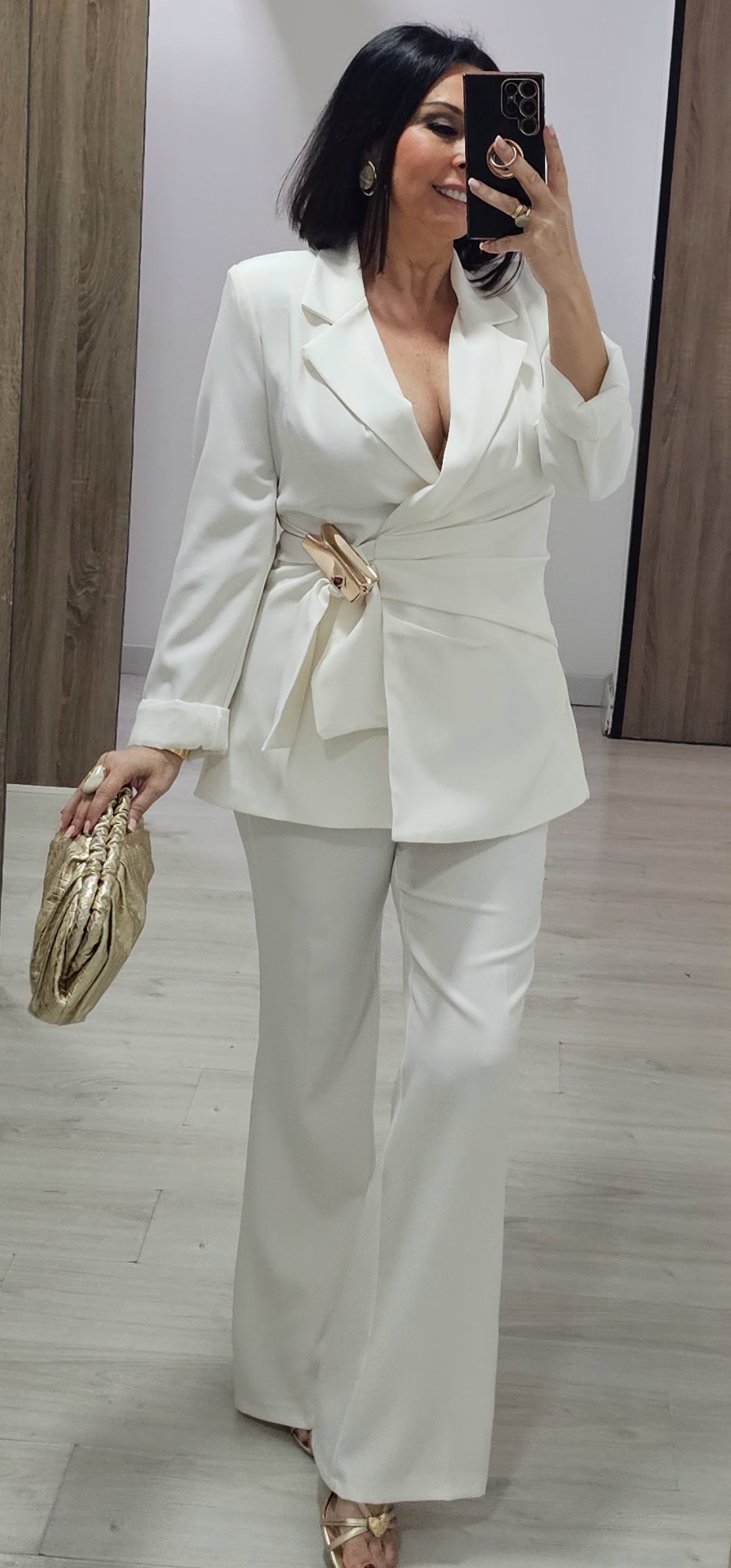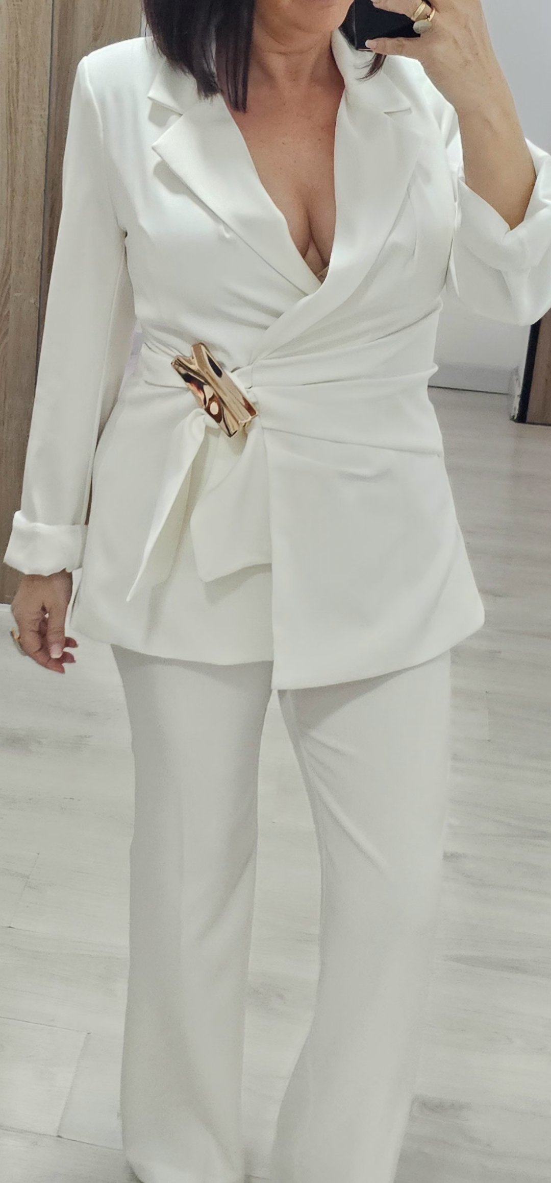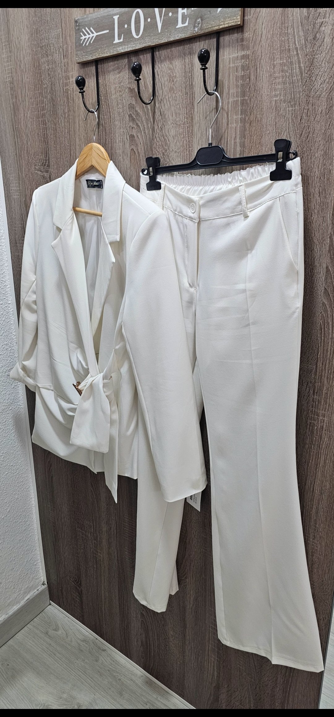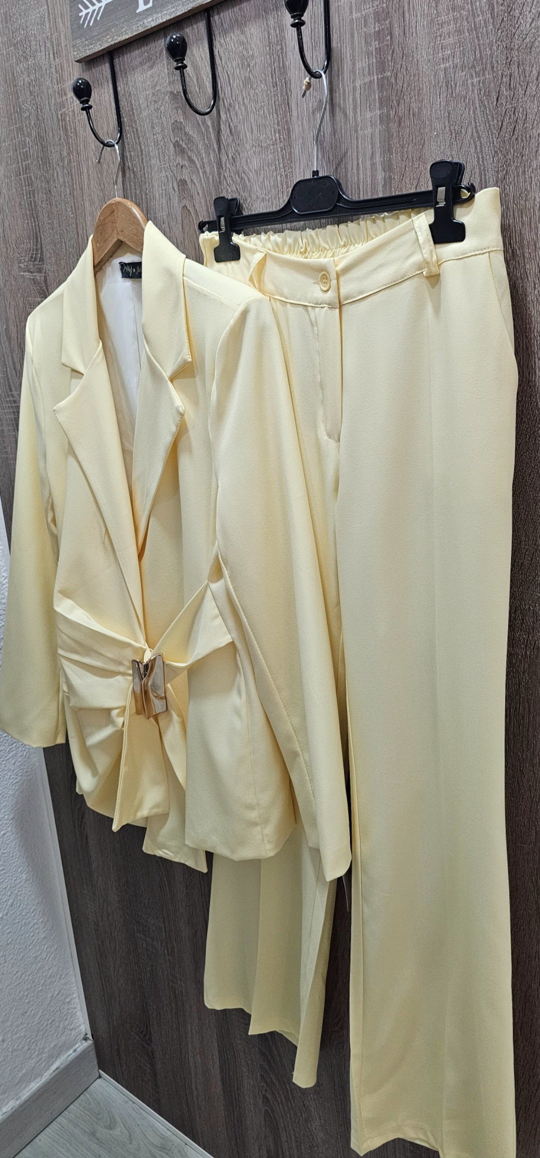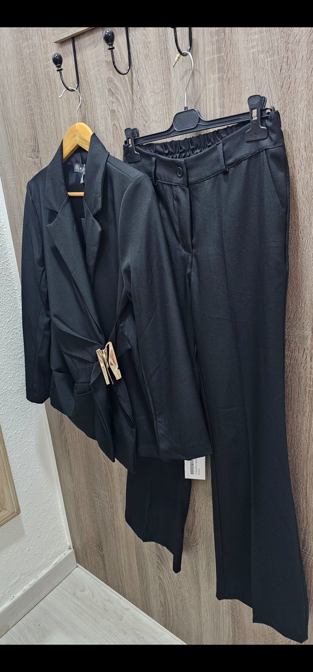 Espectacular traje de chaqueta de 2 piezas con pantalón pata recta cintura elástica detras y bolsillos, la chaqueta va forrada y es cruzada tipo pareo ,el cierre es con un monisimo broche dorado.