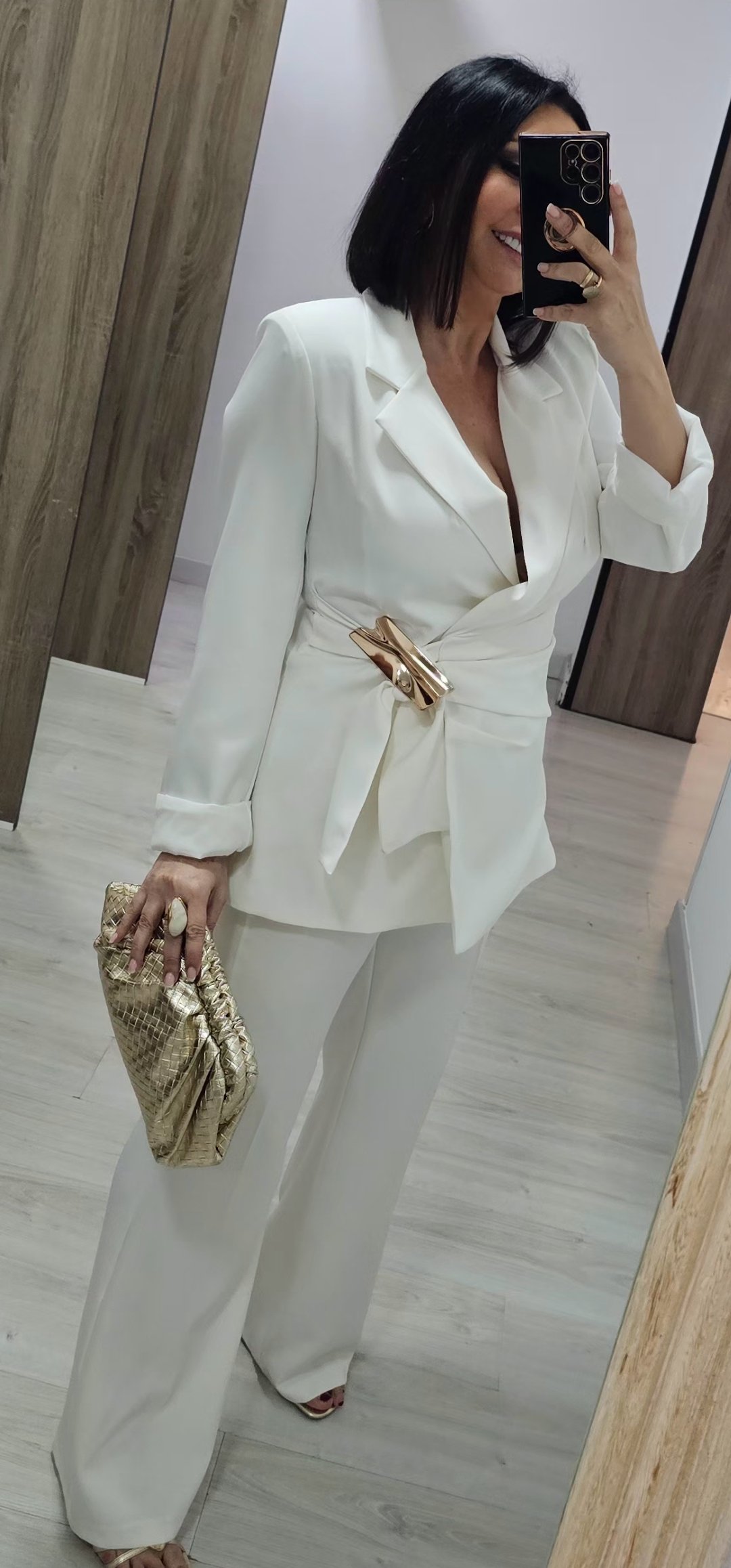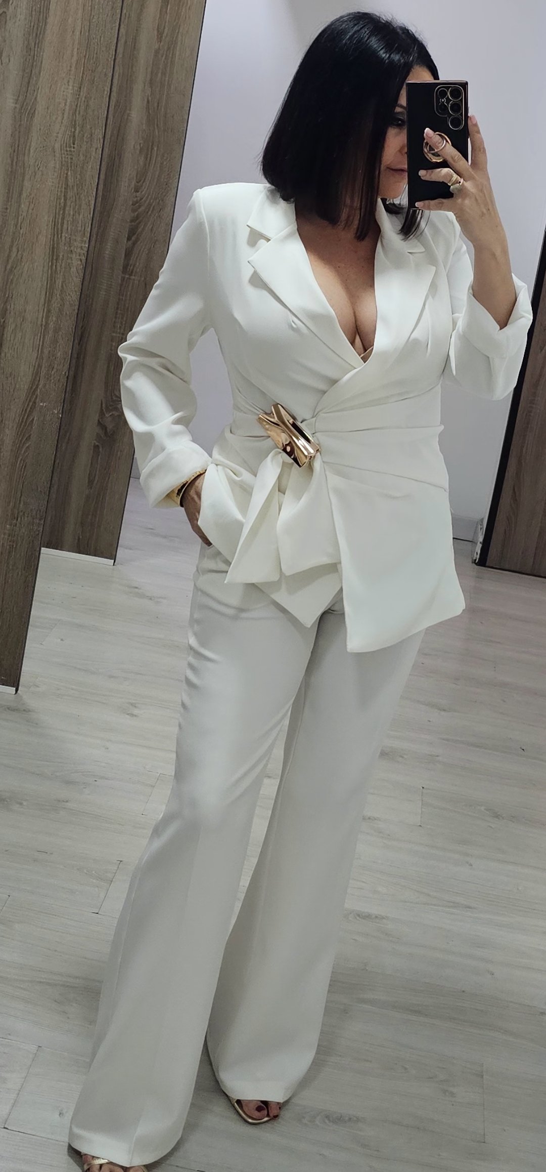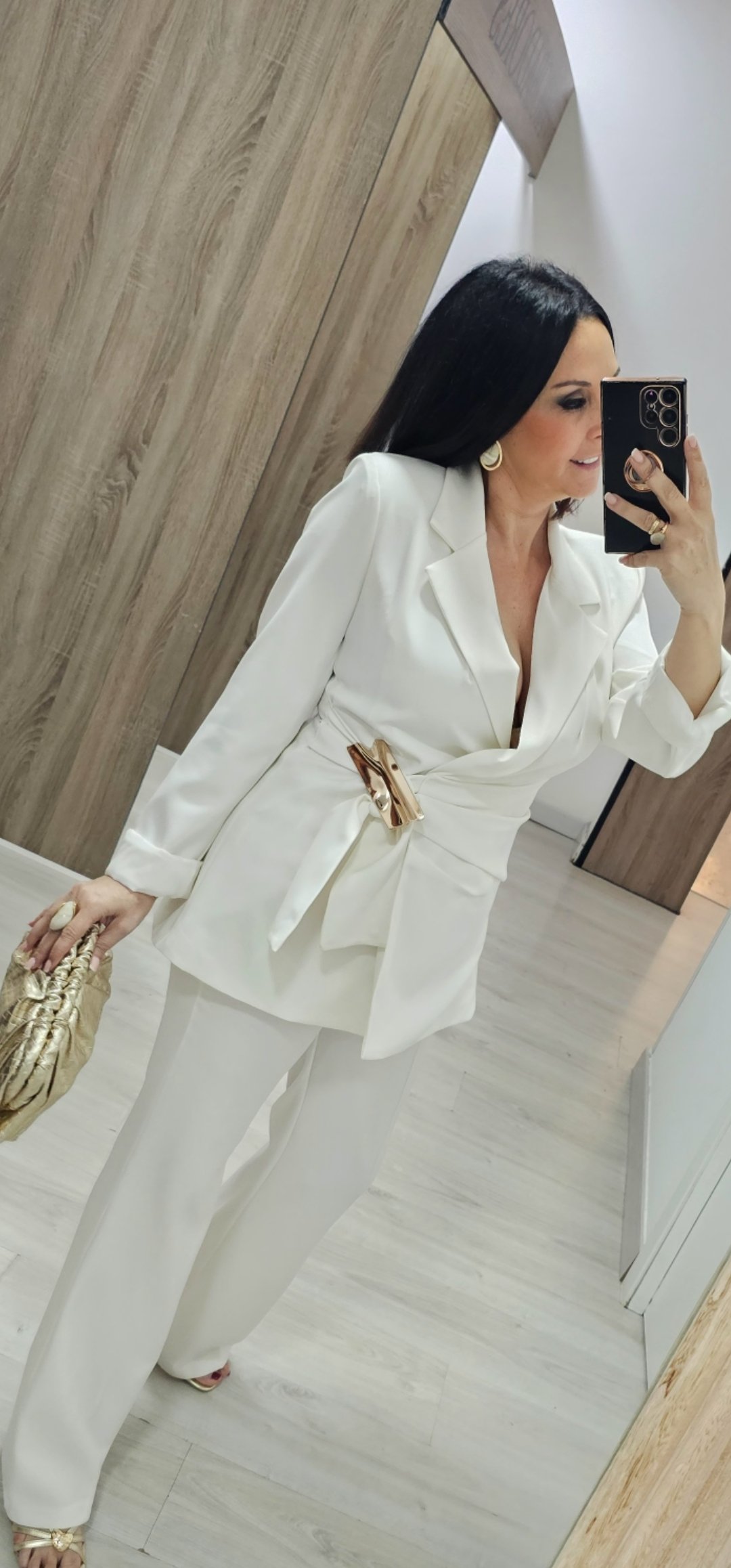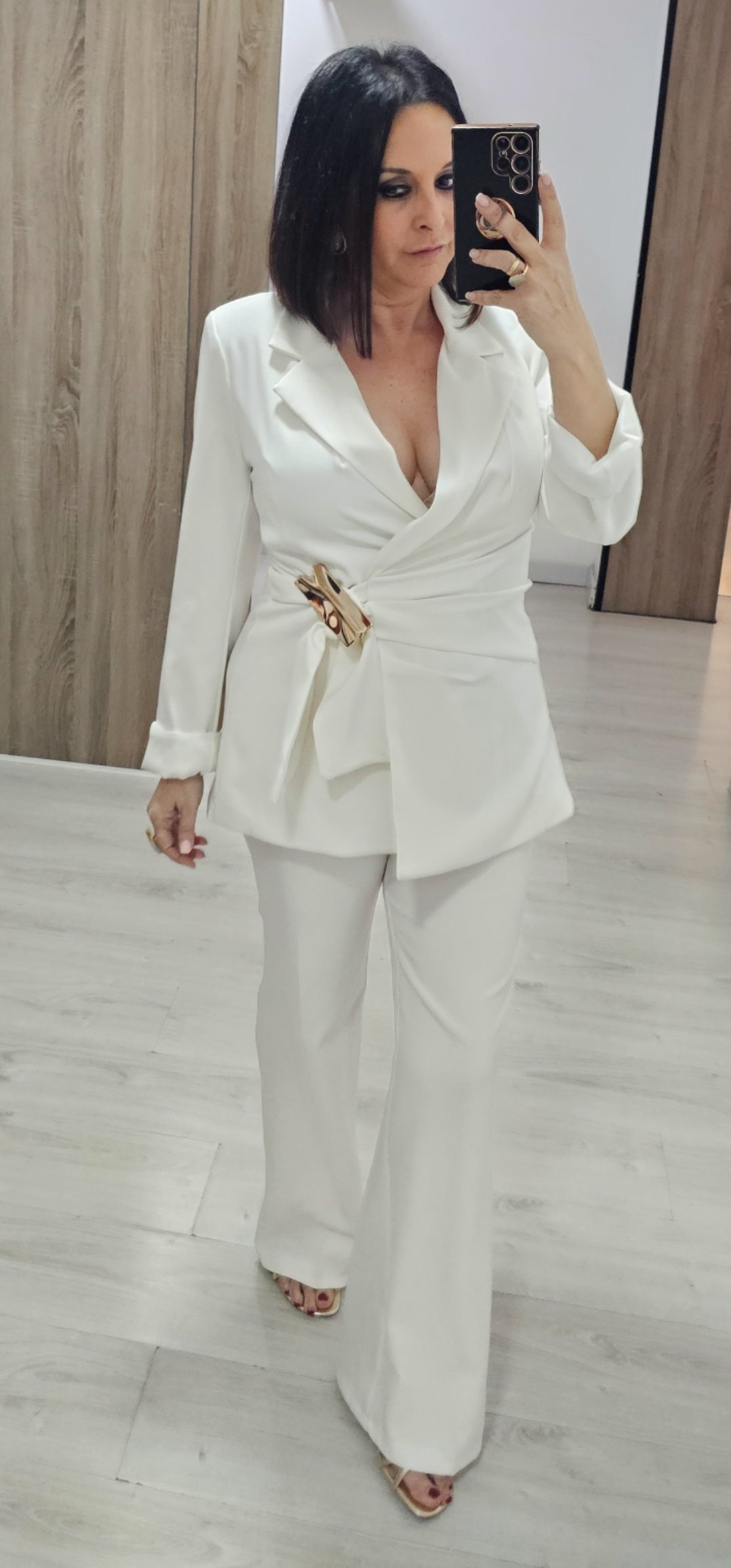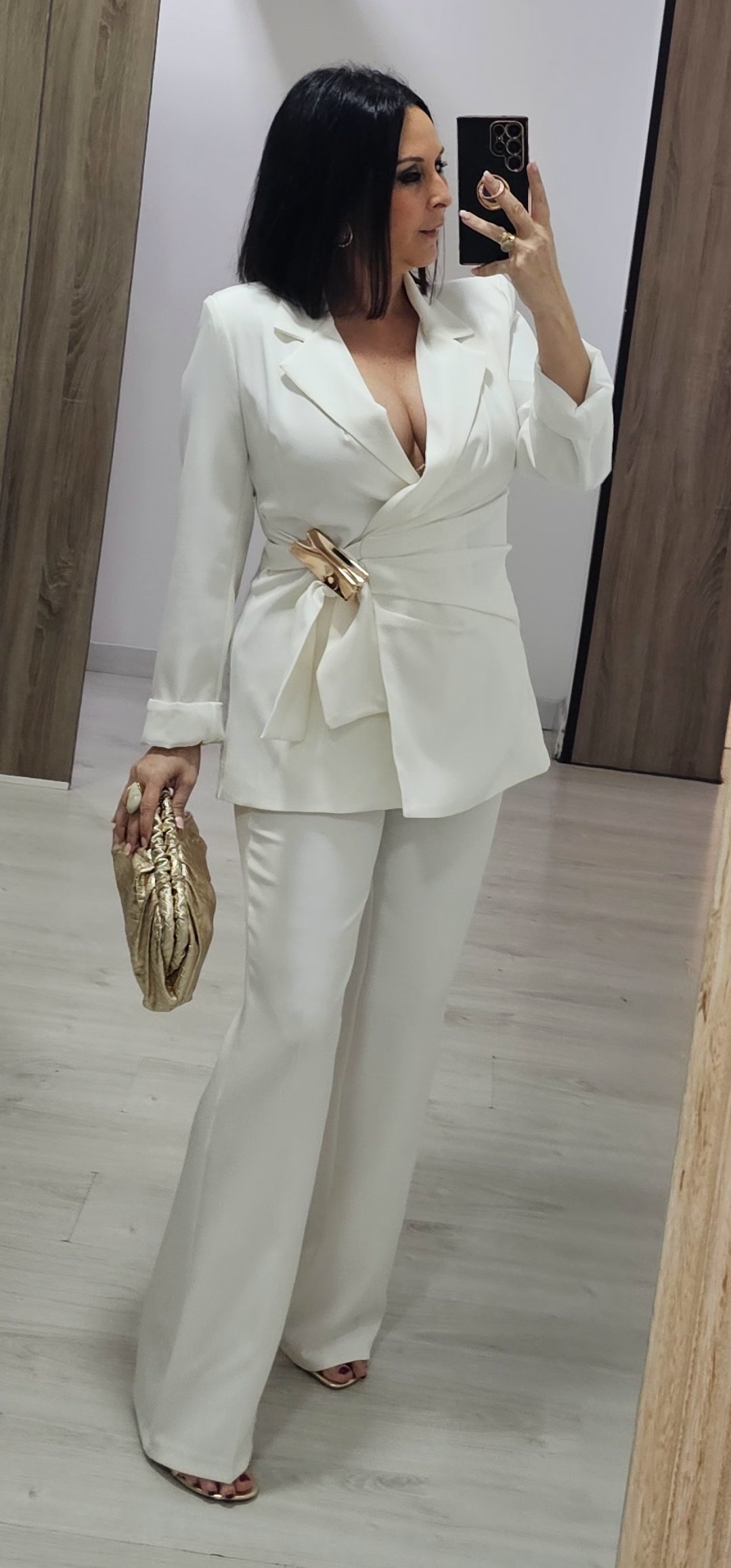 Espectacular traje de chaqueta de 2 piezas con pantalón pata recta cintura elástica detras y bolsillos, la chaqueta va forrada y es cruzada tipo pareo ,el cierre es con un monisimo broche dorado.