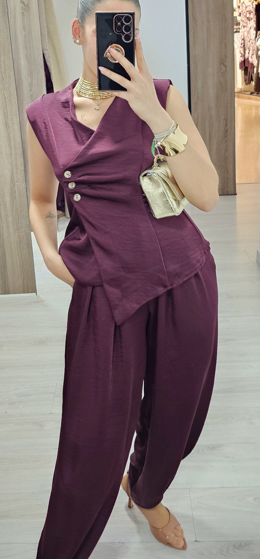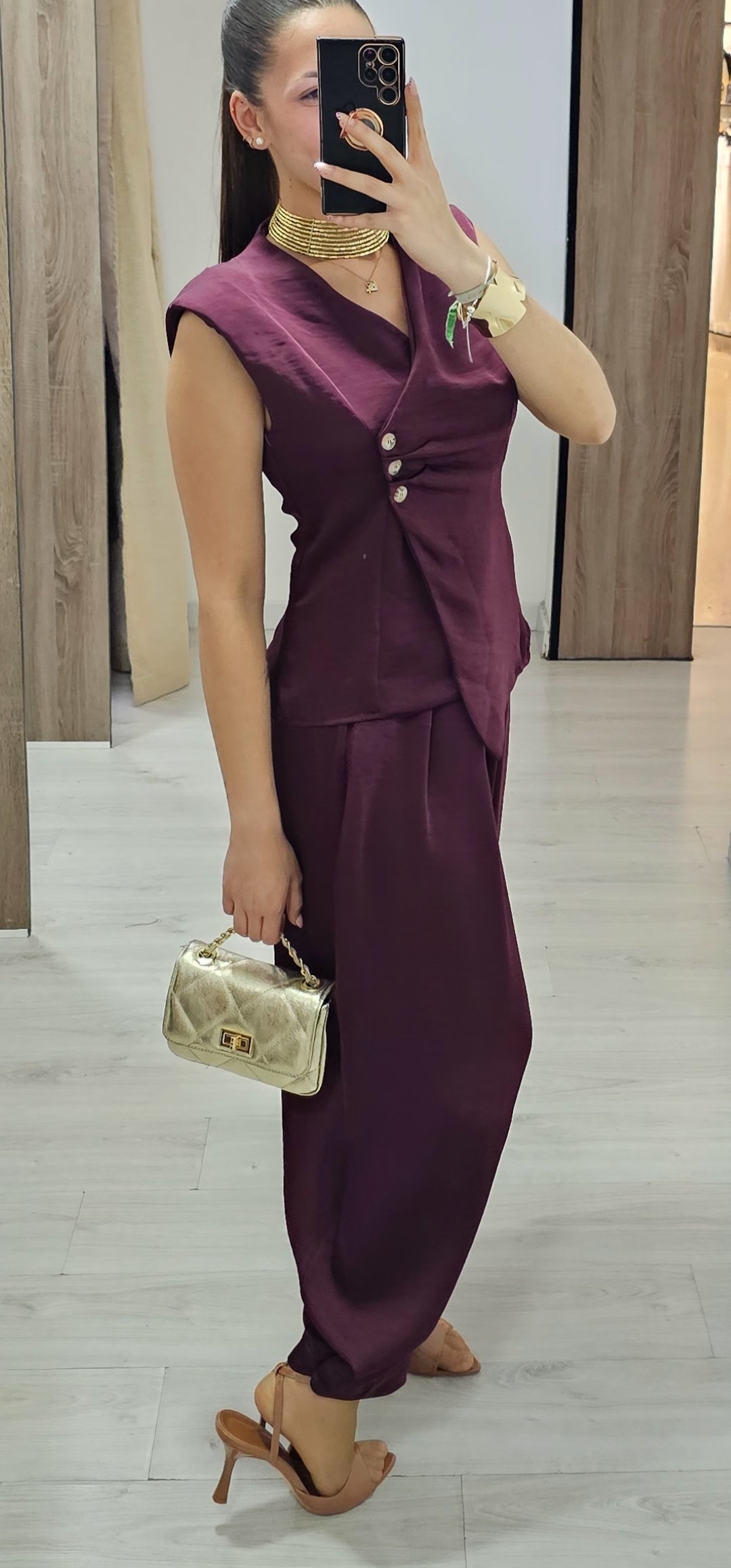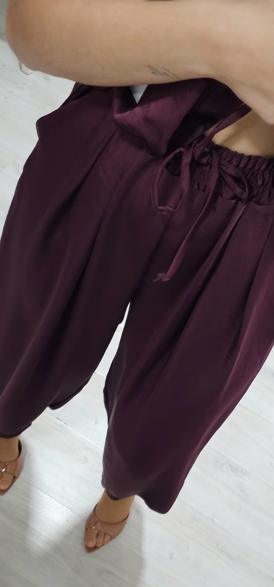 Monisimo conjunto de 2 piezas en tejido de raso sedoso con blusa con hombreras y botones en el lado ,el pantalón es bombacho con boton en el tobillo que tiene 2 posición tipo bombacho o pata recta