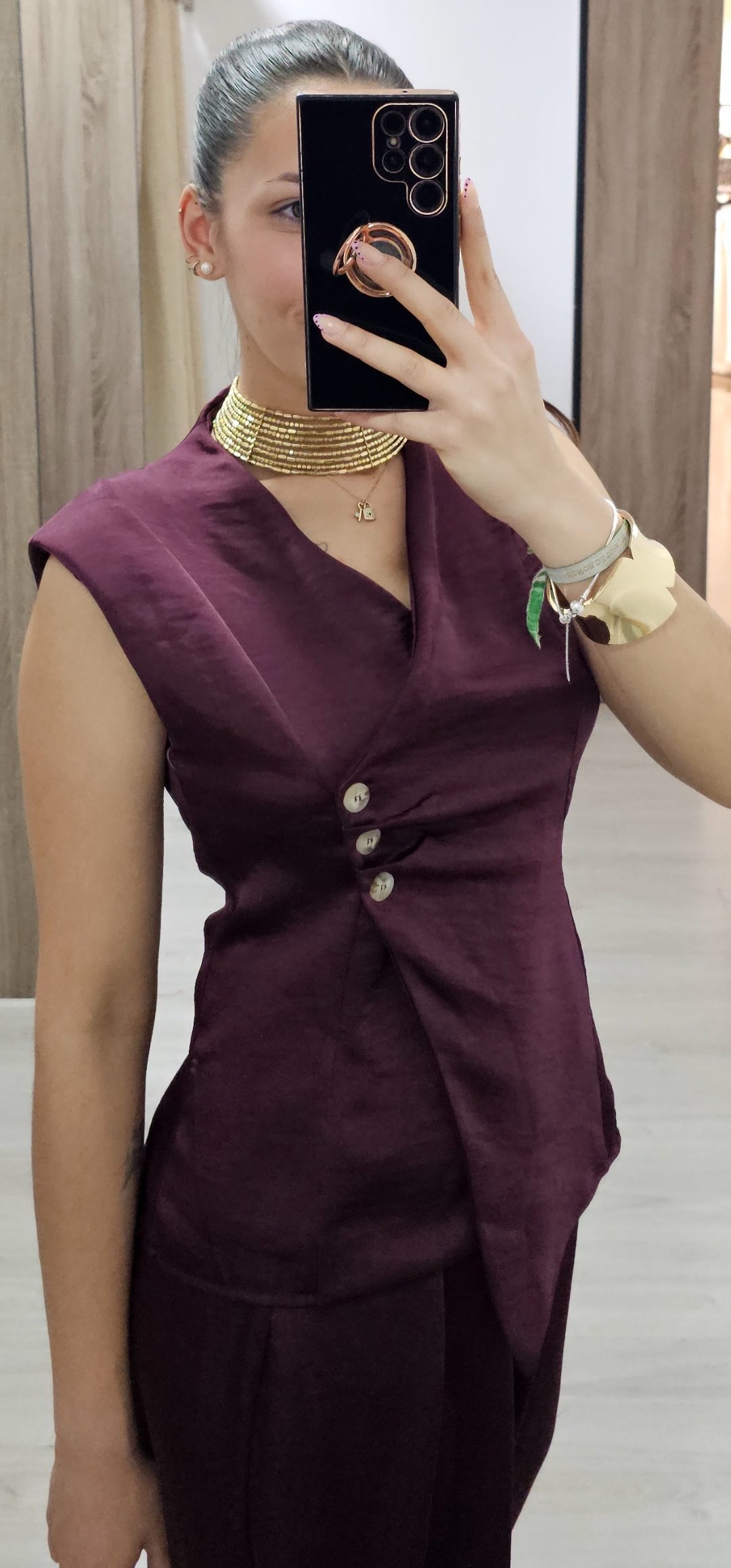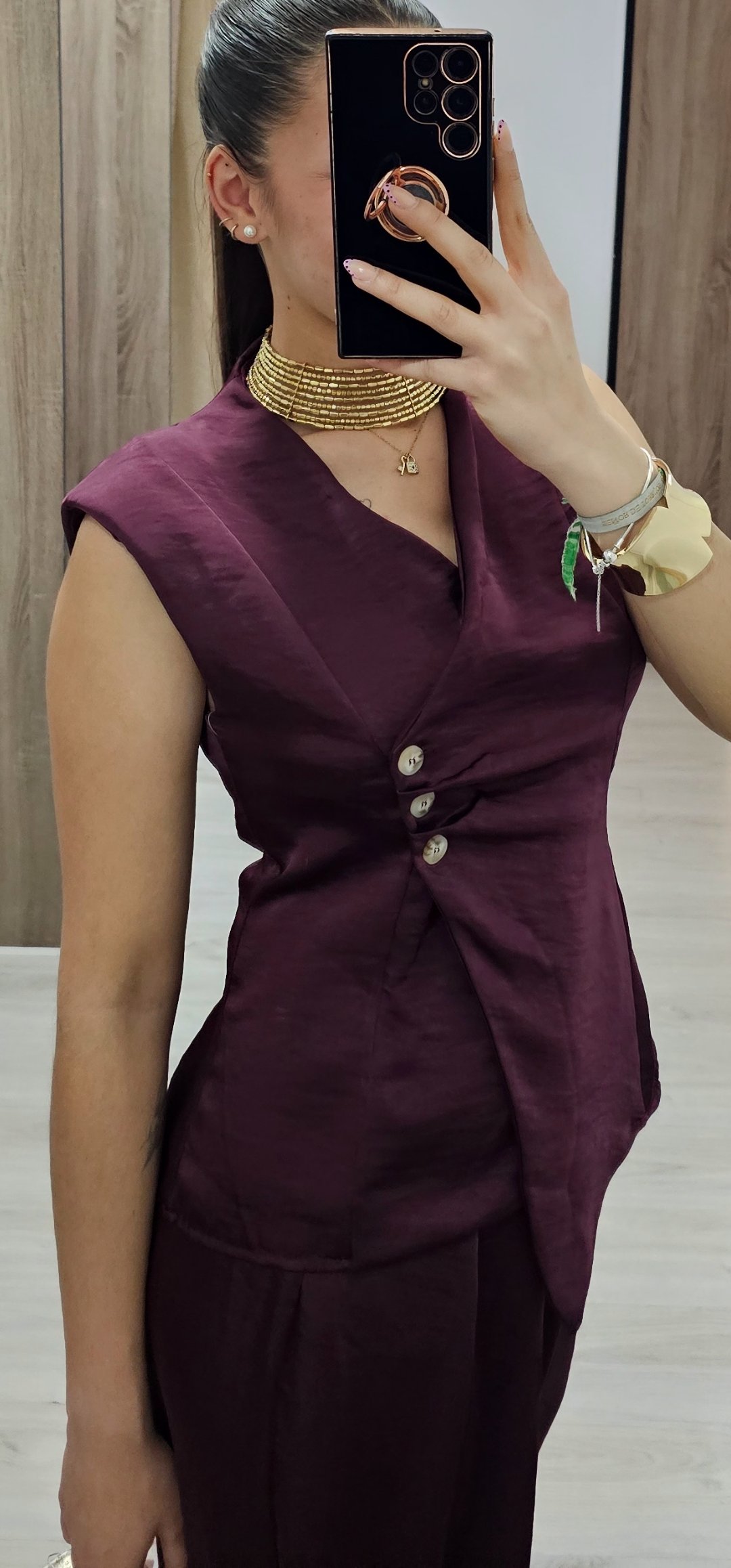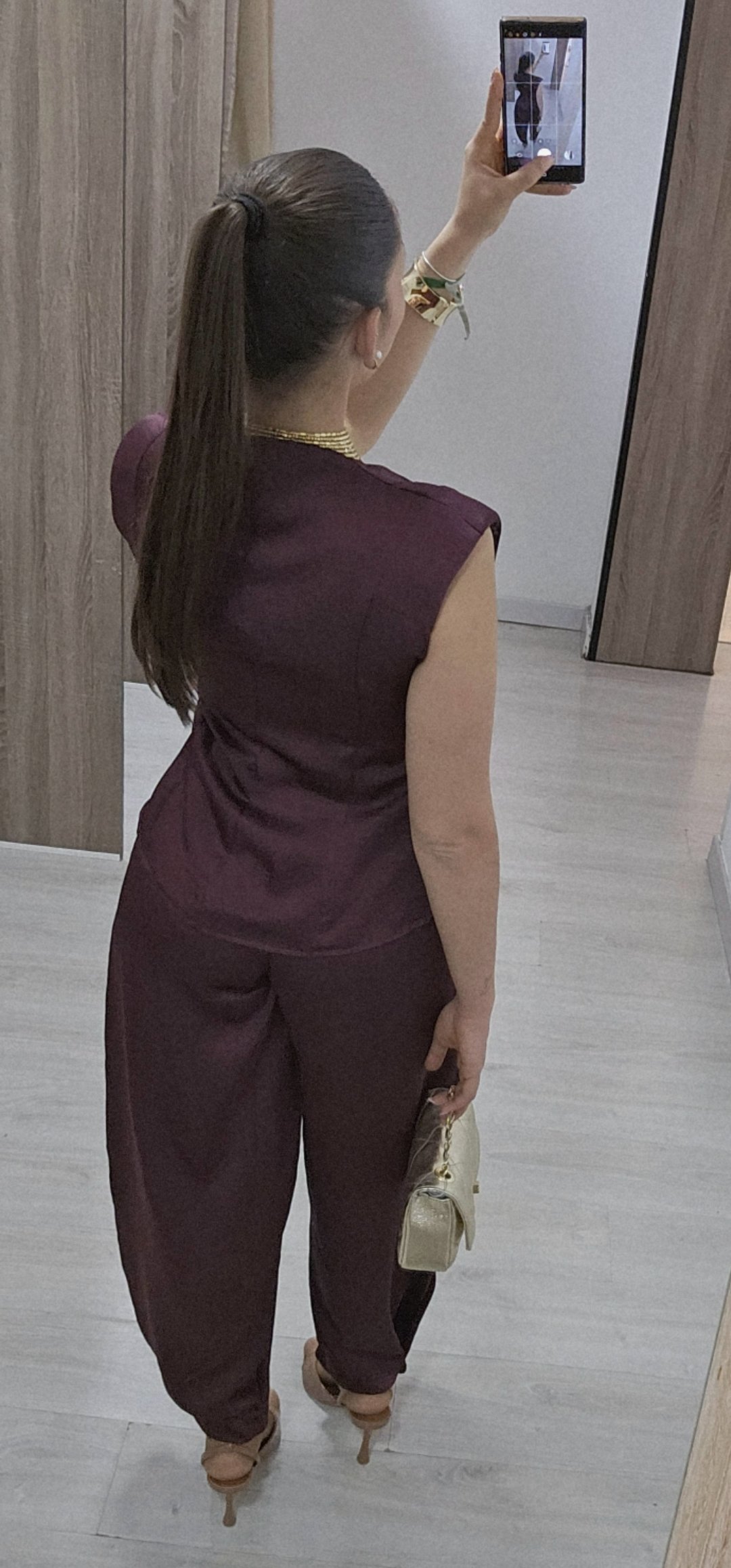 Monisimo conjunto de 2 piezas en tejido de raso sedoso con blusa con hombreras y botones en el lado ,el pantalón es bombacho con boton en el tobillo que tiene 2 posición tipo bombacho o pata recta