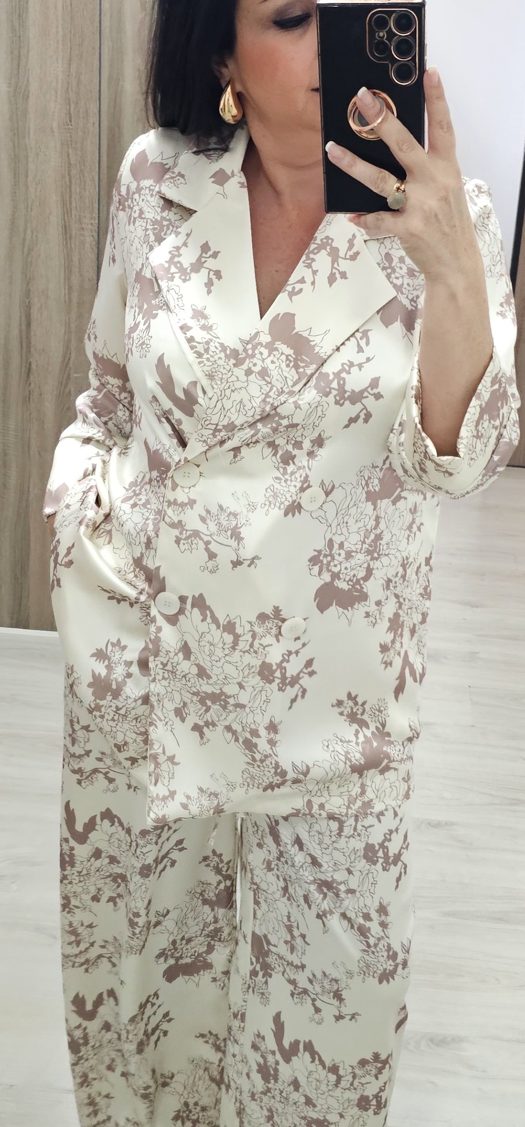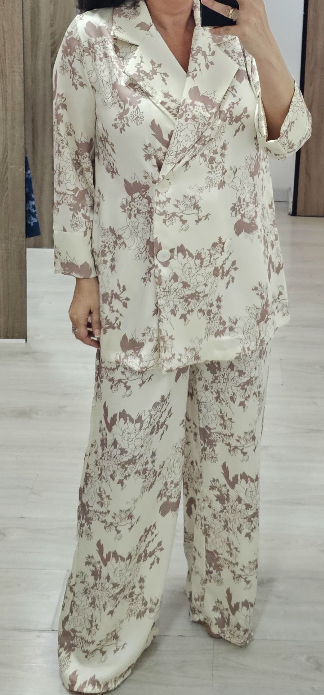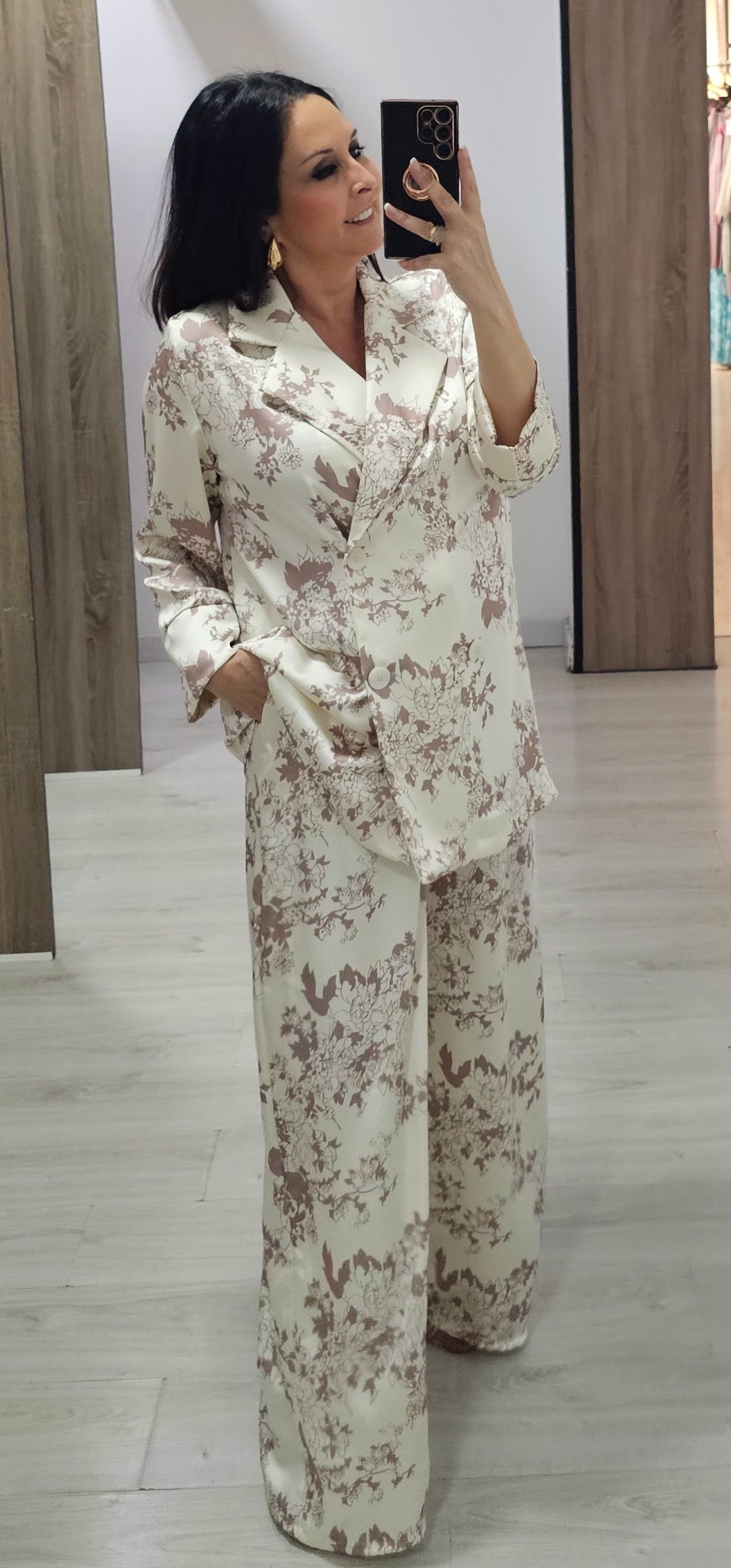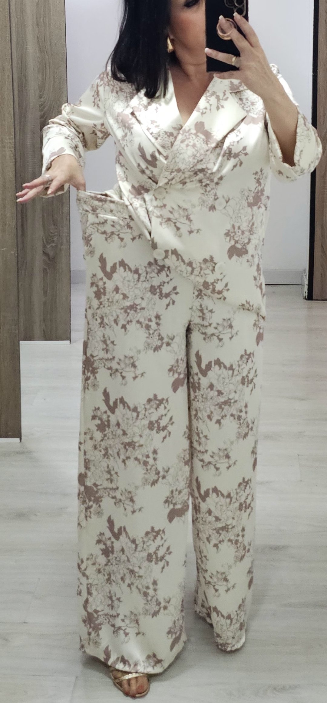 Espectacular conjunto de 2 piezas de chaqueta cruzada y pantalón con cintura elástica y bolsillos en tejido de raso estampado