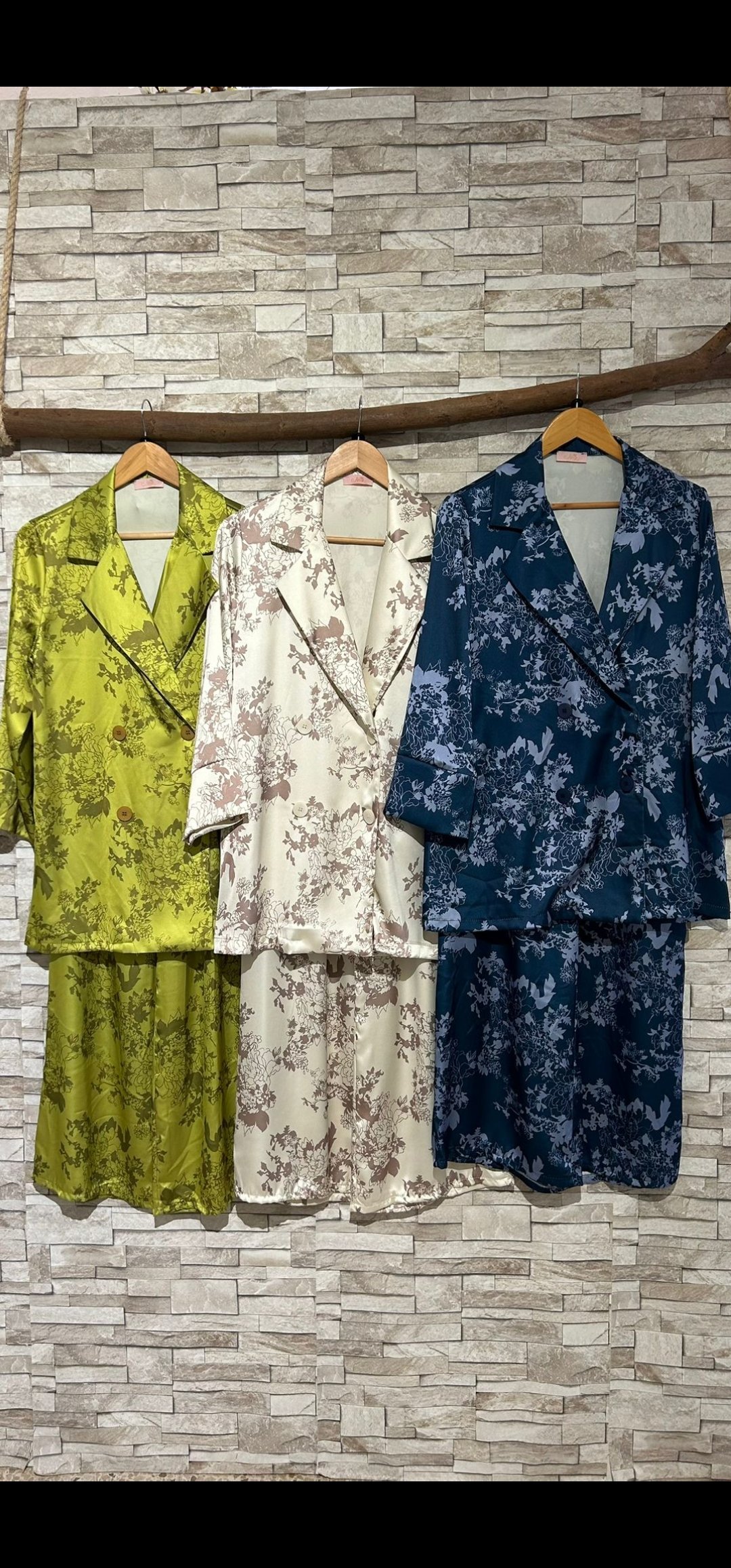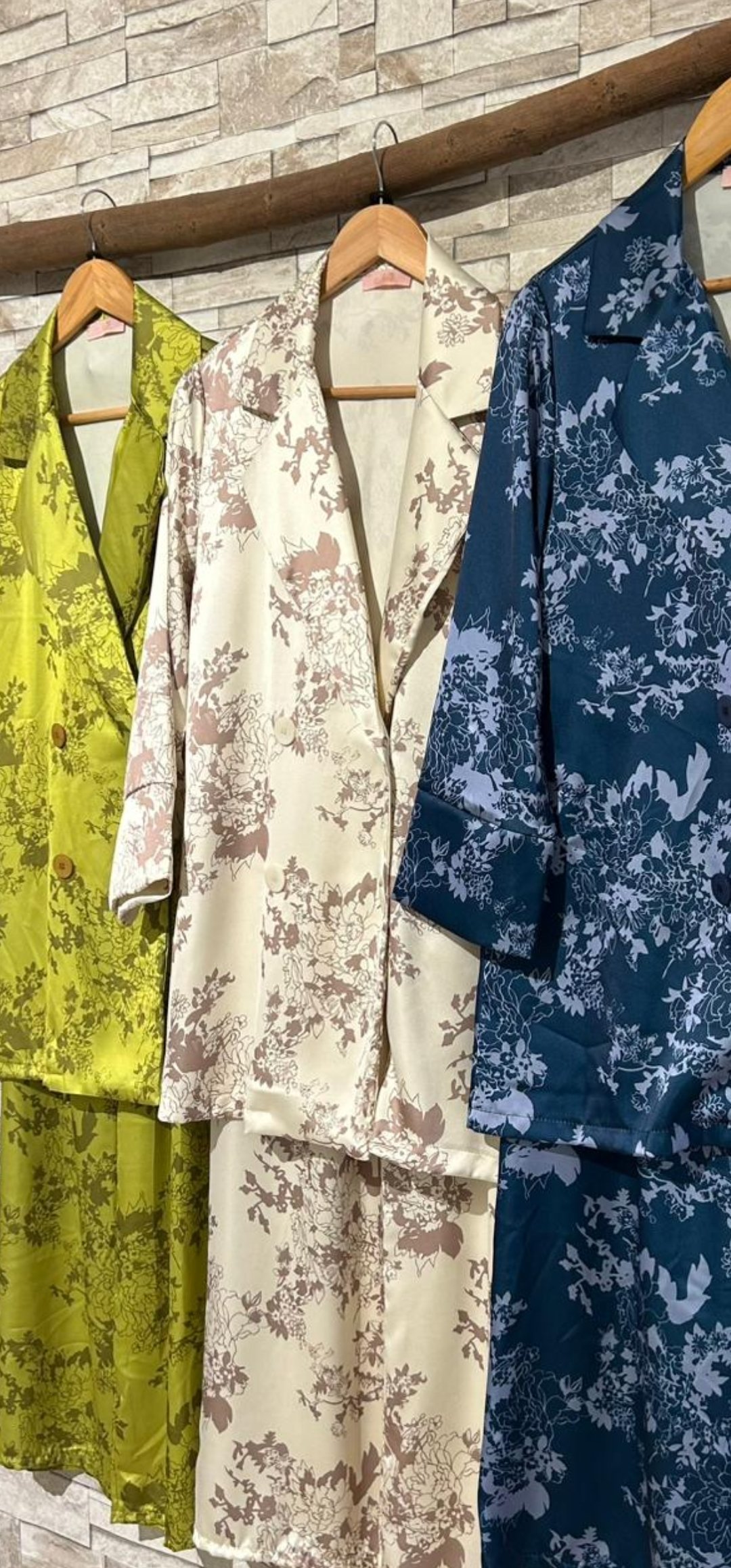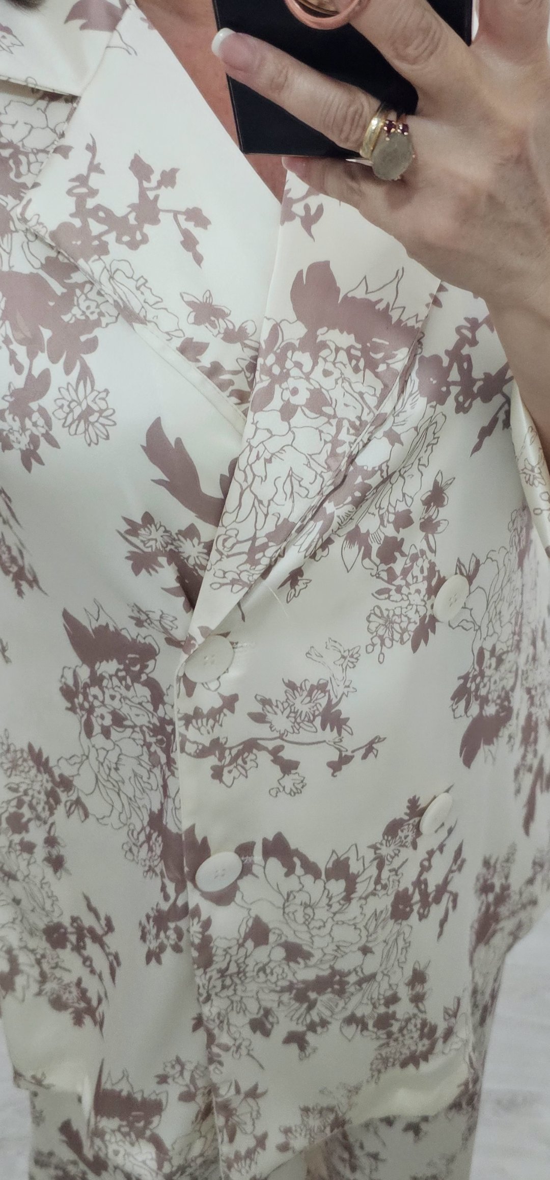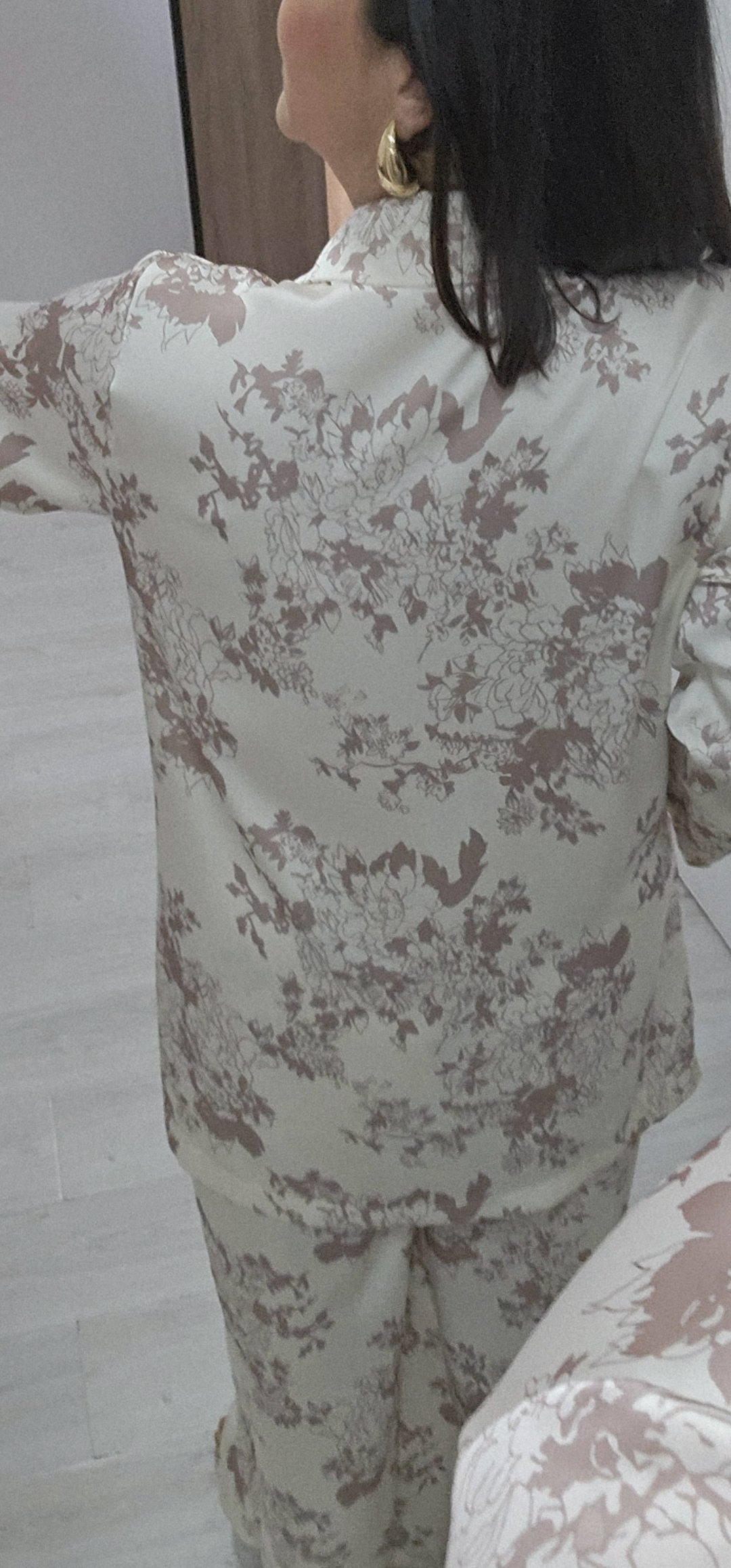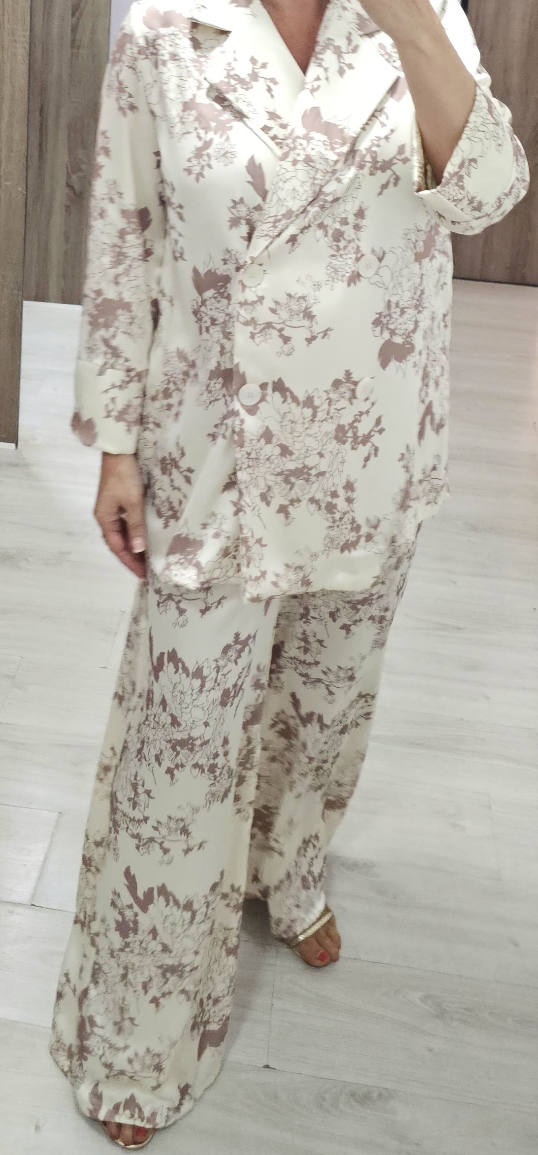 Espectacular conjunto de 2 piezas de chaqueta cruzada y pantalón con cintura elástica y bolsillos en tejido de raso estampado