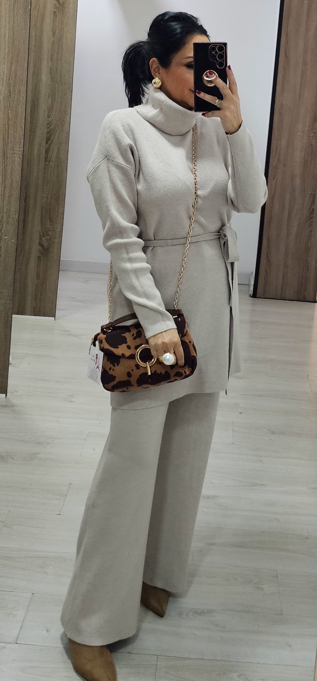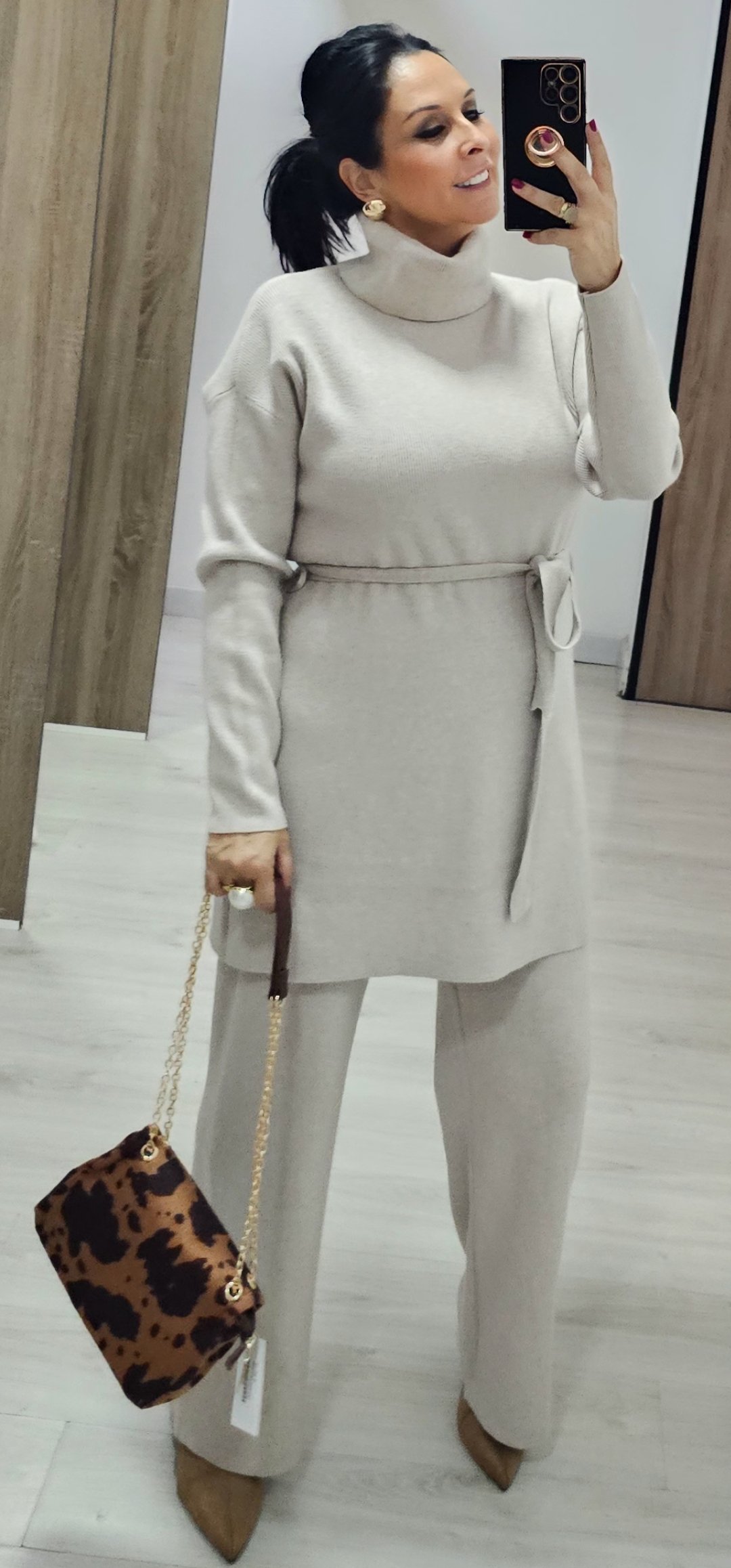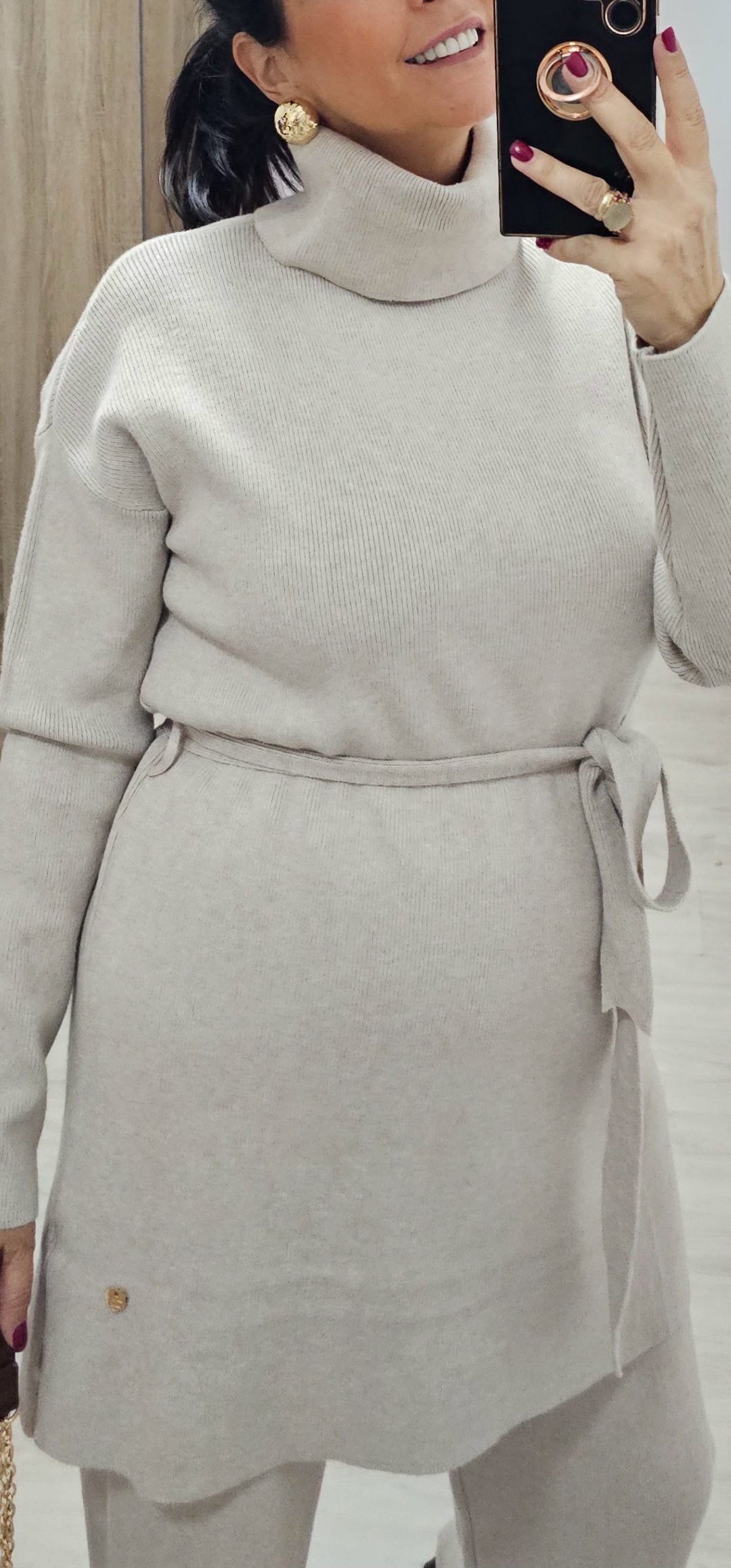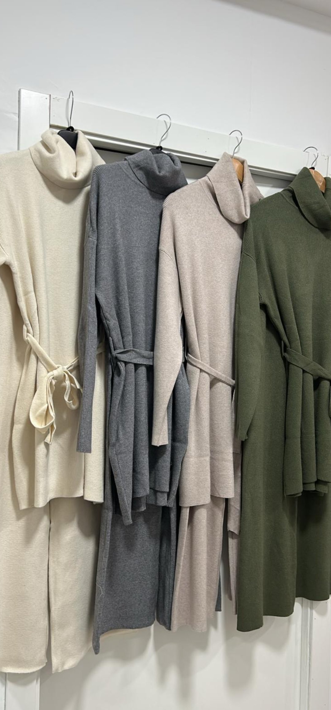 Monisimo y elegante conjunto de punto de pantalón de pata recta con cintura elástica y jersey largo con cuello vuelto y cinturón de lazada en tejido de punto en canale elástico