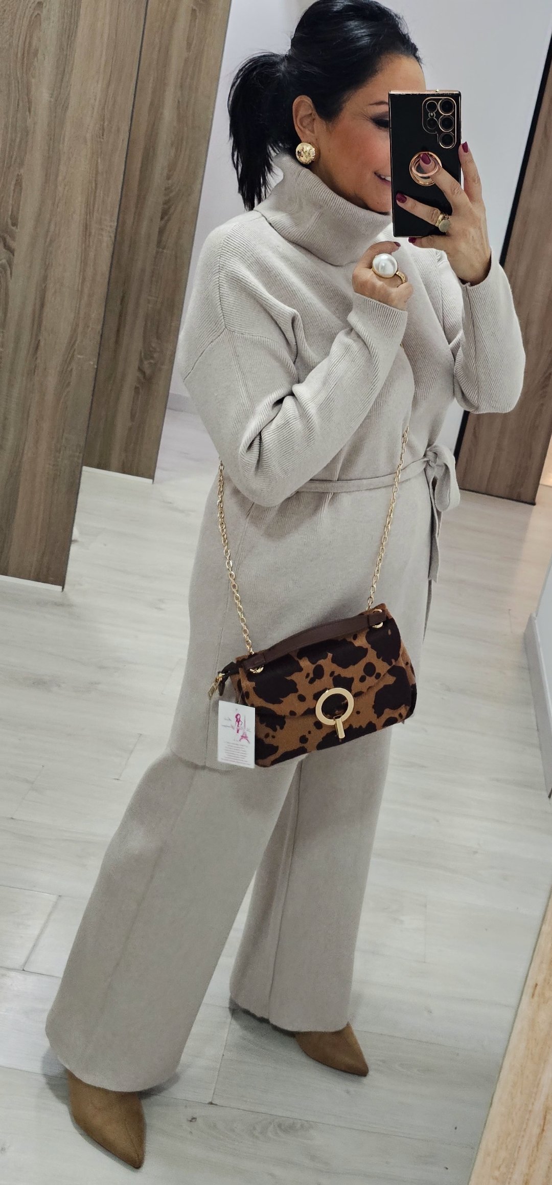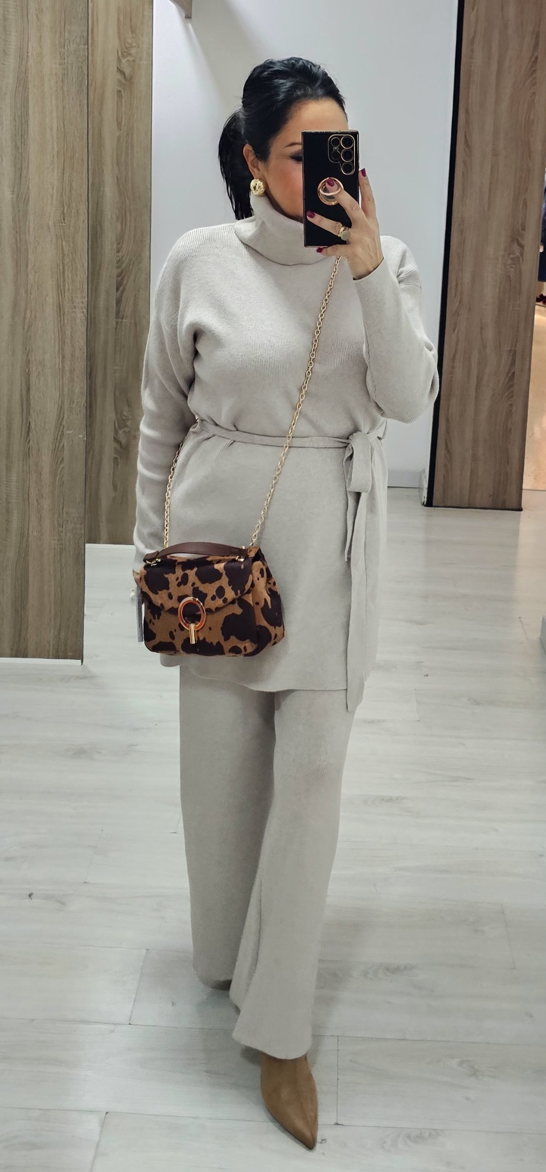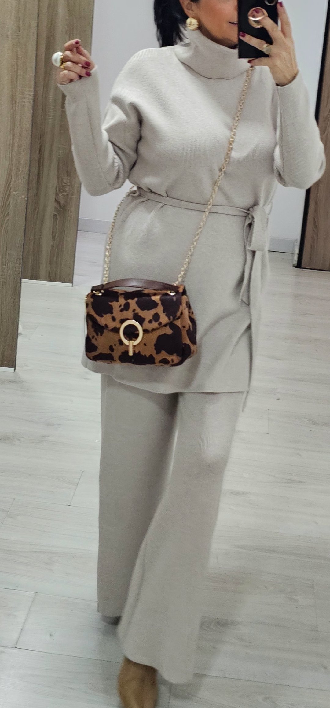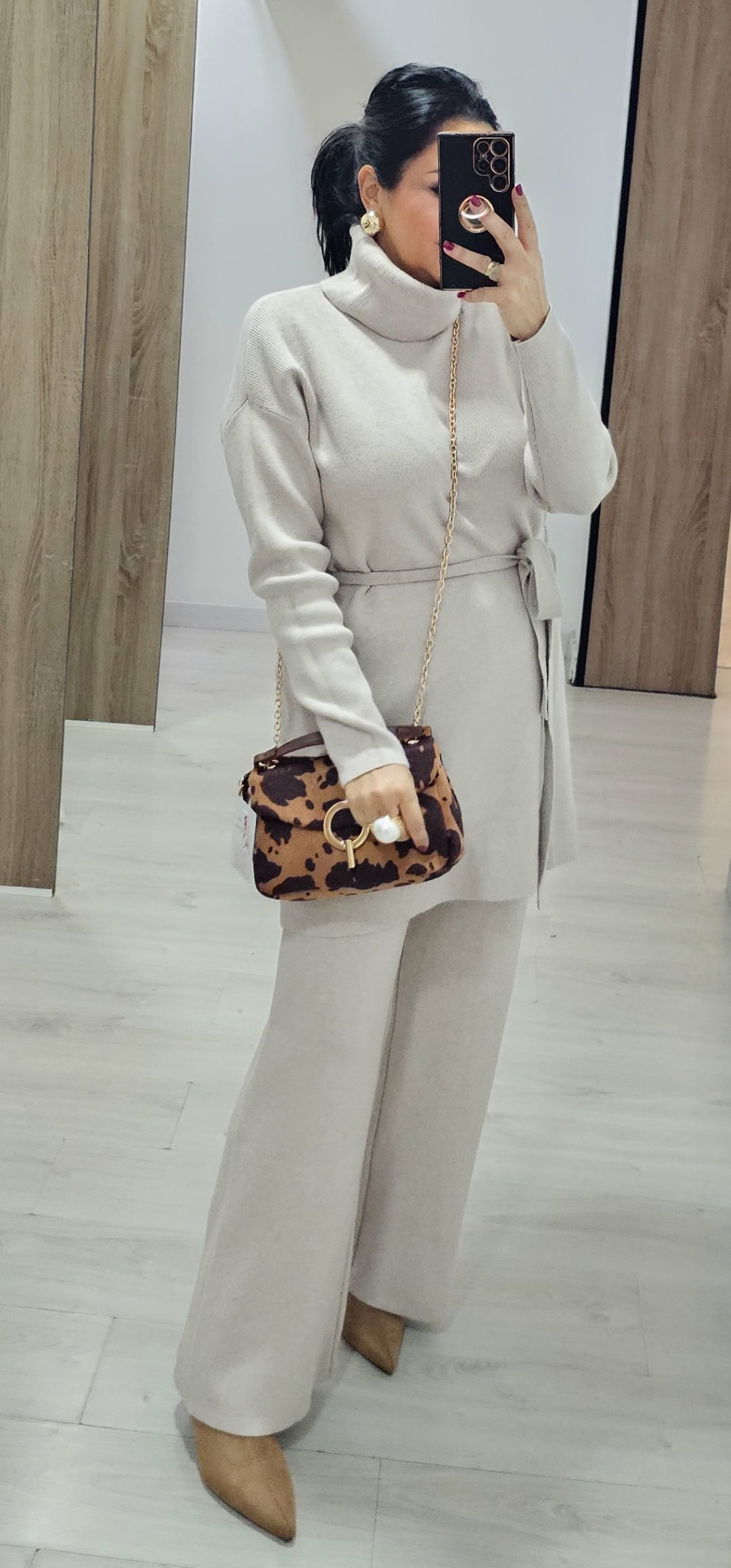 Monisimo y elegante conjunto de punto de pantalón de pata recta con cintura elástica y jersey largo con cuello vuelto y cinturón de lazada en tejido de punto en canale elástico