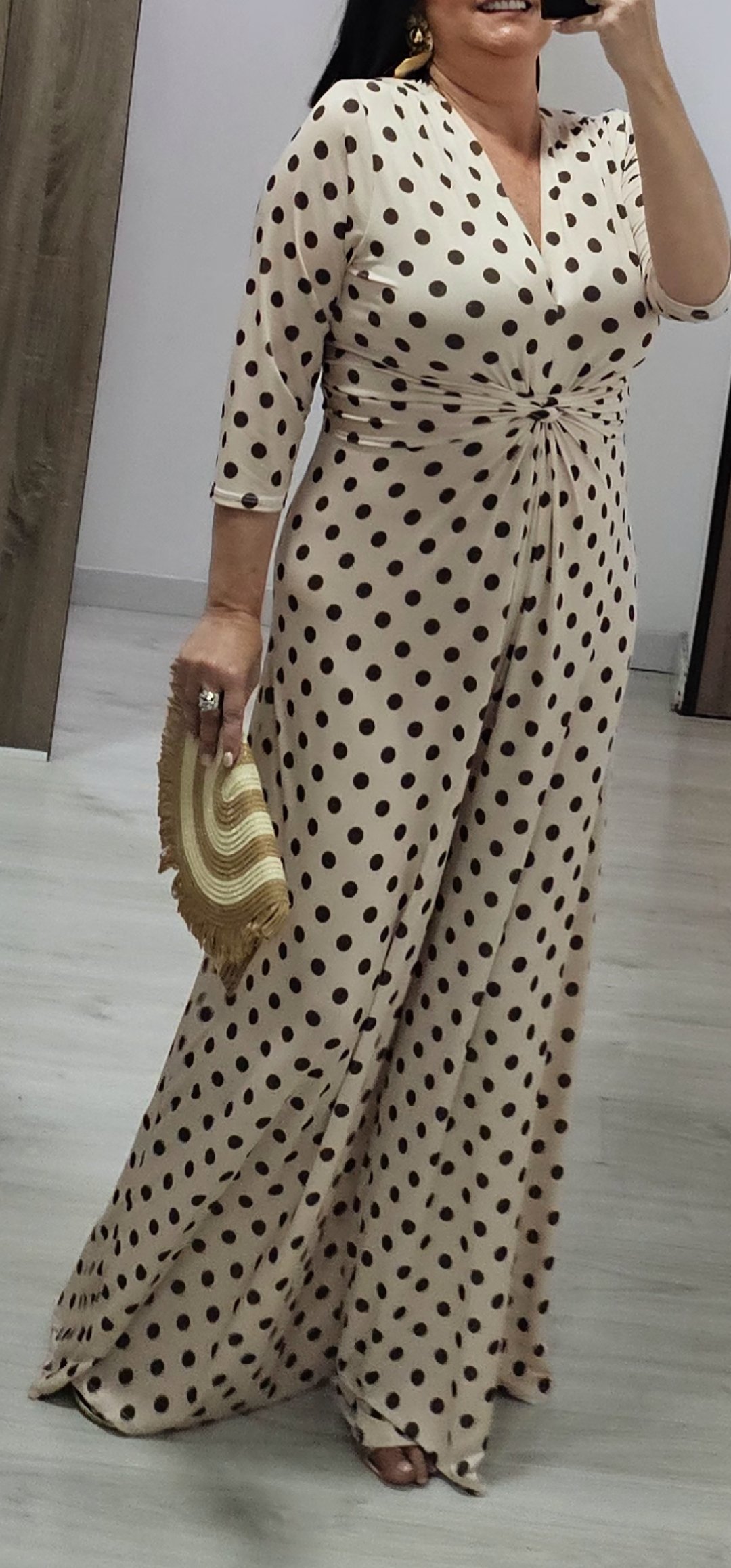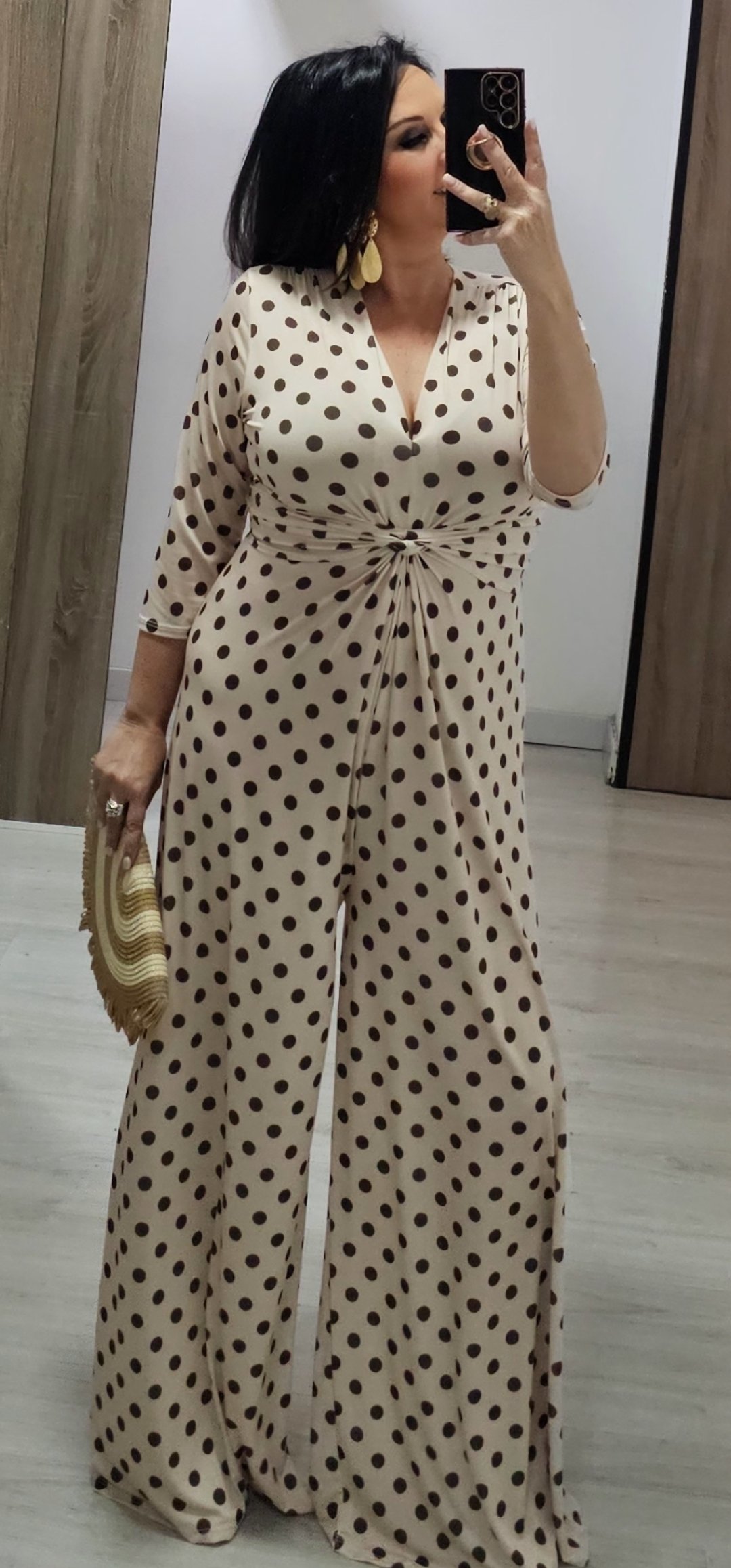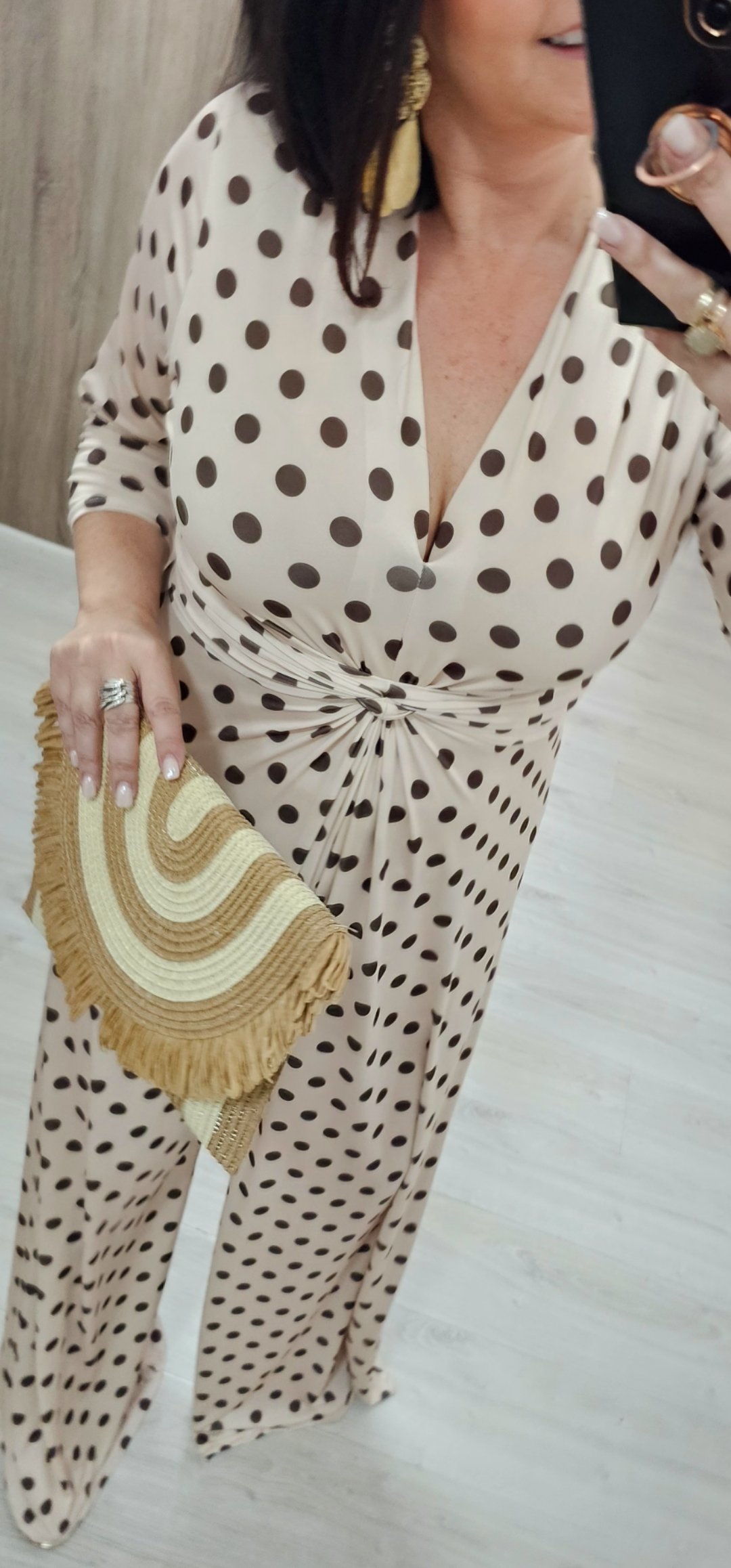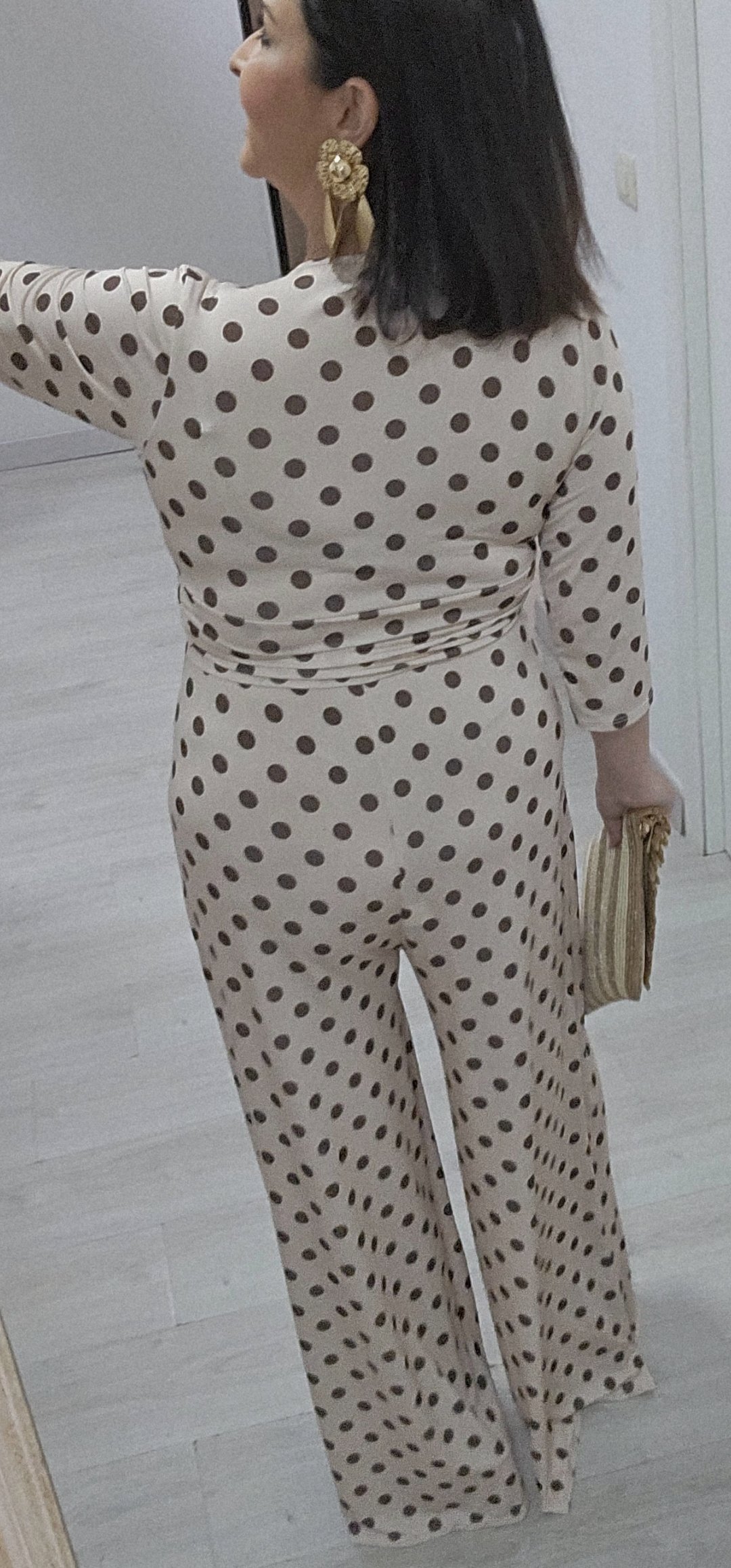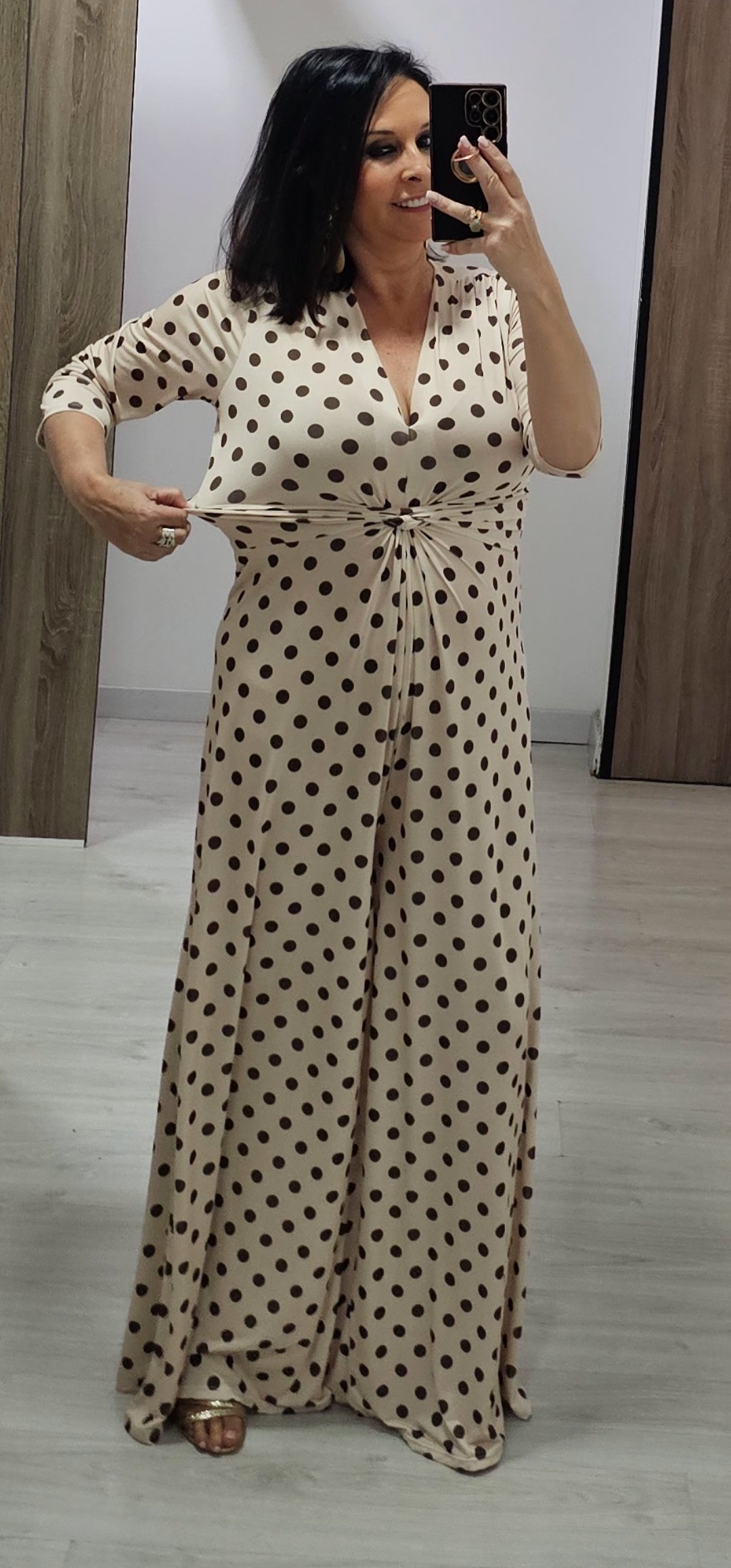 Monisimo mono en tejido de punto de seda con una caída espectacular estampado de lunares y frunce en la parte delantera