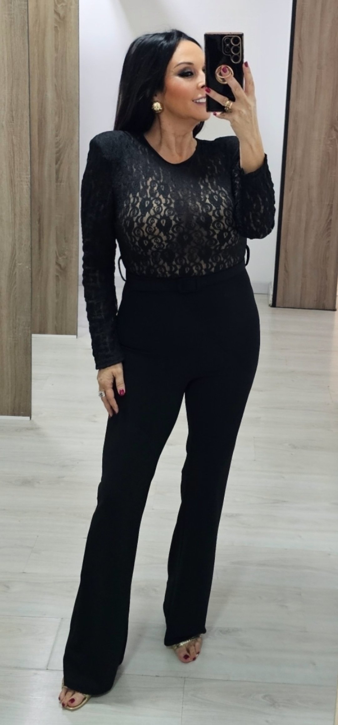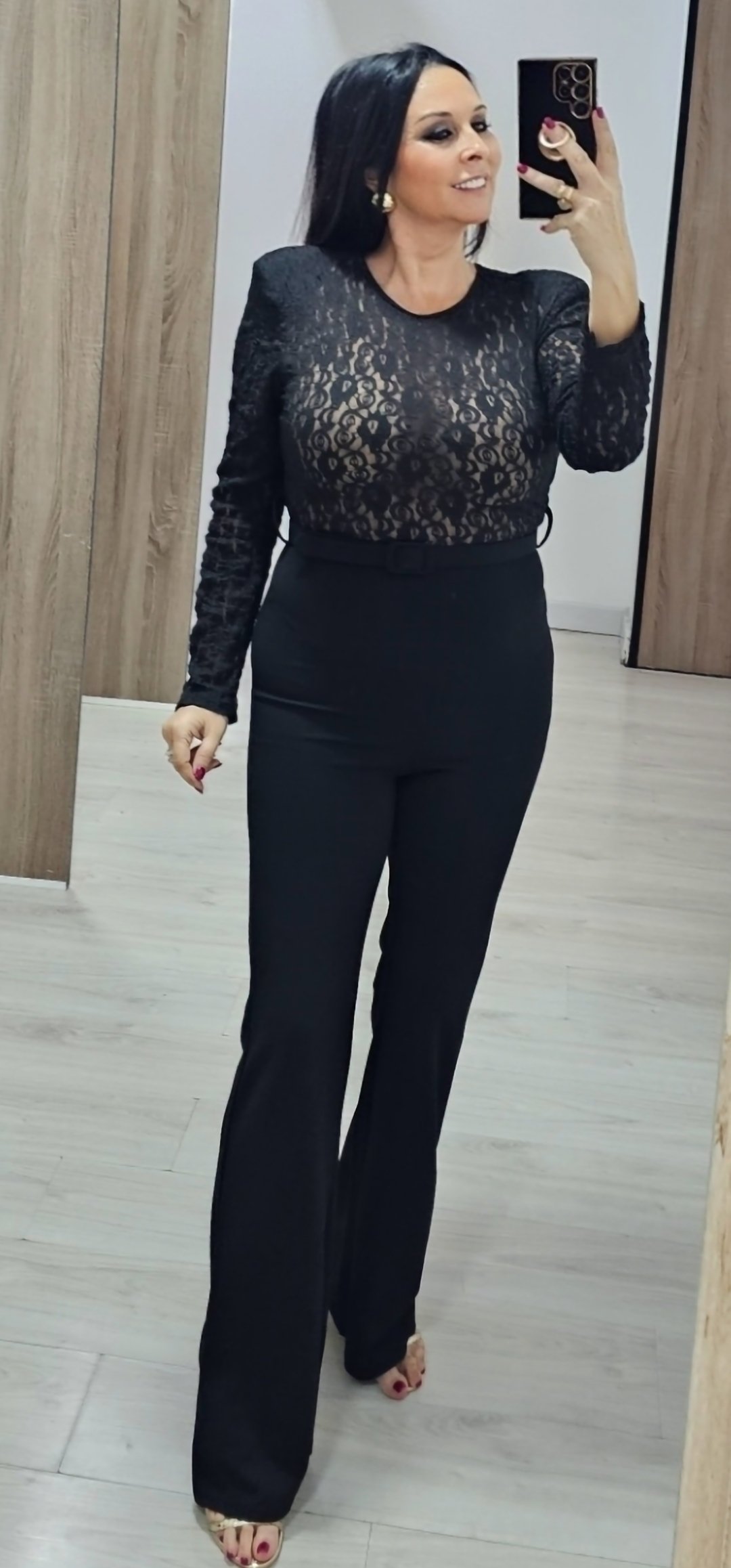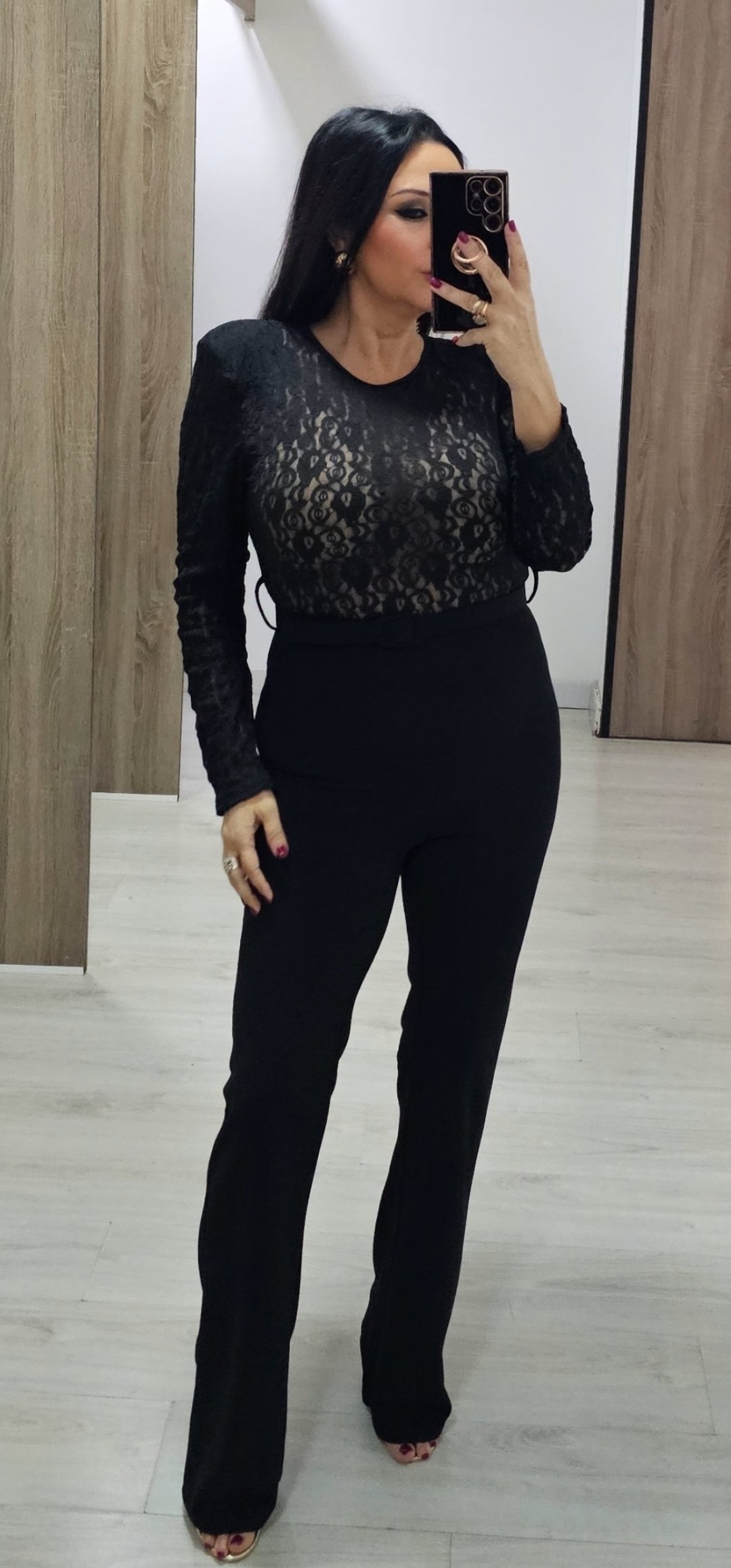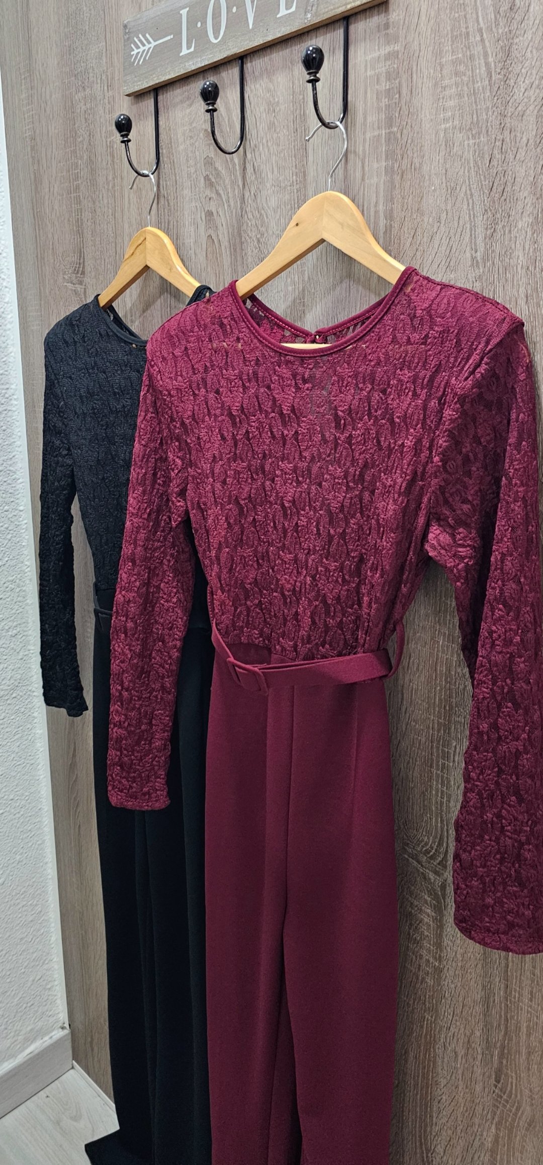 Monisimo mono de pata recta en tejido de crep elástico y encaje con cierre de botón detrás y espalda semiavierta y cinturón incluido