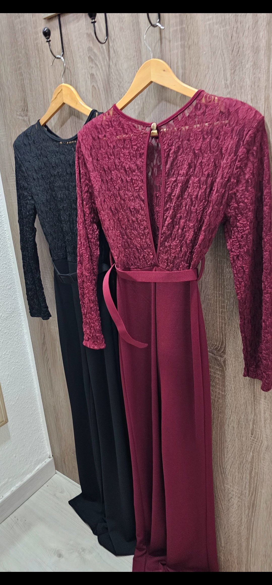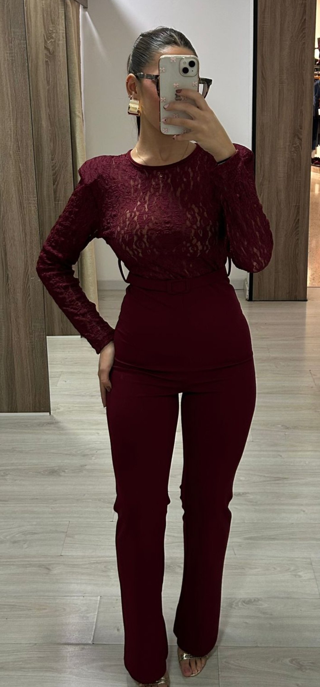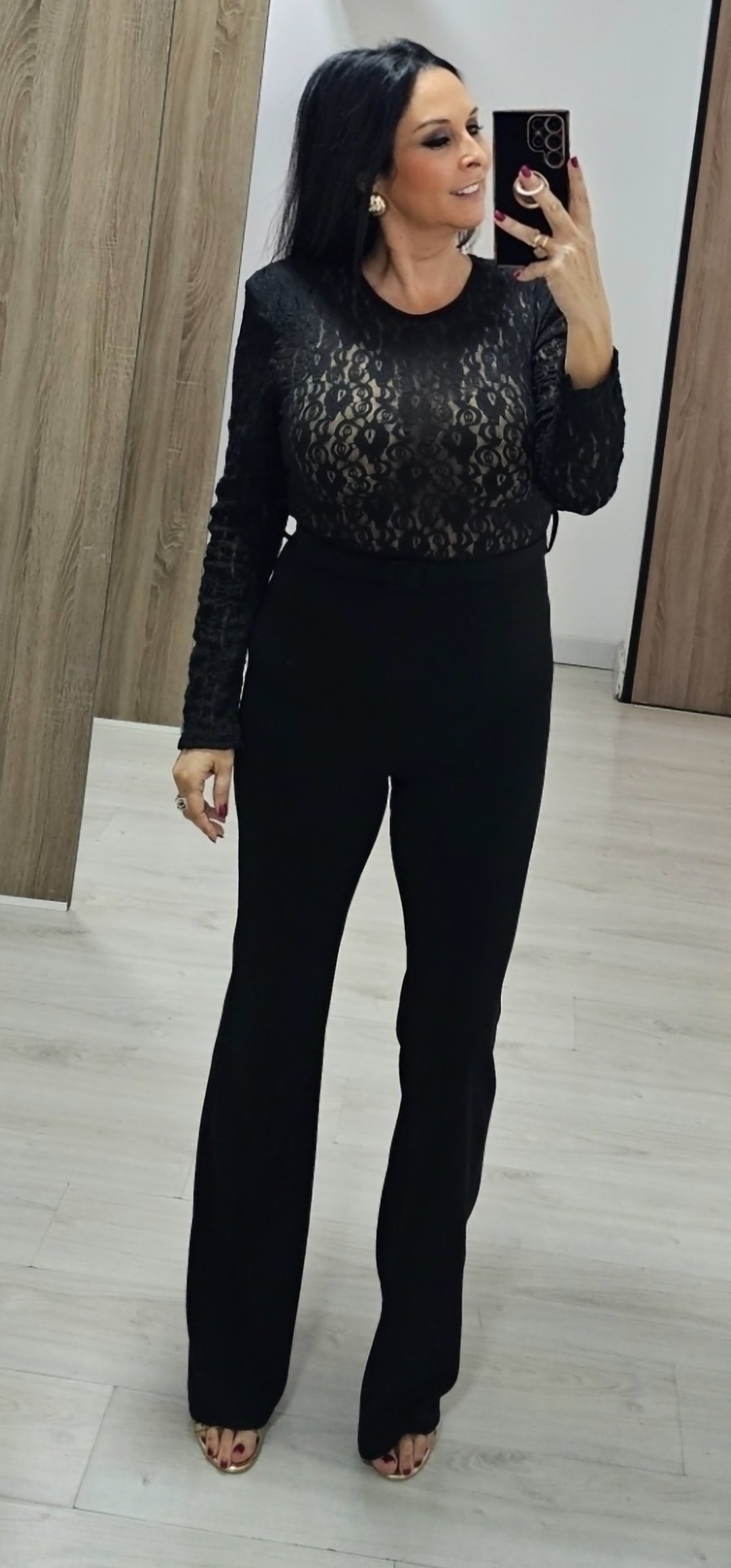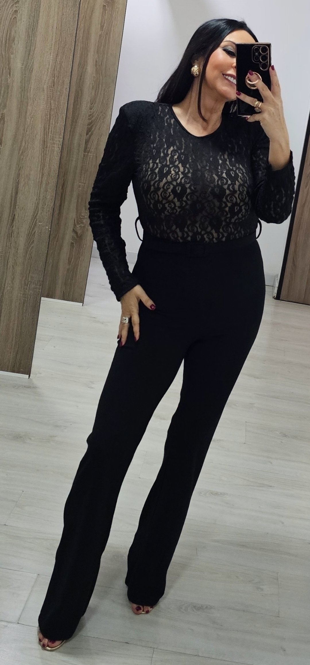 Monisimo mono de pata recta en tejido de crep elástico y encaje con cierre de botón detrás y espalda semiavierta y cinturón incluido