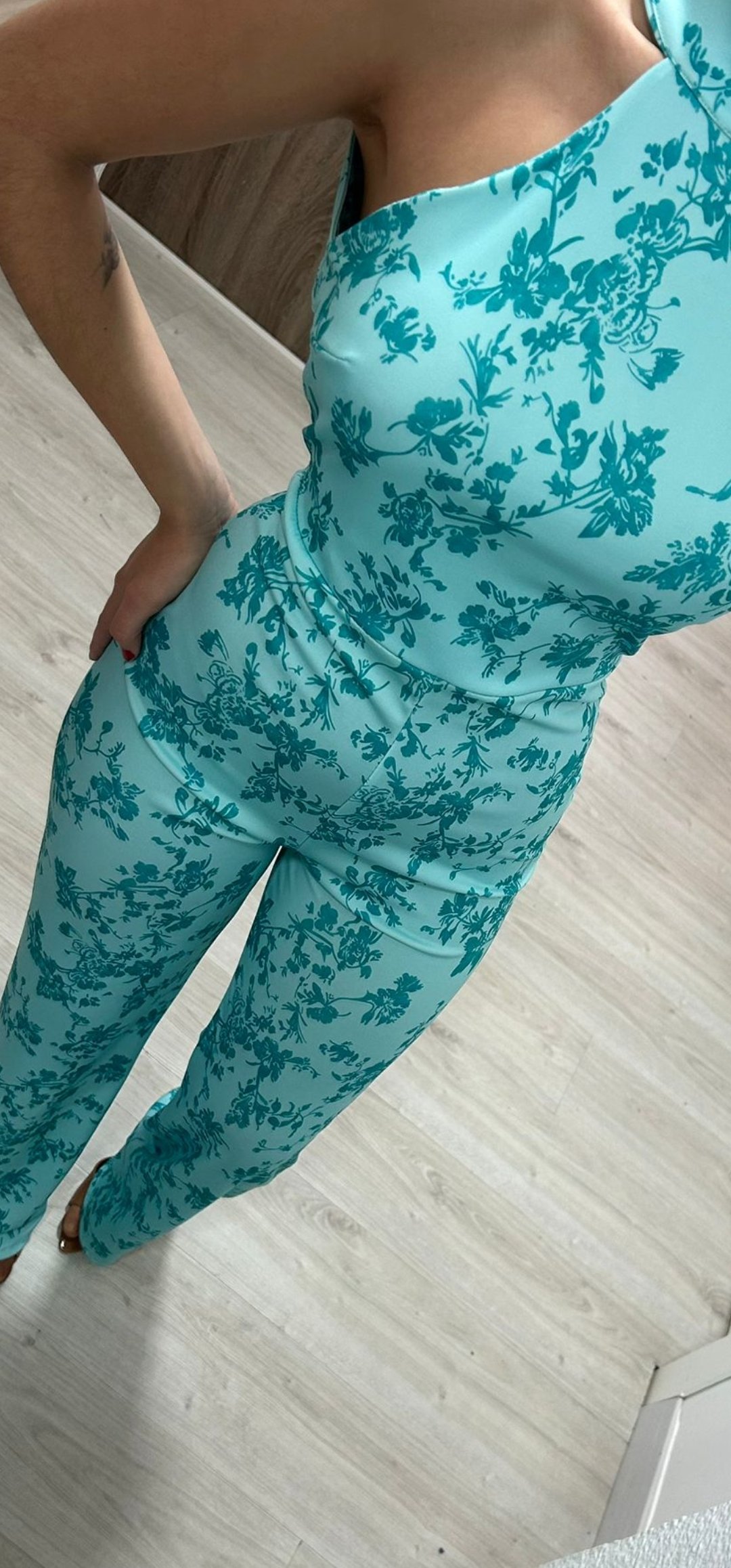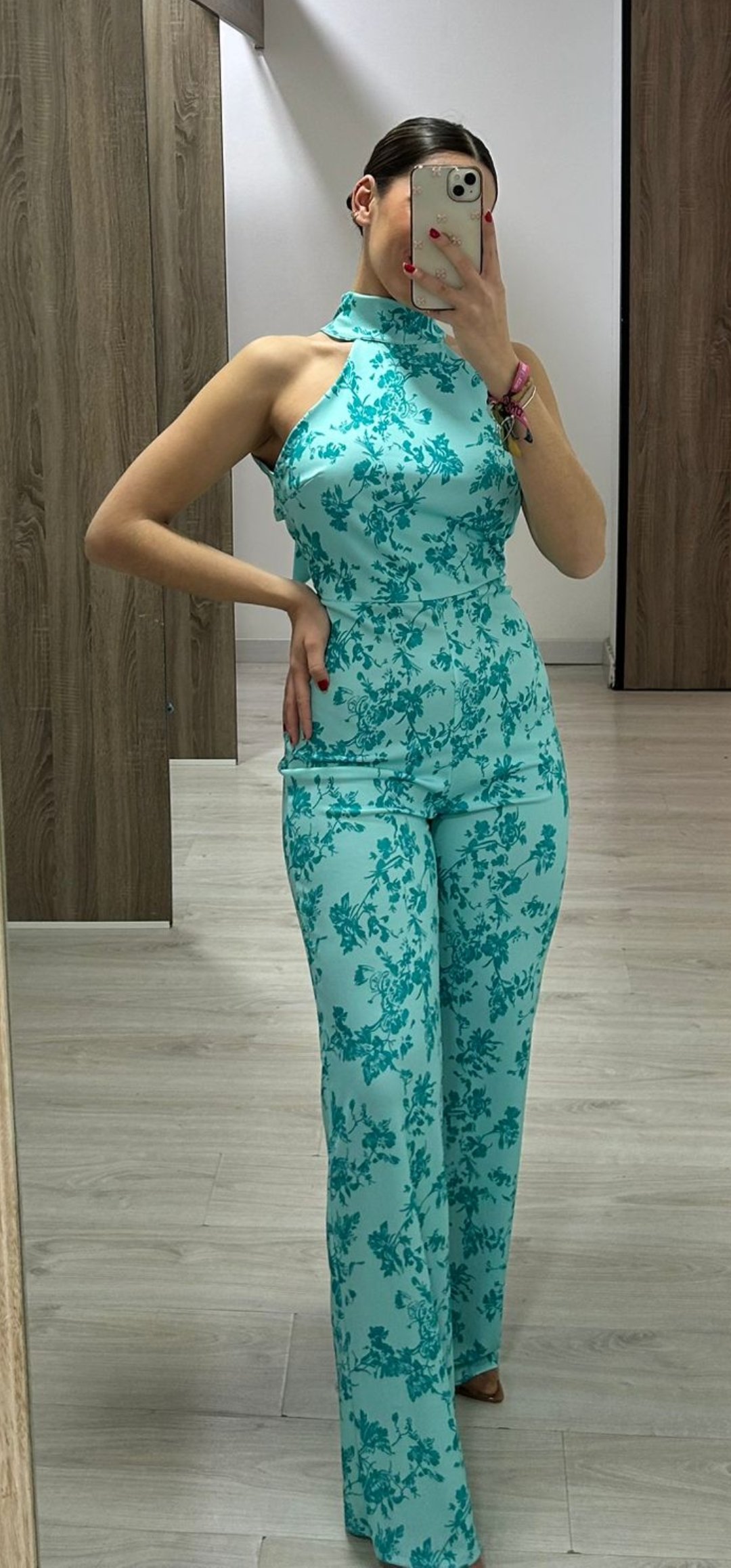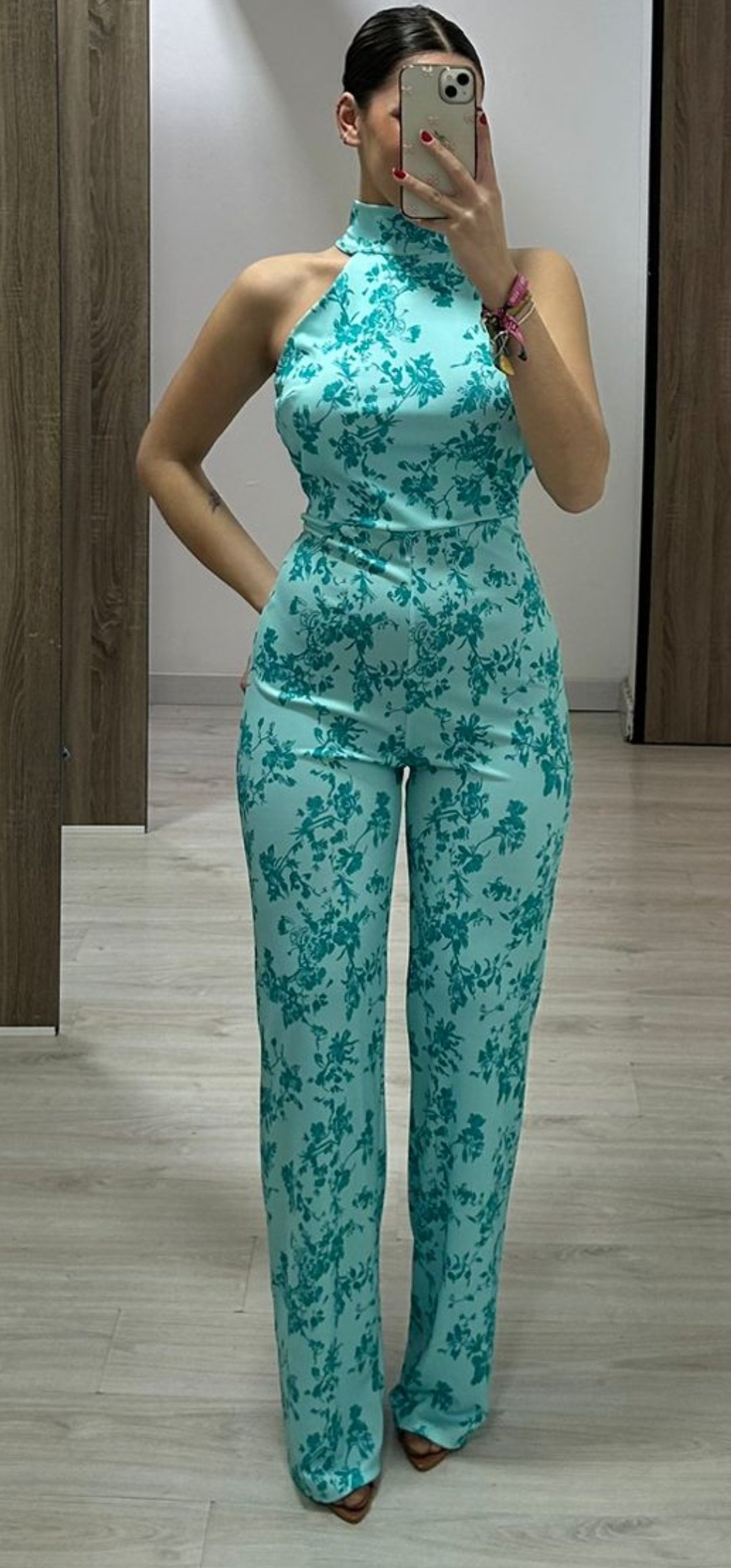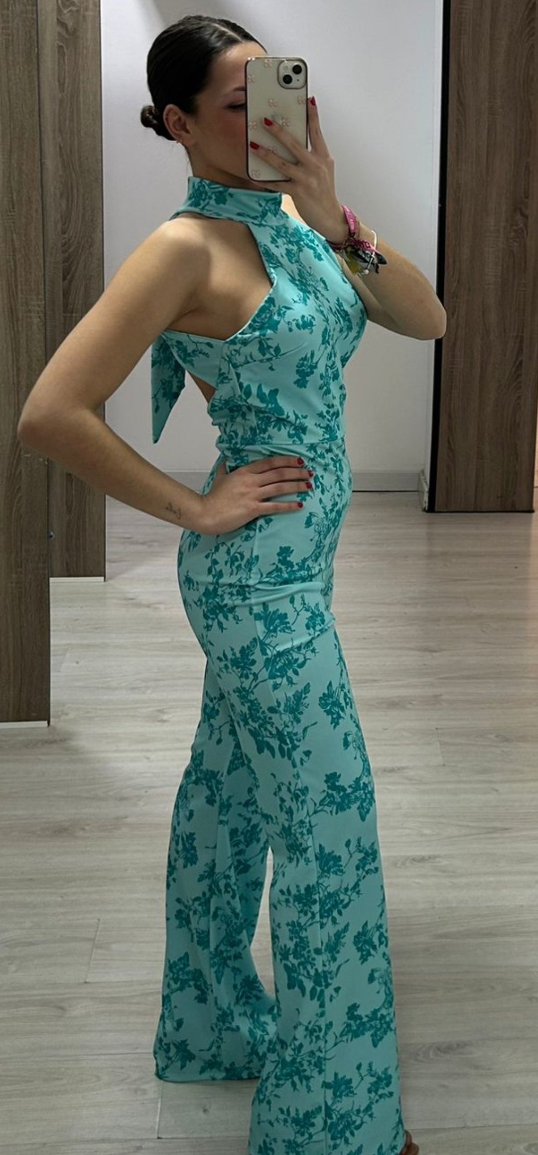 Espectacular mono con un corte súper elegante y sexy con espalda descubierta y abrochado en el cuello ,en tejido de crep elástico y un estampado súper bonito
