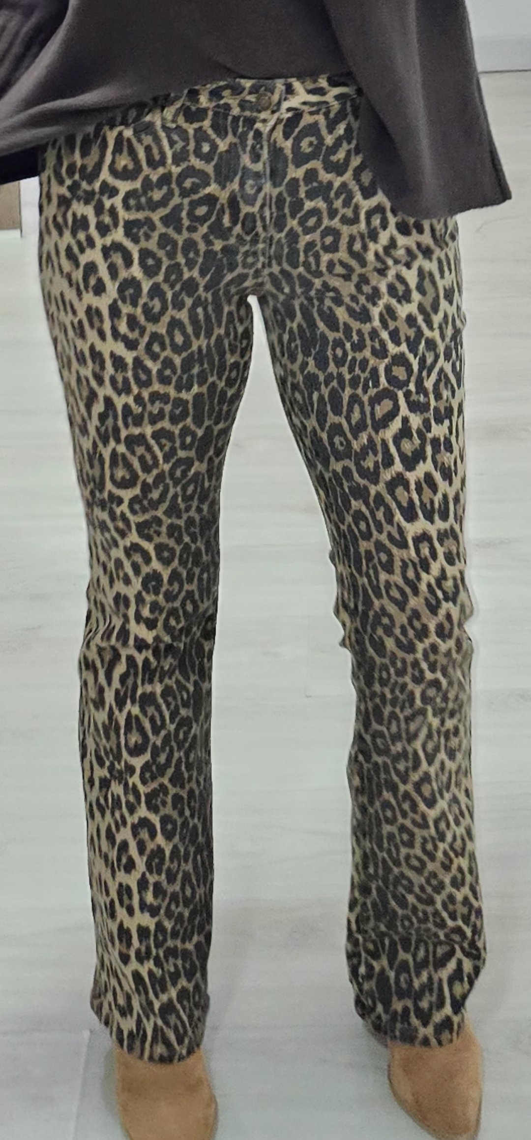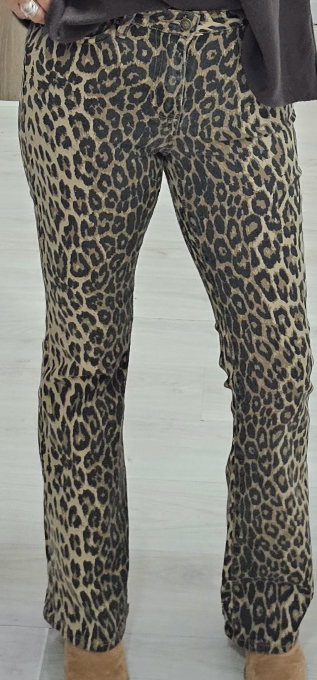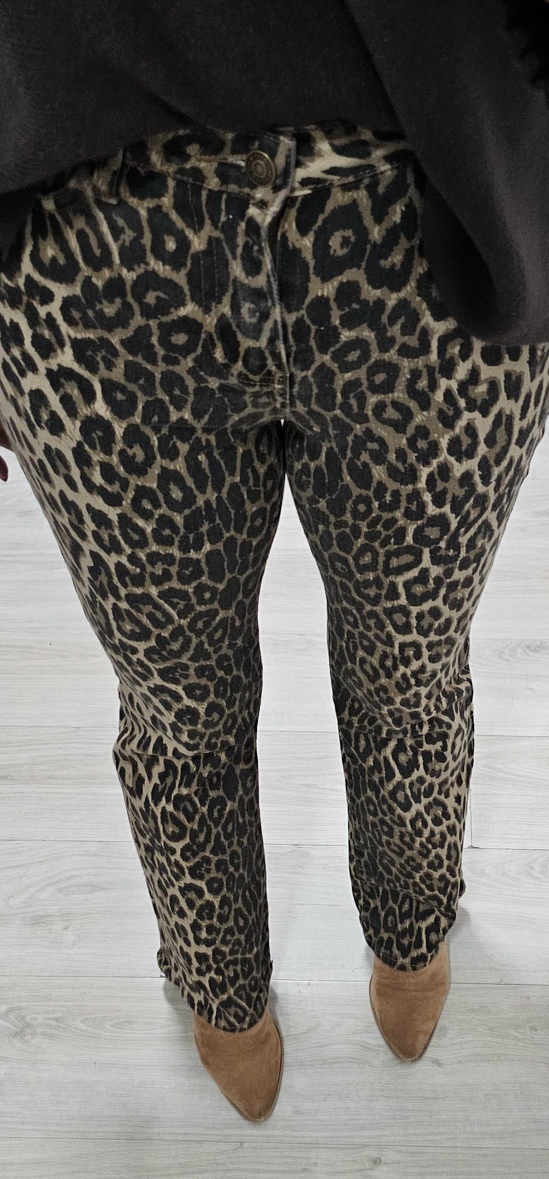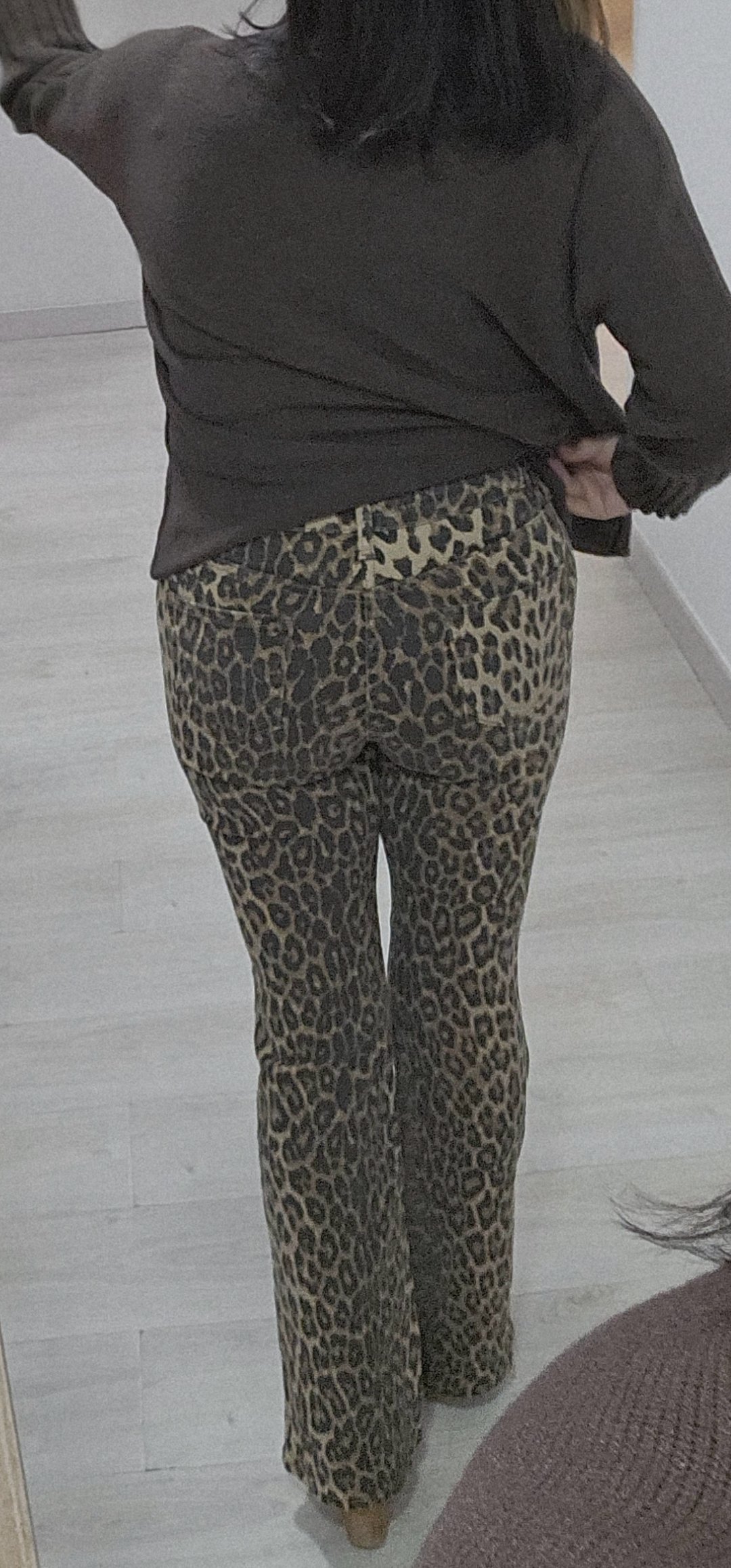 Monisimo pantalón vaquero acampanado en estampado animal prints con un corte súper bonito talle medio alto cierre de botón y cremallera,lleva elástan.