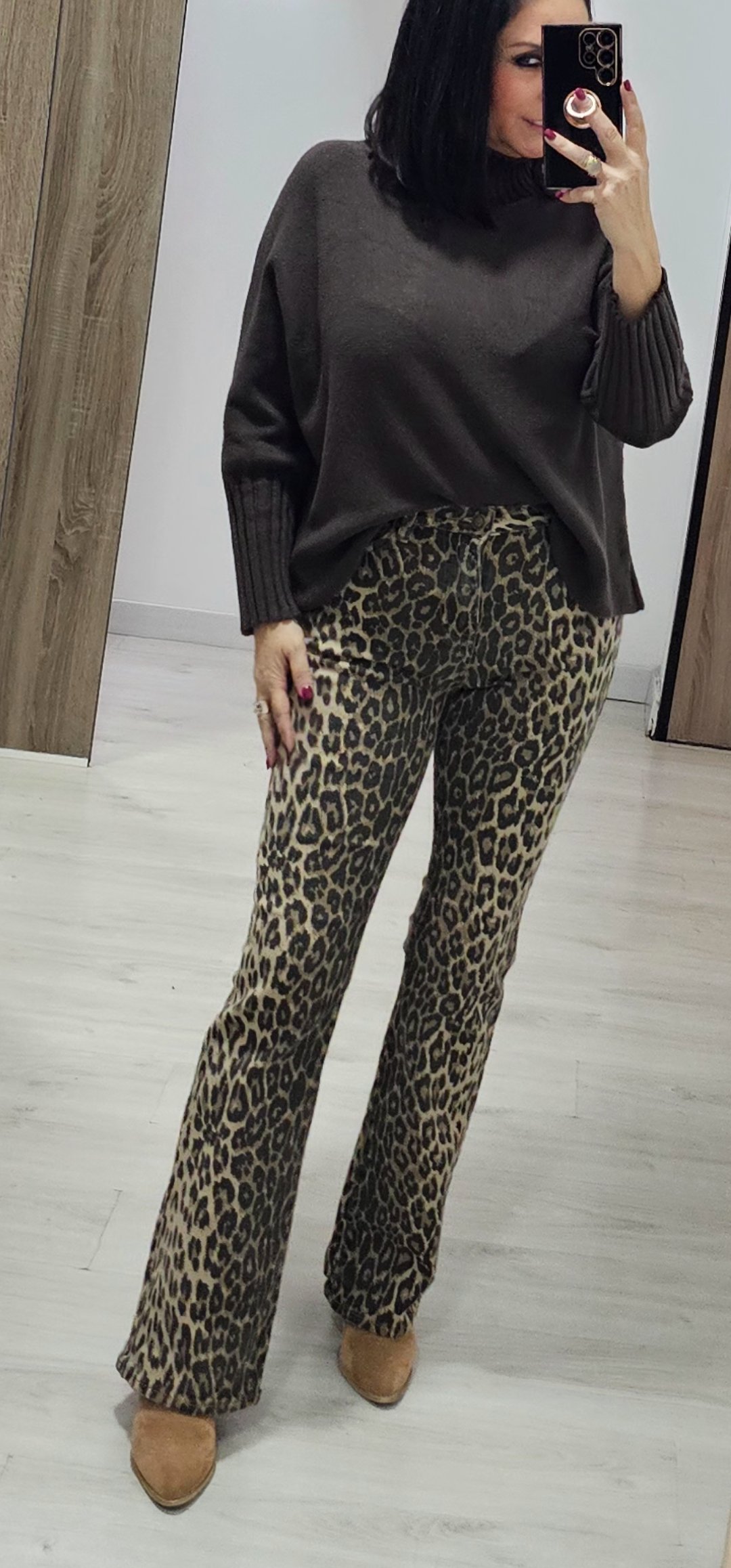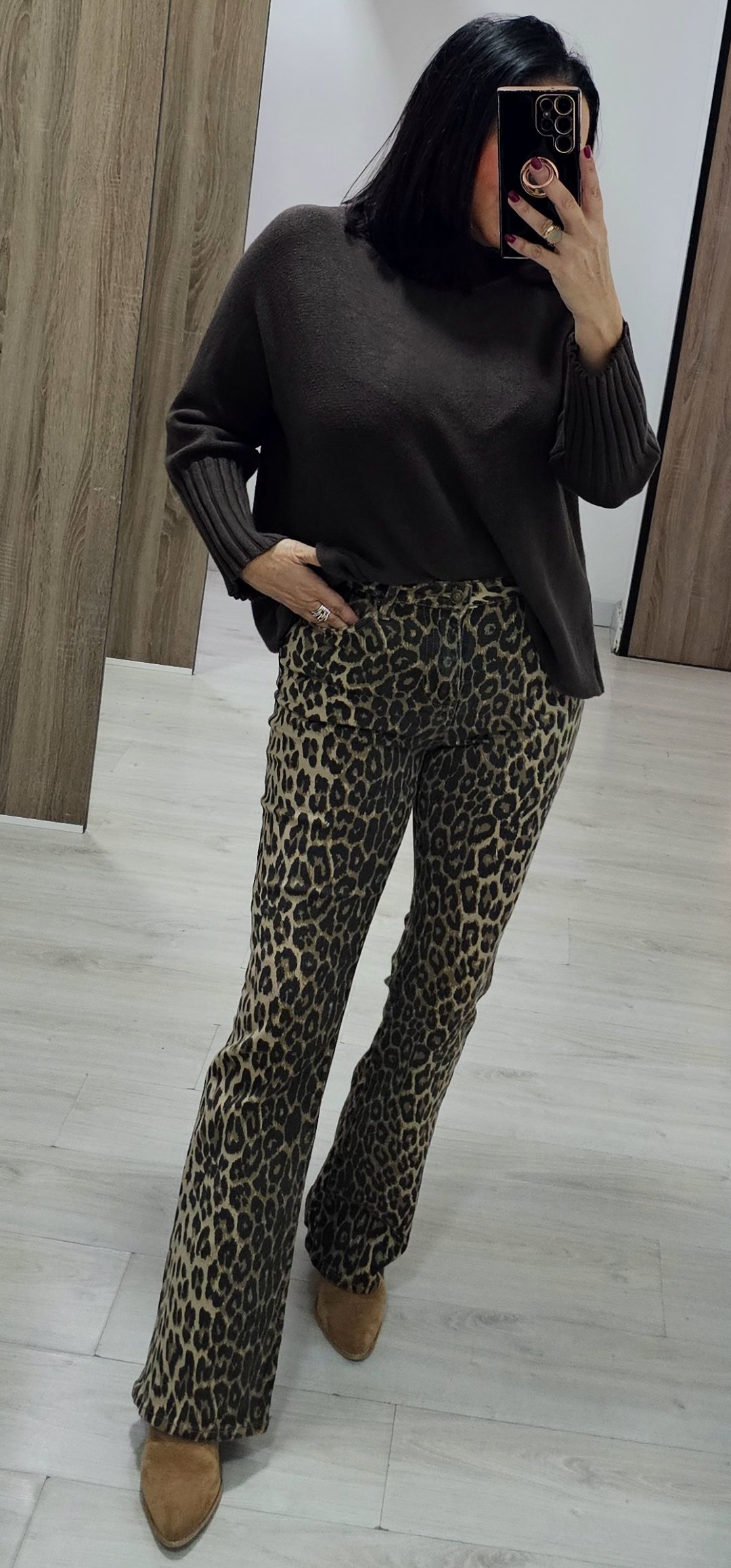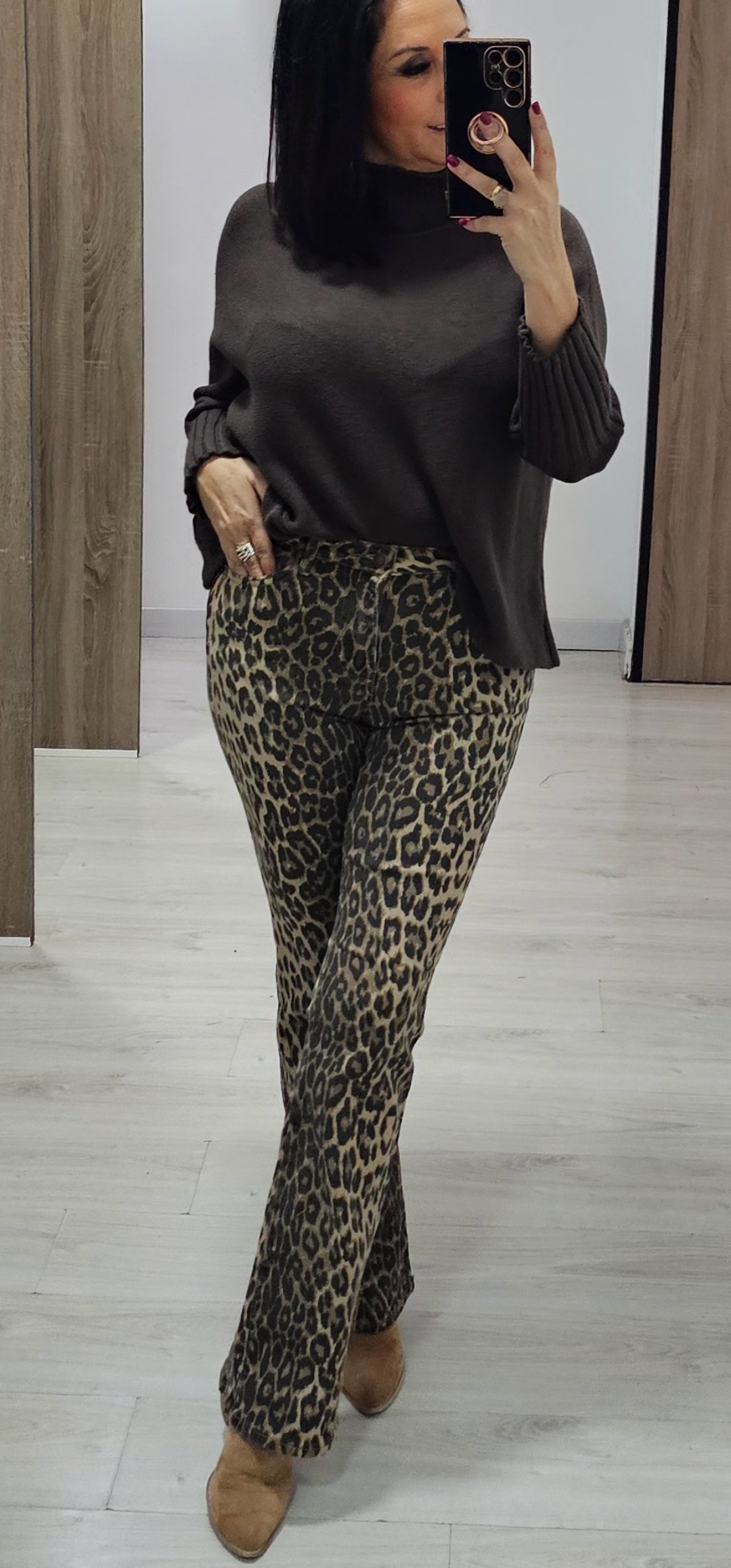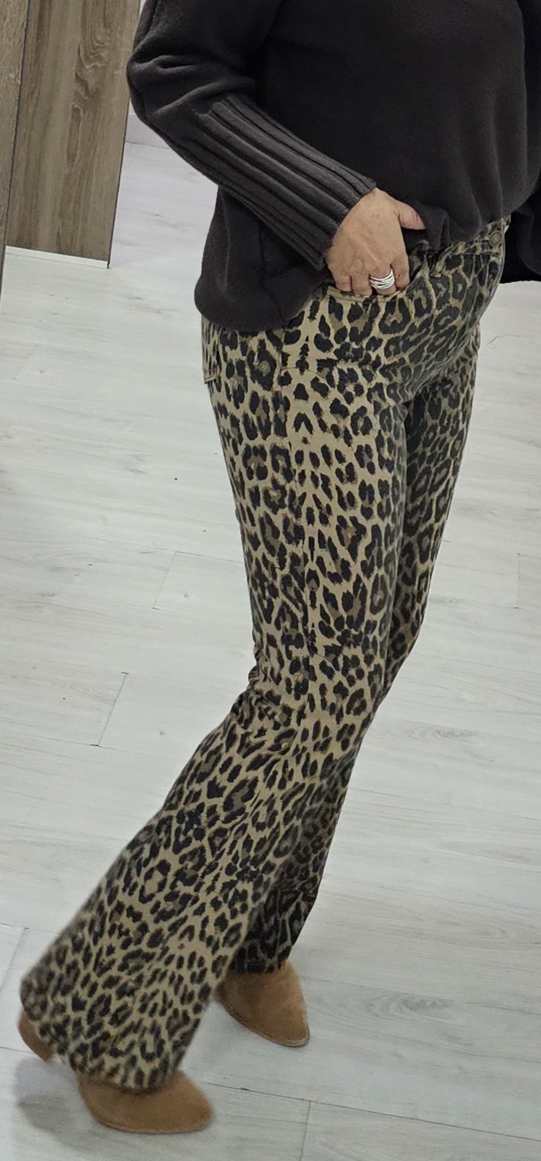 Monisimo pantalón vaquero acampanado en estampado animal prints con un corte súper bonito talle medio alto cierre de botón y cremallera,lleva elástan.