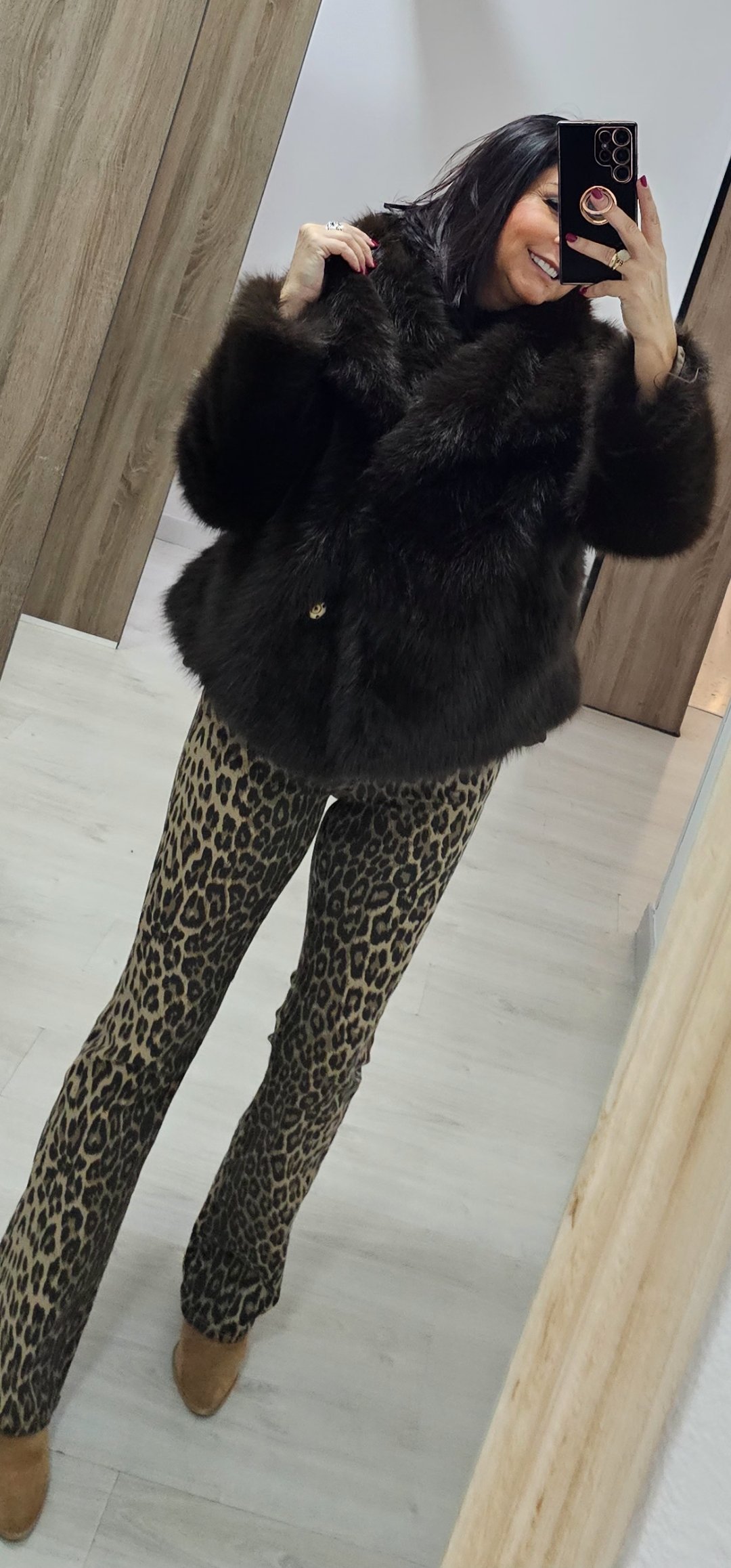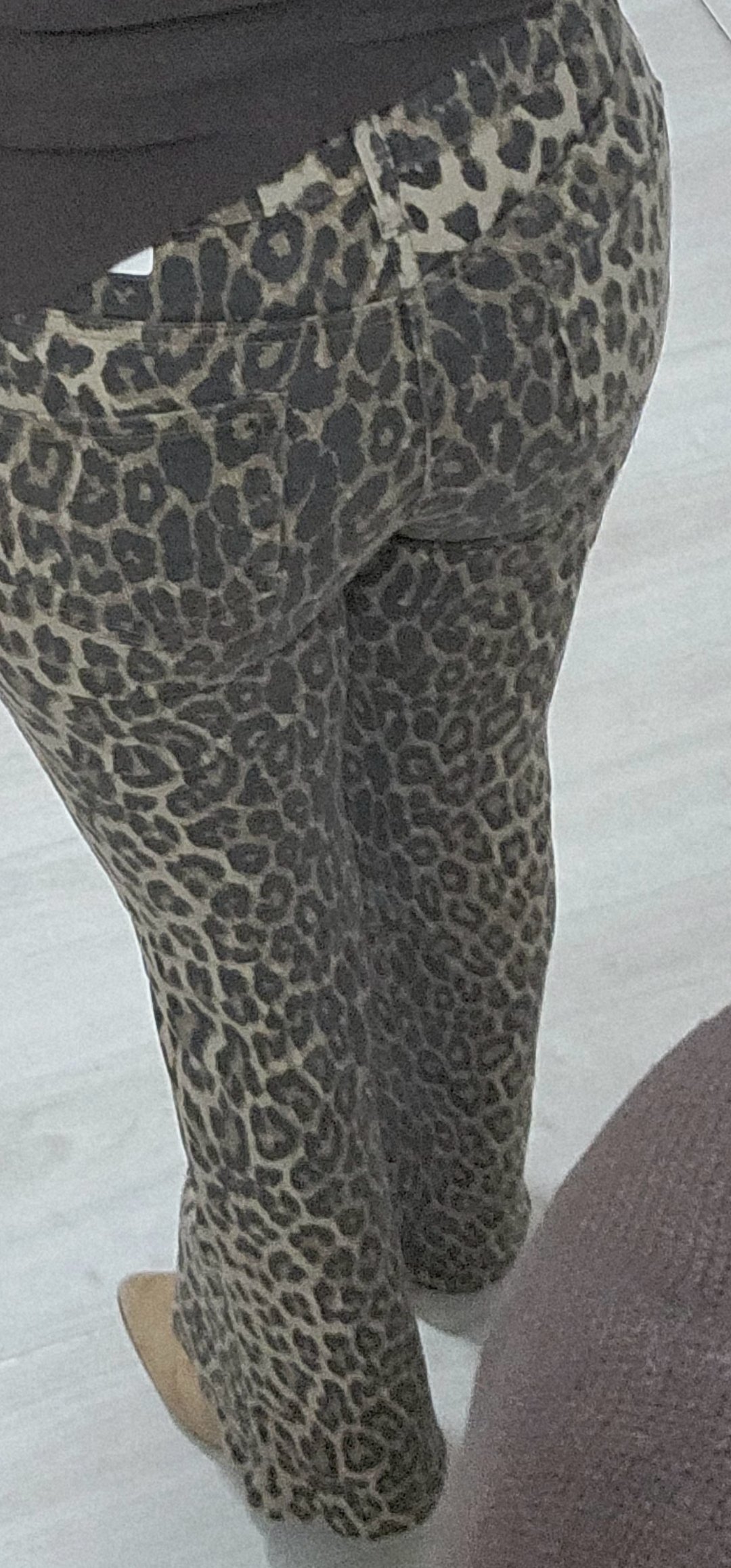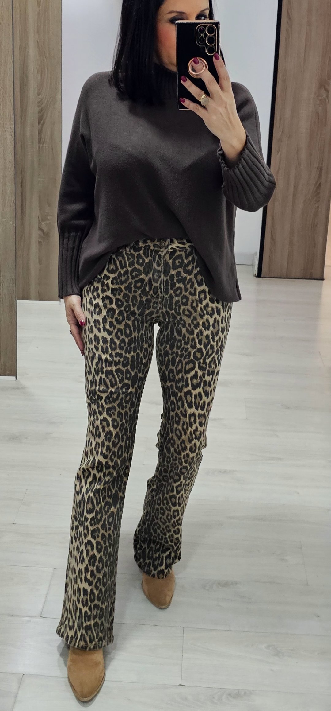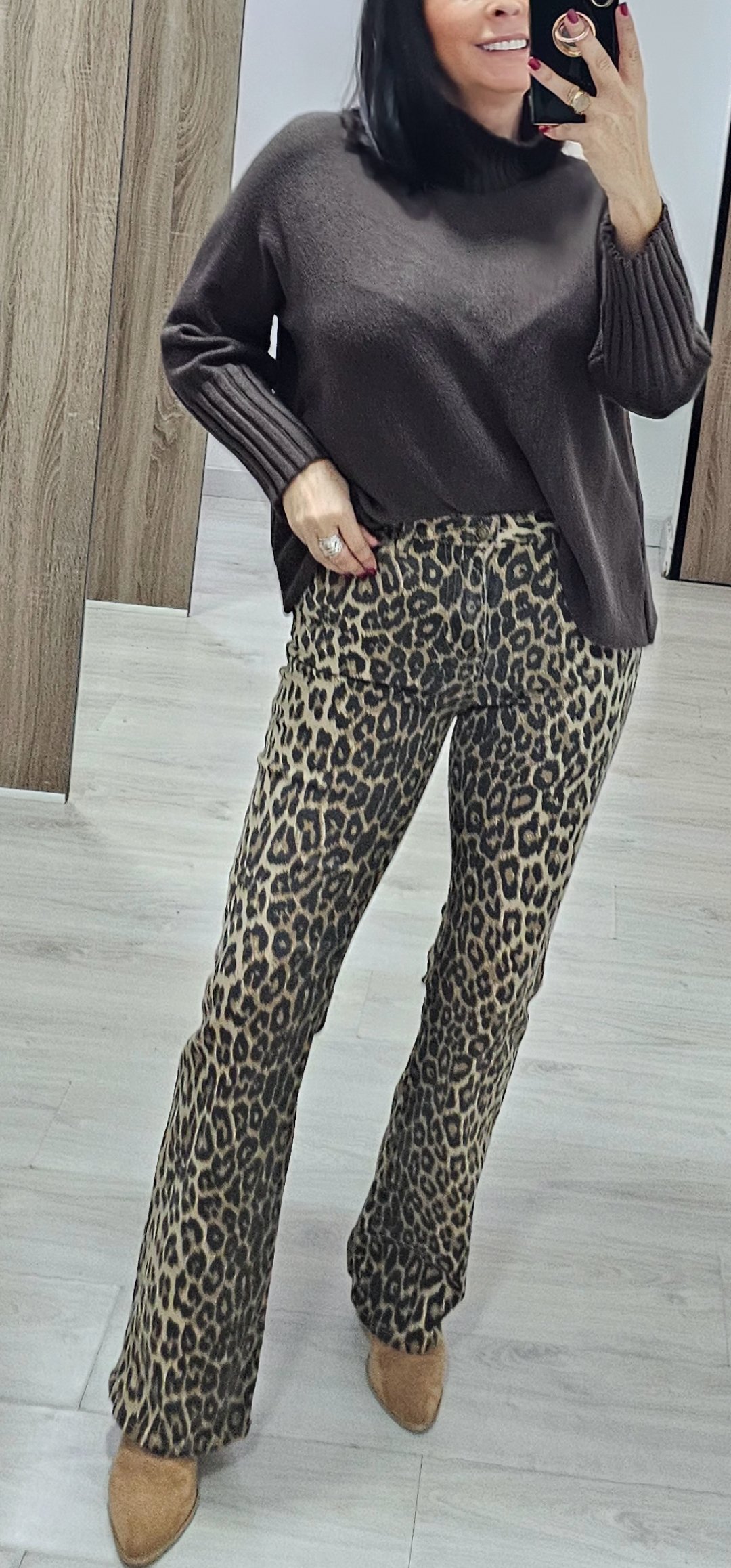 Monisimo pantalón vaquero acampanado en estampado animal prints con un corte súper bonito talle medio alto cierre de botón y cremallera,lleva elástan.