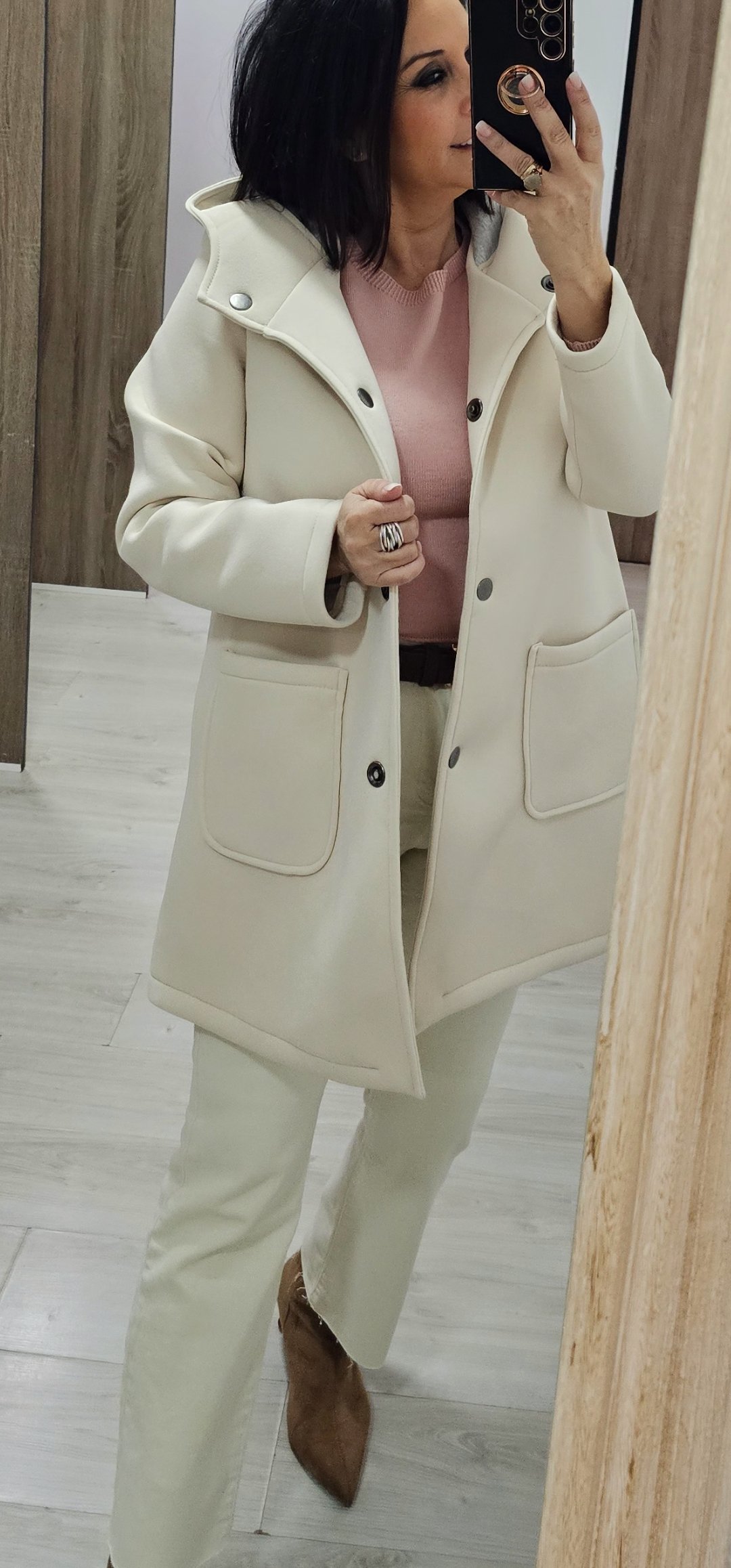 Monisima parka en tejido de neopreno y forrada por dentro en algodón con cierre de botones dd clips ,trae bolsillos y capucha