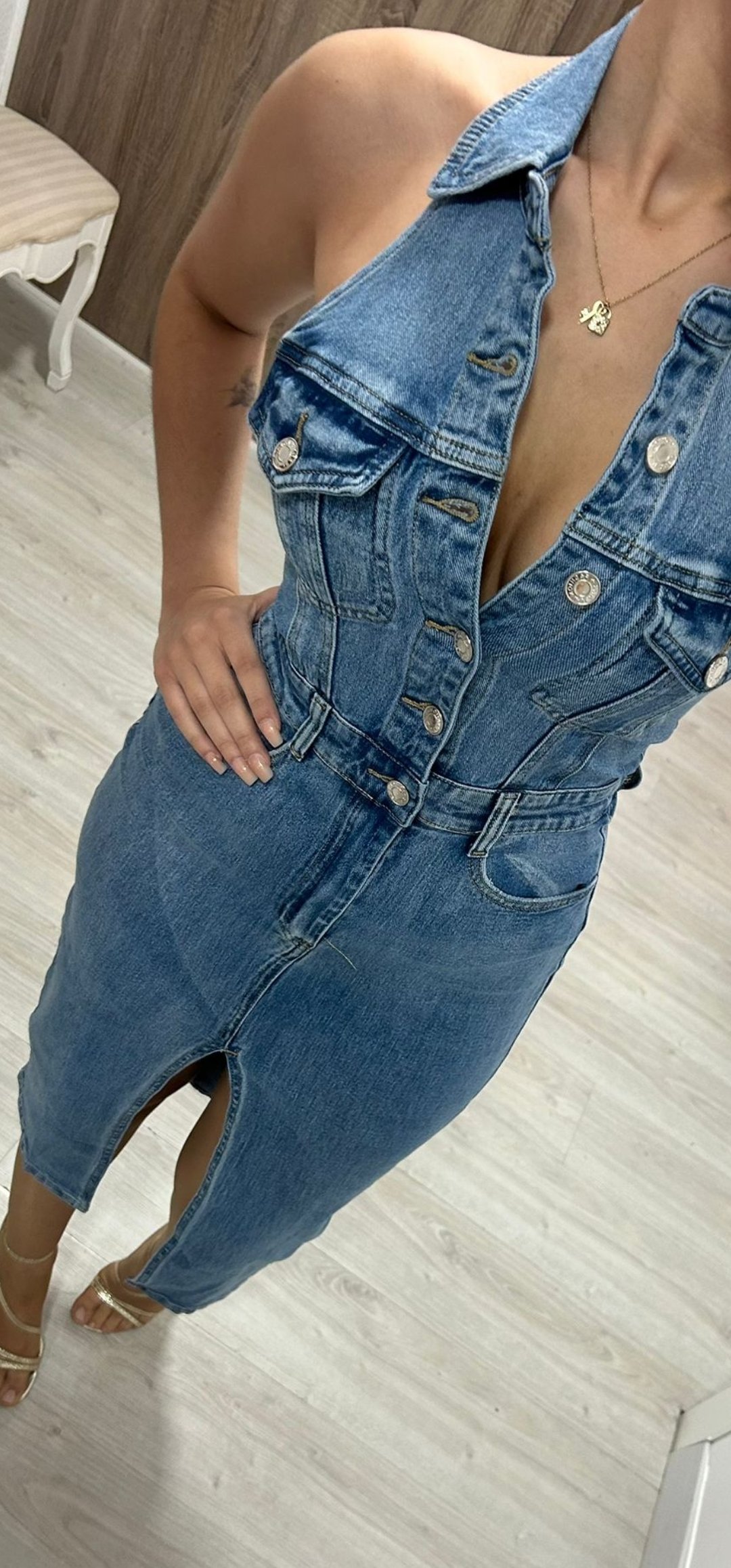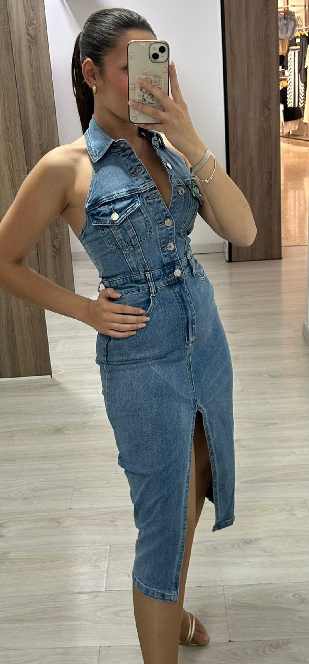 Monisimo y sexy vestido vaquero cojido al cuello con espalda descubierta, el corte del vestido es midi y lleva una raja delante,cierre de botones y cremallera tejido vaquero elástico