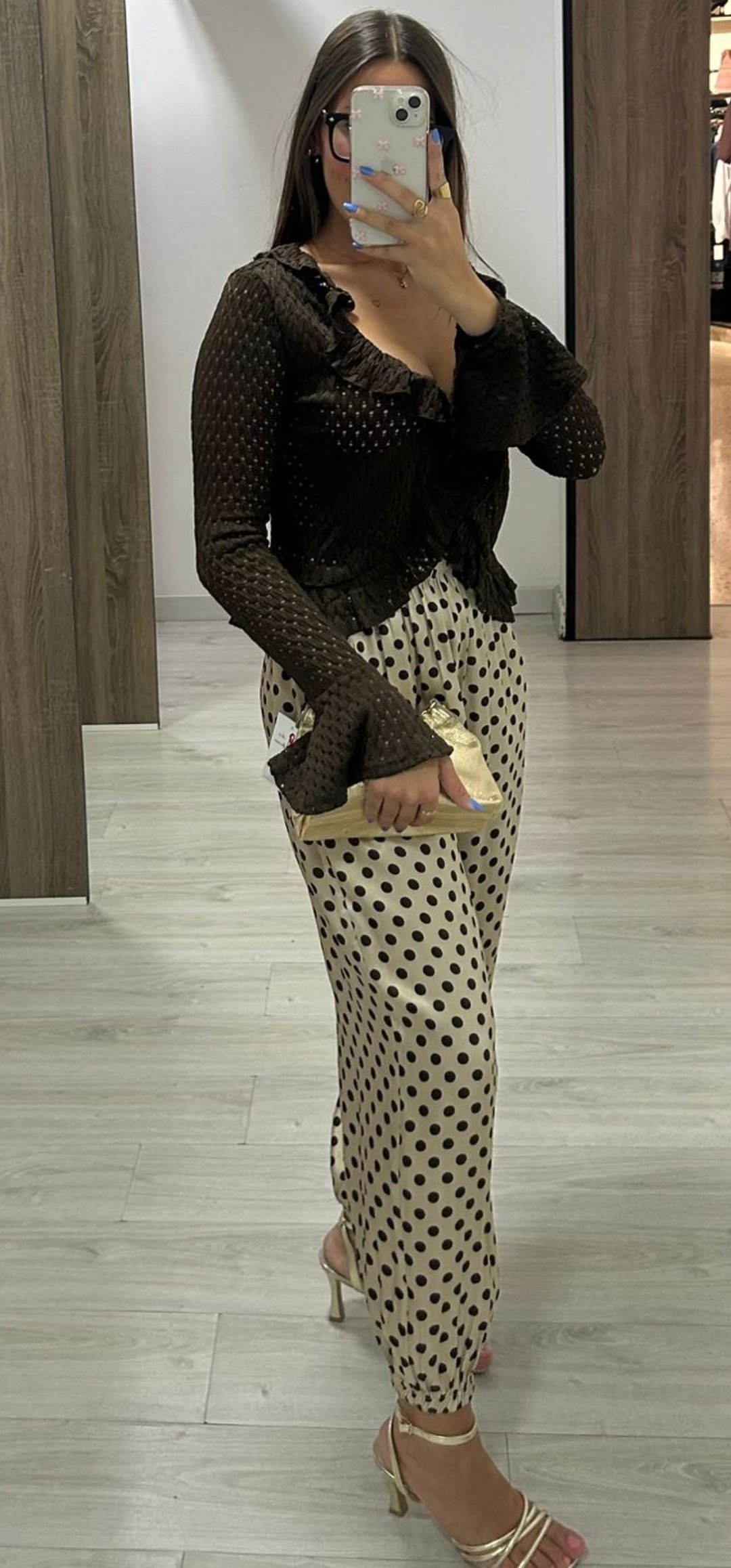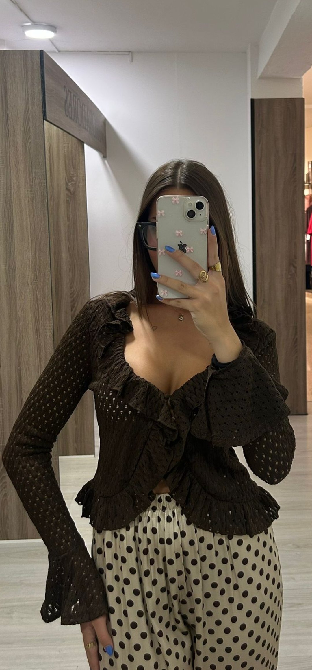 Monisim blusa tipo camisa o chaqueta de encaje elástico en color marrón chocolate con broche de cierre y volante en el escote