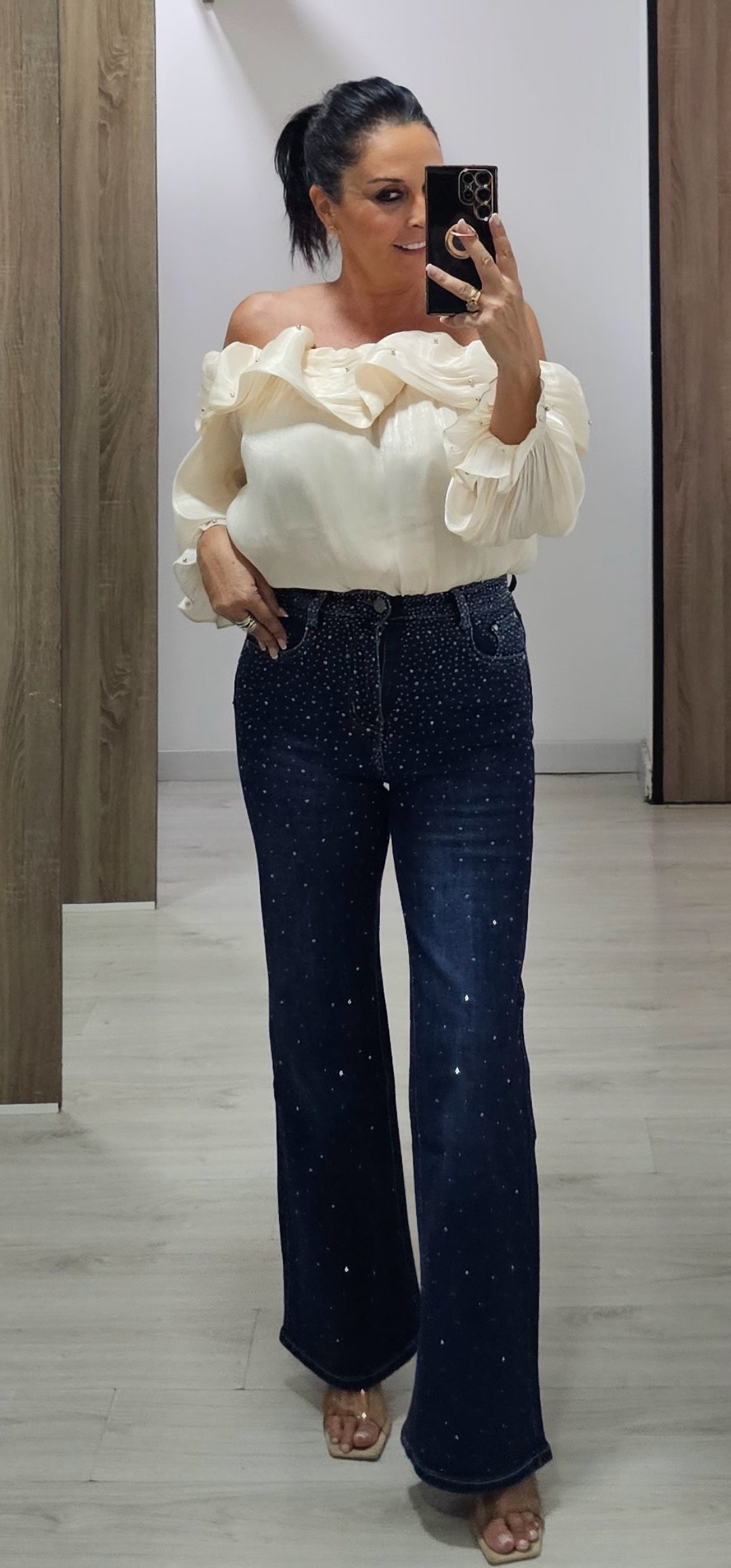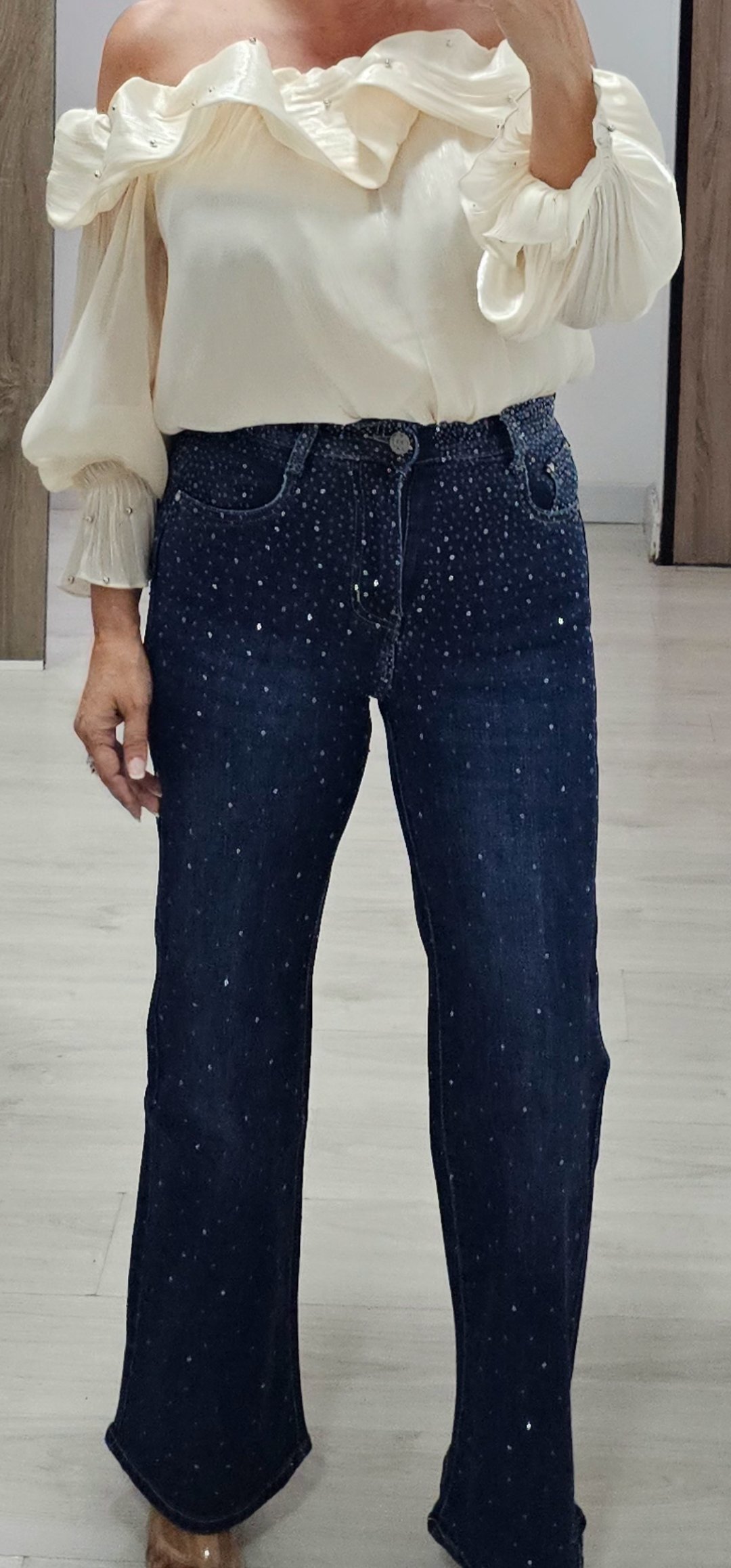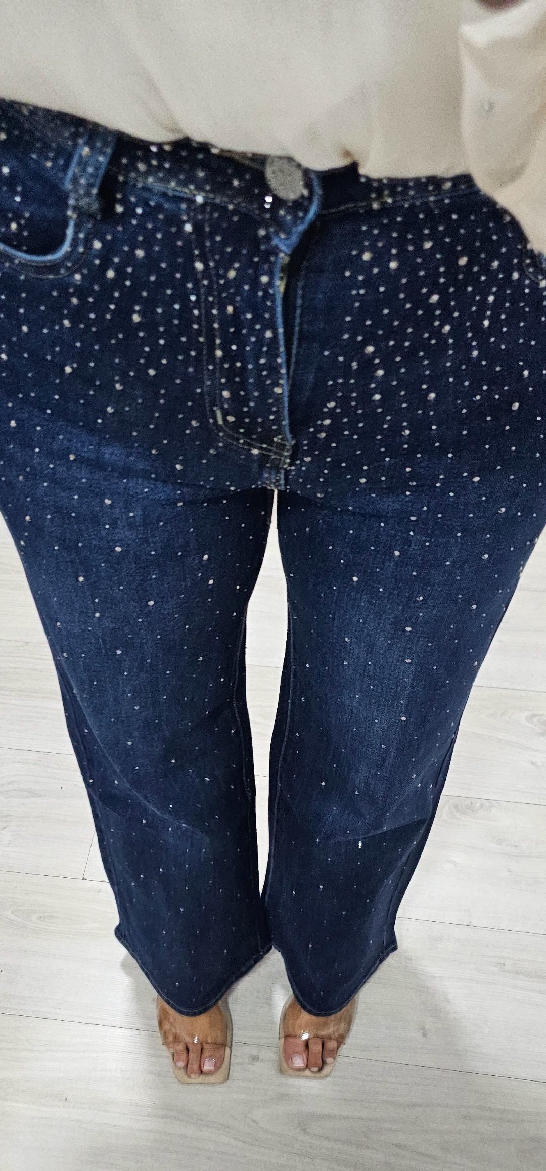 Monisimo pantalón vaquero tipo long Jean con pata recta con adornos de brillos con tiro alto y cierre de cremallera y botón .Color vaquero oscuro y es elástico