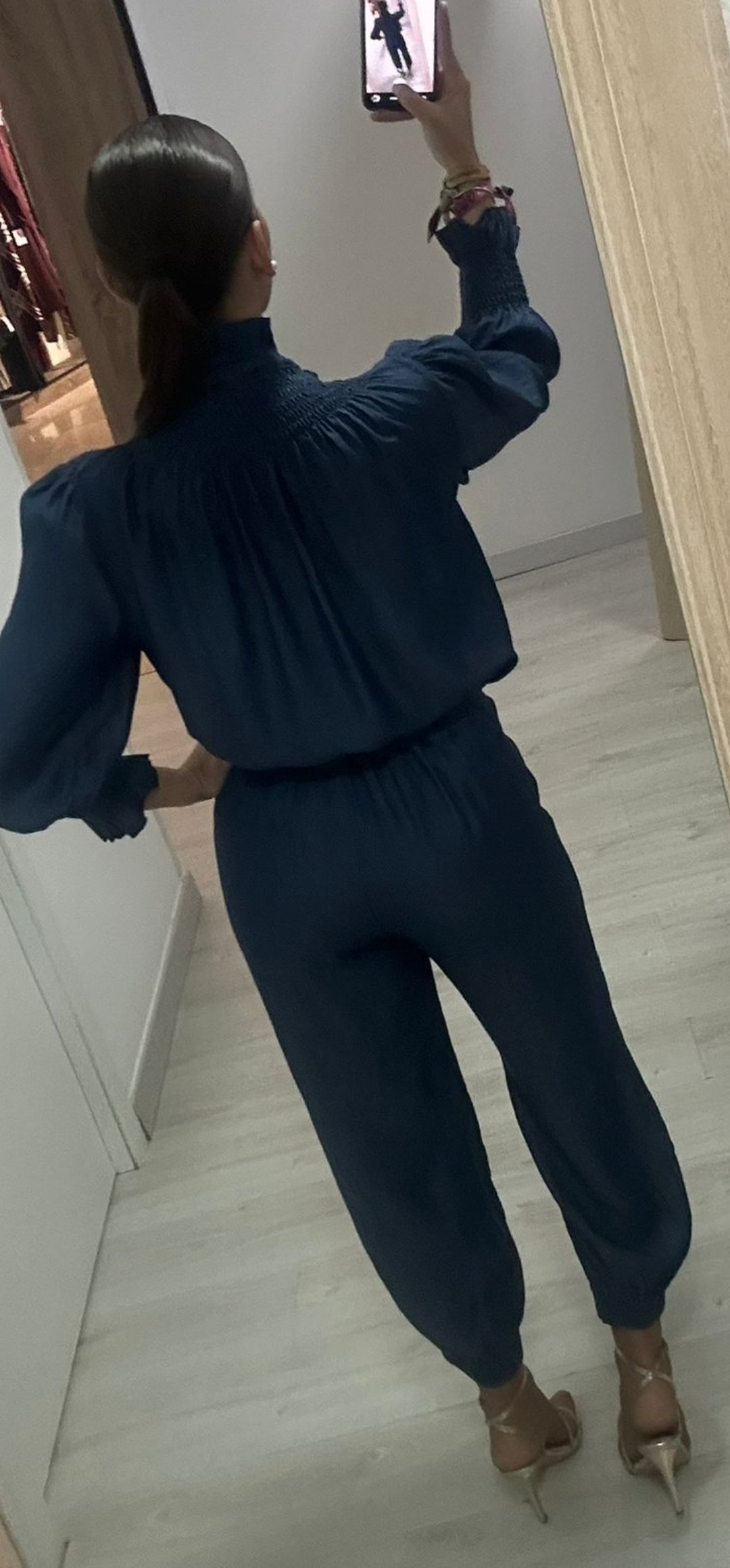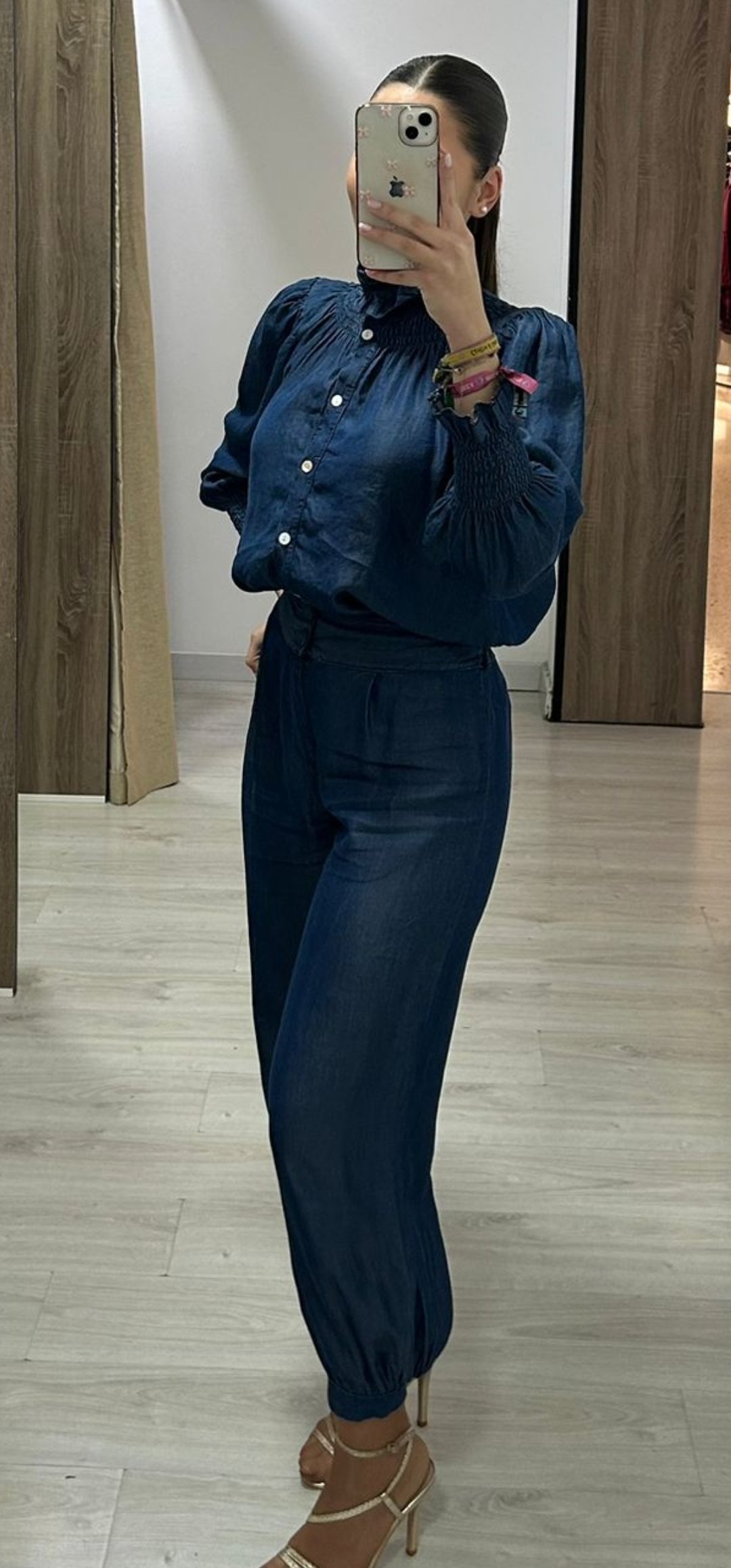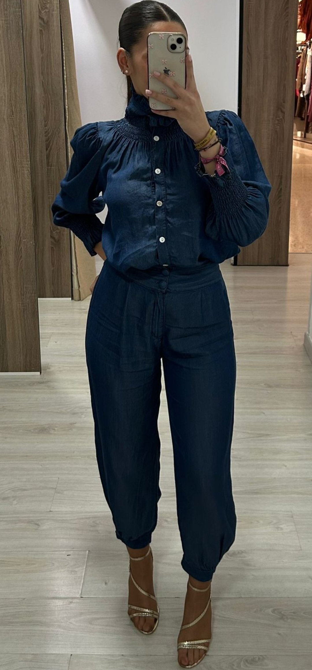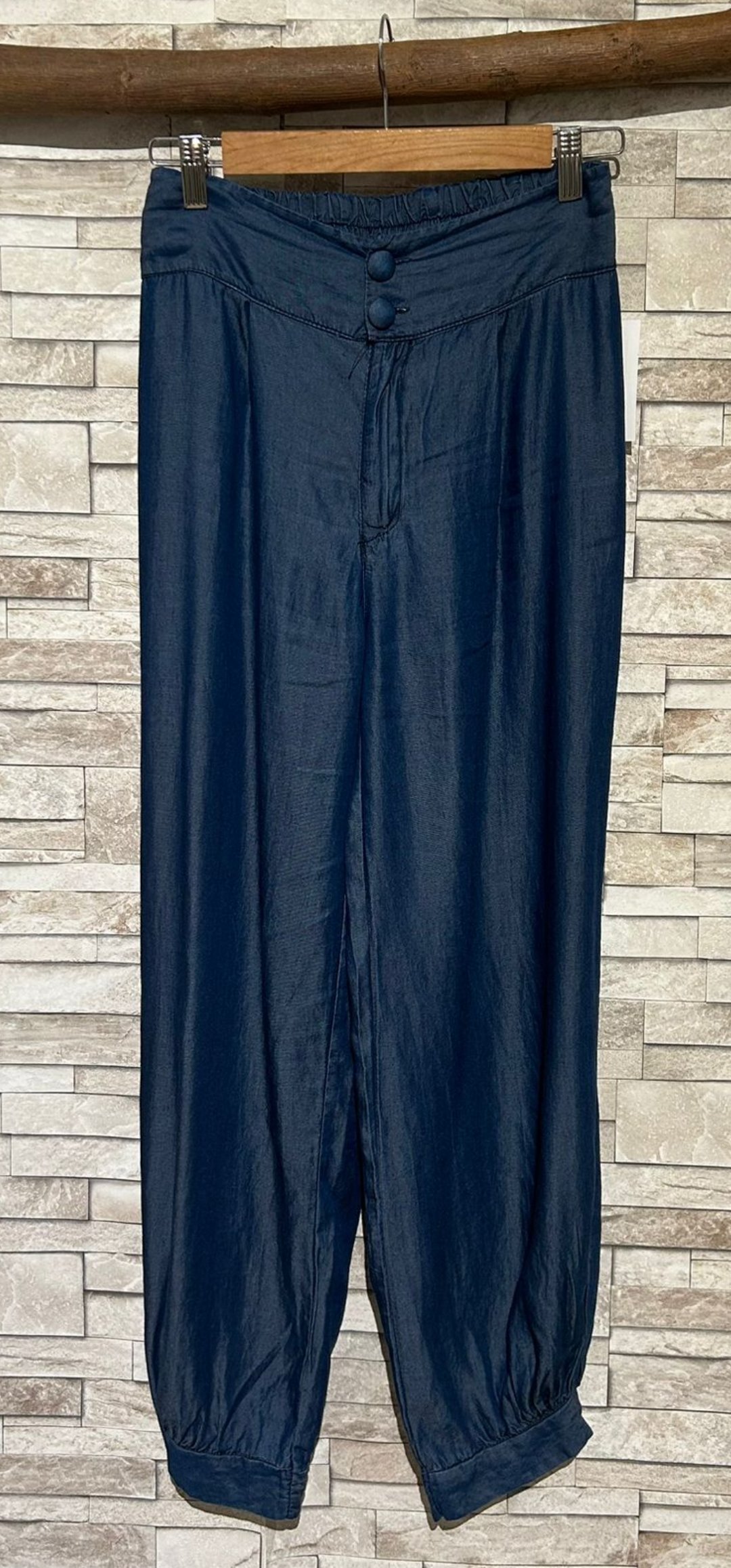 Espectacular pantalón en tejido vaquero Fluido engomado en los tobillo y cintura con cierre de botón y cremallera