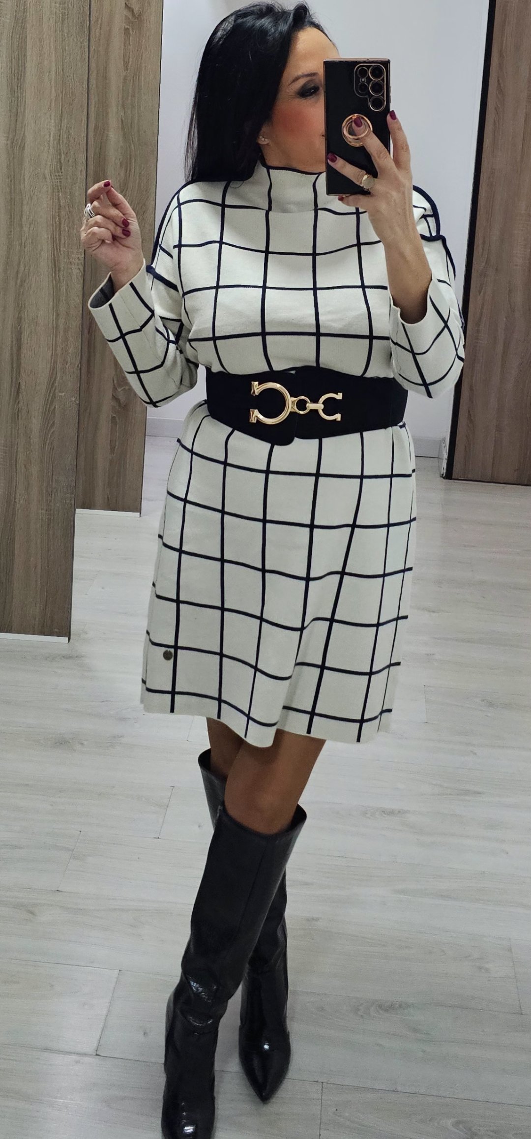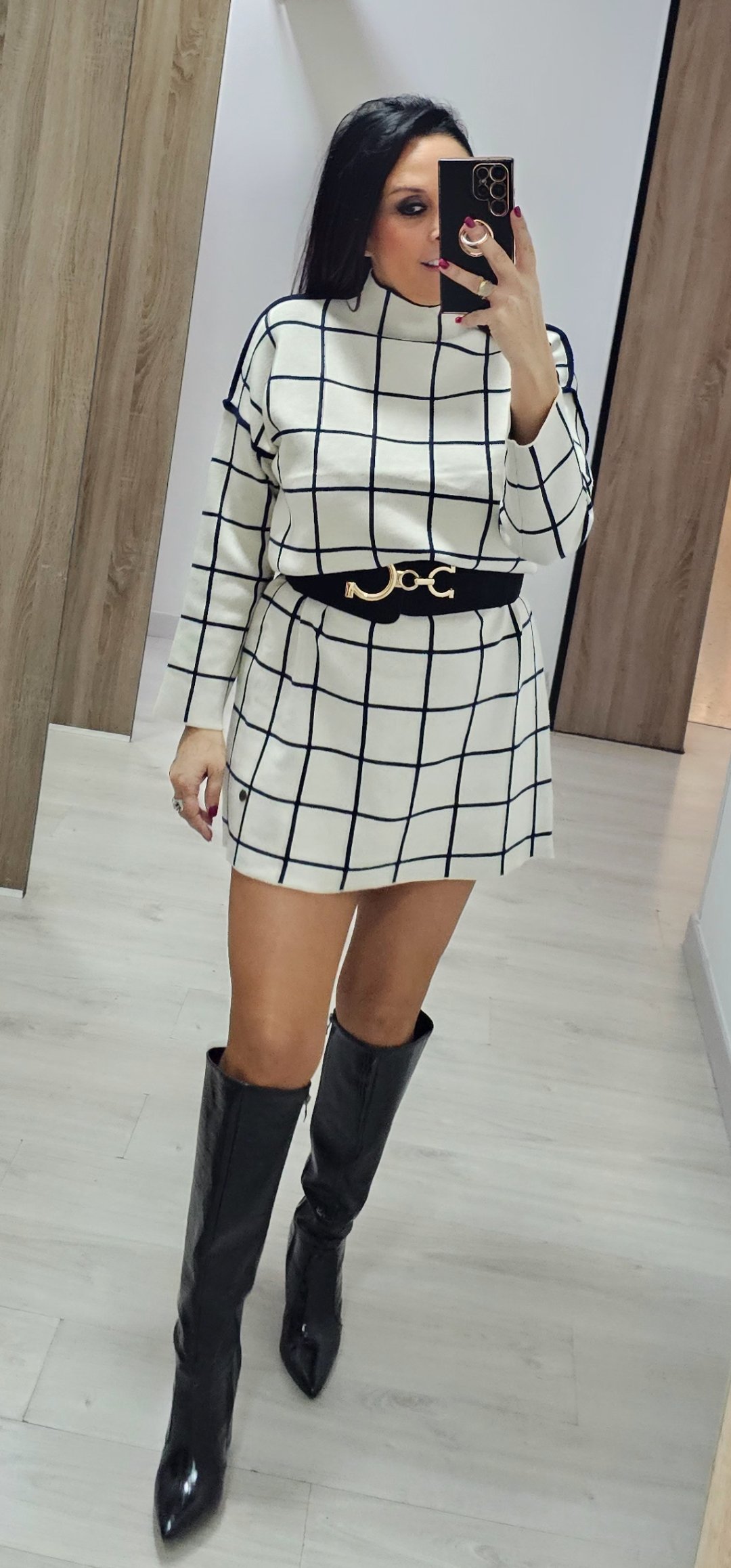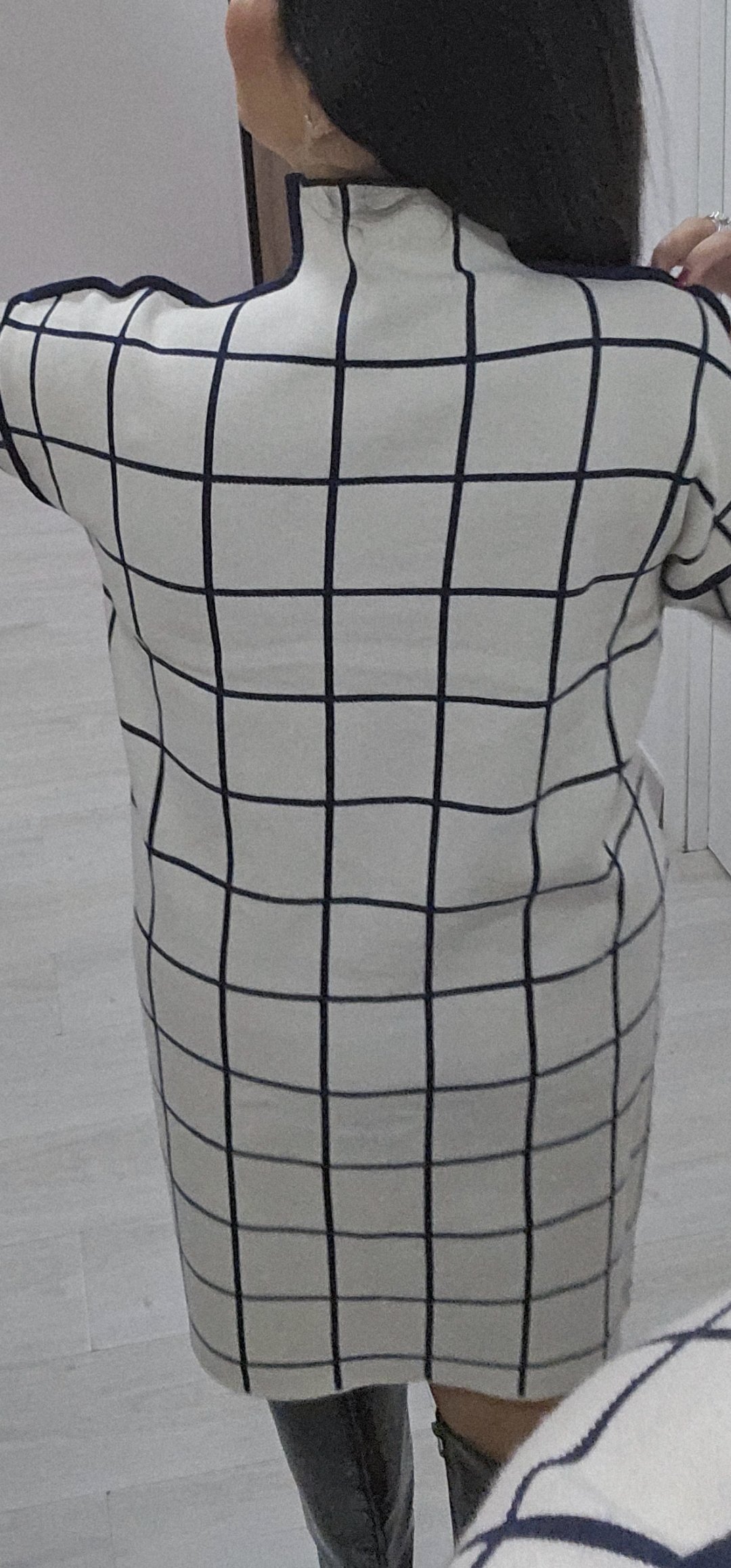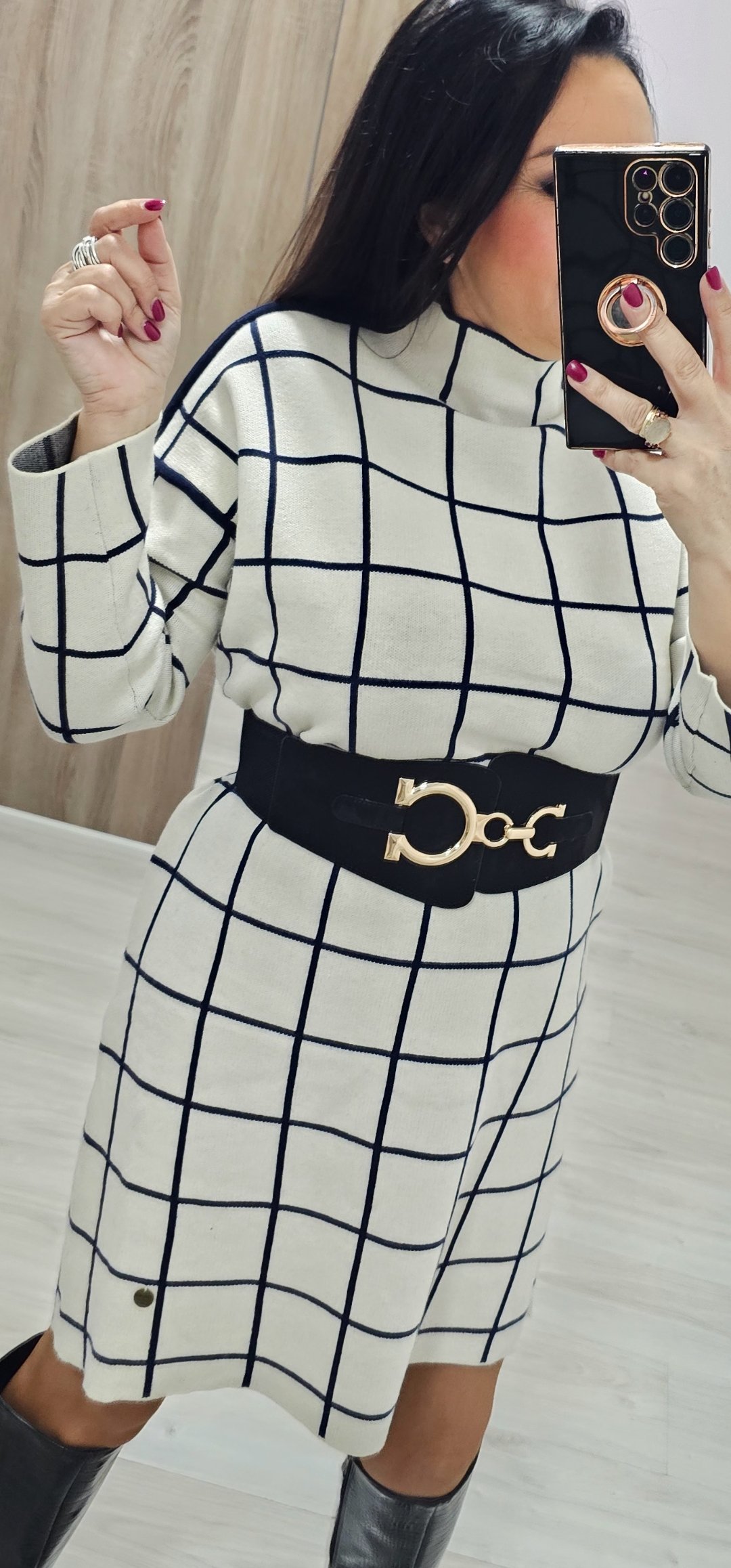 Monisimo vestido de punto tupido en fondo beige y rayas azul marino con un corte súper elegante, podéis combinar con o sin cinturón para darle otro toke a tu look