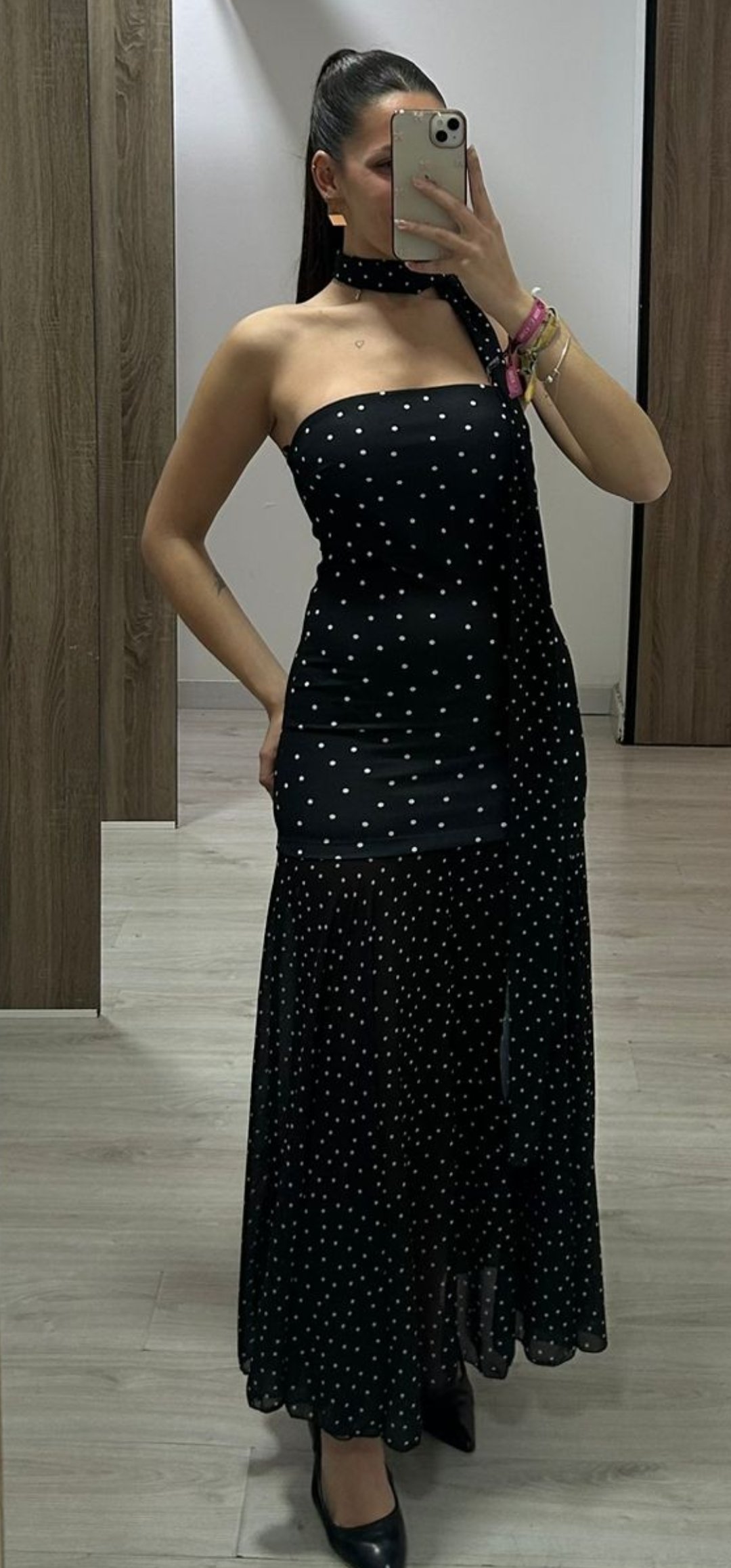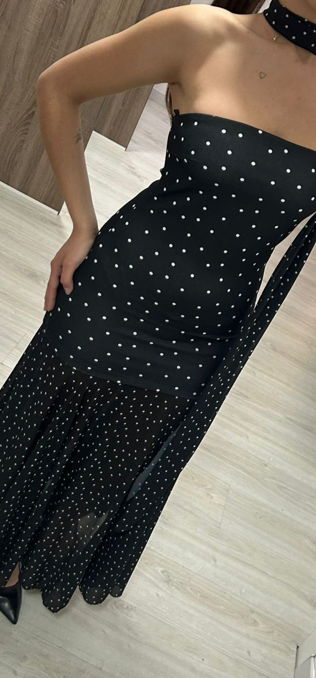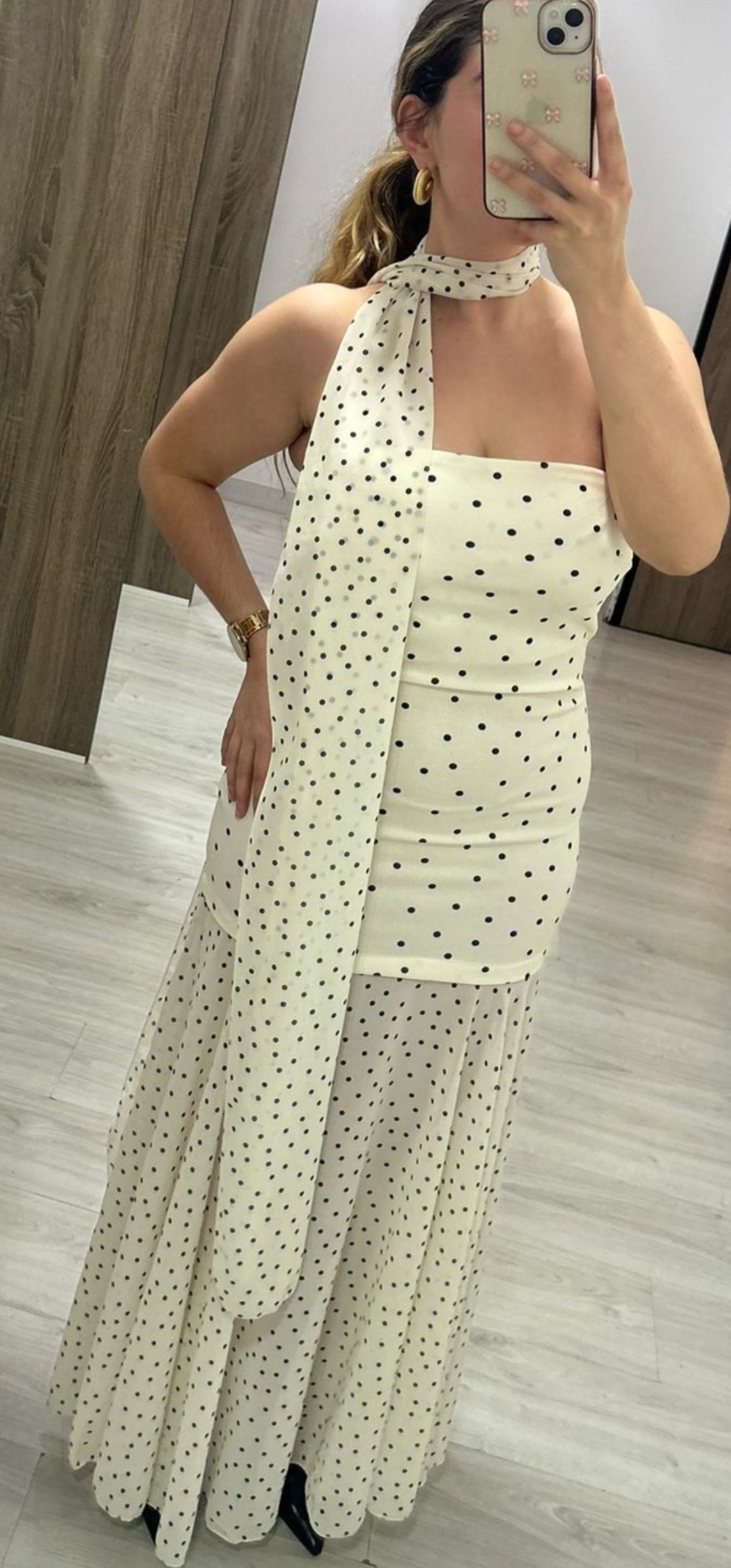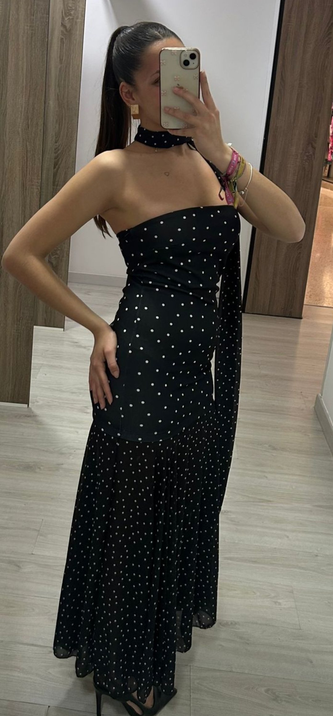 Espectacular vestido de lunares largo con fular uncluido en tejido de crep elástico y gasa con cascos incorporado y palabra dd honor