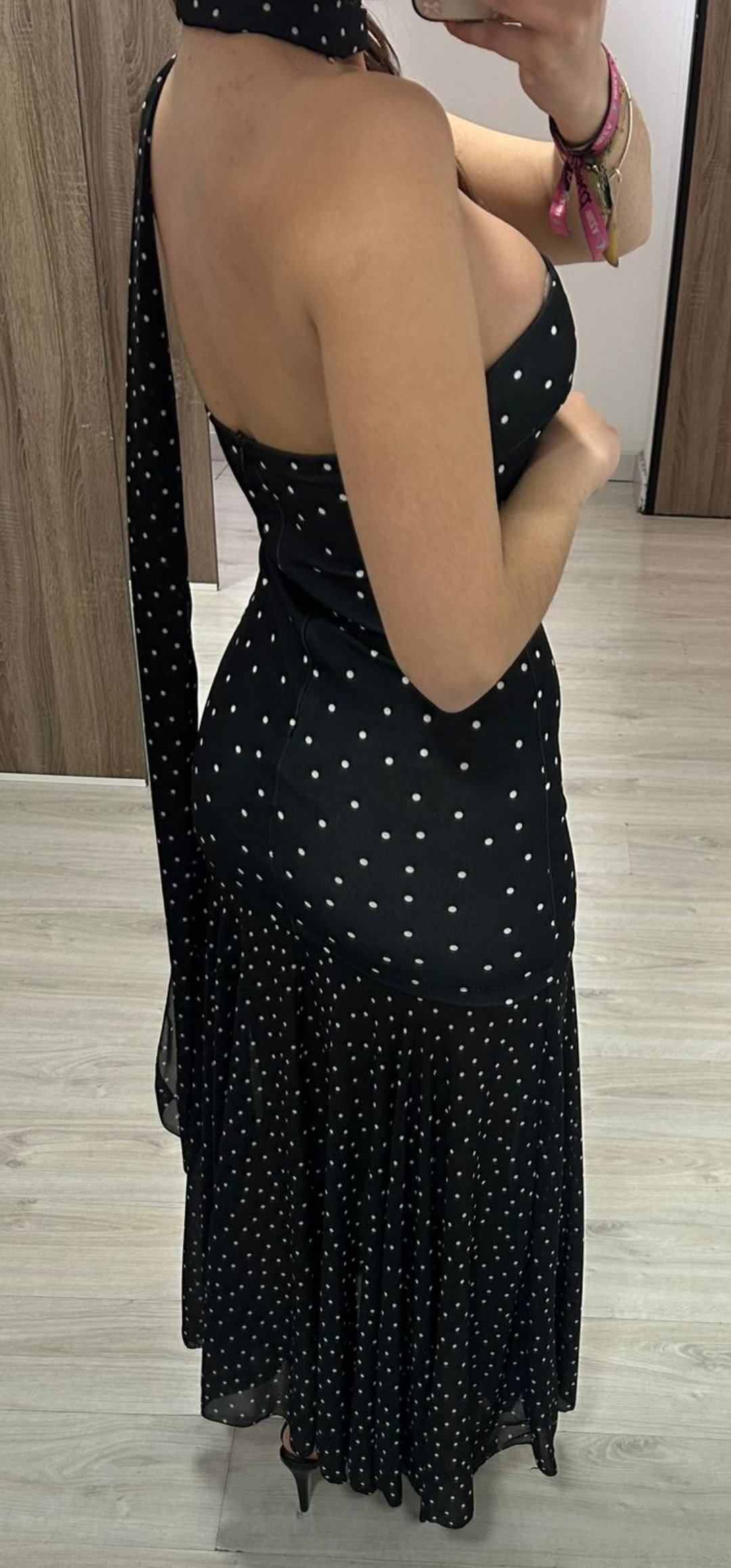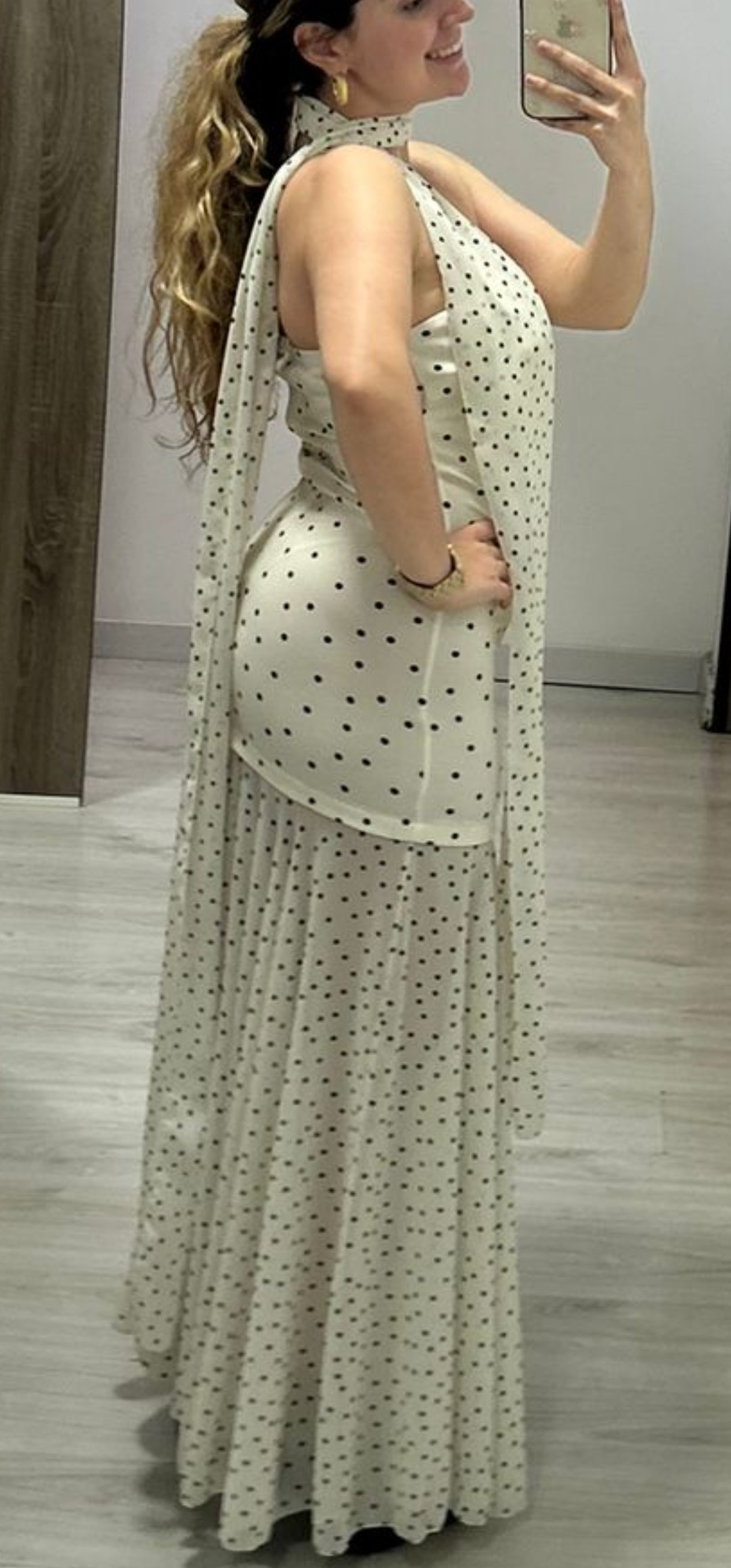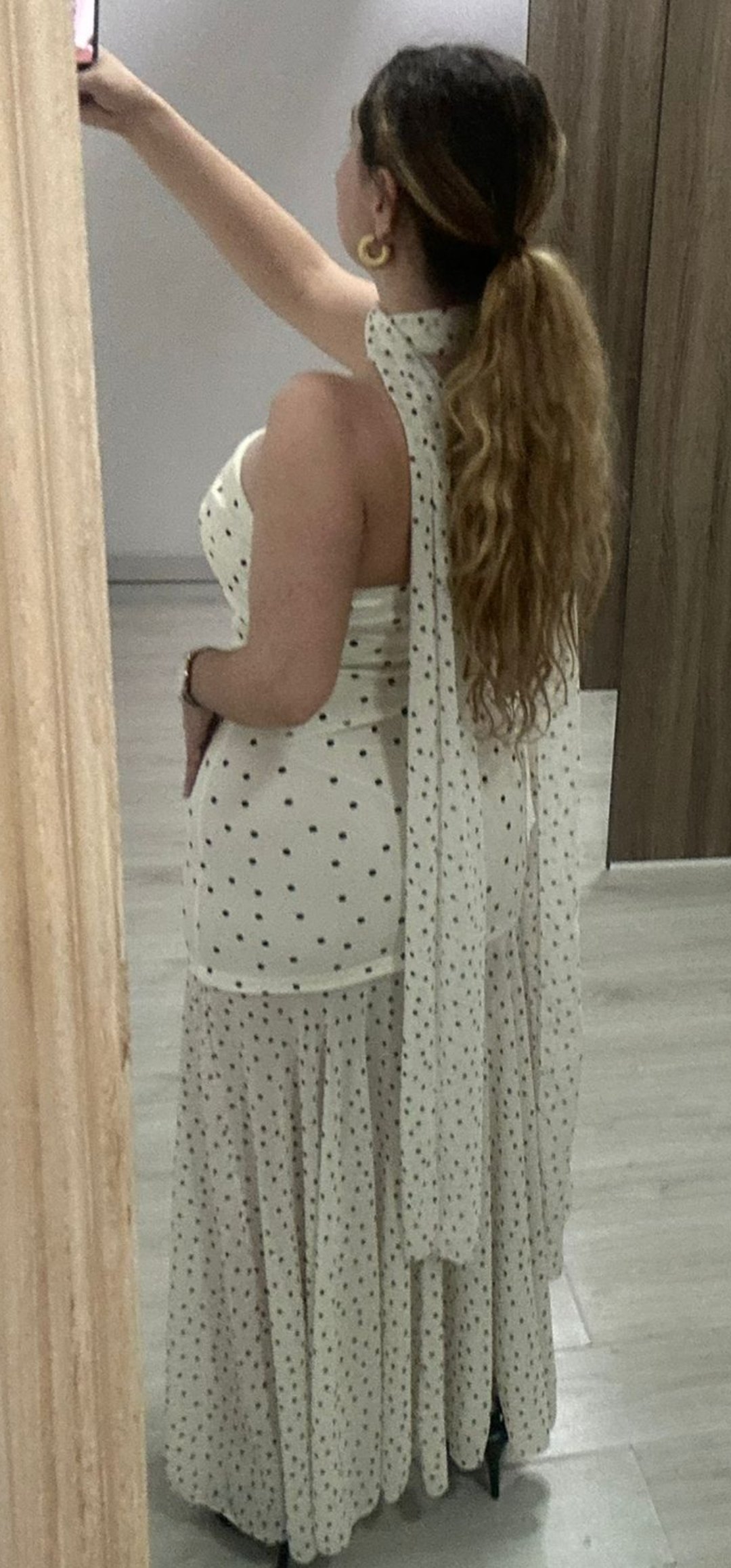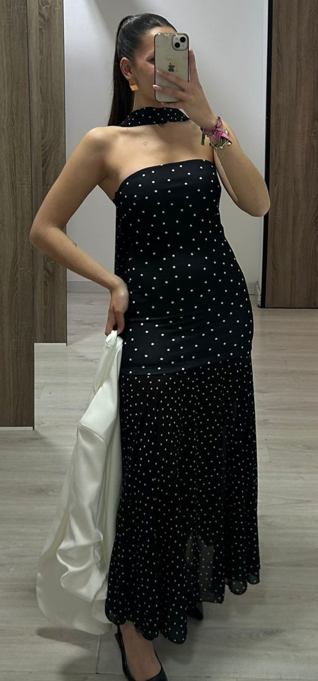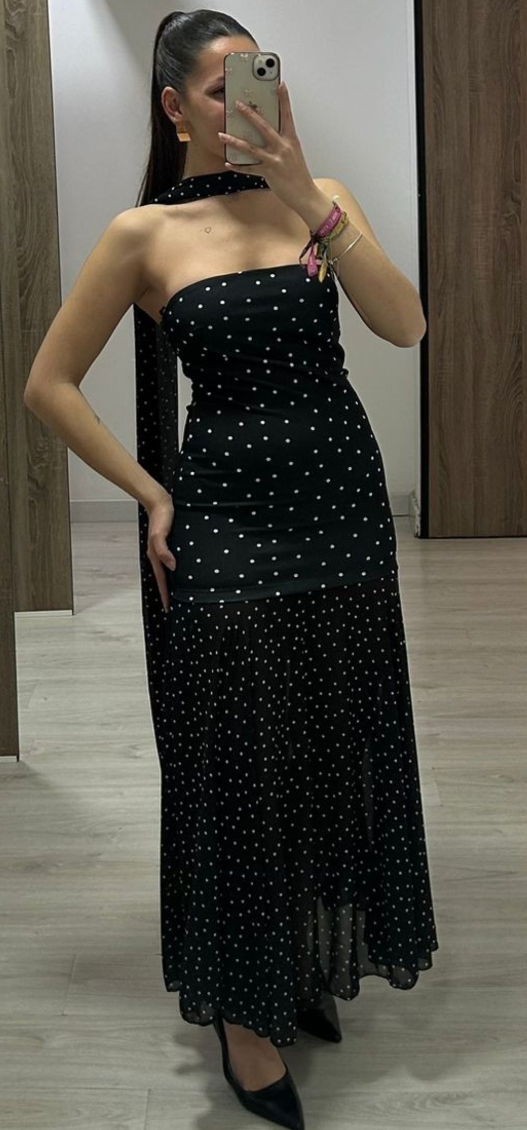 Espectacular vestido de lunares largo con fular uncluido en tejido de crep elástico y gasa con cascos incorporado y palabra dd honor