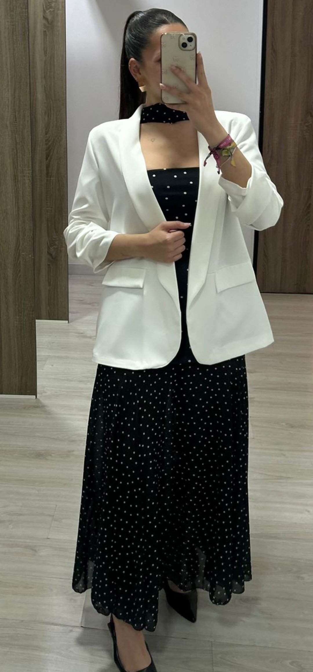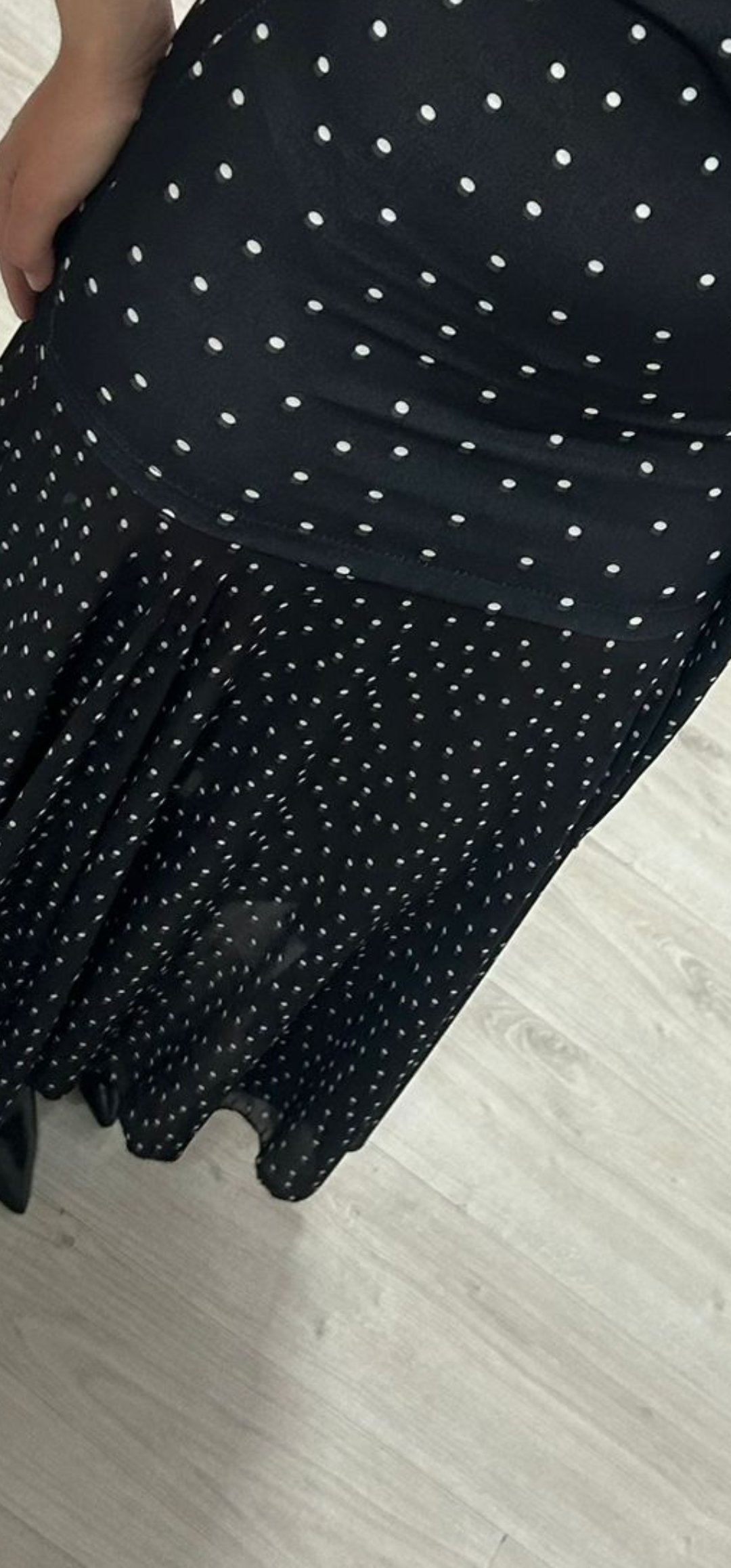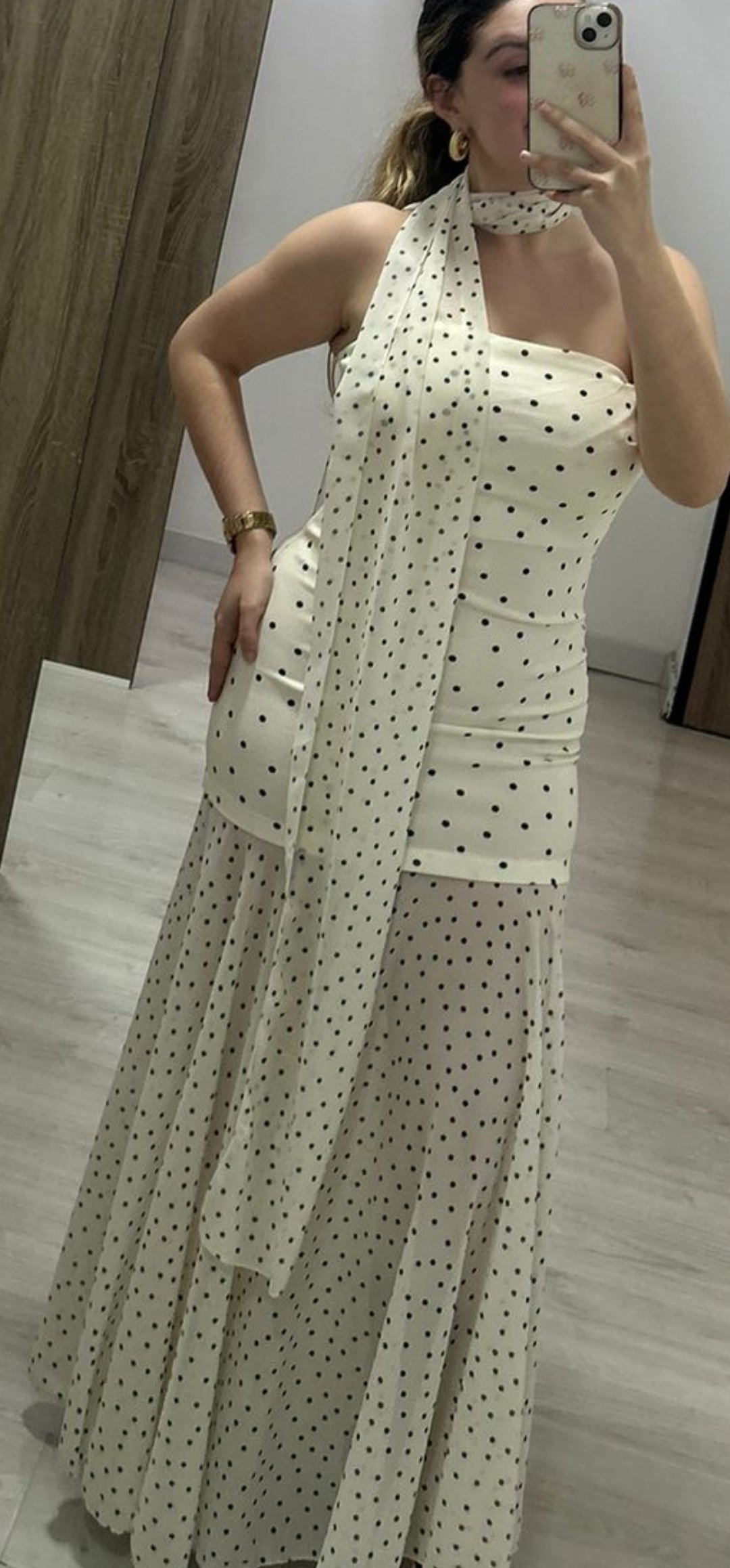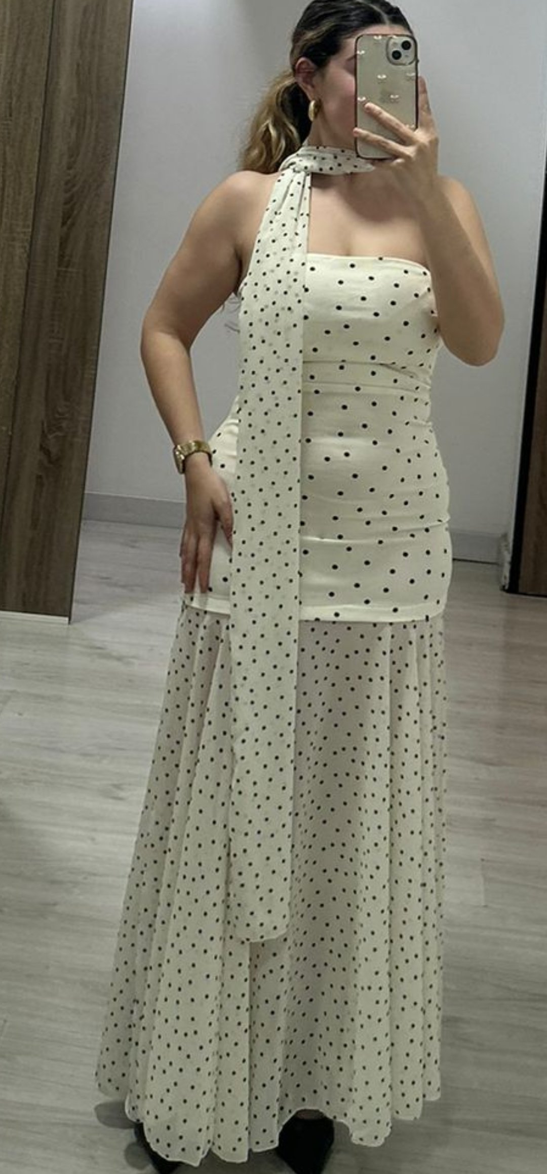 Espectacular vestido de lunares largo con fular uncluido en tejido de crep elástico y gasa con cascos incorporado y palabra dd honor
