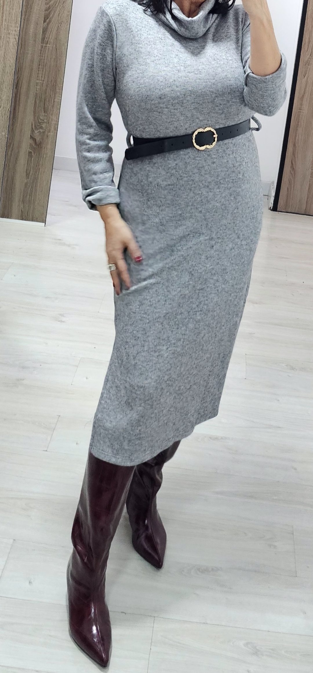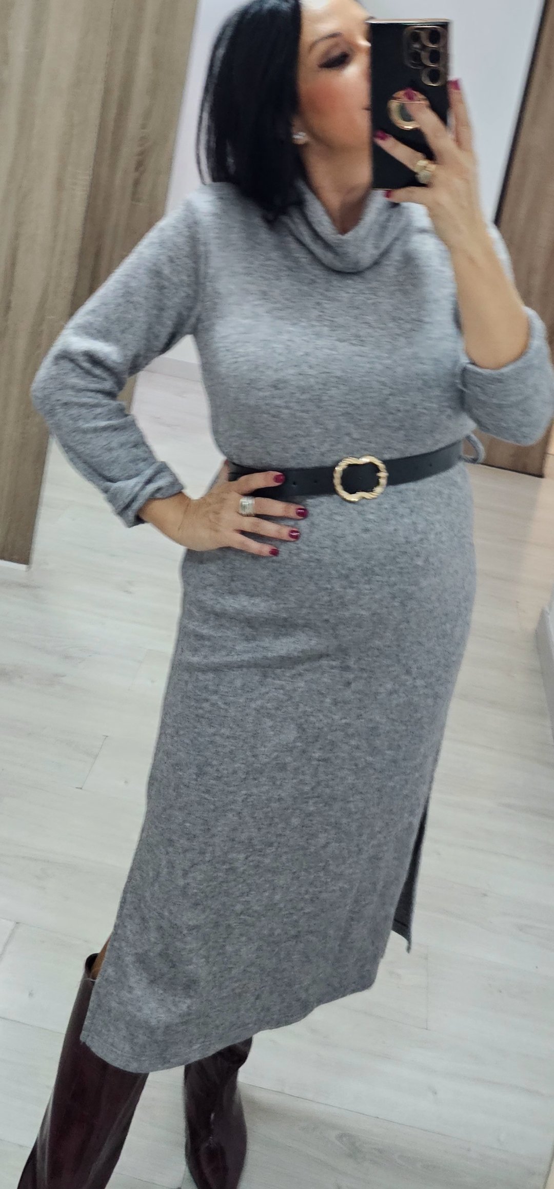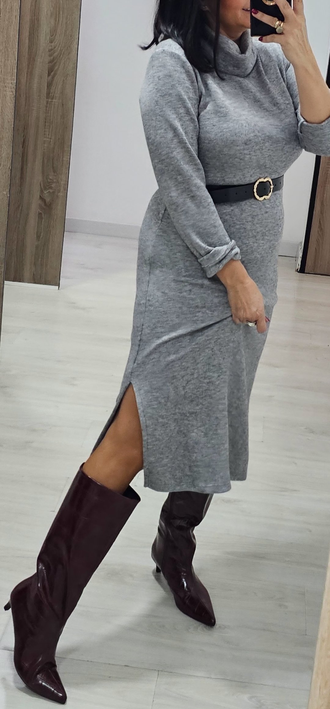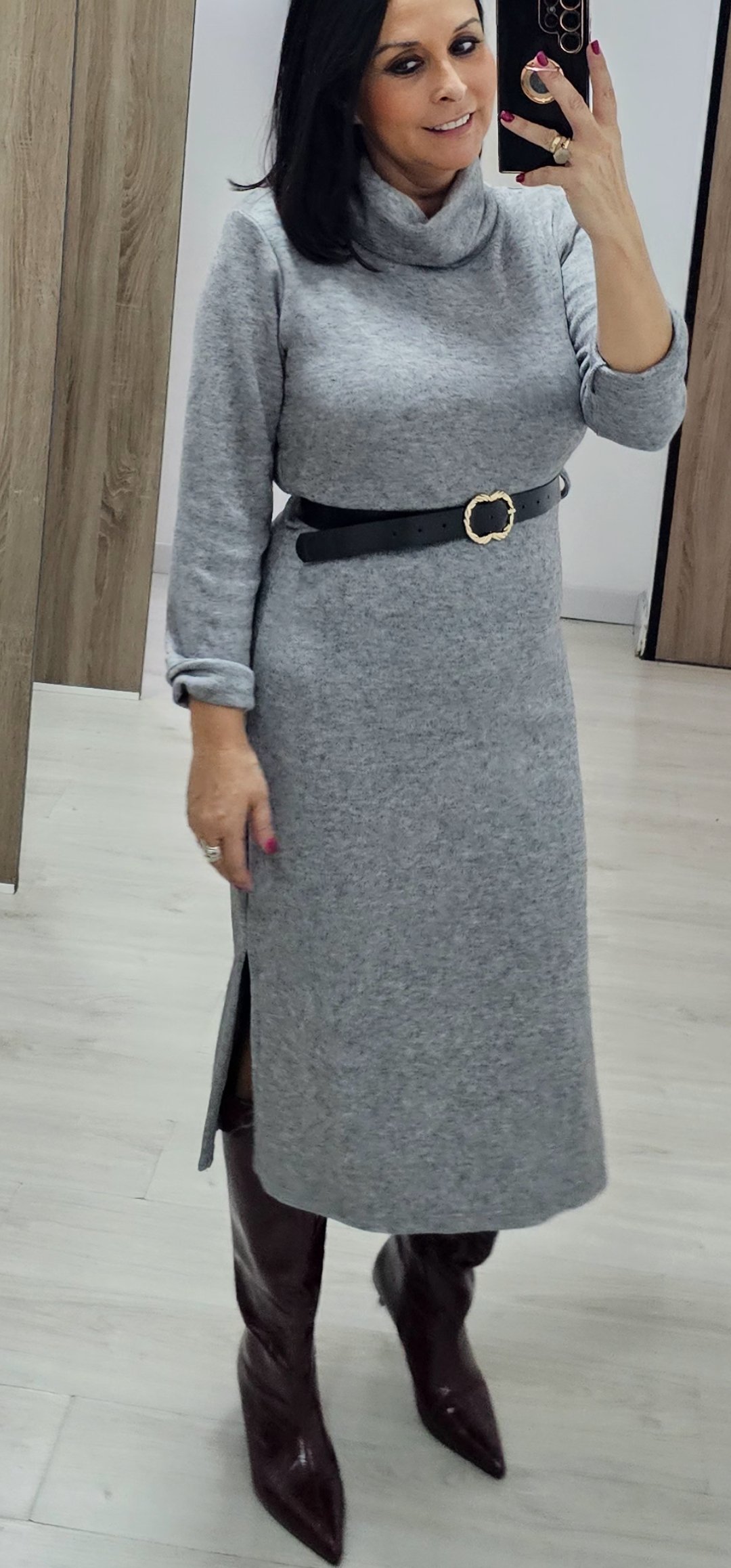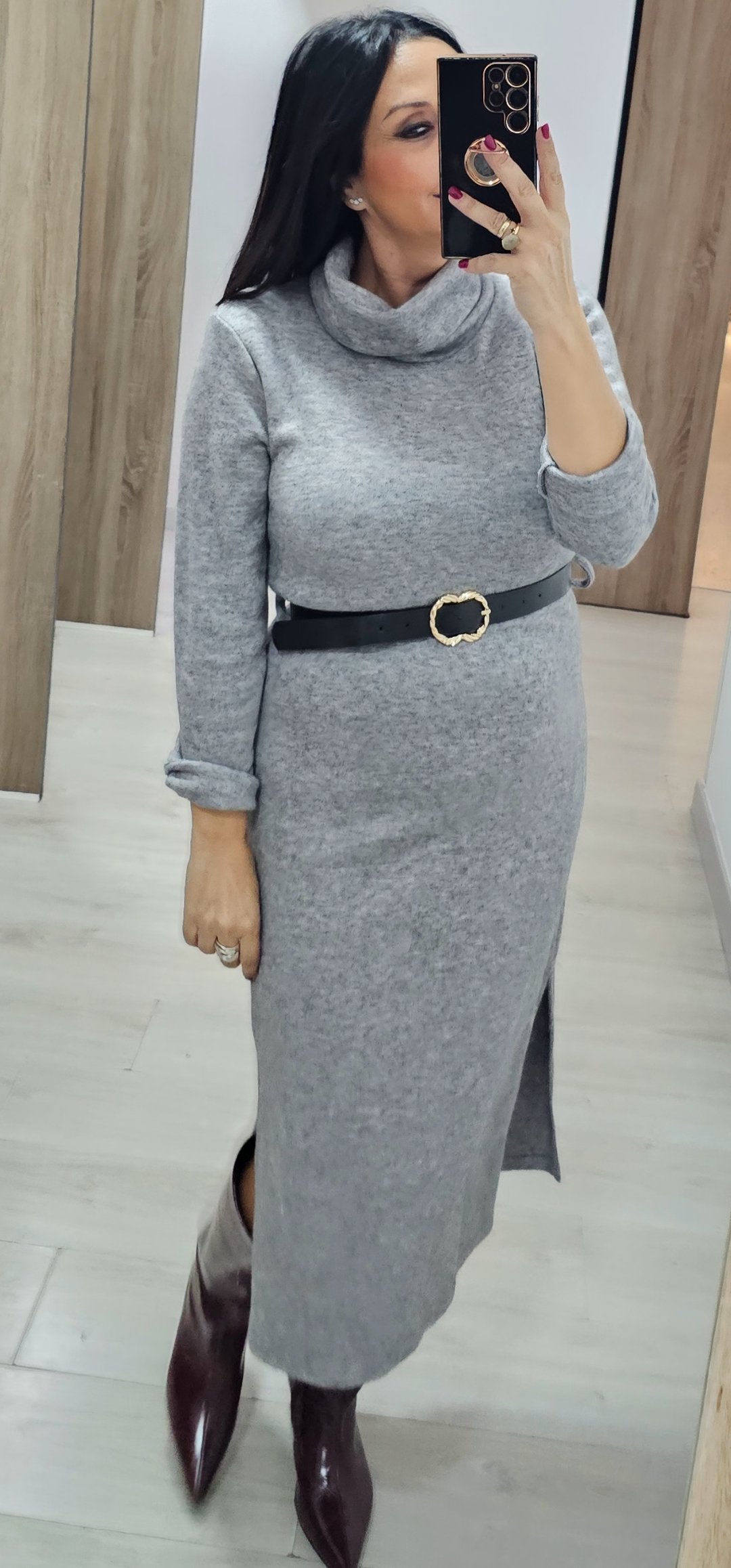 Monisimo y calentito vestido midi en tejido de punto elástico con cuello alto vuelto bocon y abertura en los laterales trae cinturón incluido