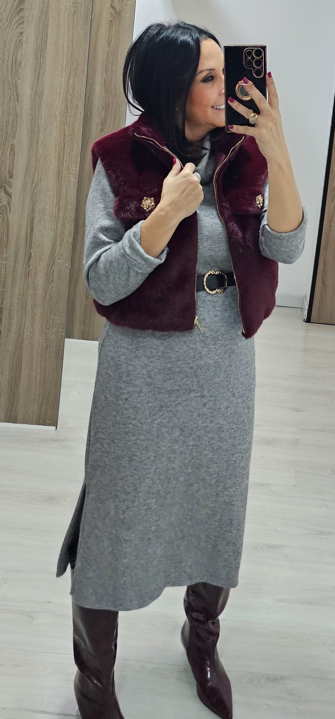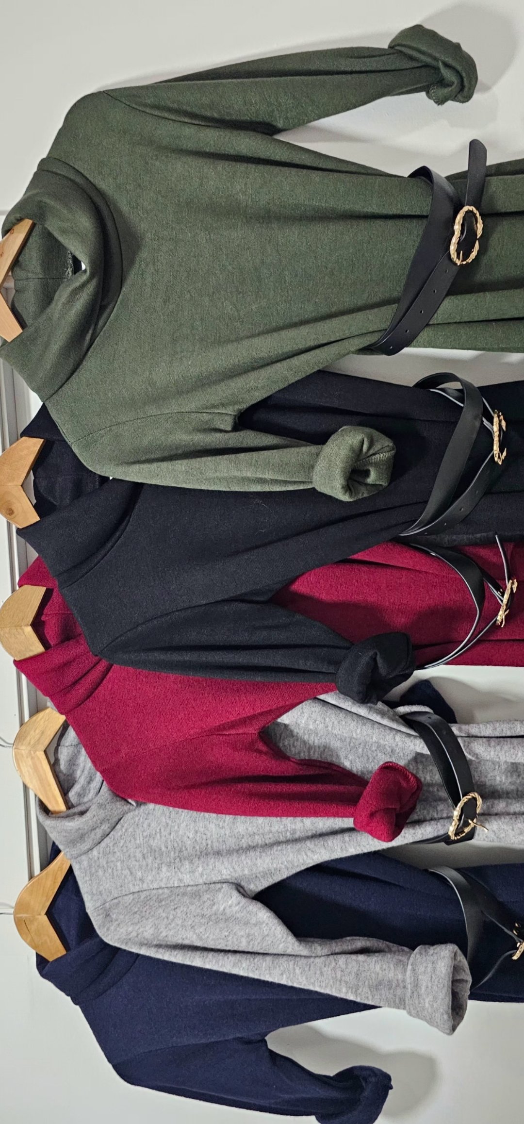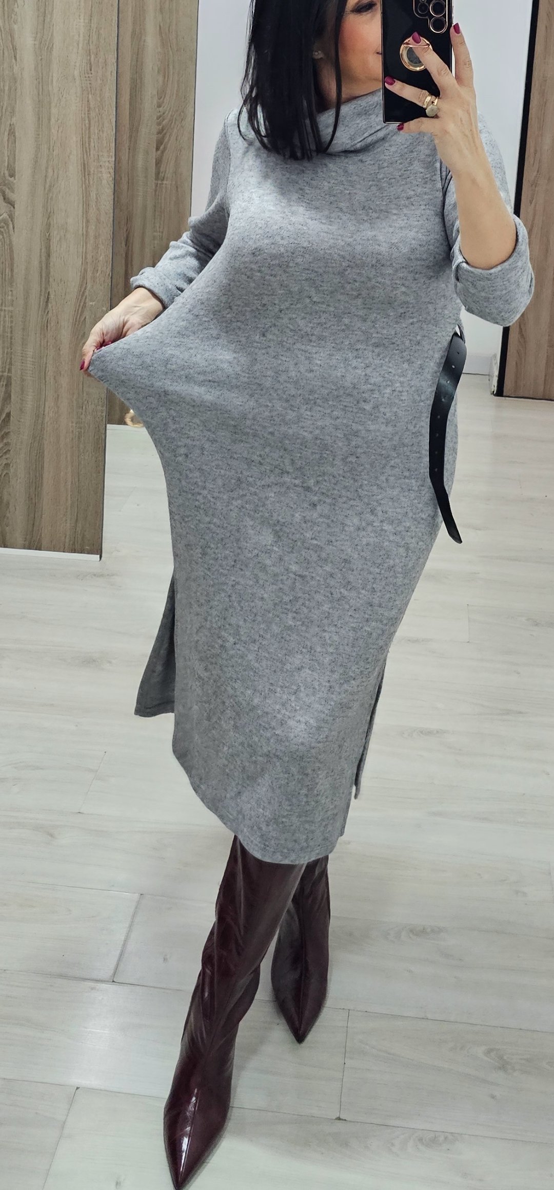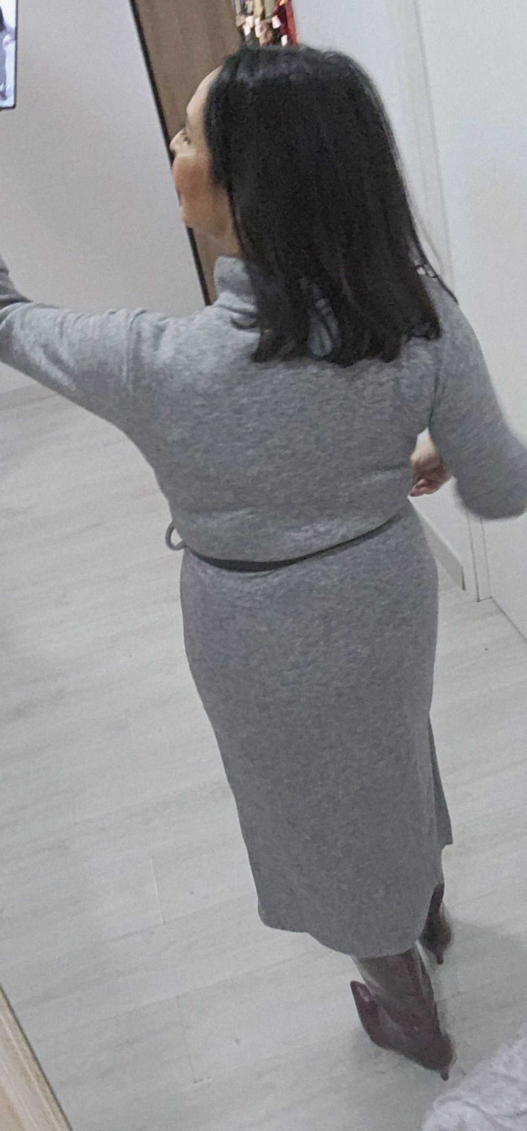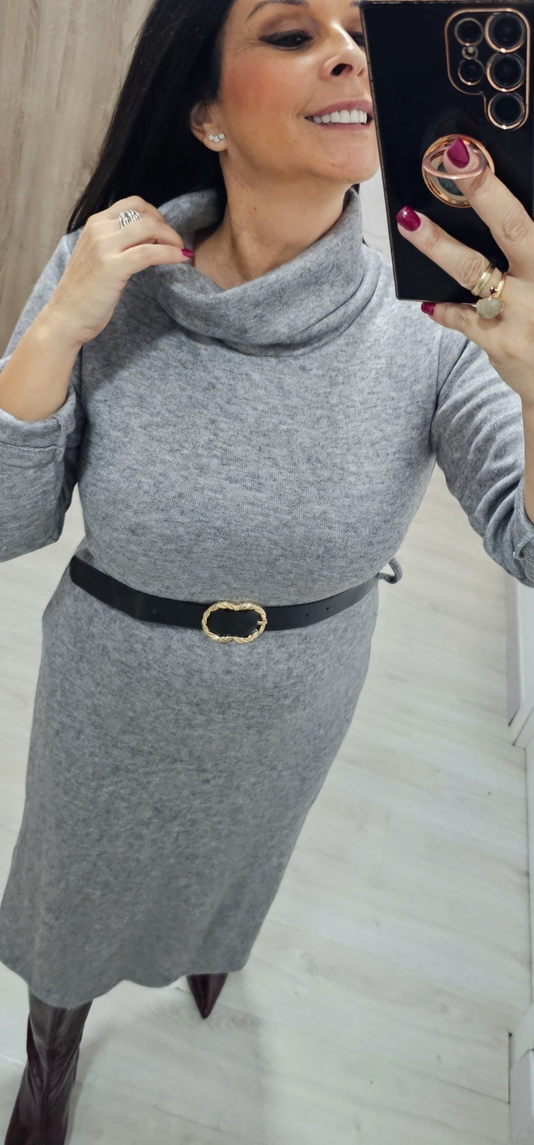 Monisimo y calentito vestido midi en tejido de punto elástico con cuello alto vuelto bocon y abertura en los laterales trae cinturón incluido