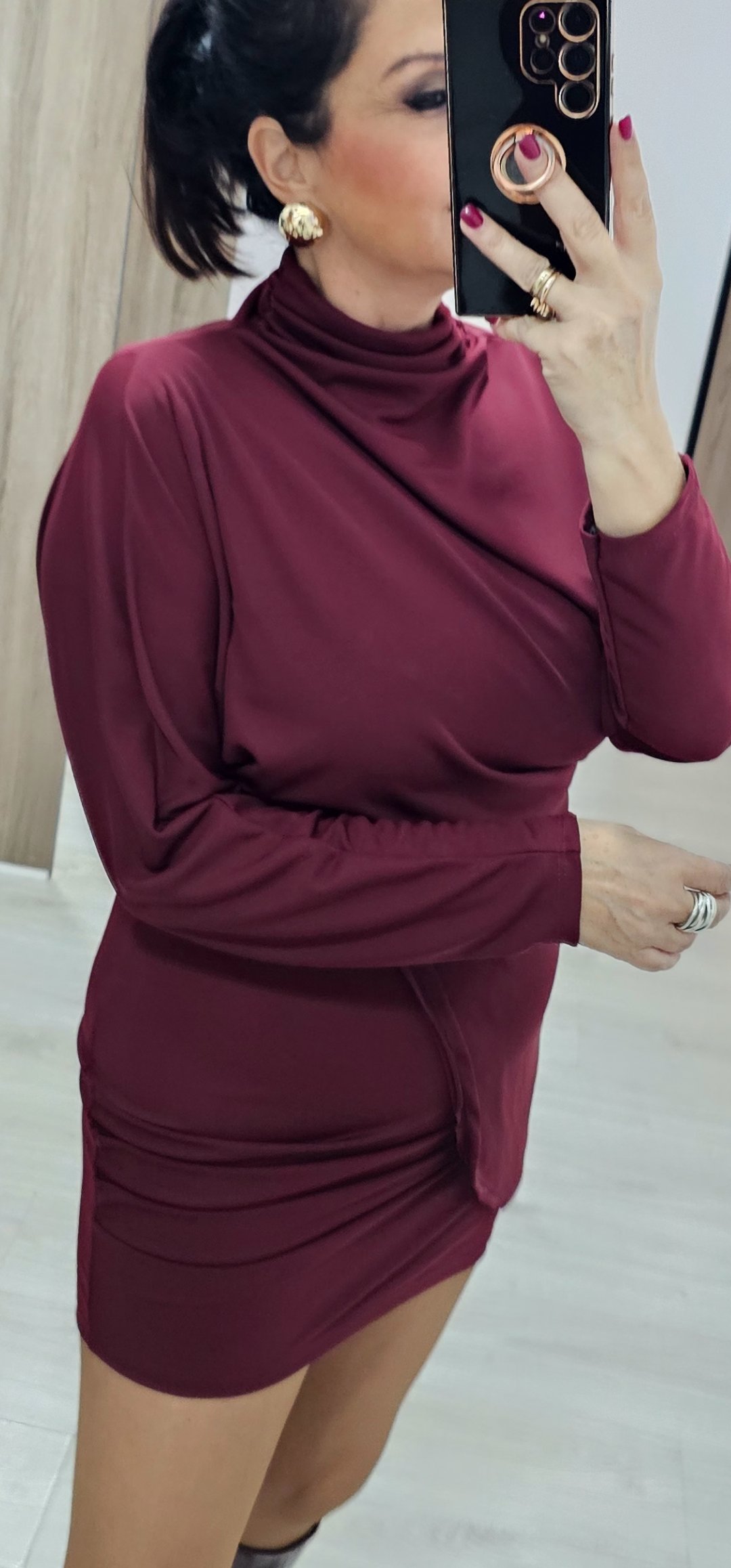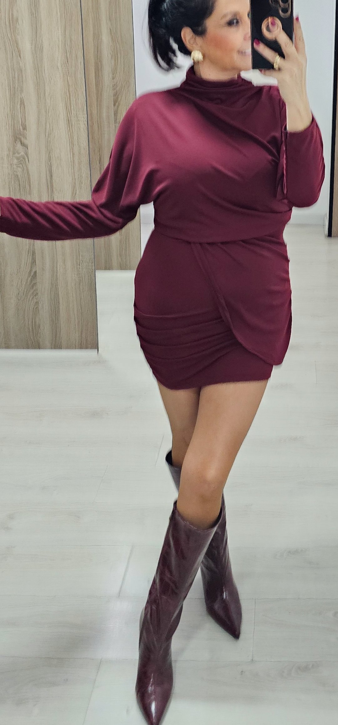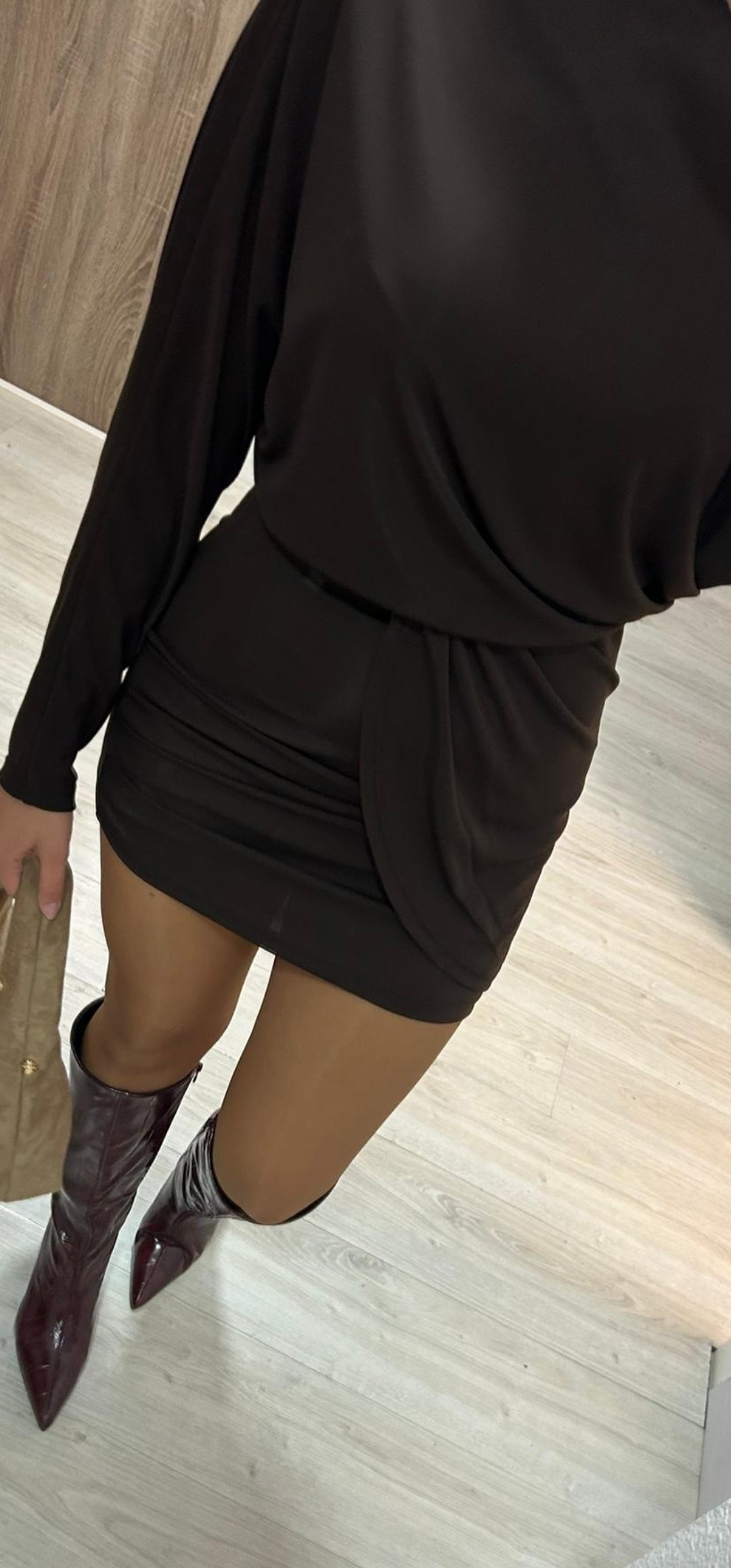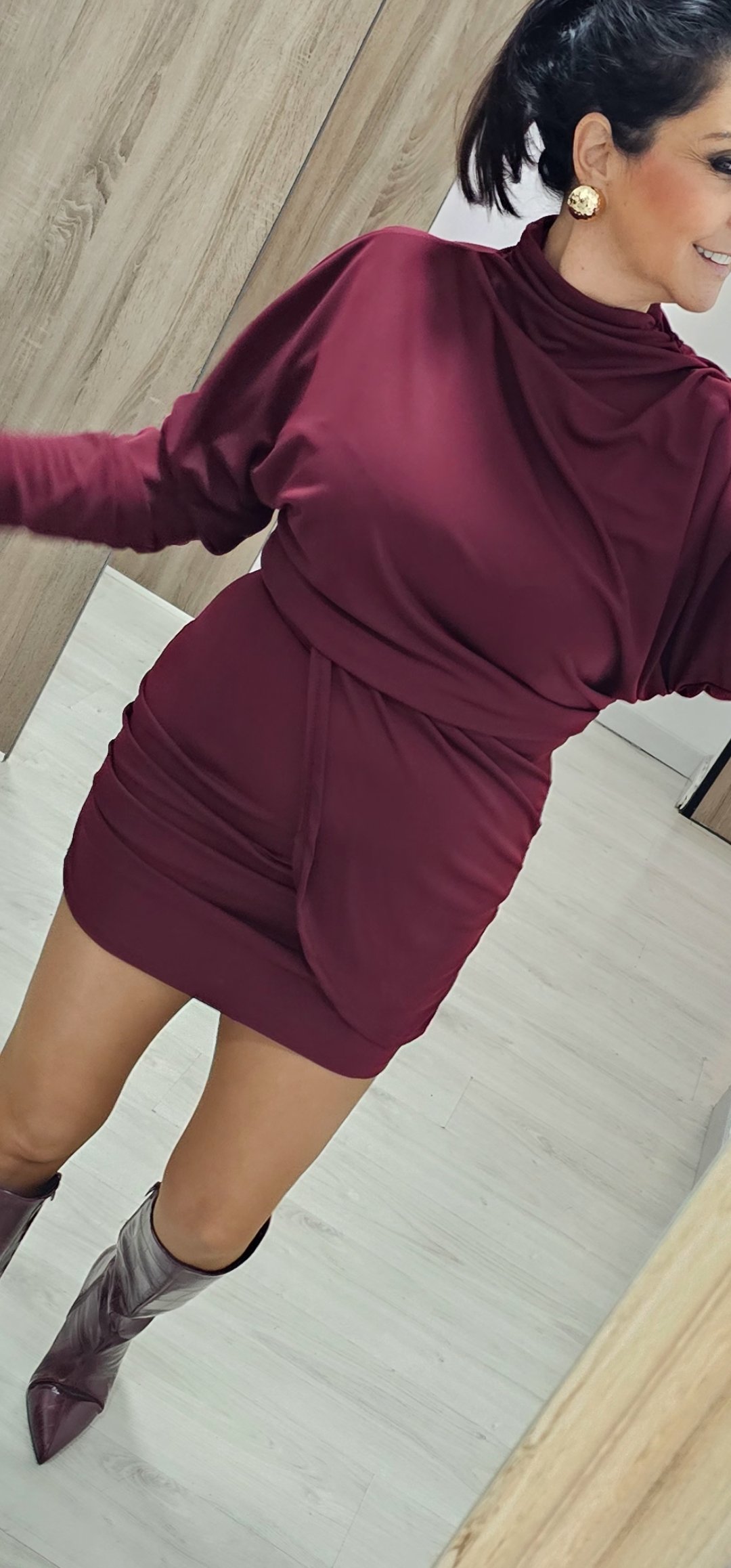 Monisimo y sexy vestido corto en tejido de viscosa con licra con un corte oversance por arriba y estrecho por abajo con mangas de murciélago y corte cejado